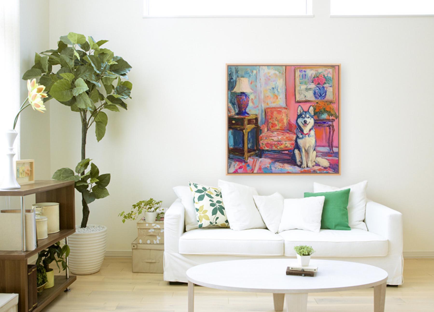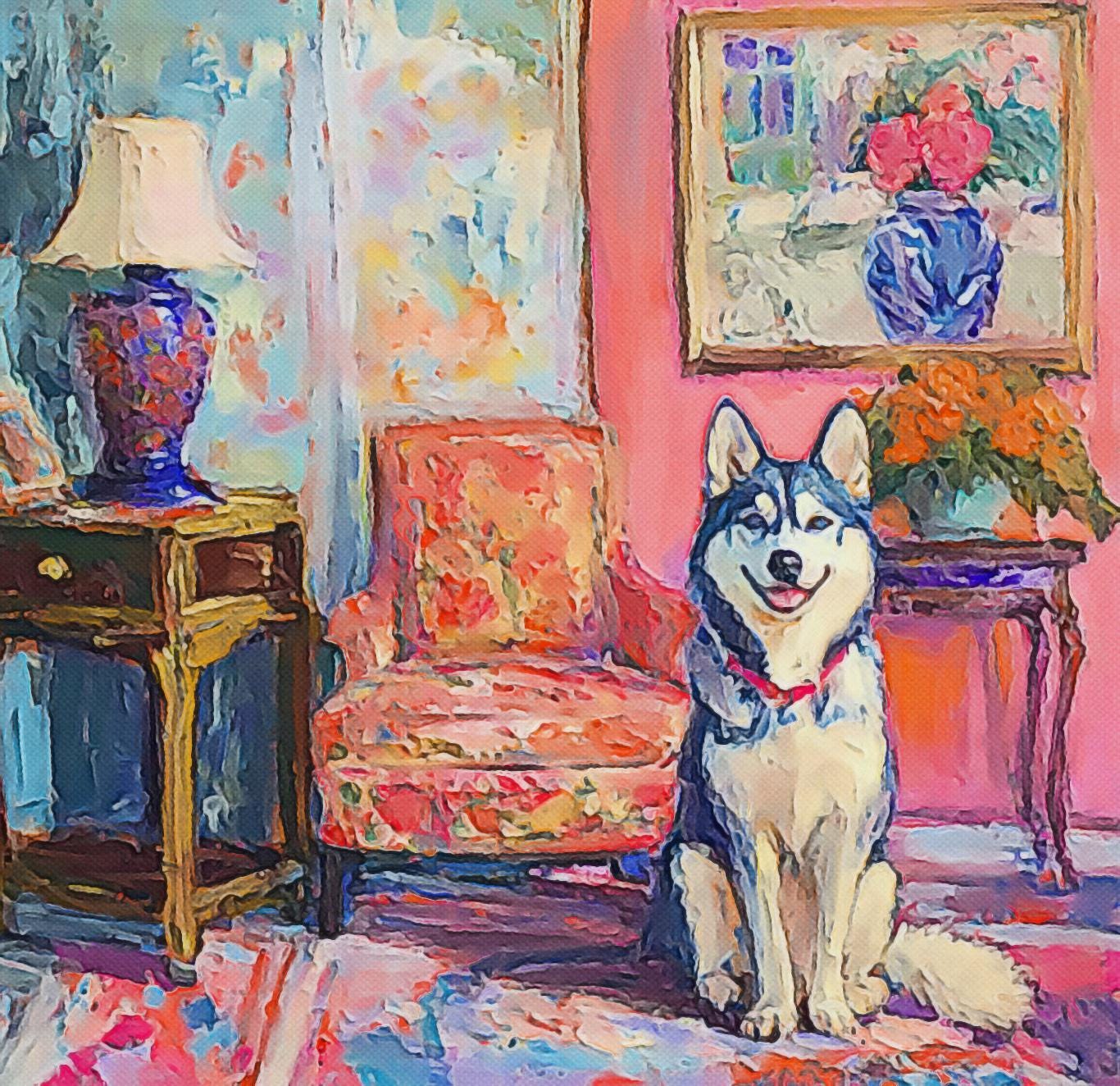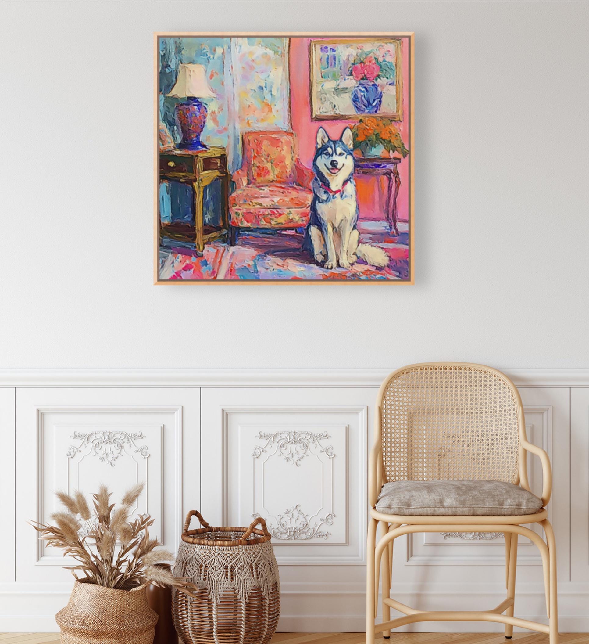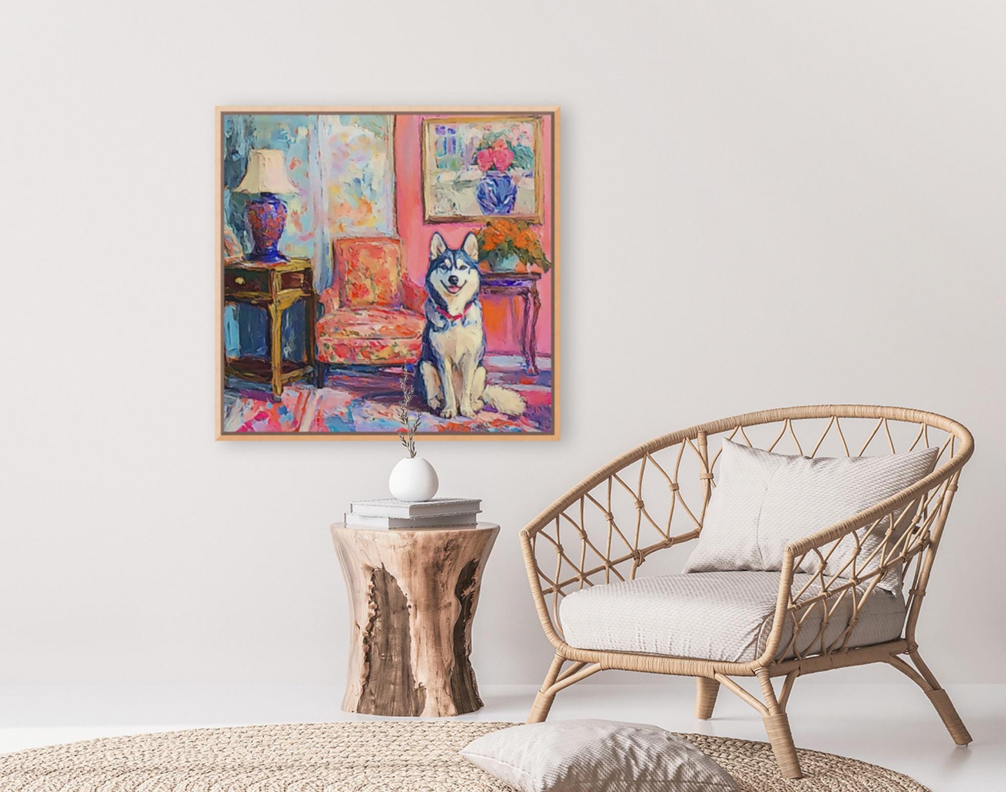 Grandmillennial art, Smiling Husky in Orange interior, whimsical fine art