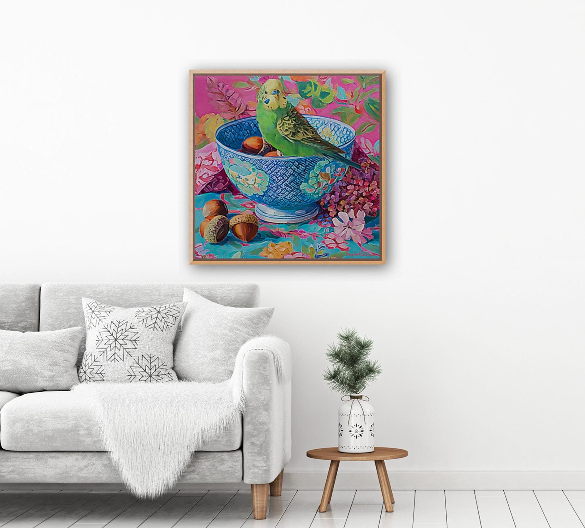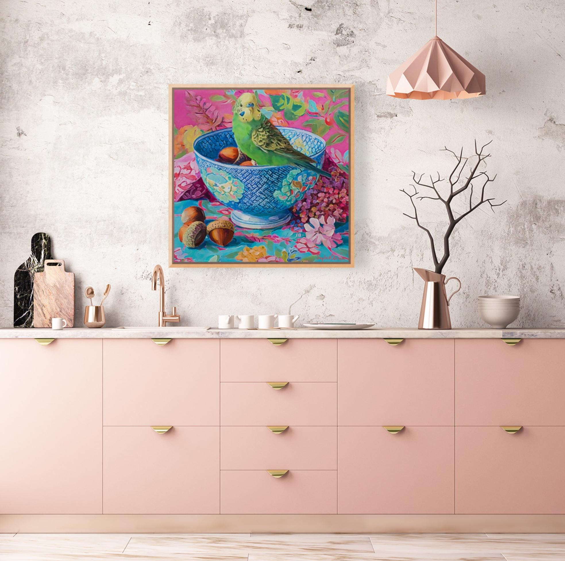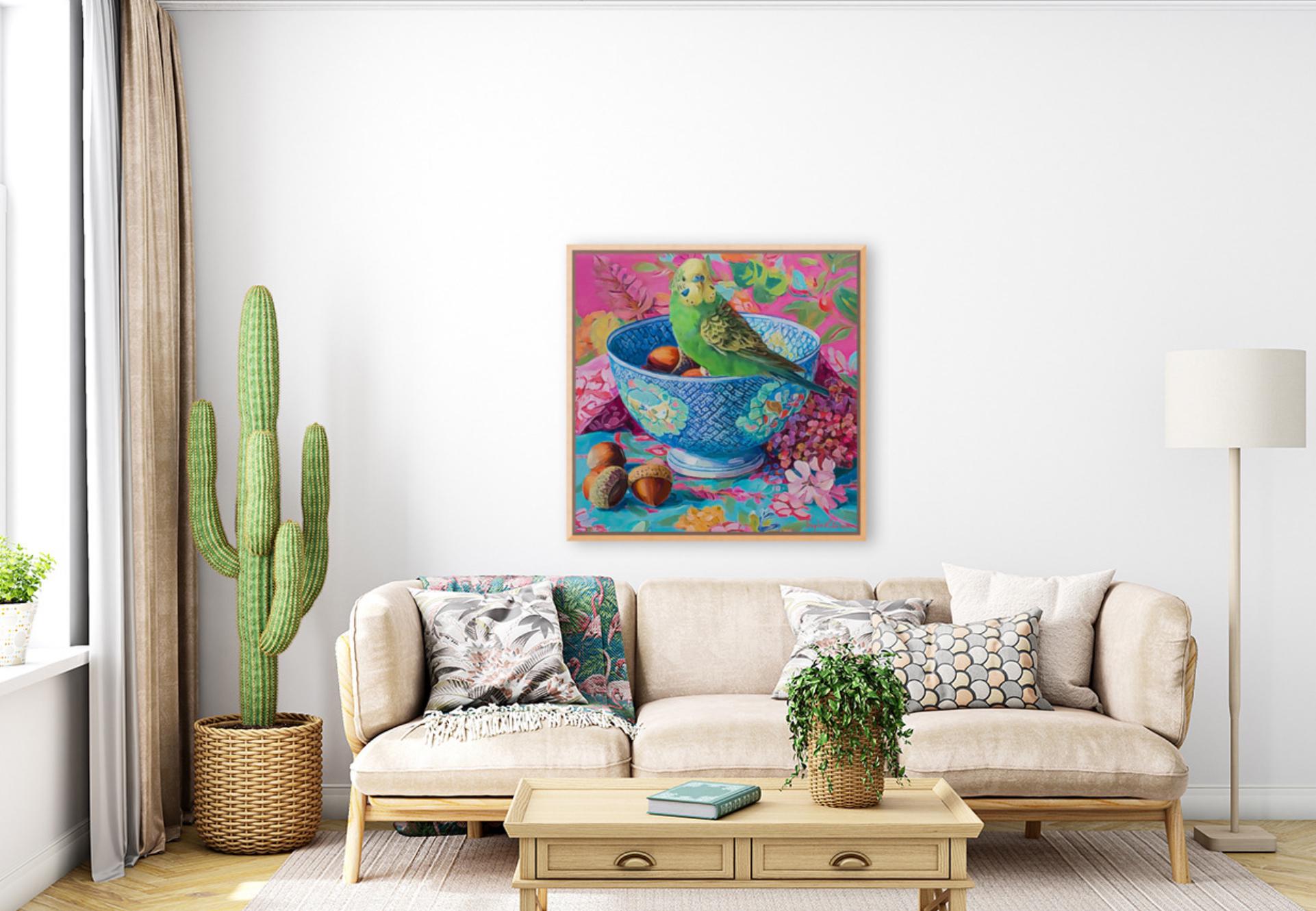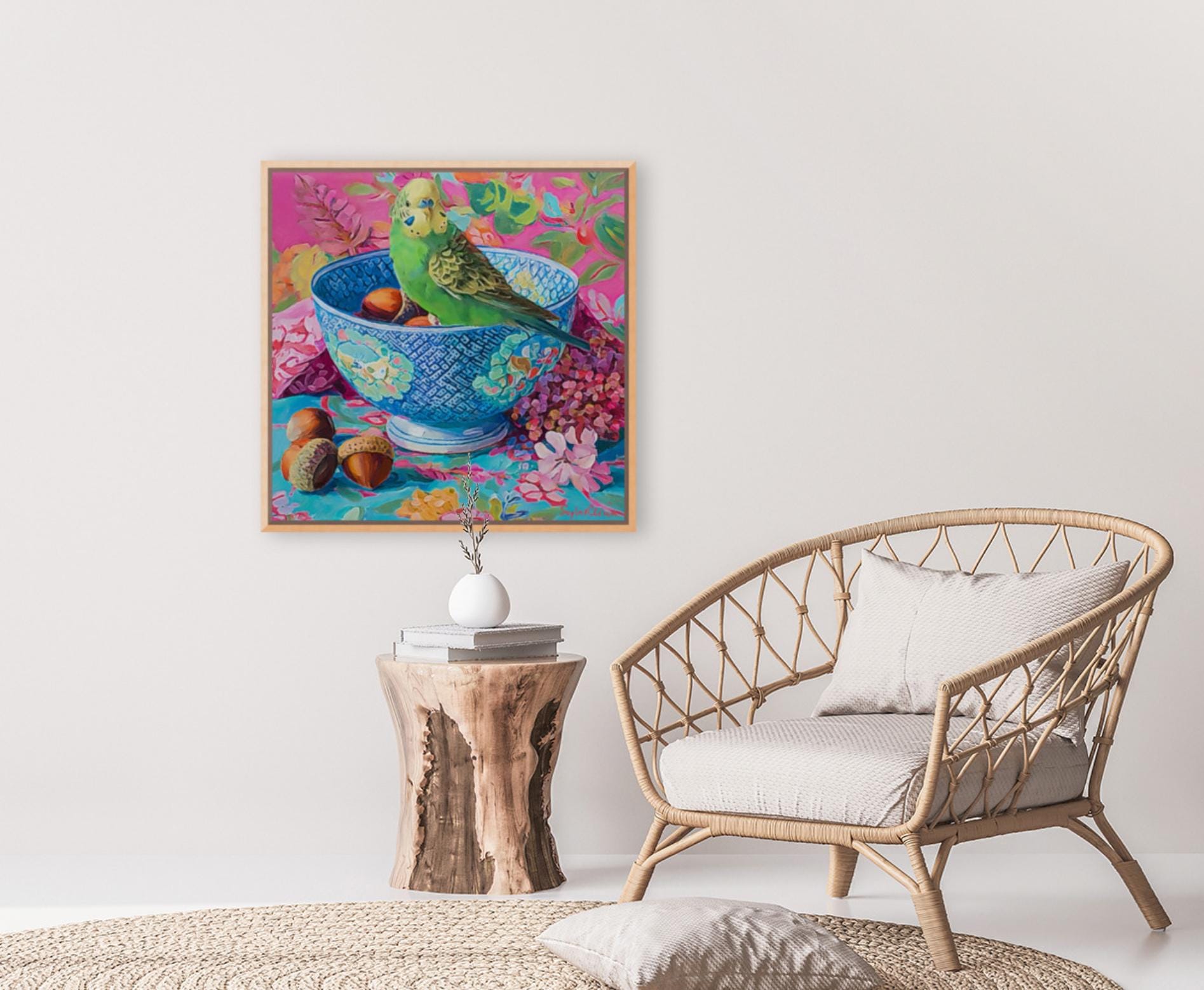 Grandmillennial art, green budgie on blue and white chinoiserie bowl, whimsical fine art