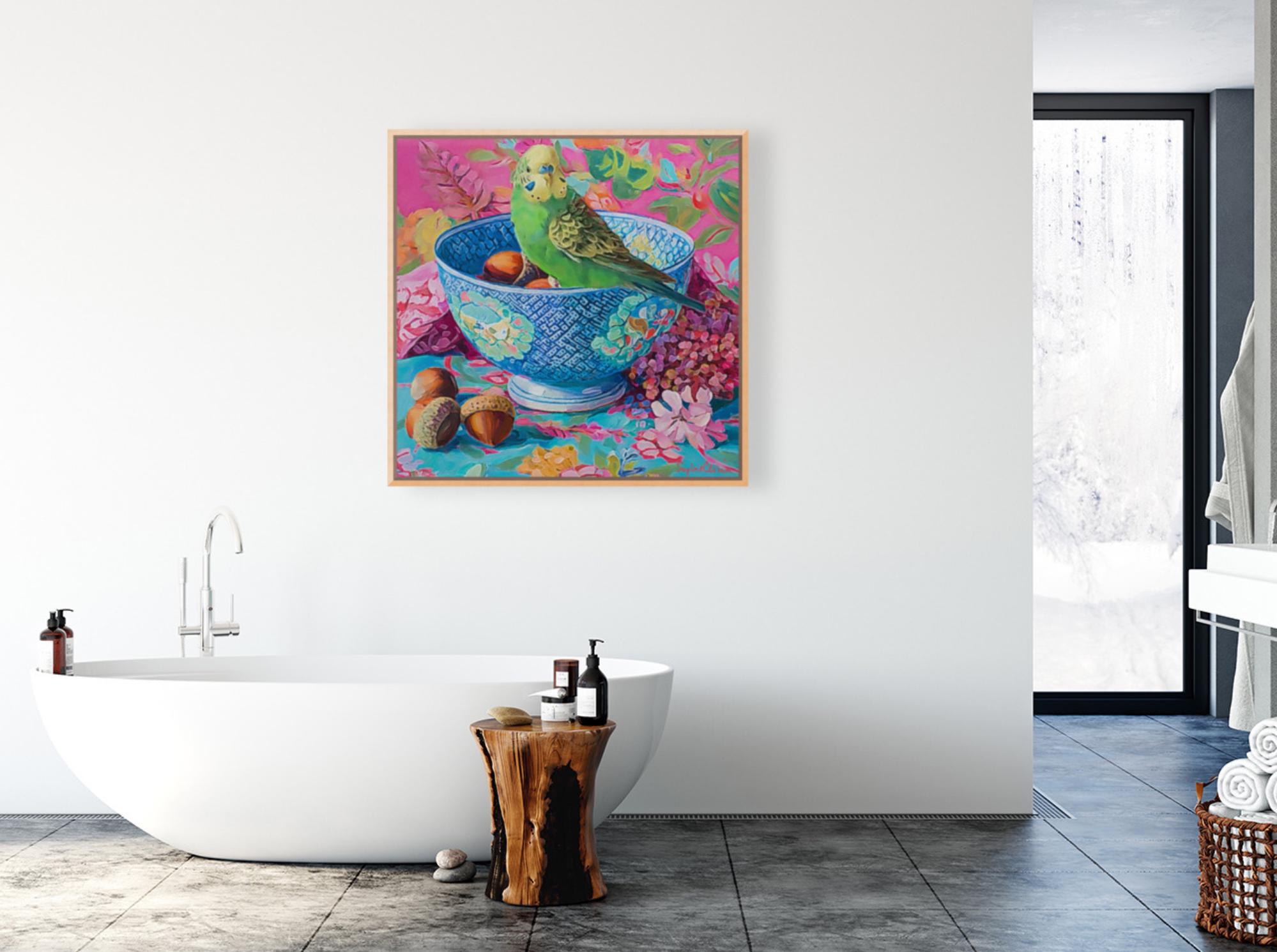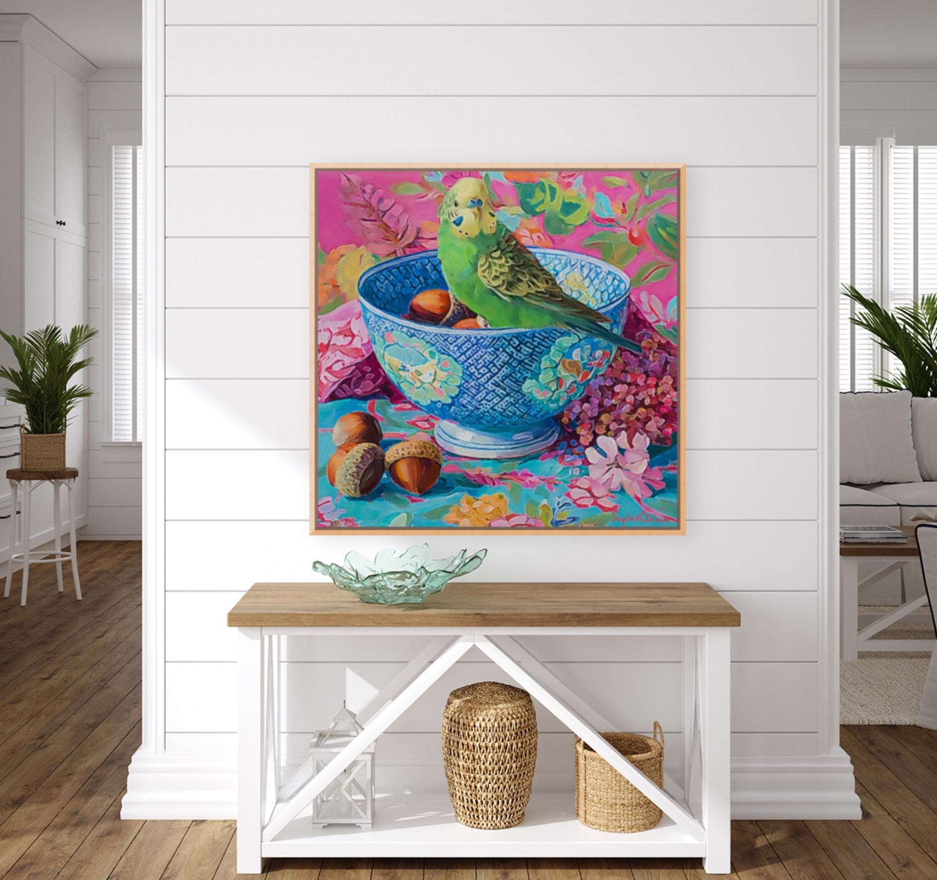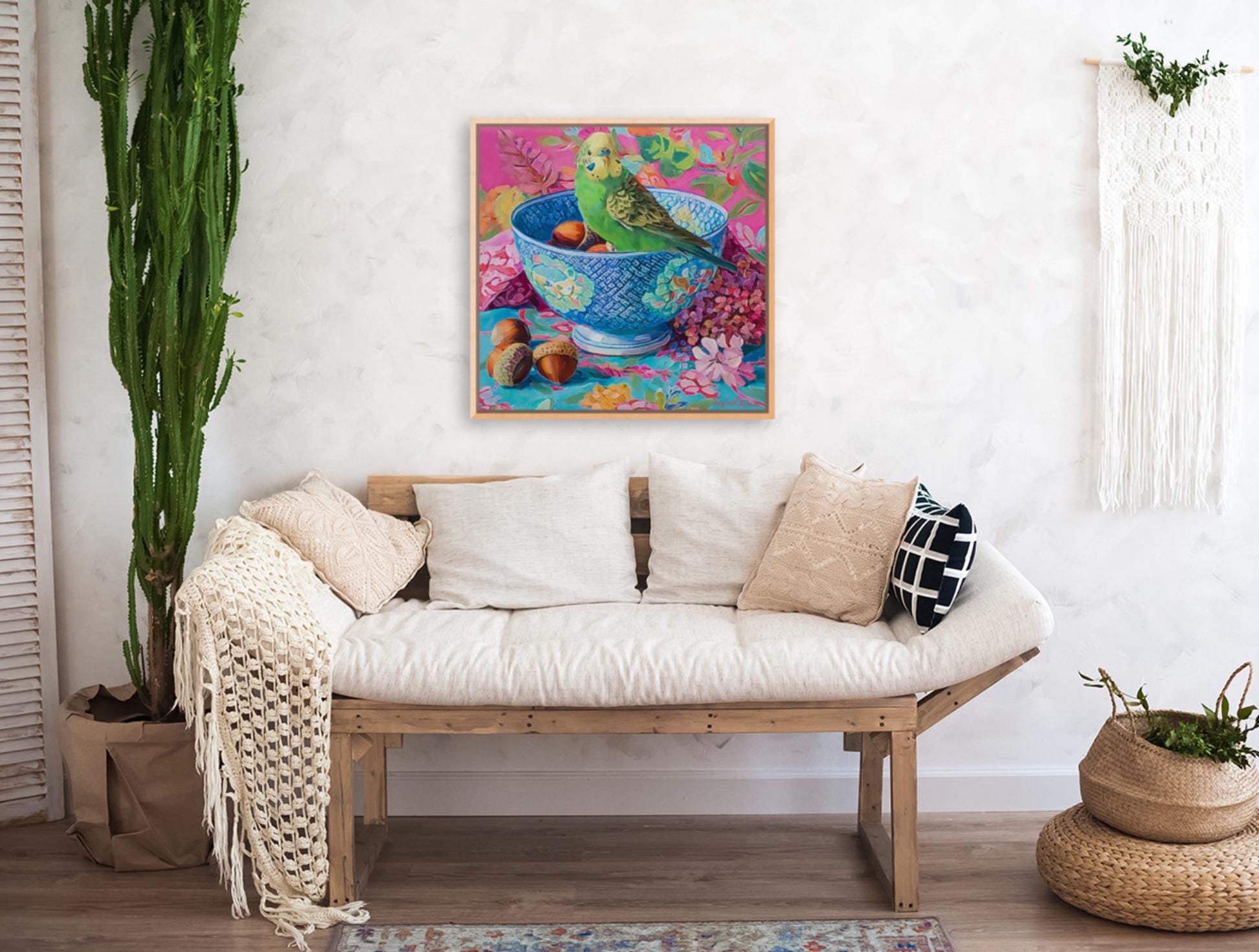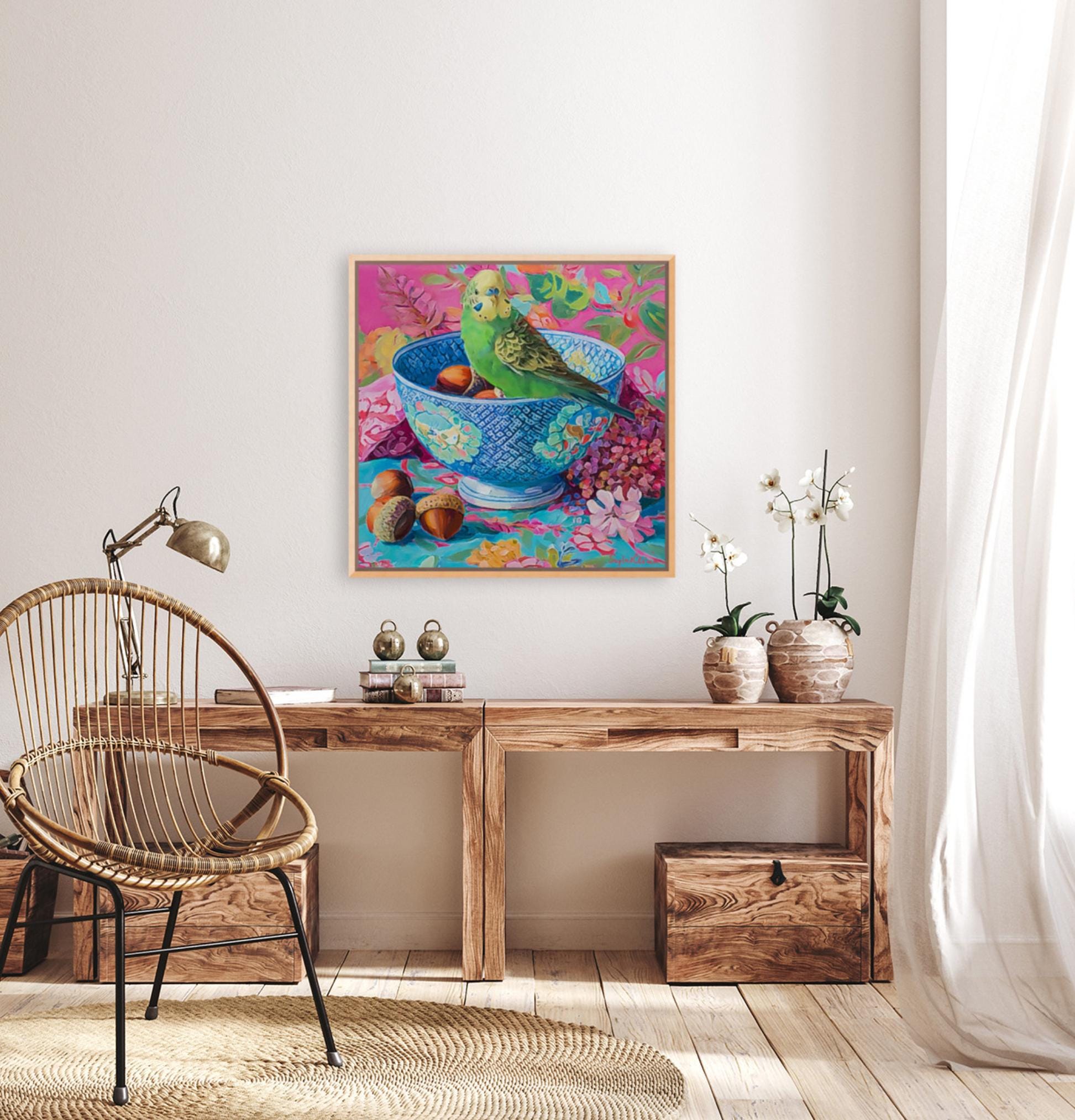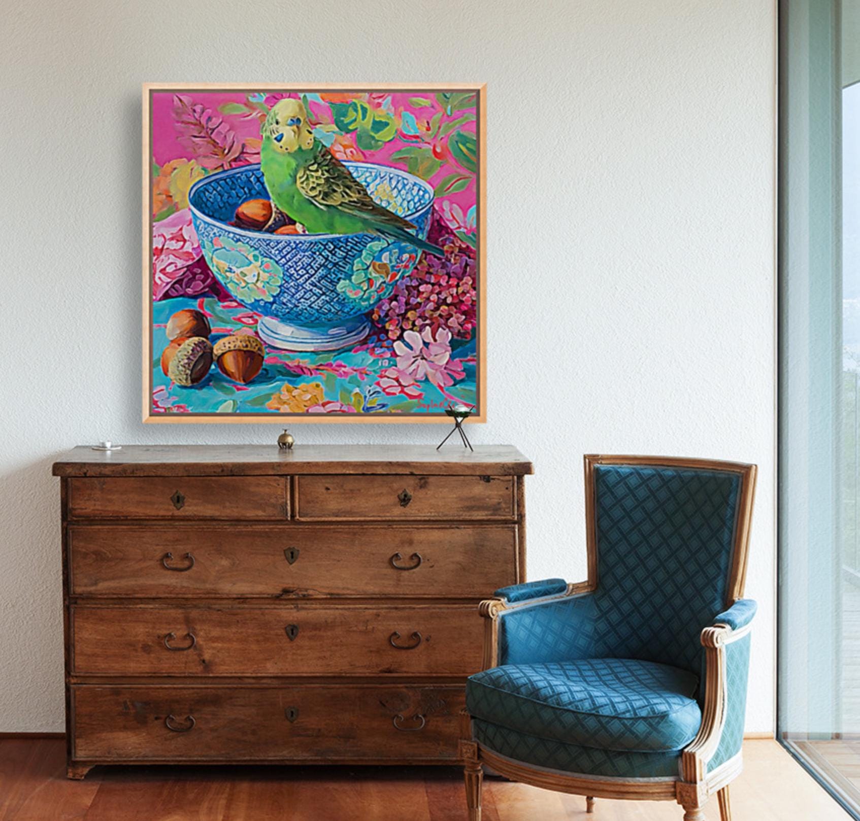 Grandmillennial art, green budgie on blue and white chinoiserie bowl, whimsical fine art