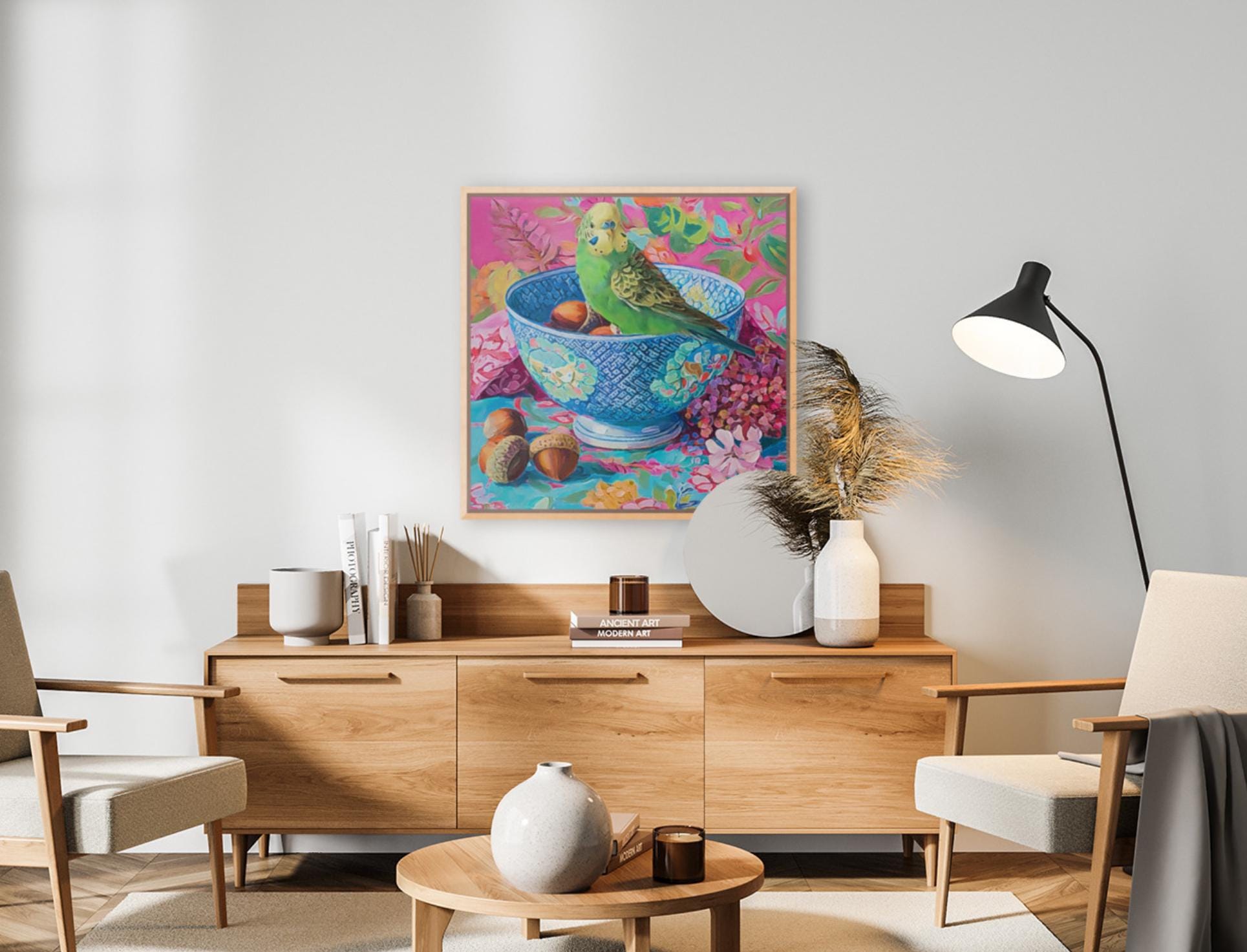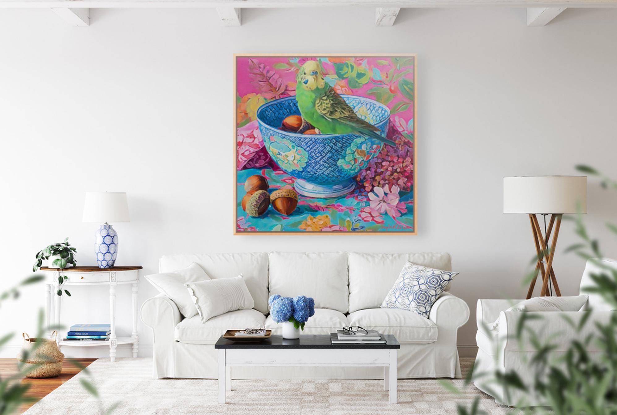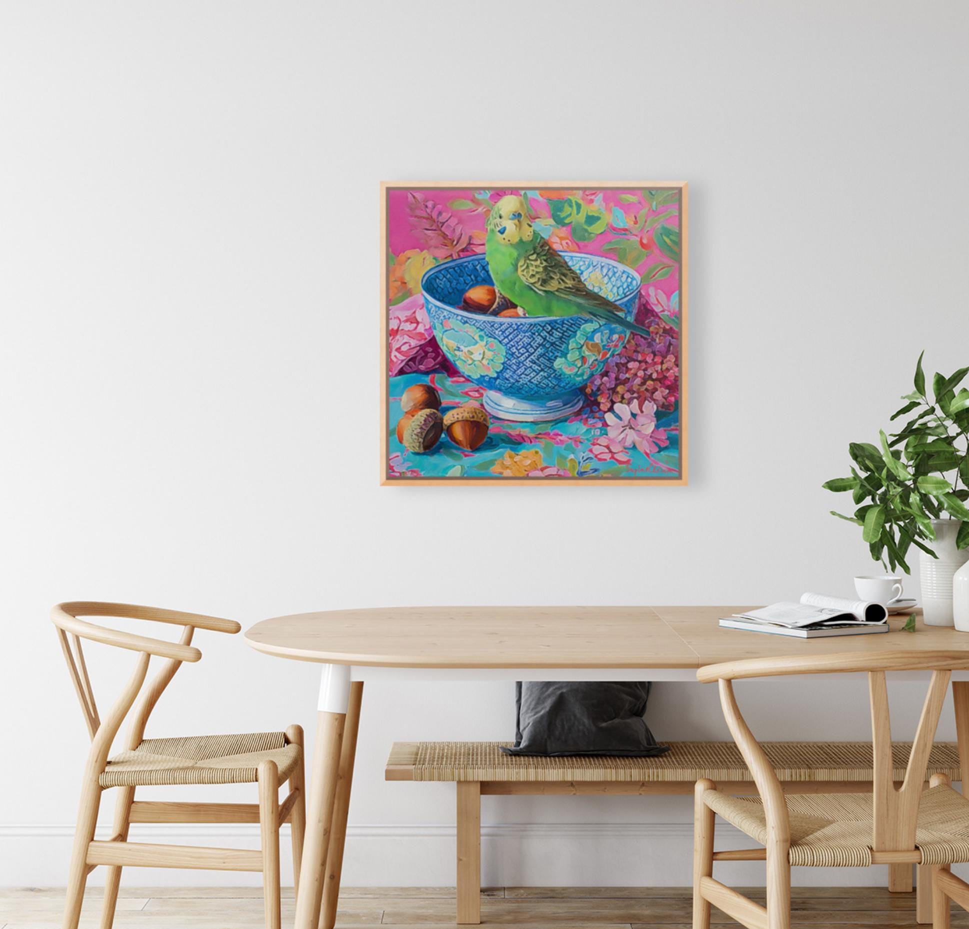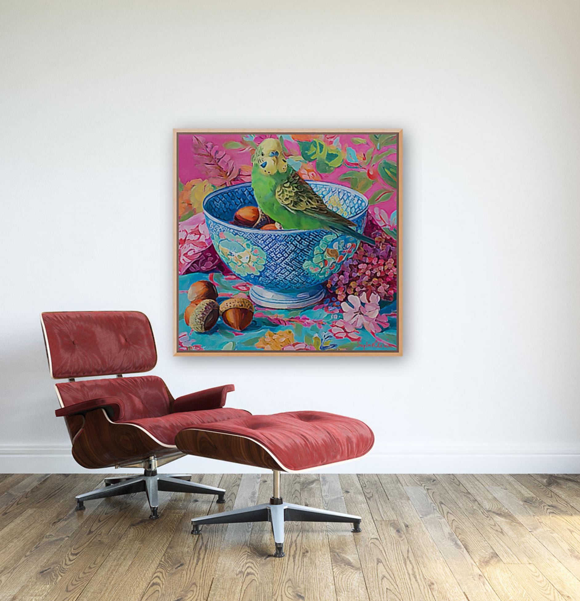 Grandmillennial art, green budgie on blue and white chinoiserie bowl, whimsical fine art