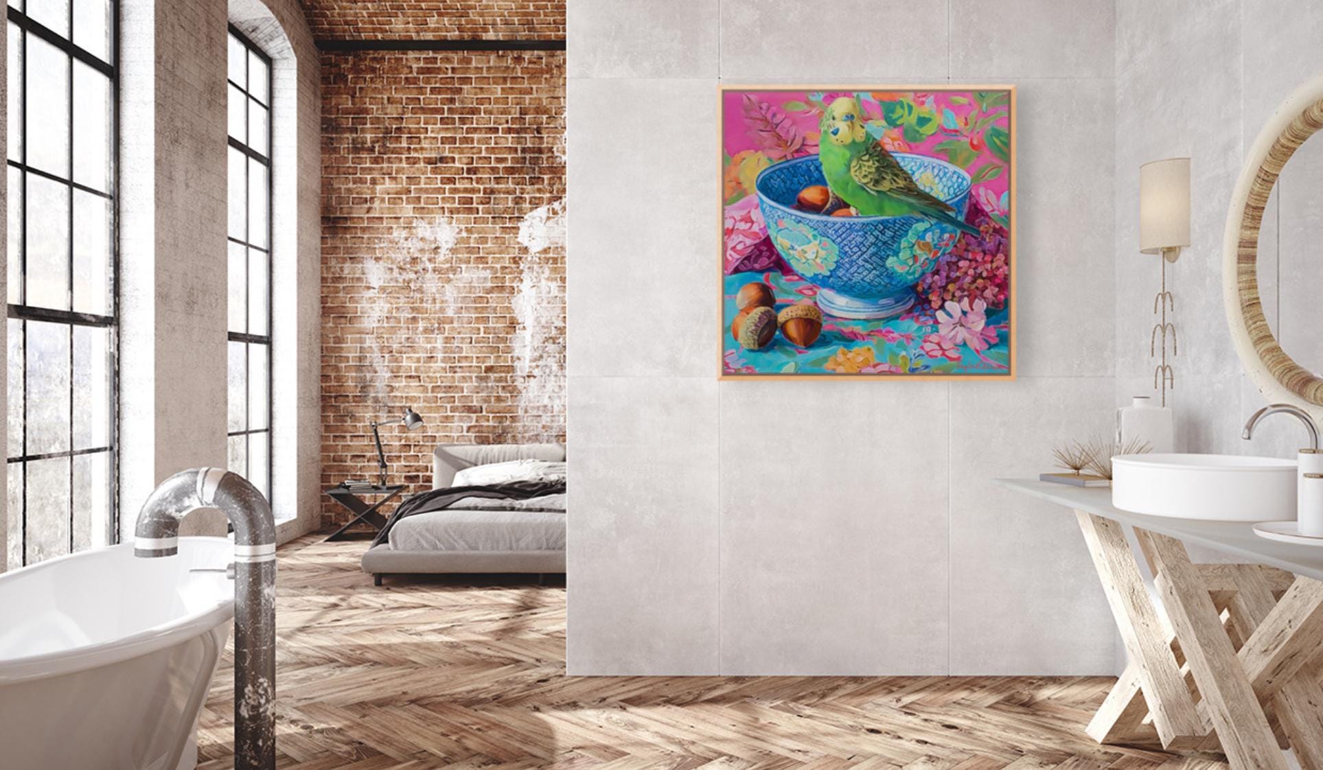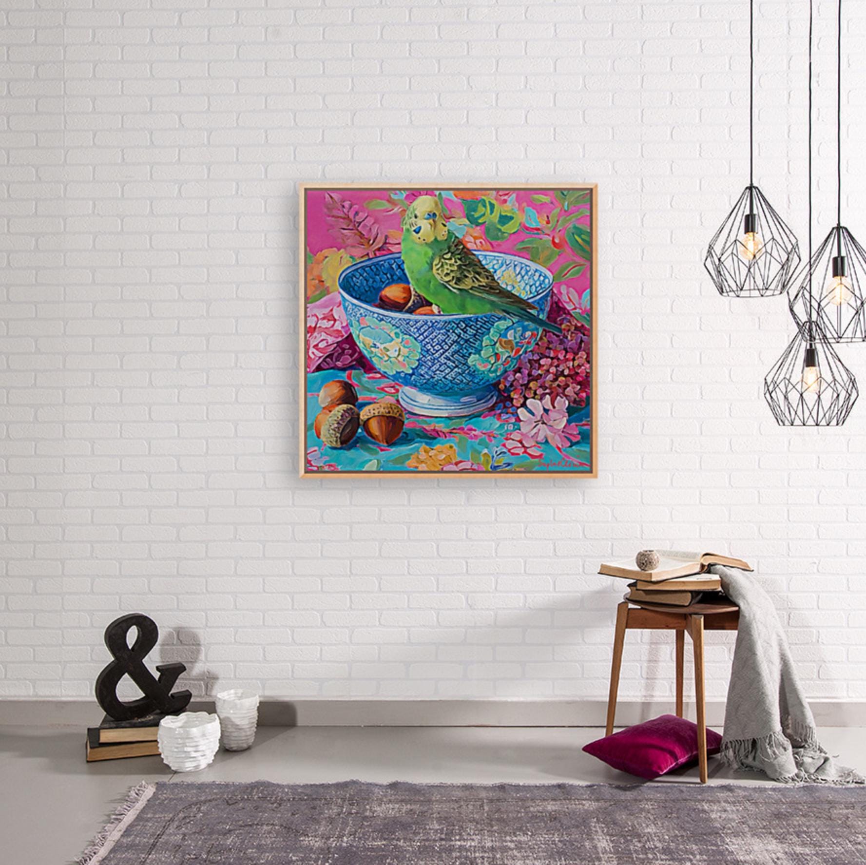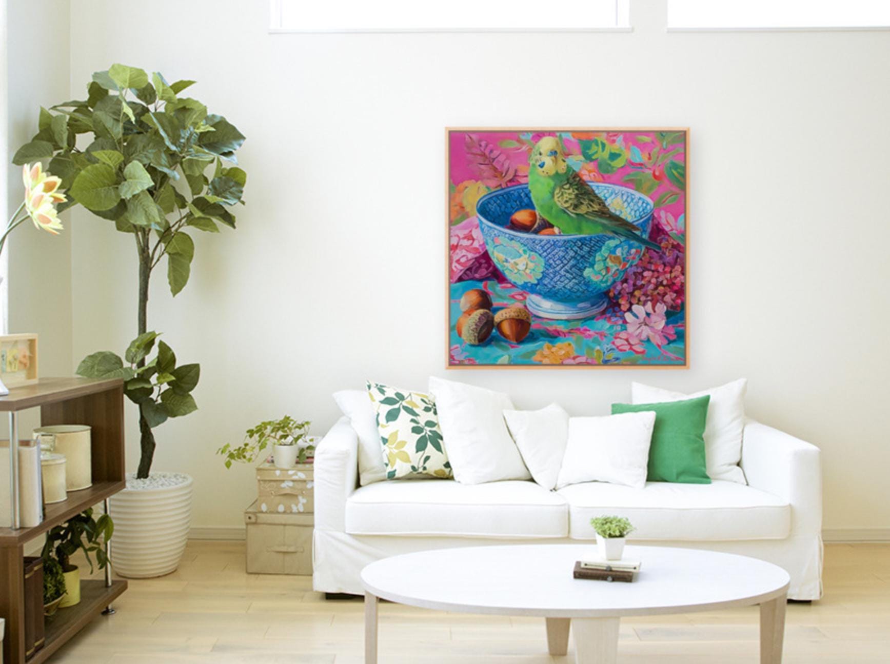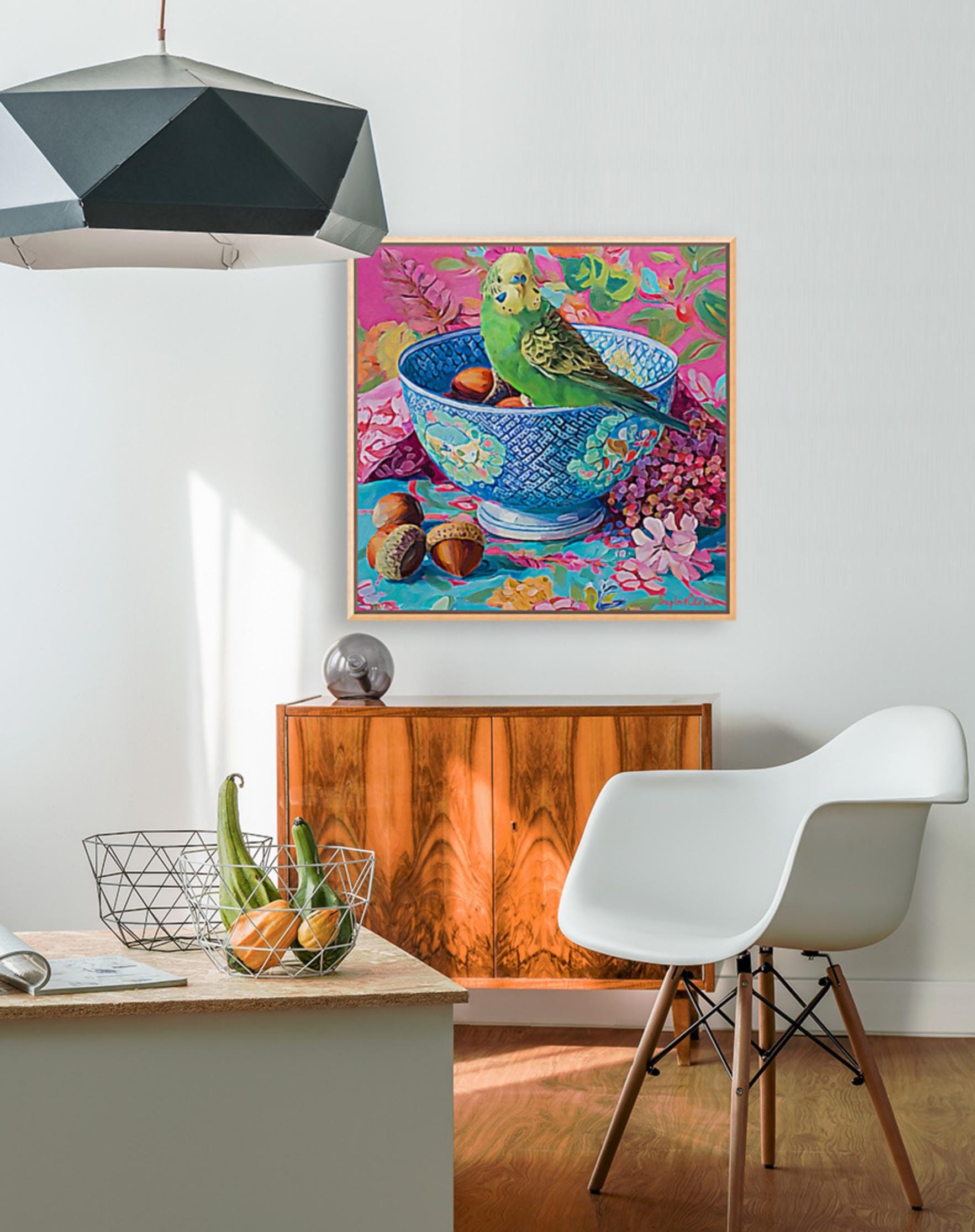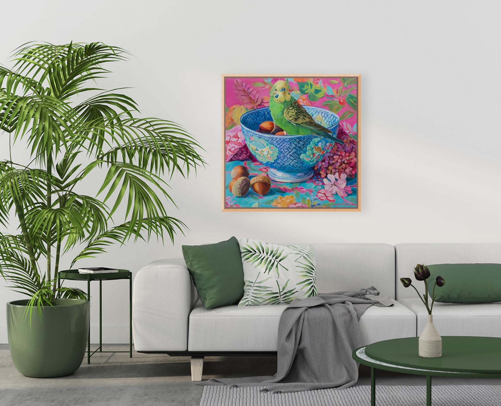 Grandmillennial art, green budgie on blue and white chinoiserie bowl, whimsical fine art