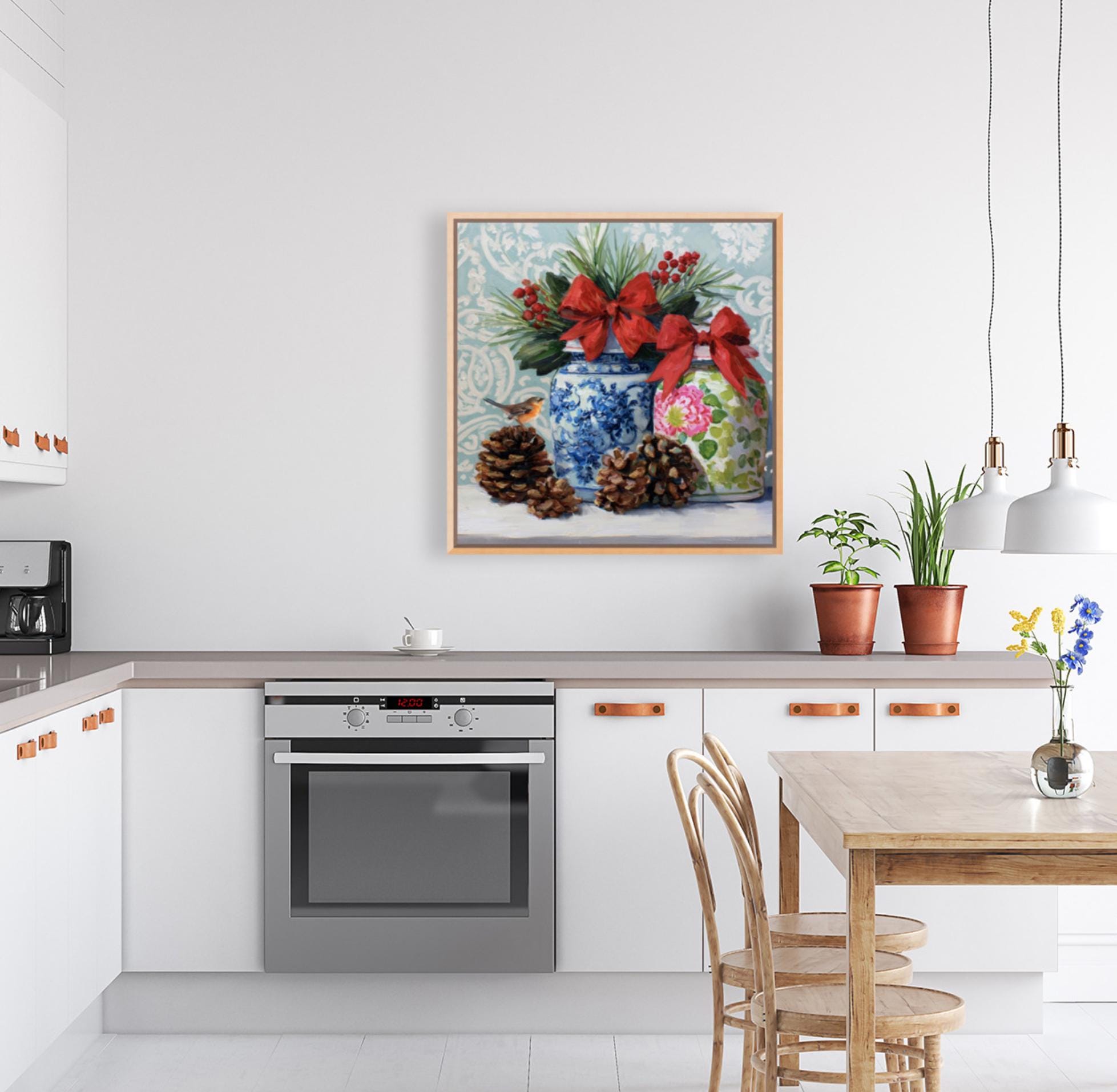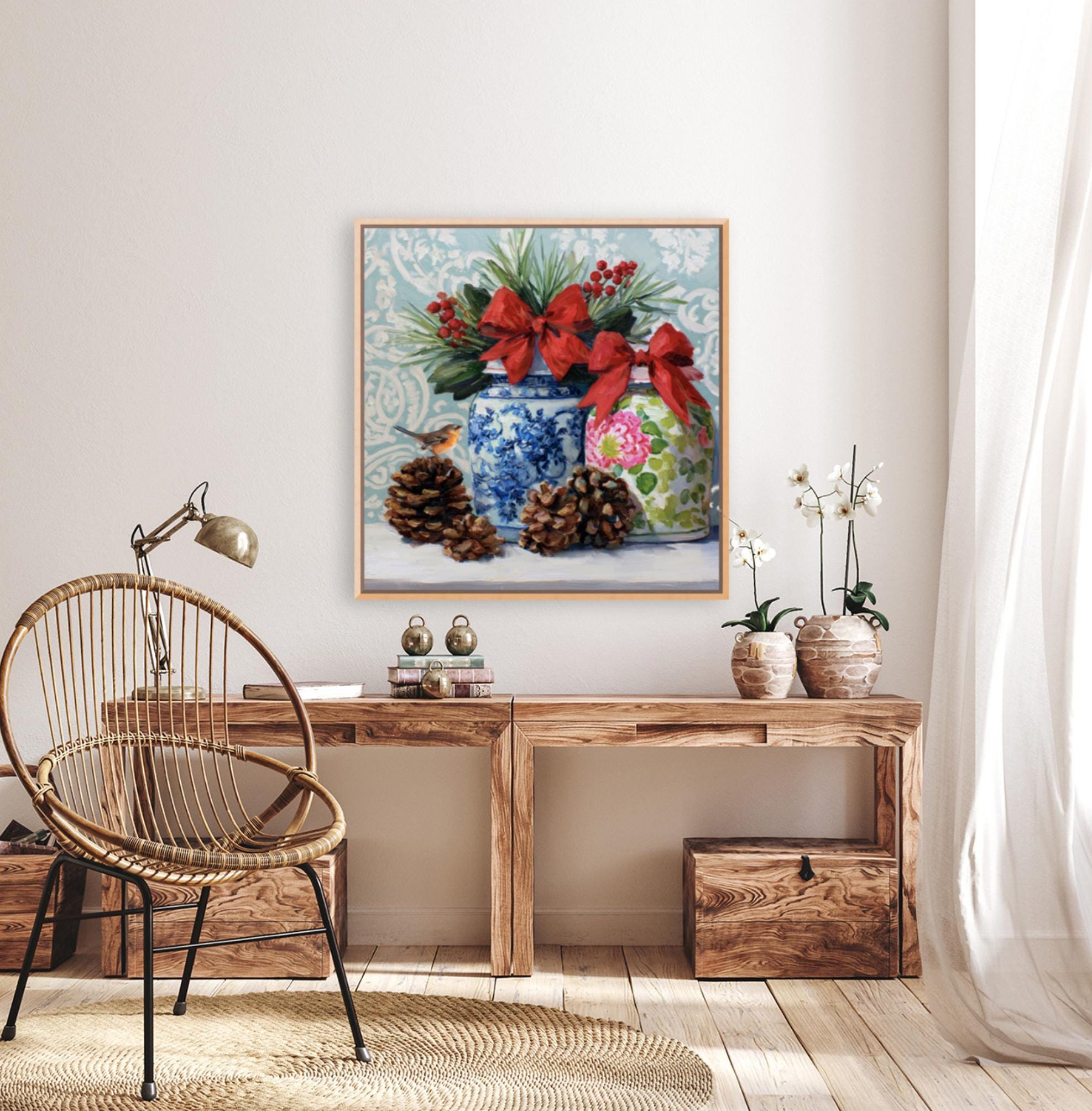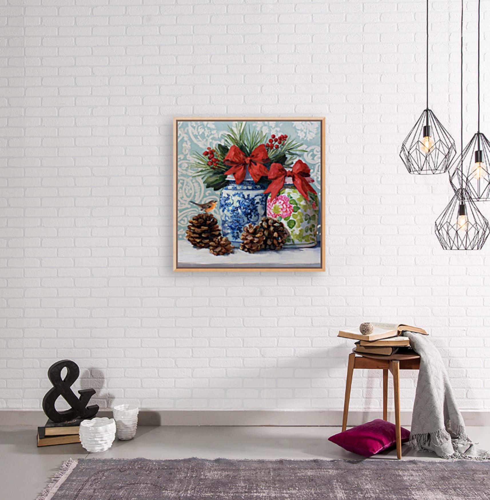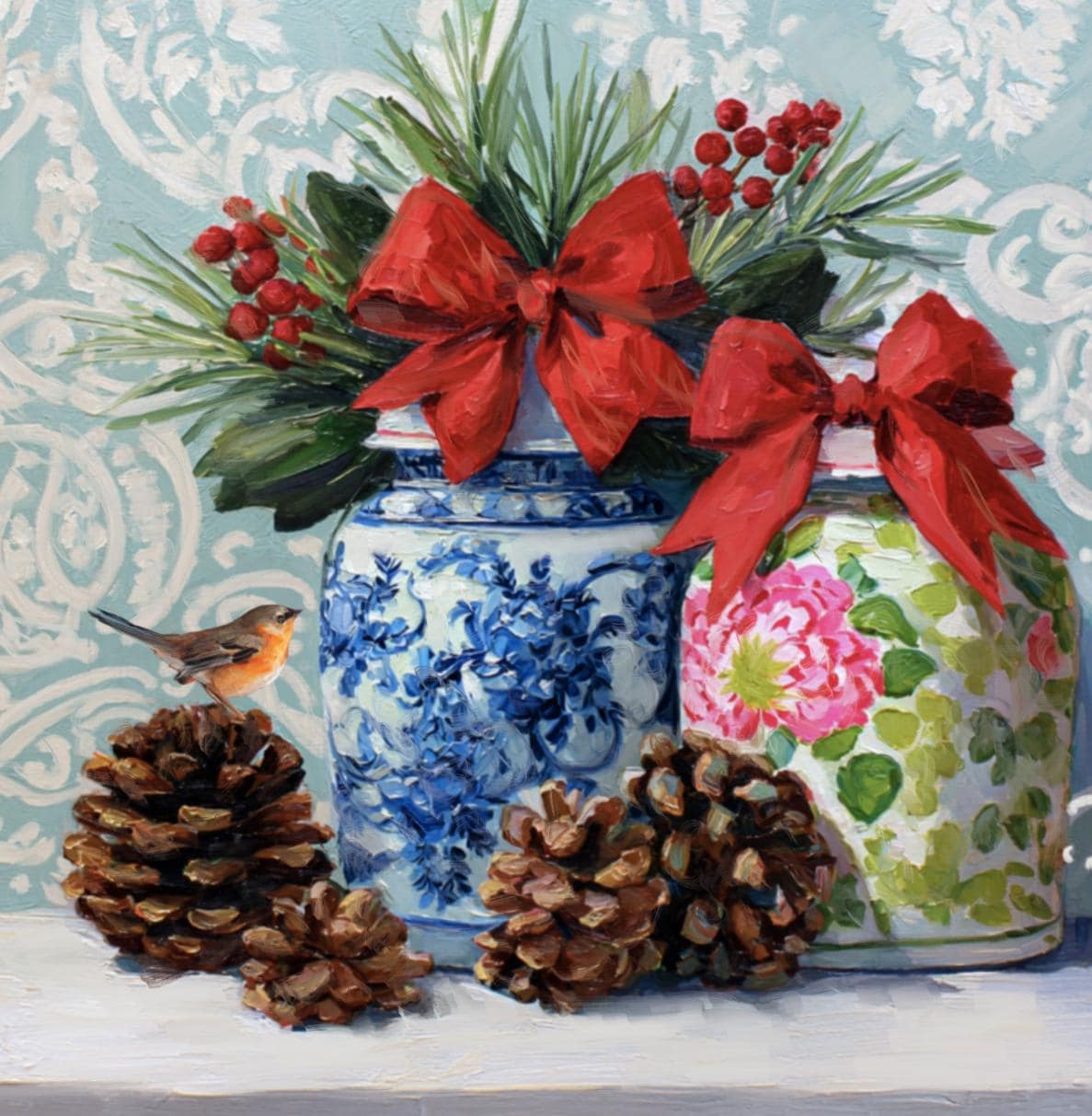 Christmas Still Life Giclée Print: Ginger Jars, Robin and Pine Cones
