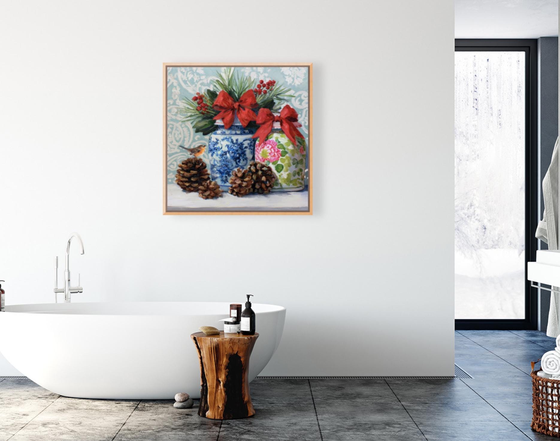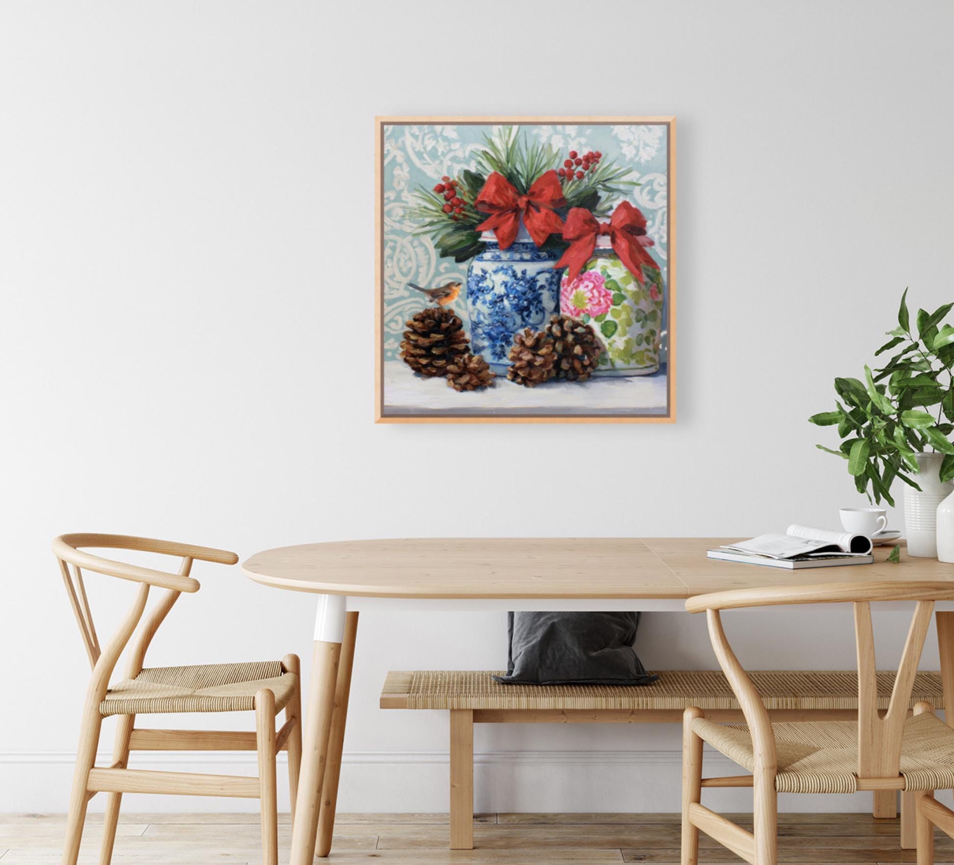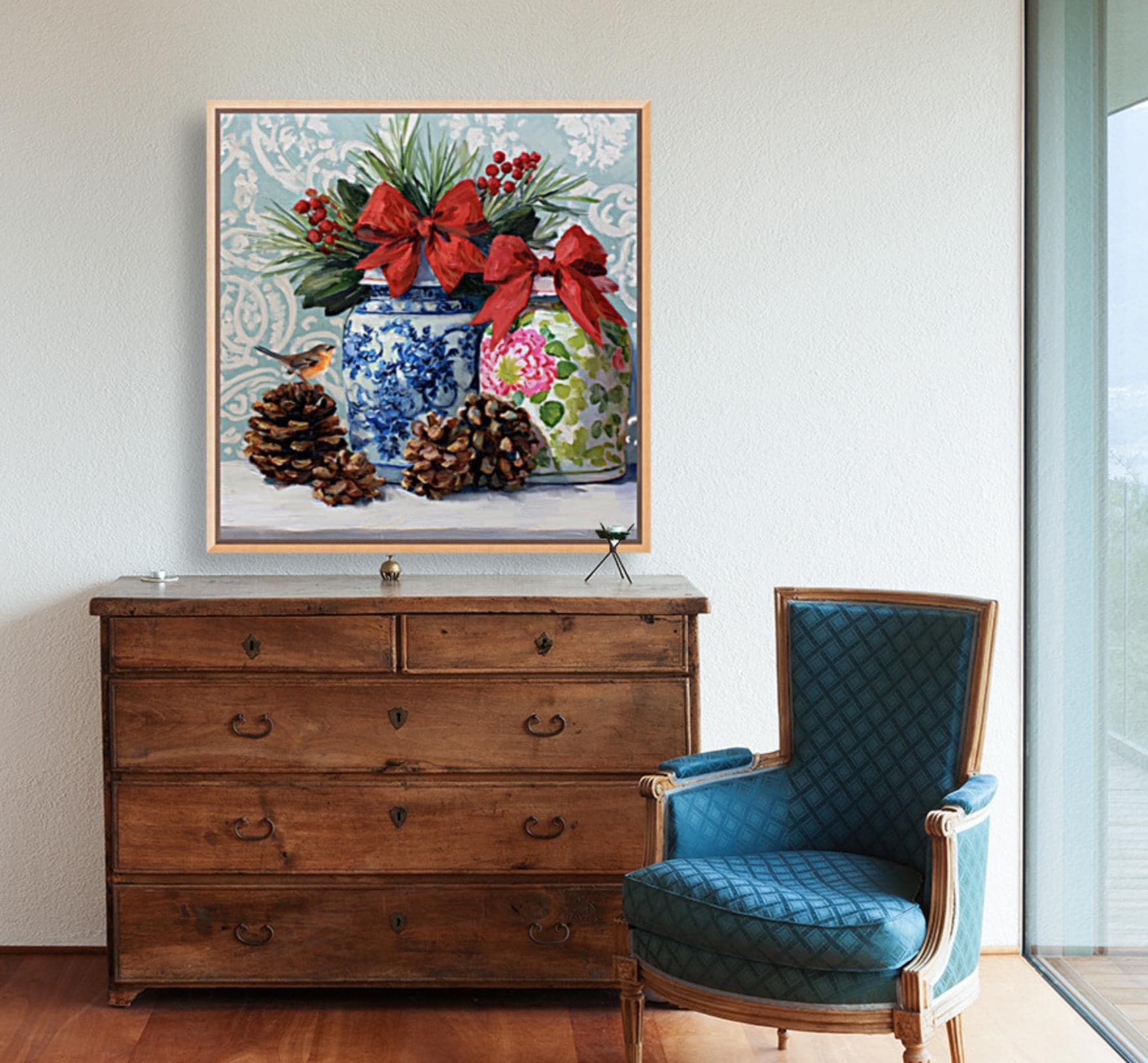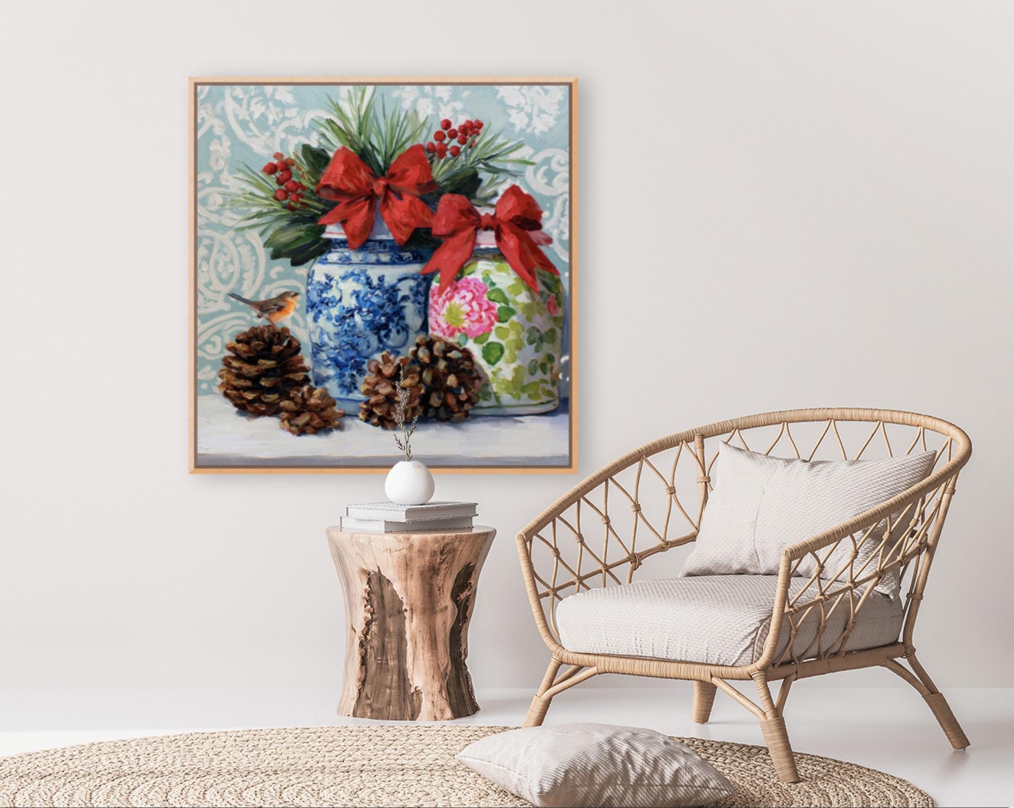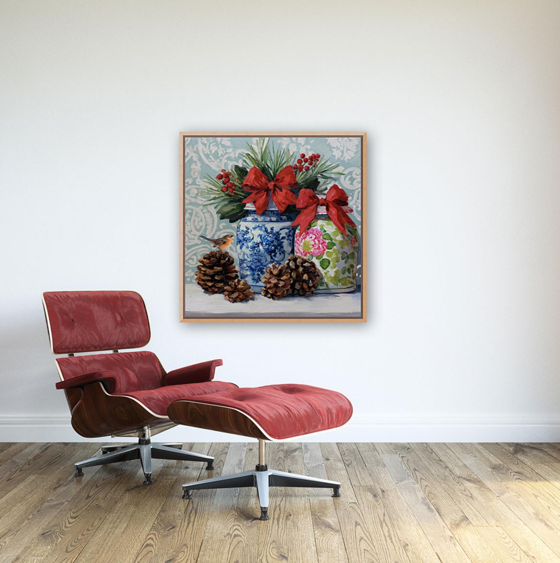 Christmas Still Life Giclée Print: Ginger Jars, Robin and Pine Cones