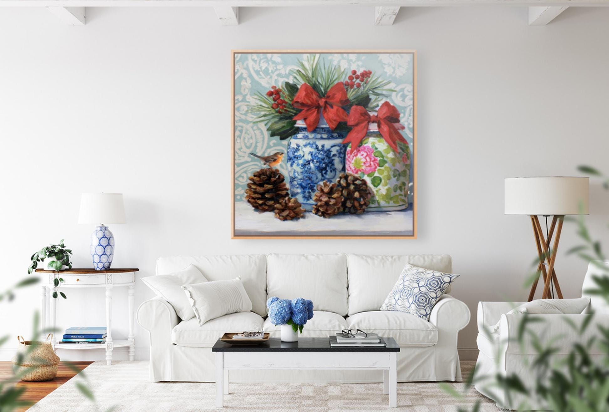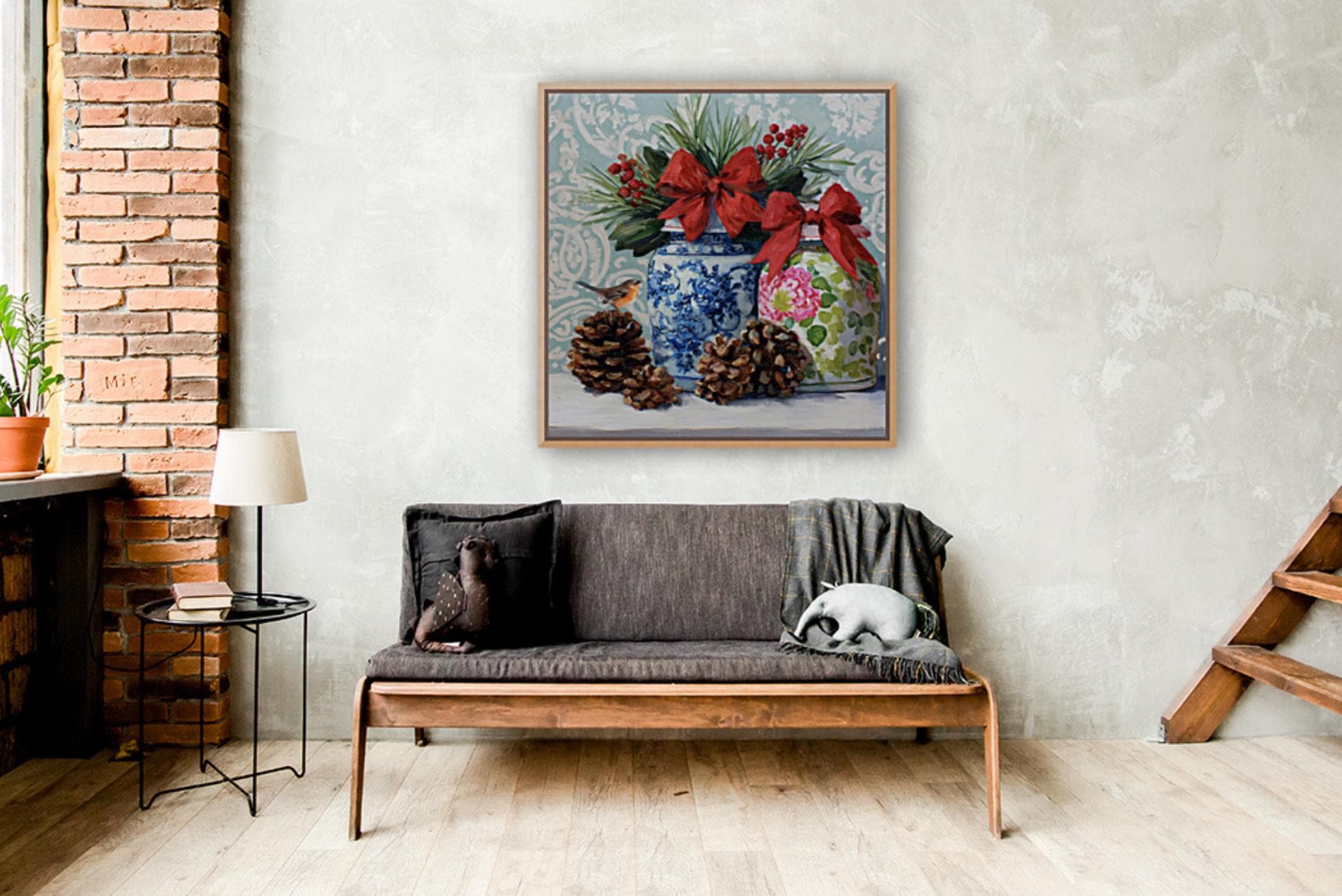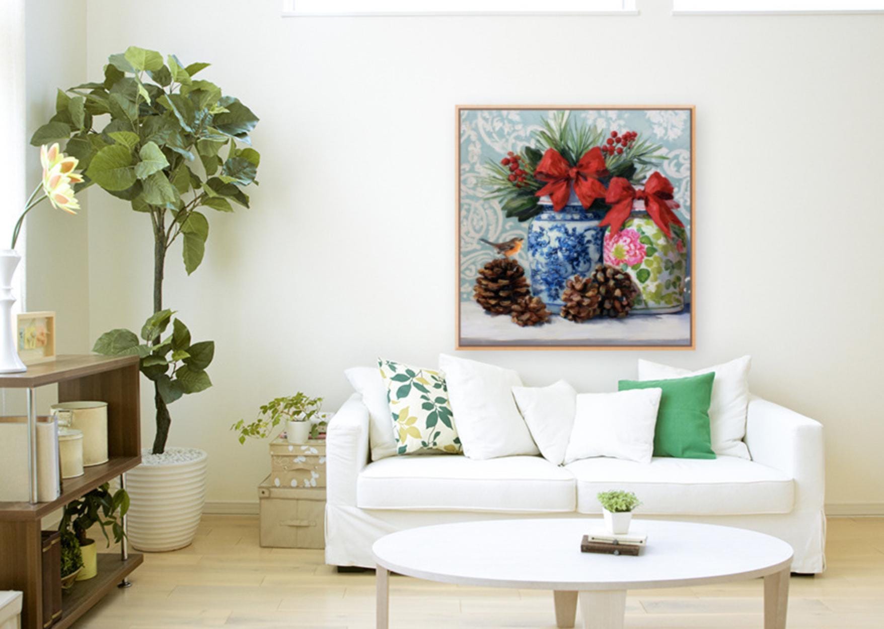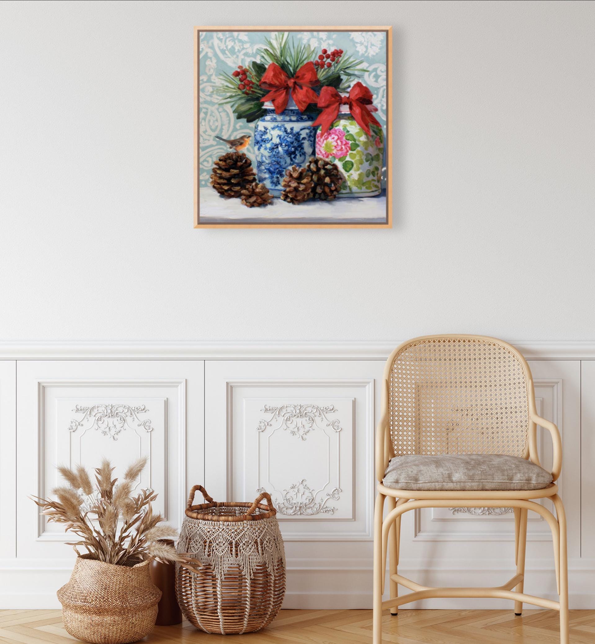 Christmas Still Life Giclée Print: Ginger Jars, Robin and Pine Cones