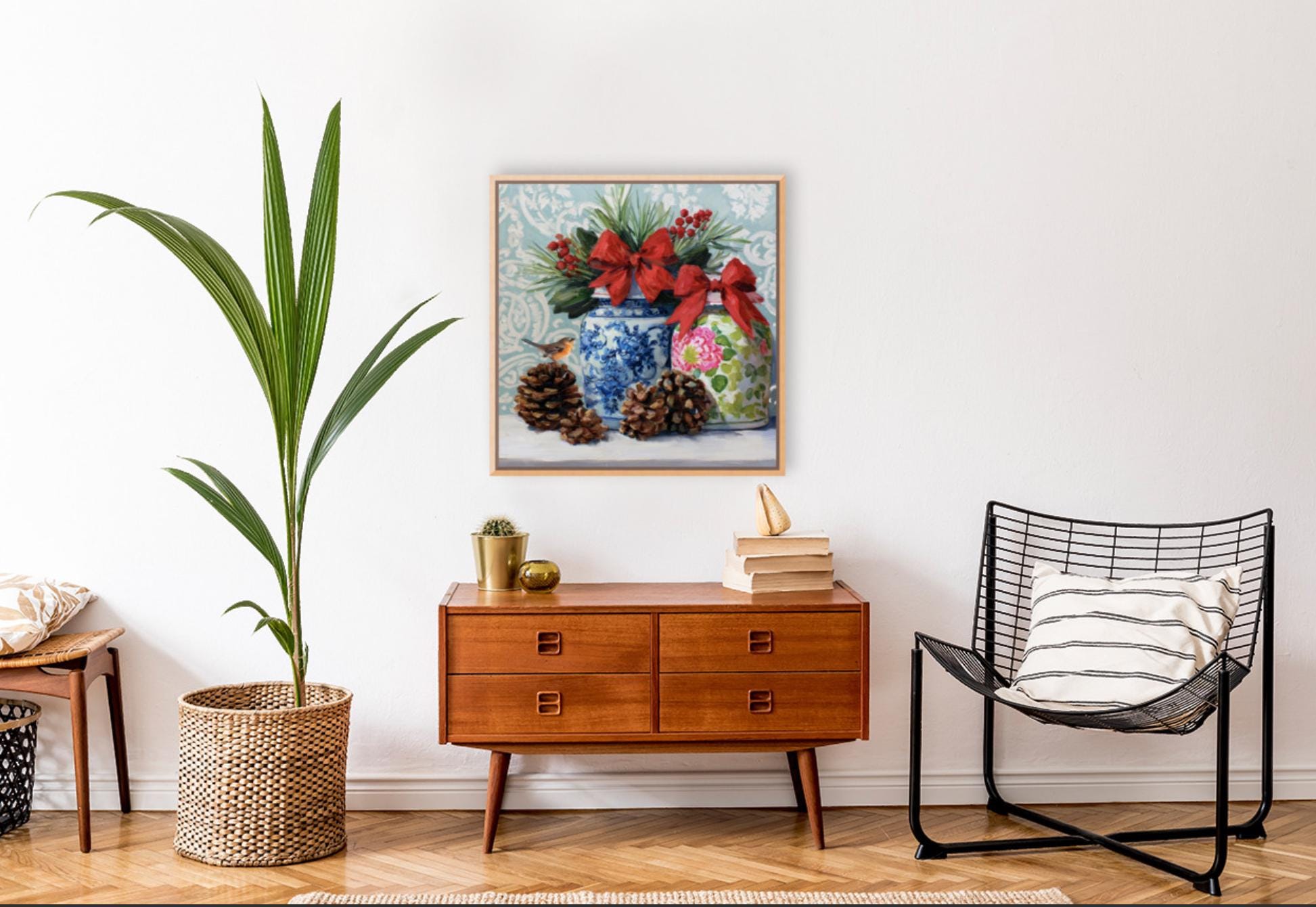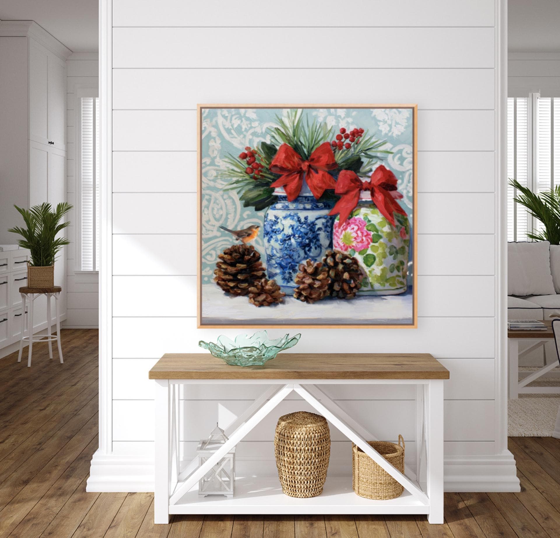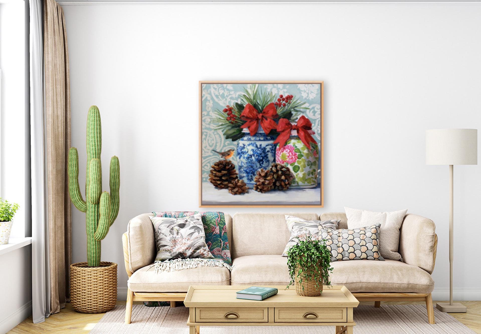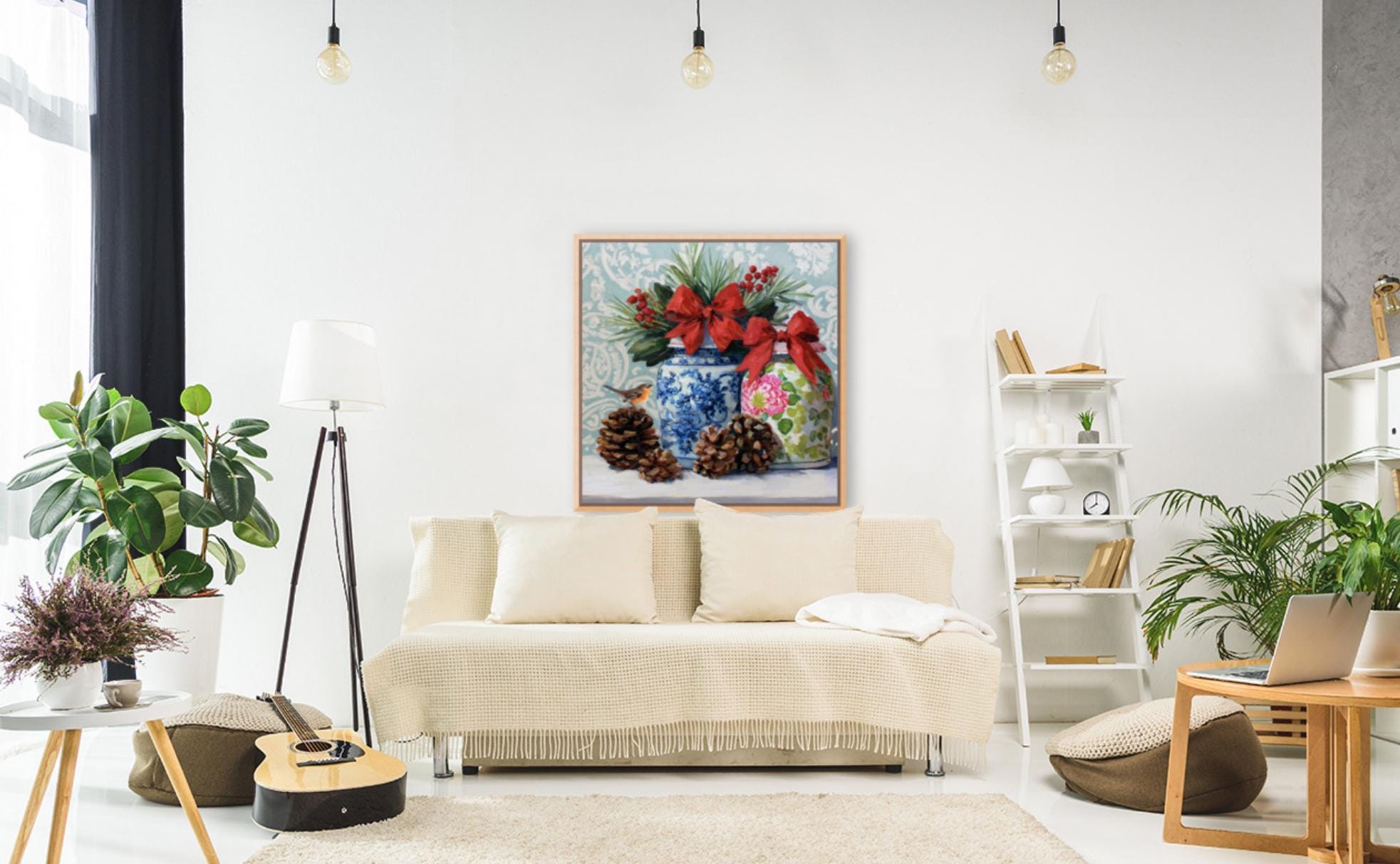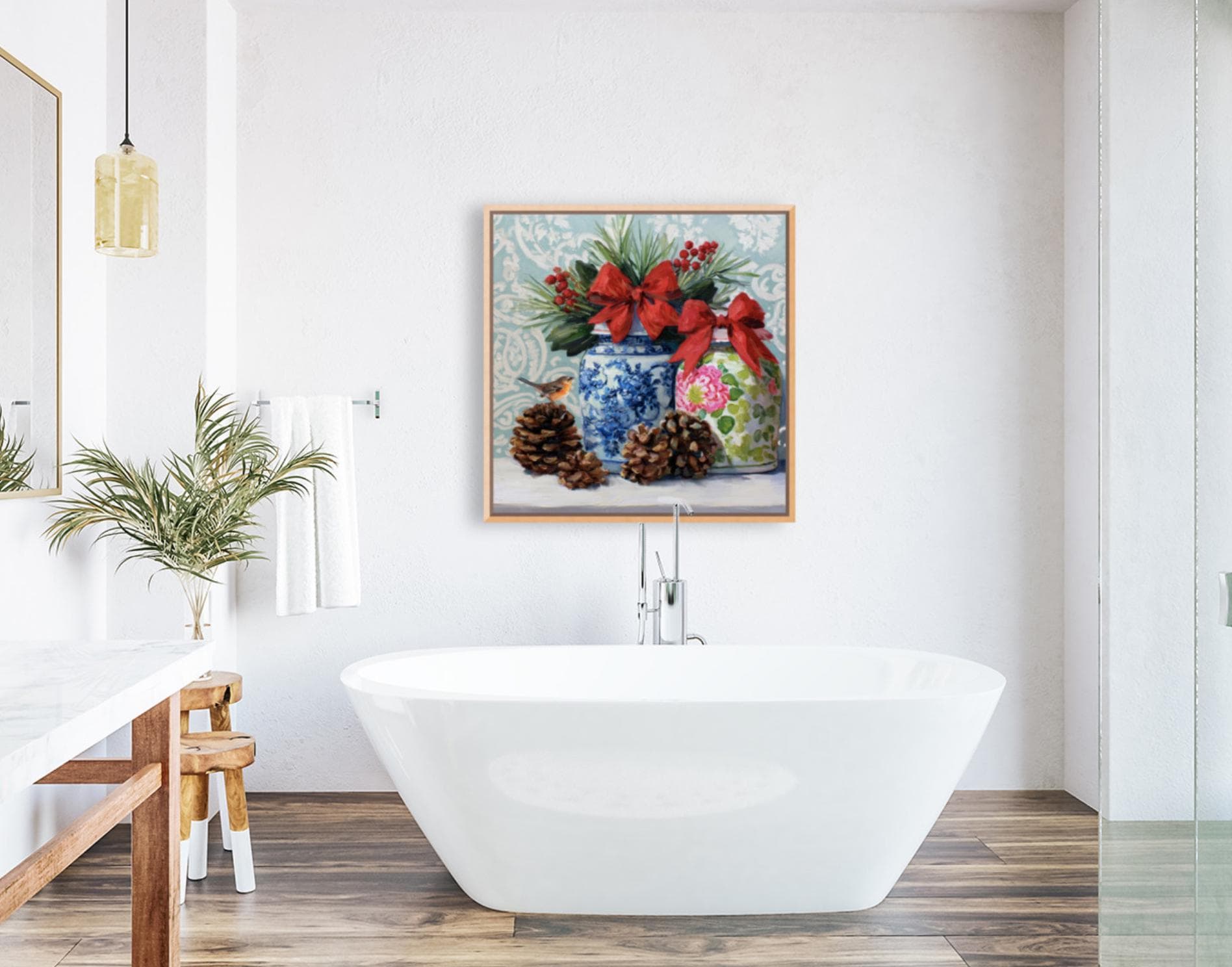 Christmas Still Life Giclée Print: Ginger Jars, Robin and Pine Cones
