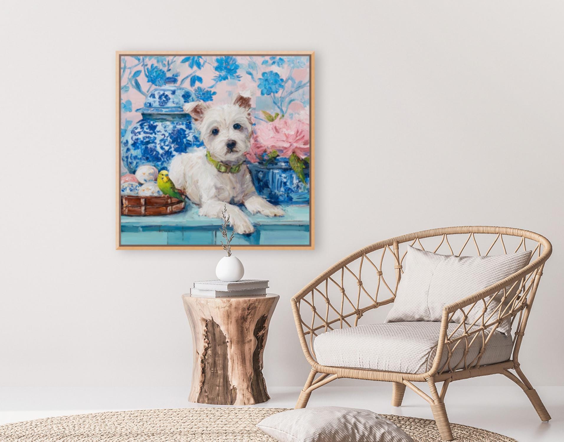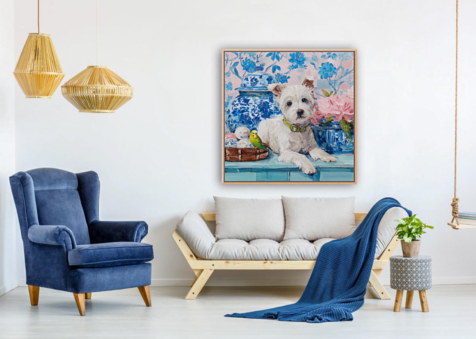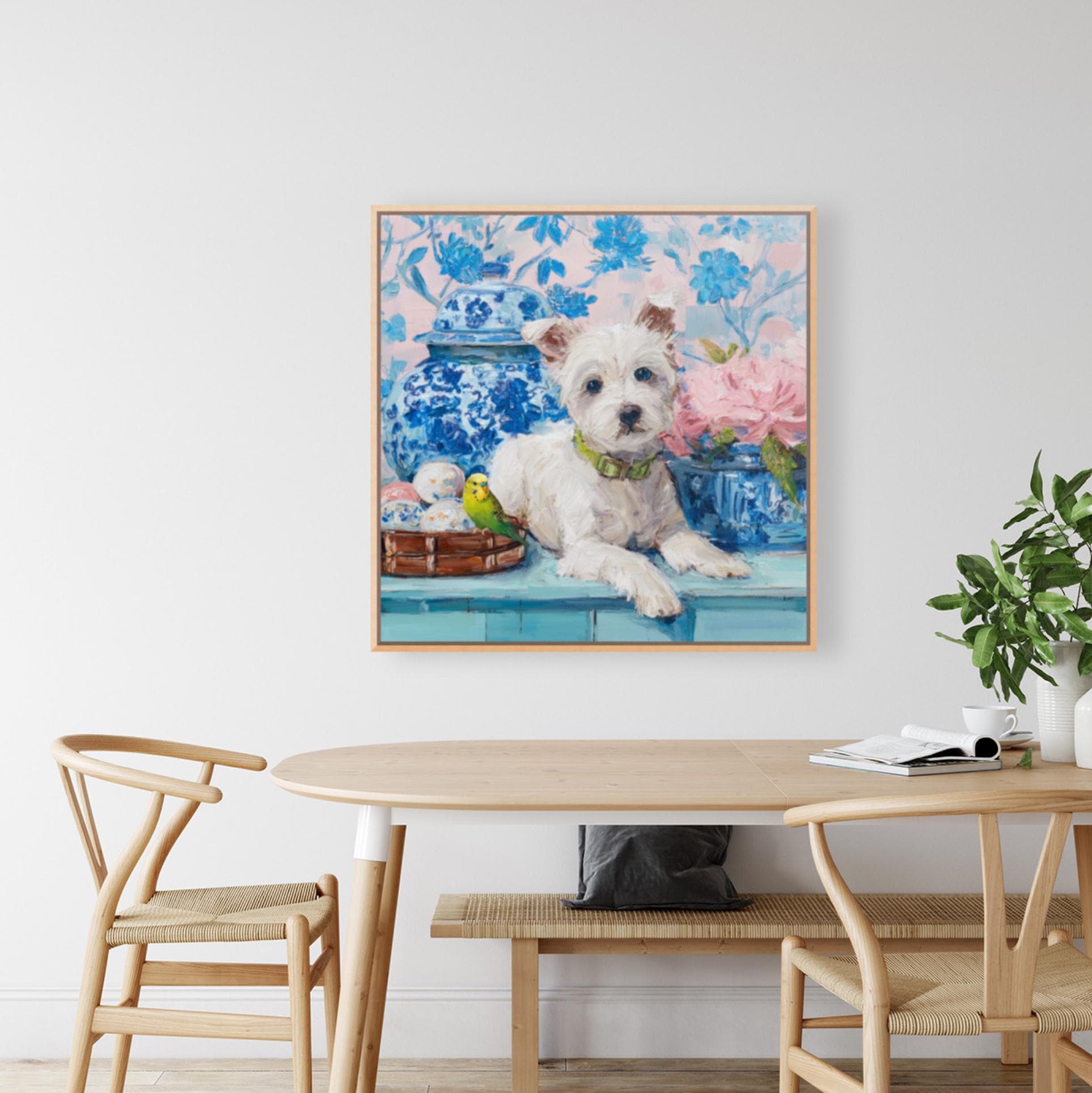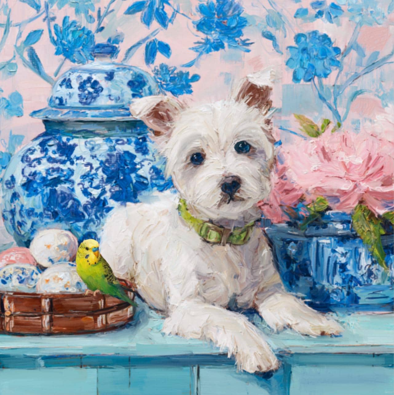 Terrier and Budgie Giclee Print, Whimsical Dog Art