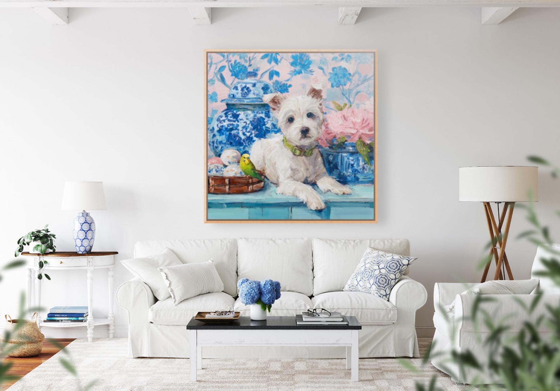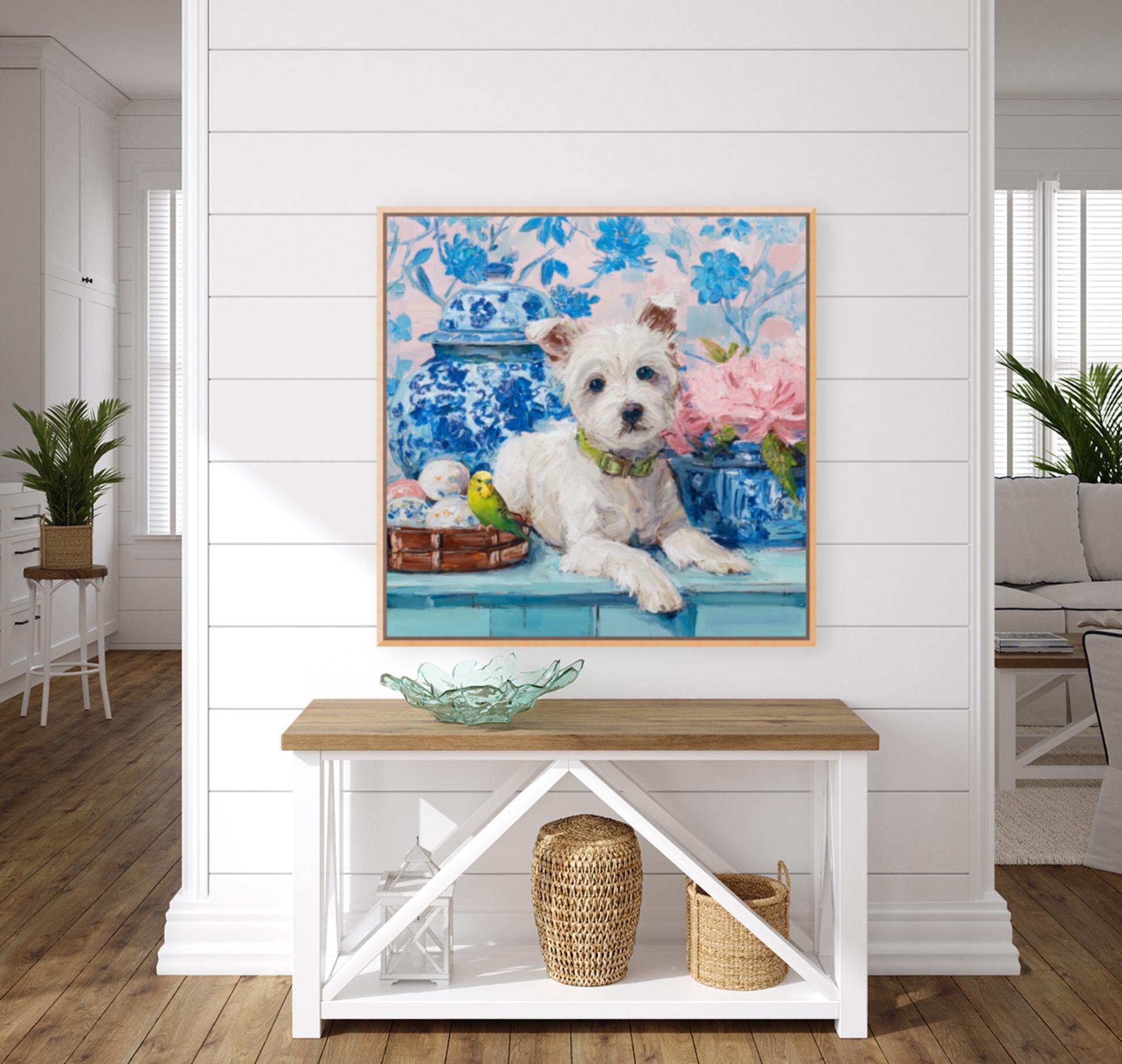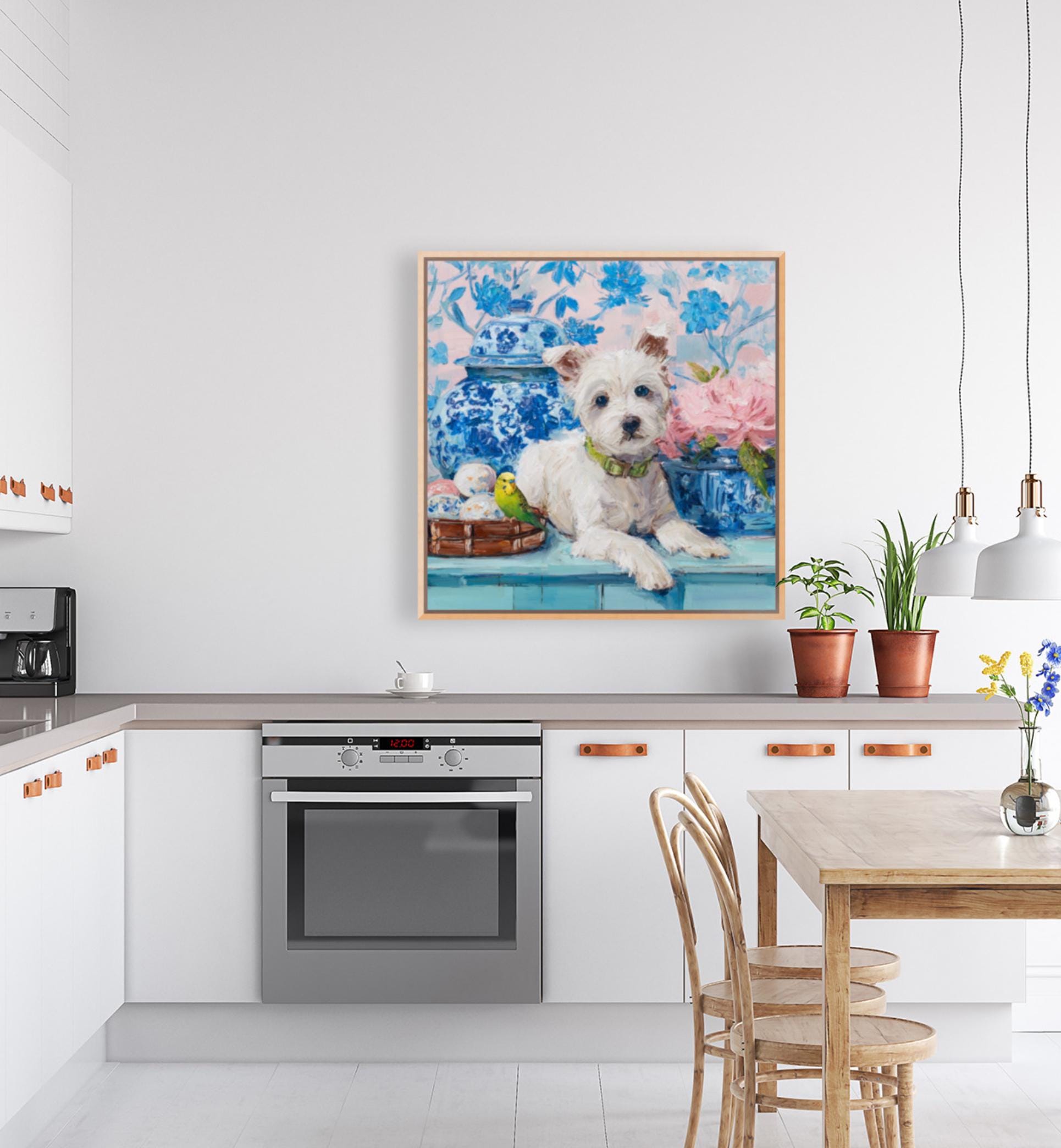 Terrier and Budgie Giclee Print, Whimsical Dog Art