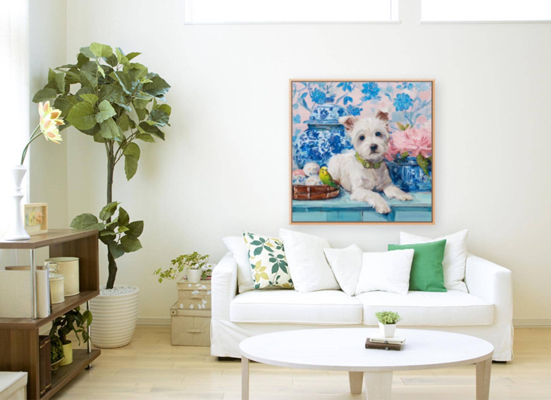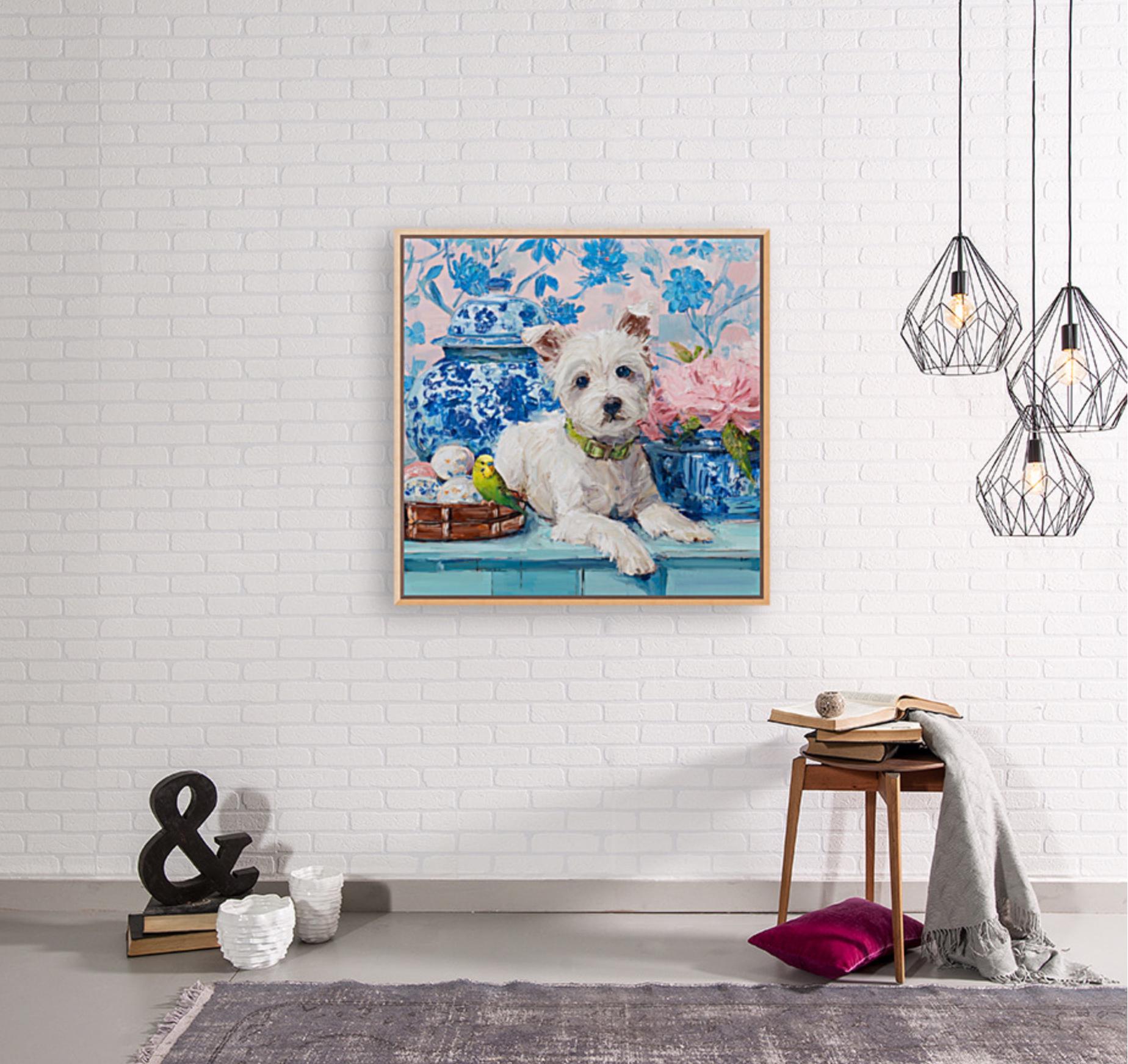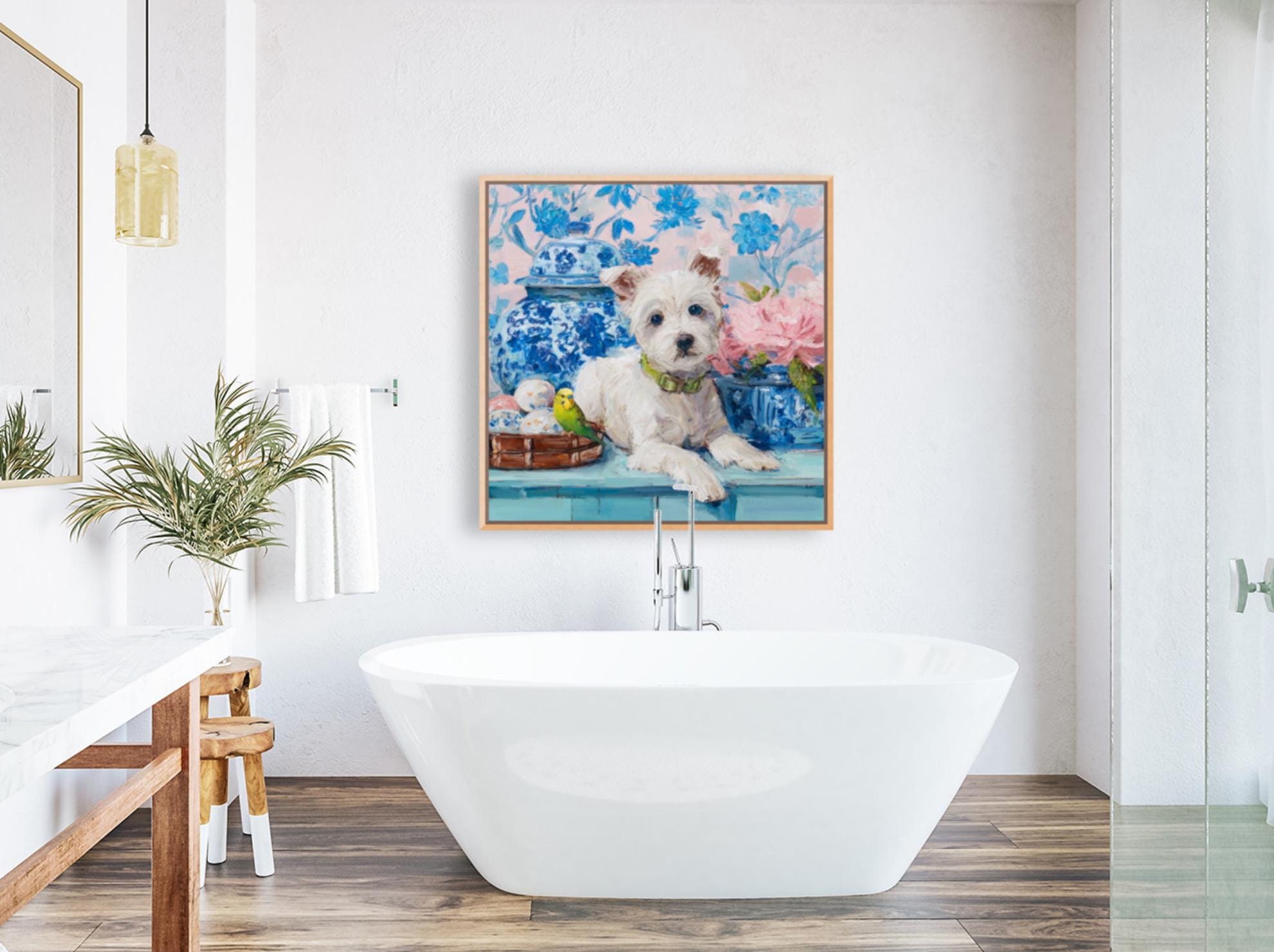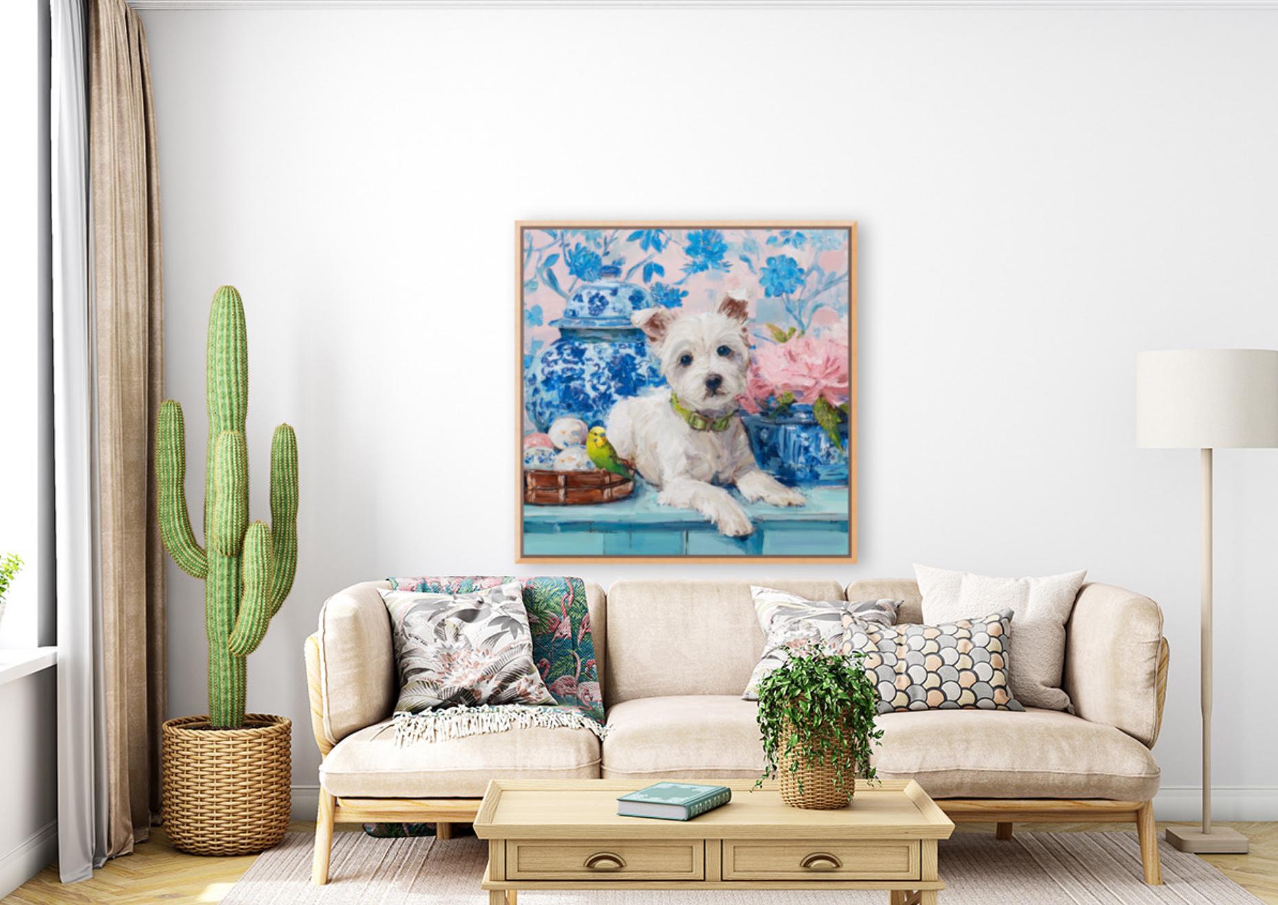 Terrier and Budgie Giclee Print, Whimsical Dog Art