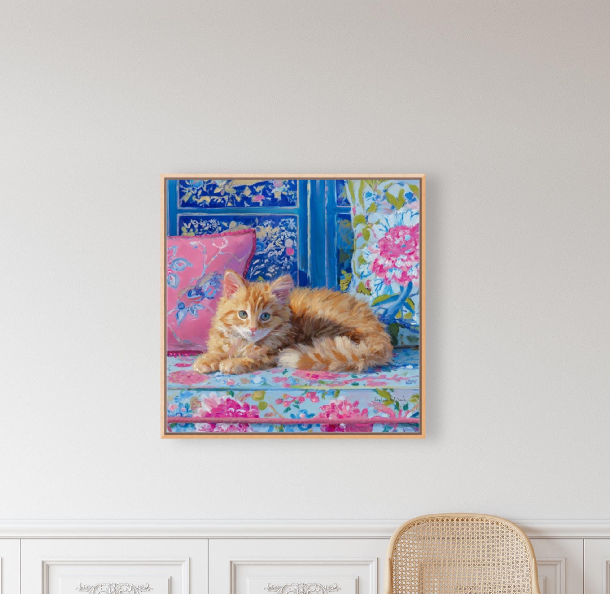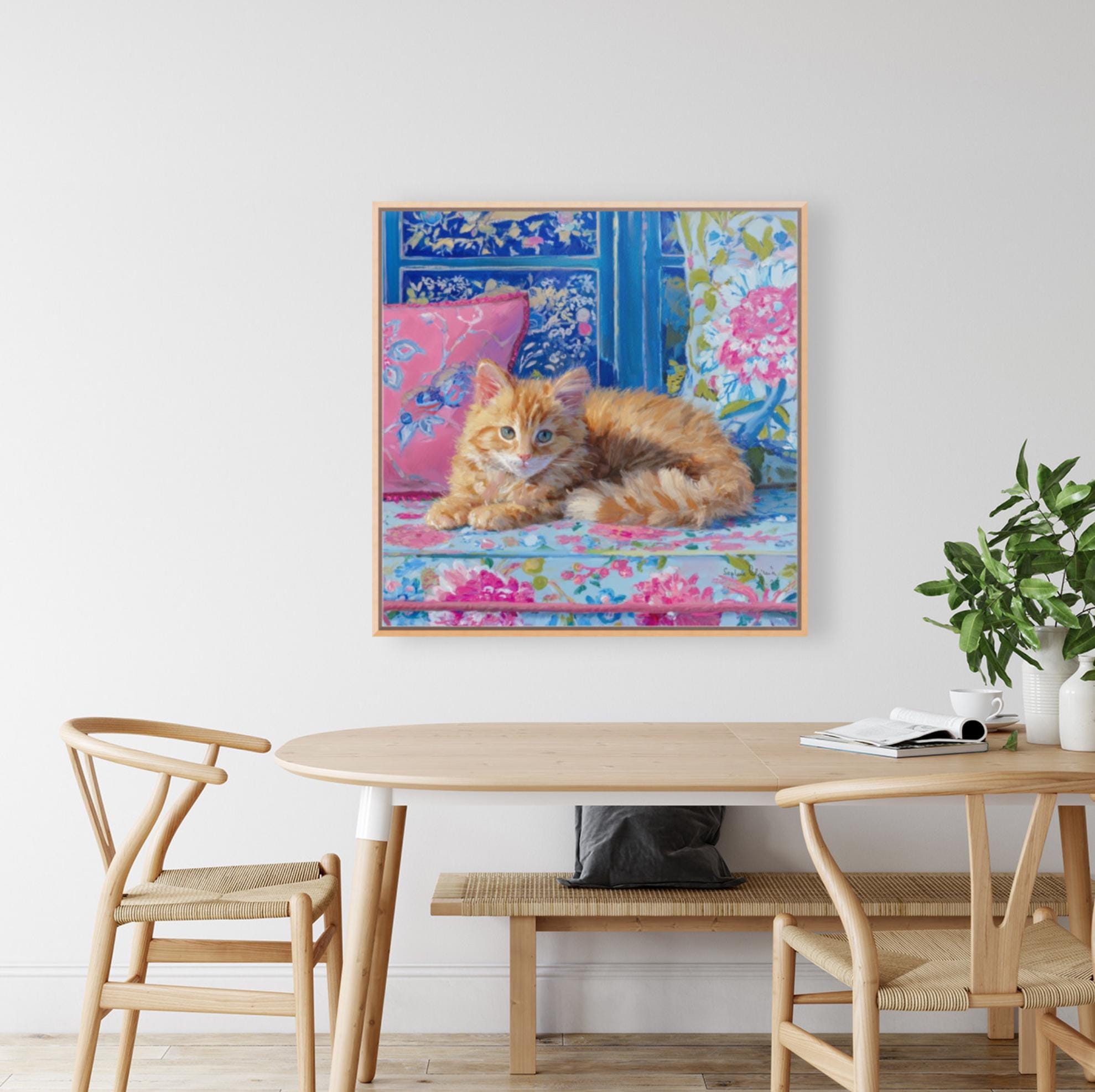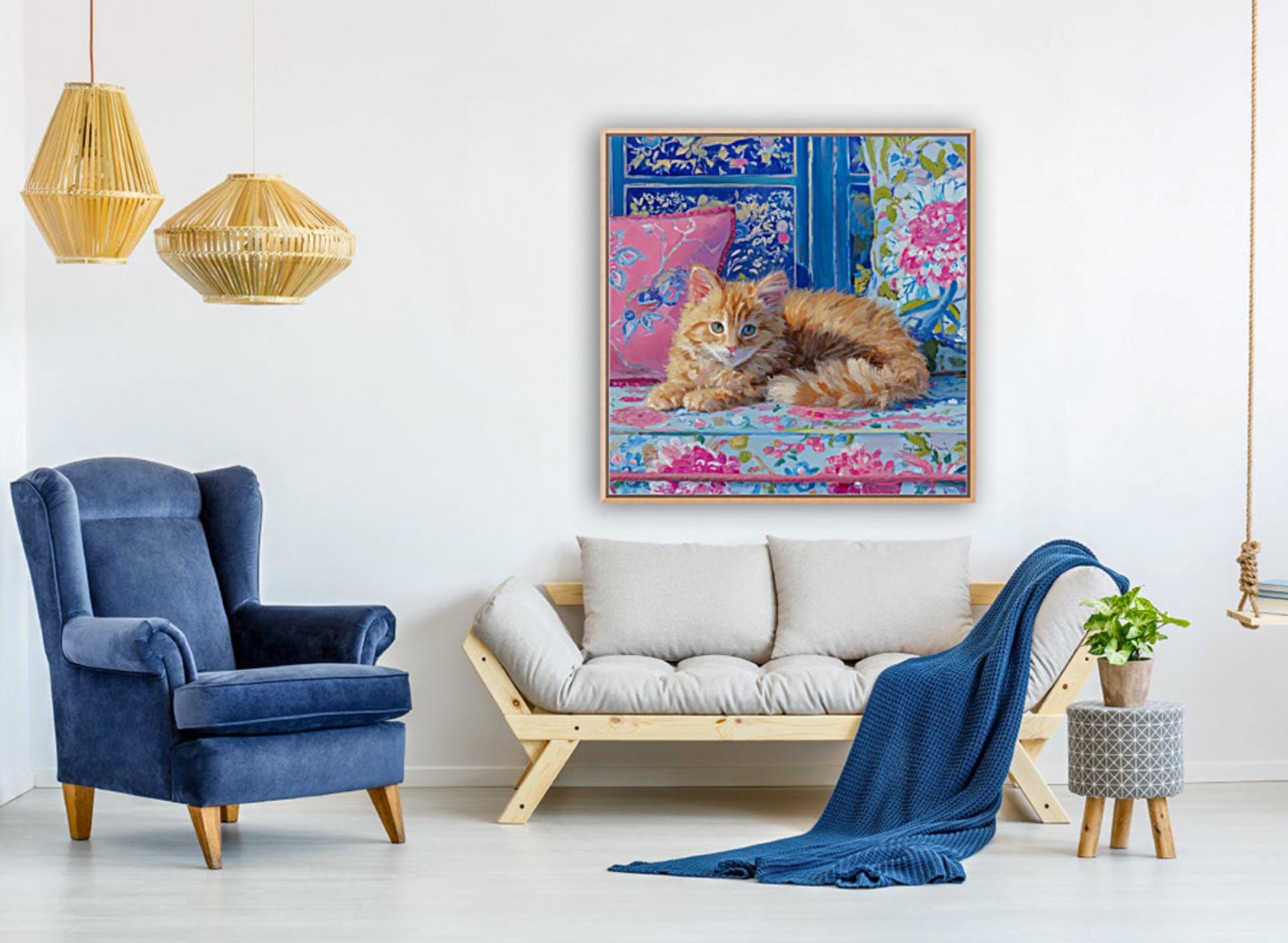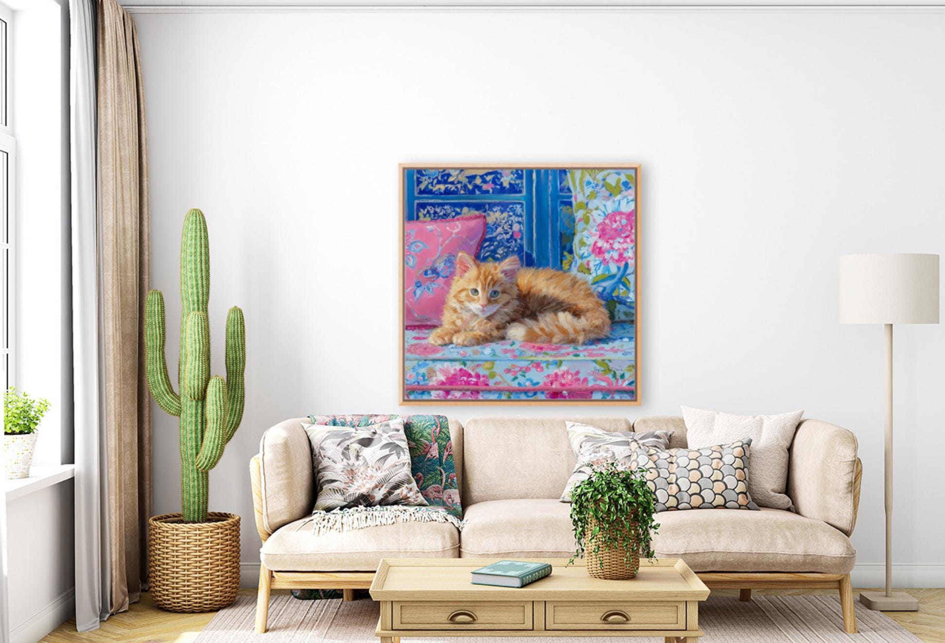 Grandmillennial art, Ginger in blue interior, whimsical cat art