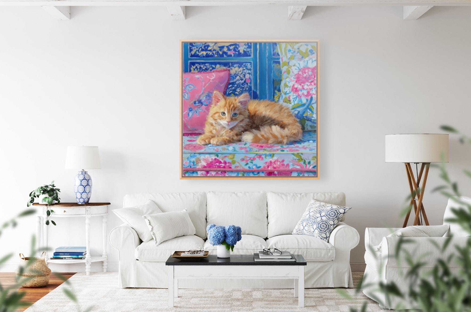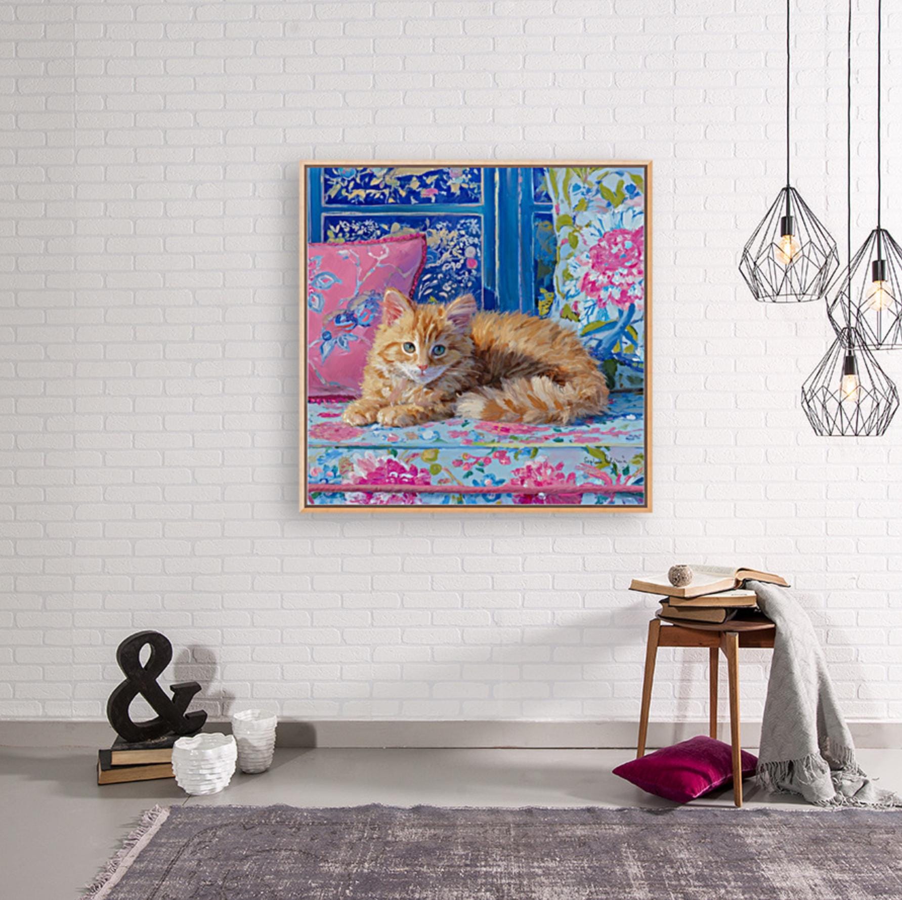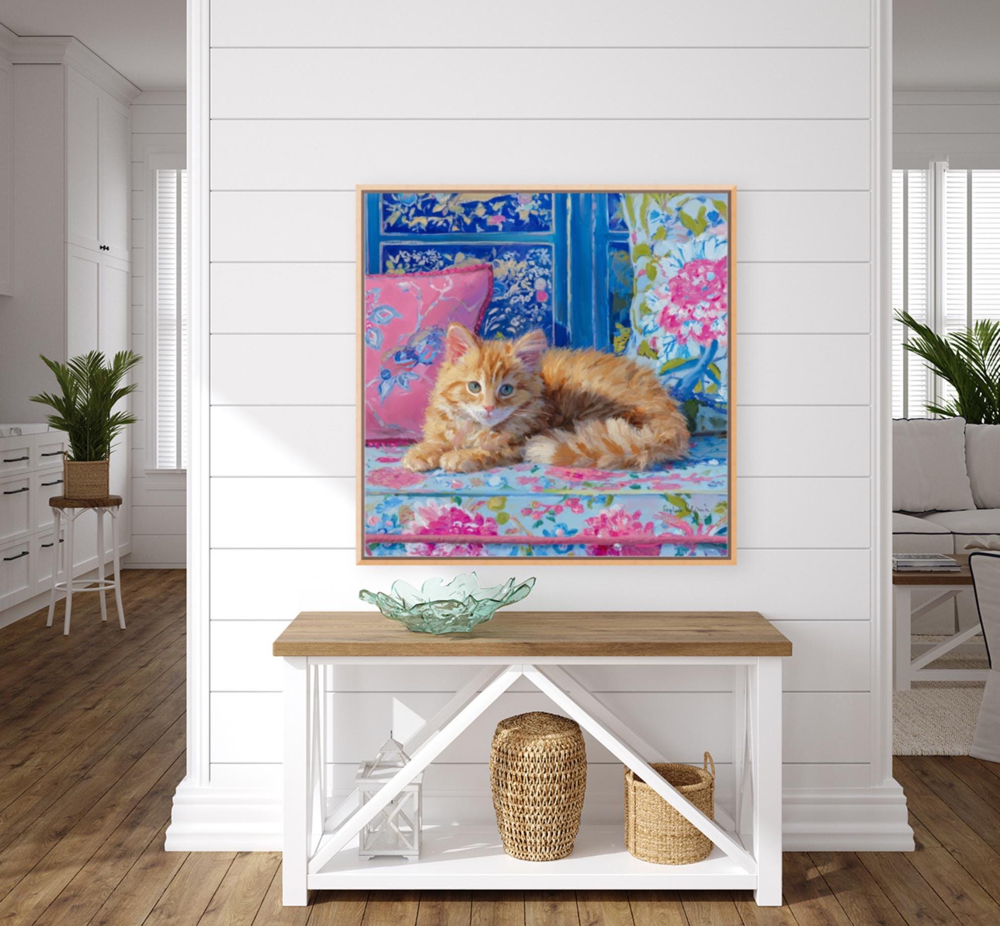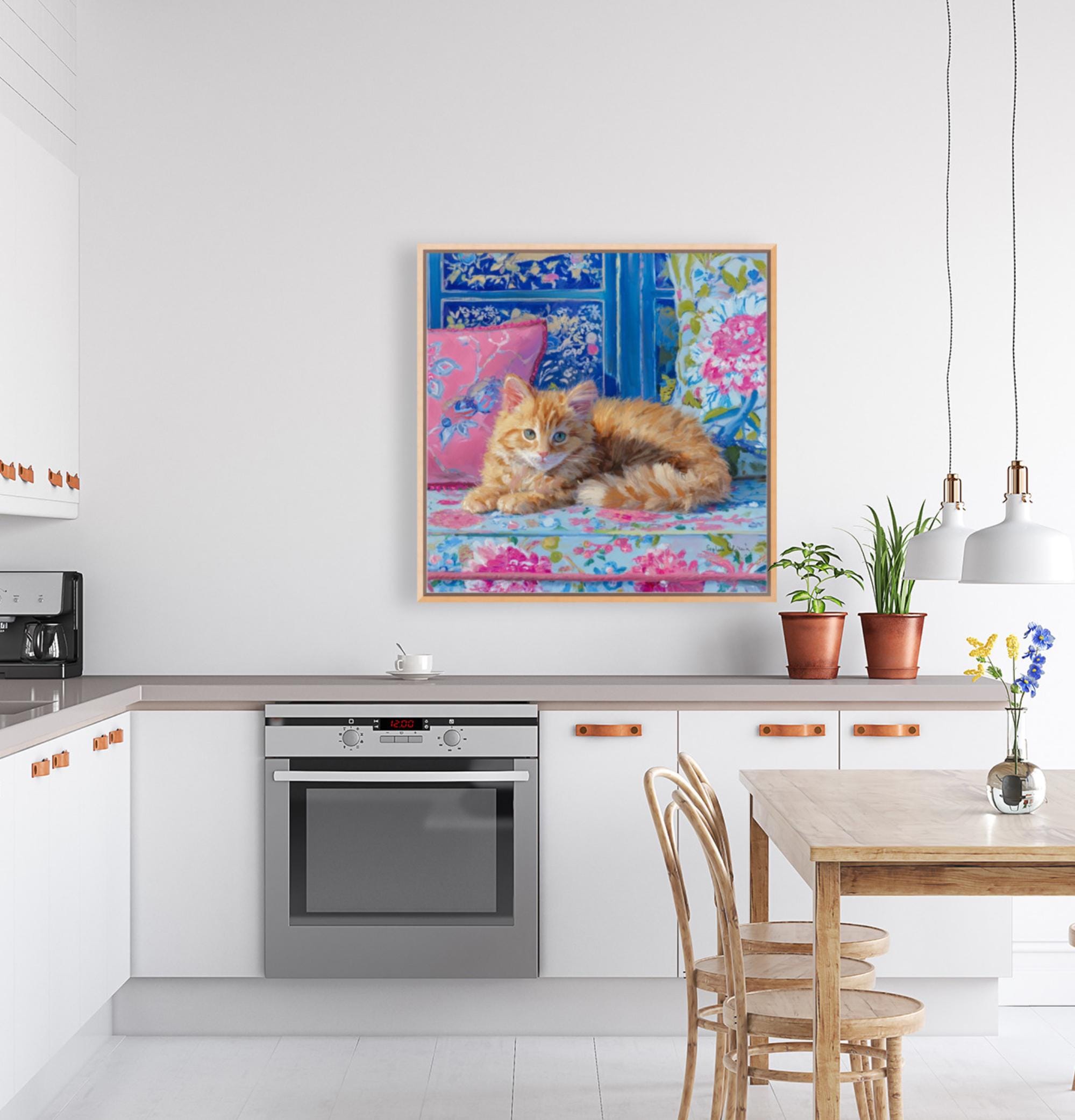 Grandmillennial art, Ginger in blue interior, whimsical cat art
