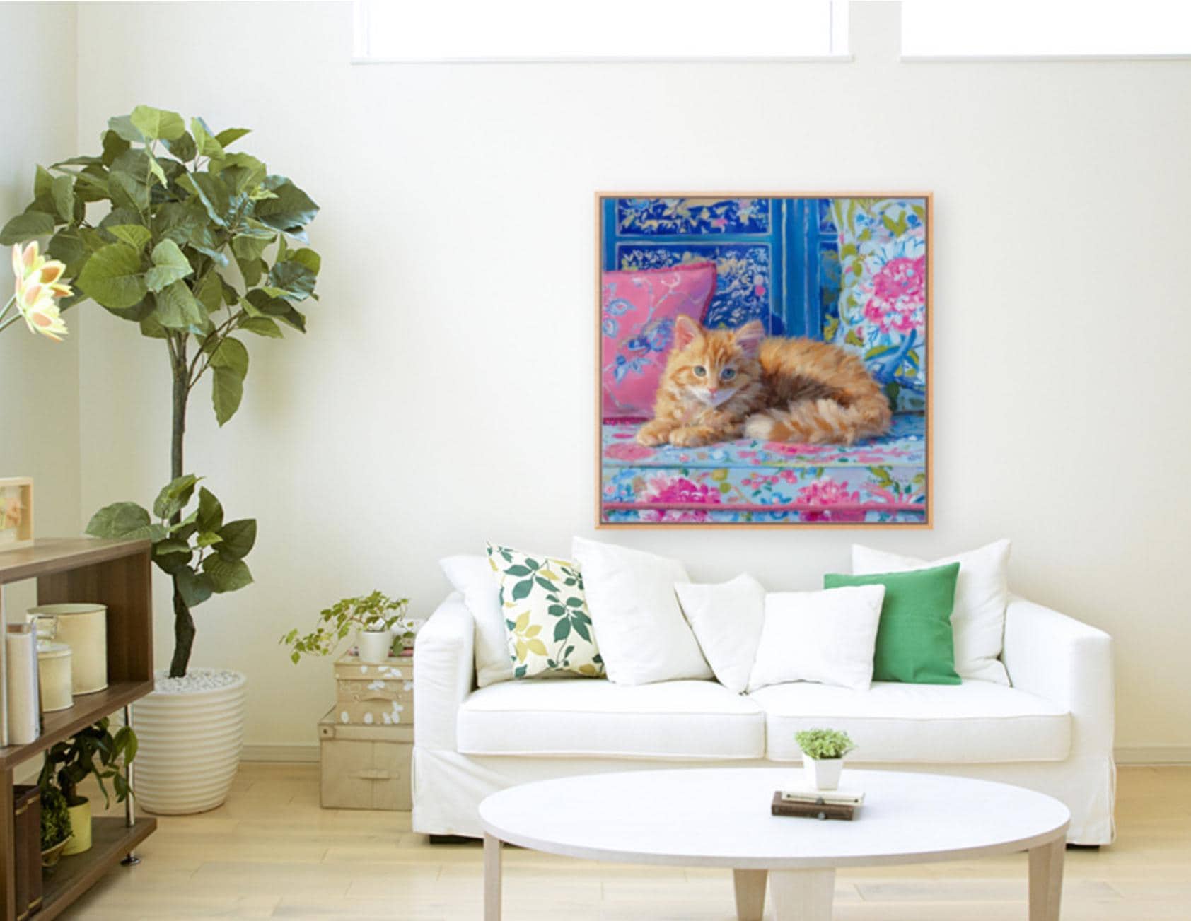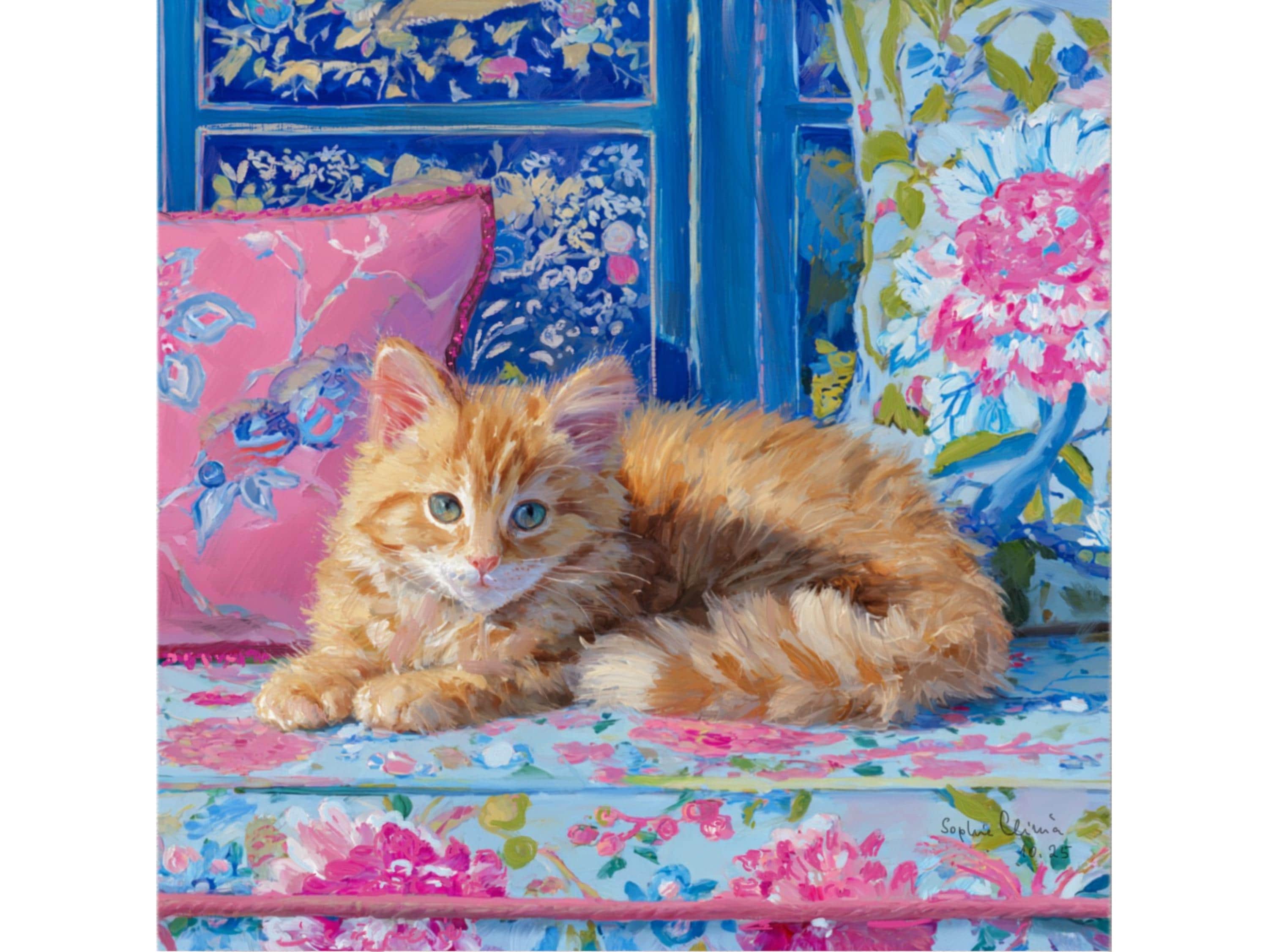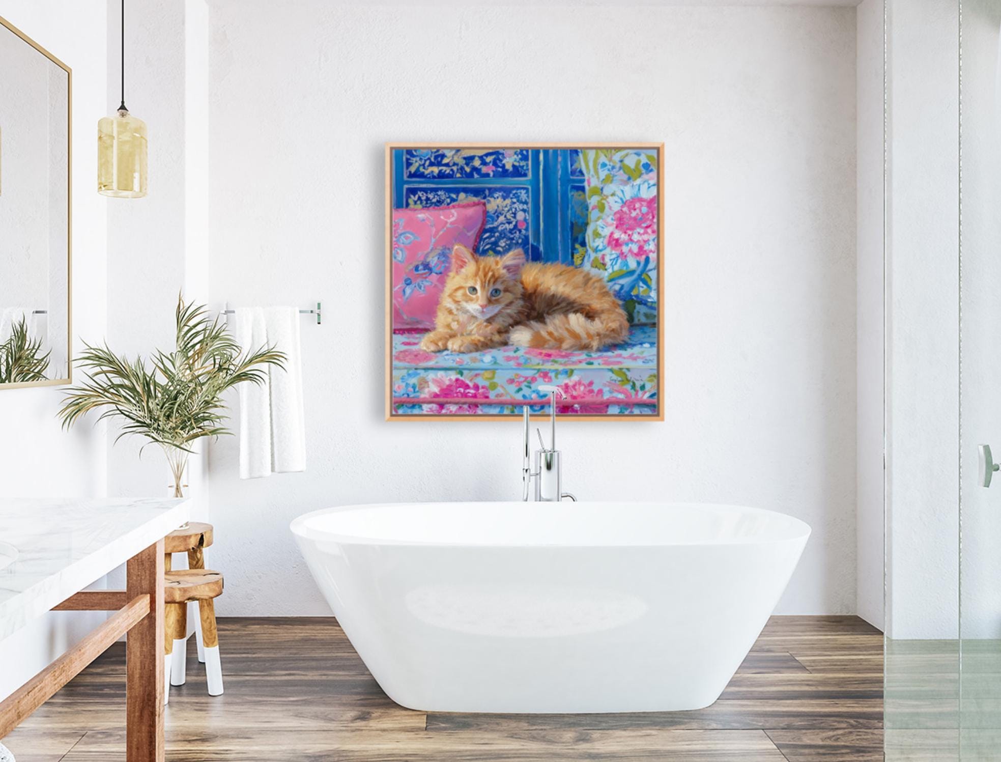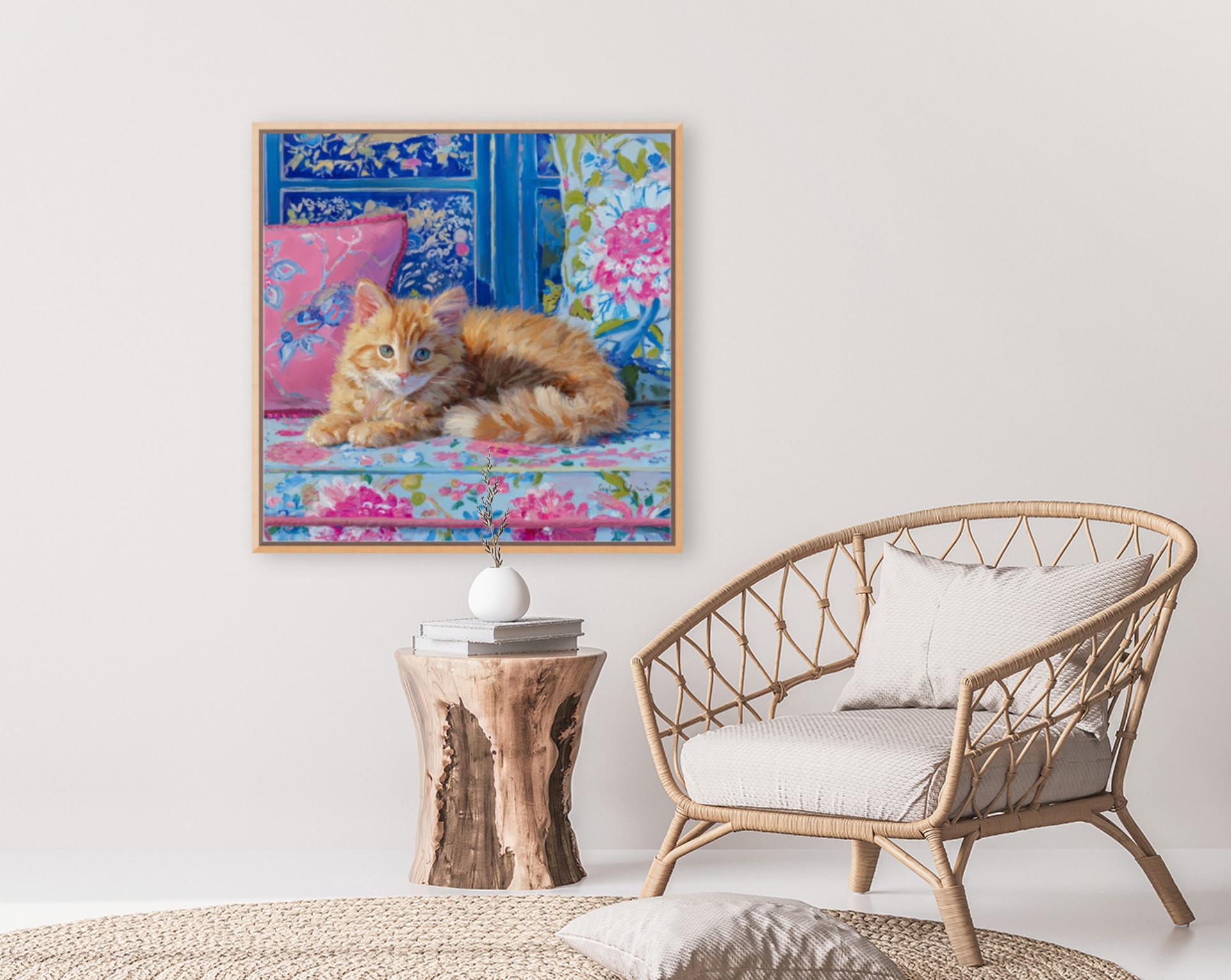 Grandmillennial art, Ginger in blue interior, whimsical cat art