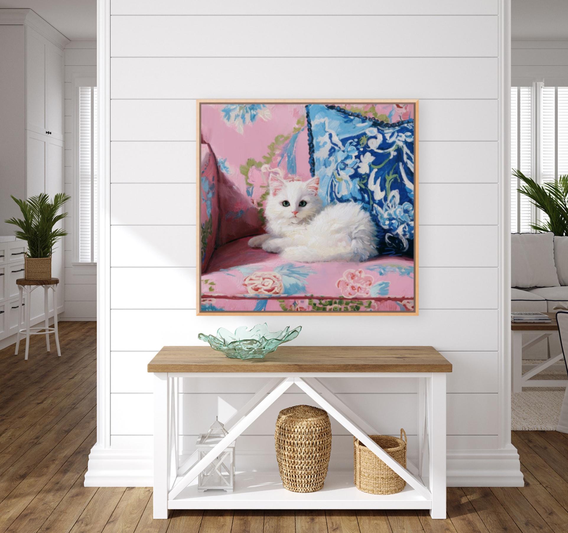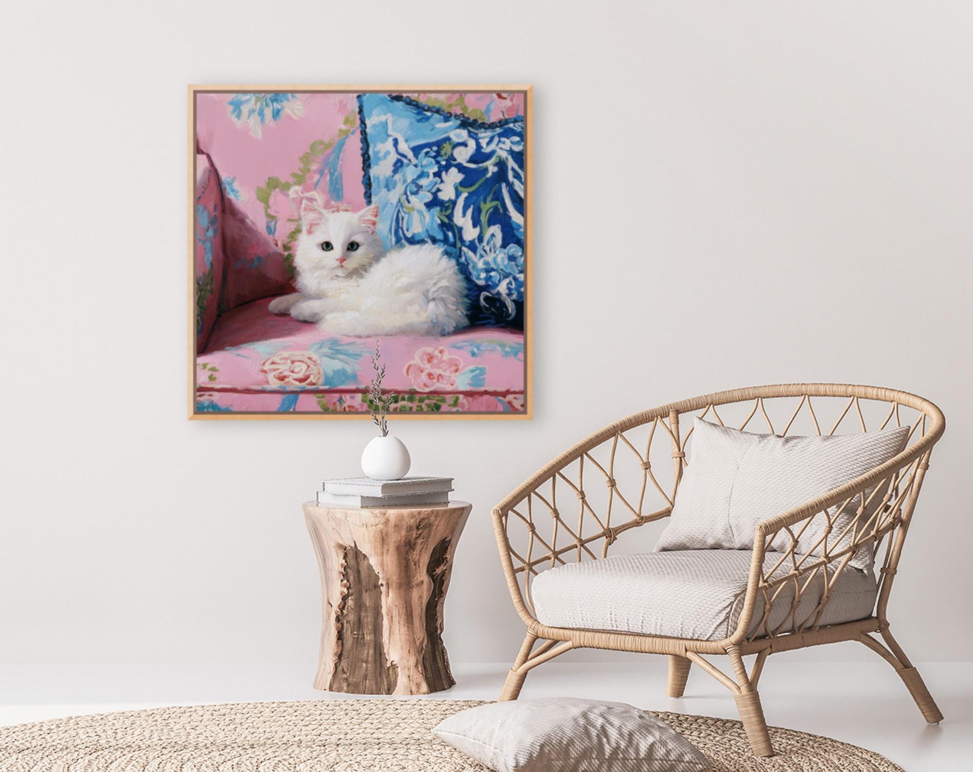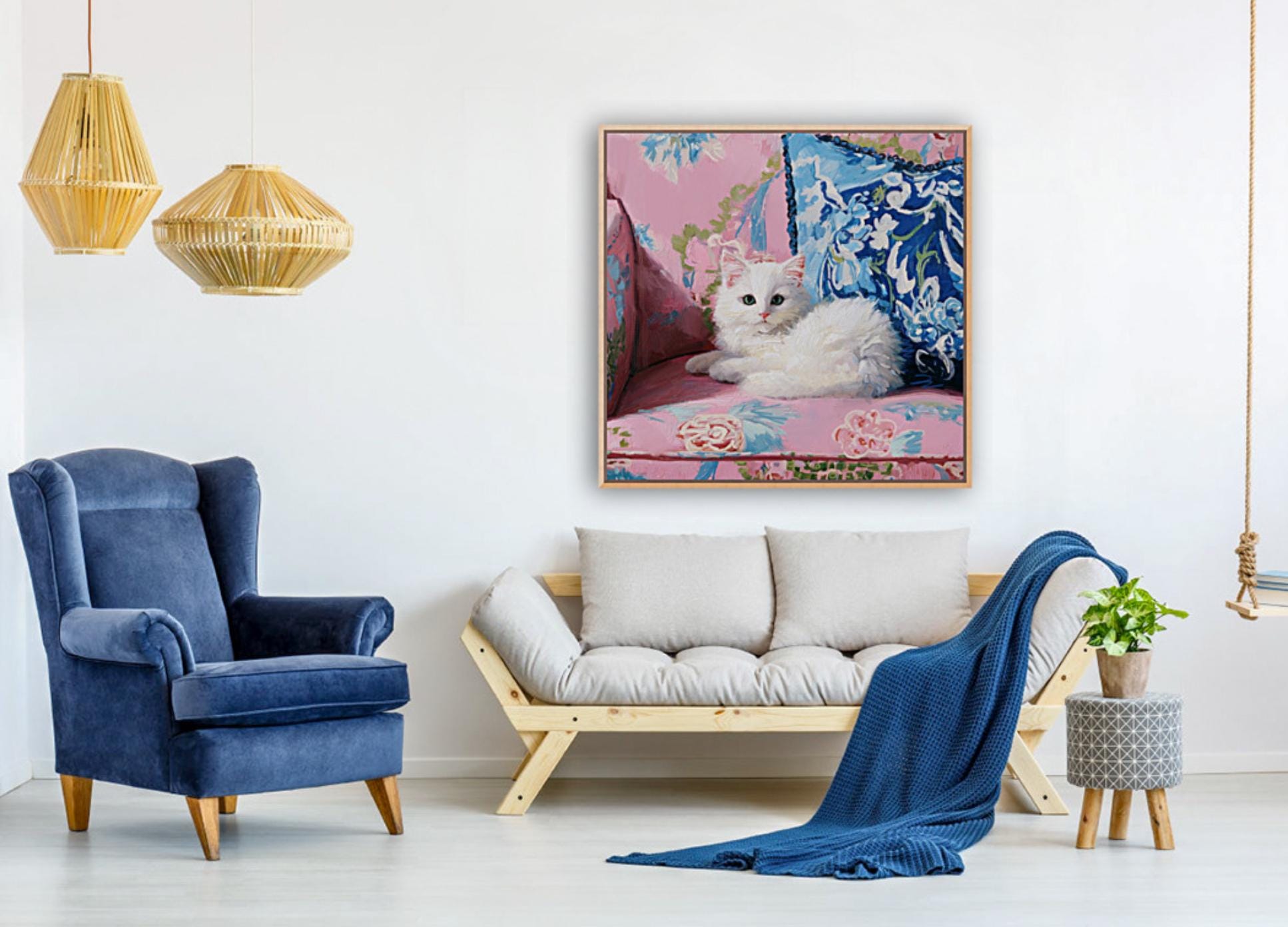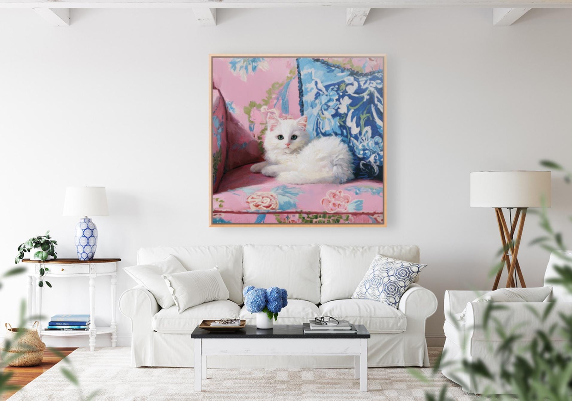 Grandmillennial art, Snowy in pink and blue interior, whimsical cat art
