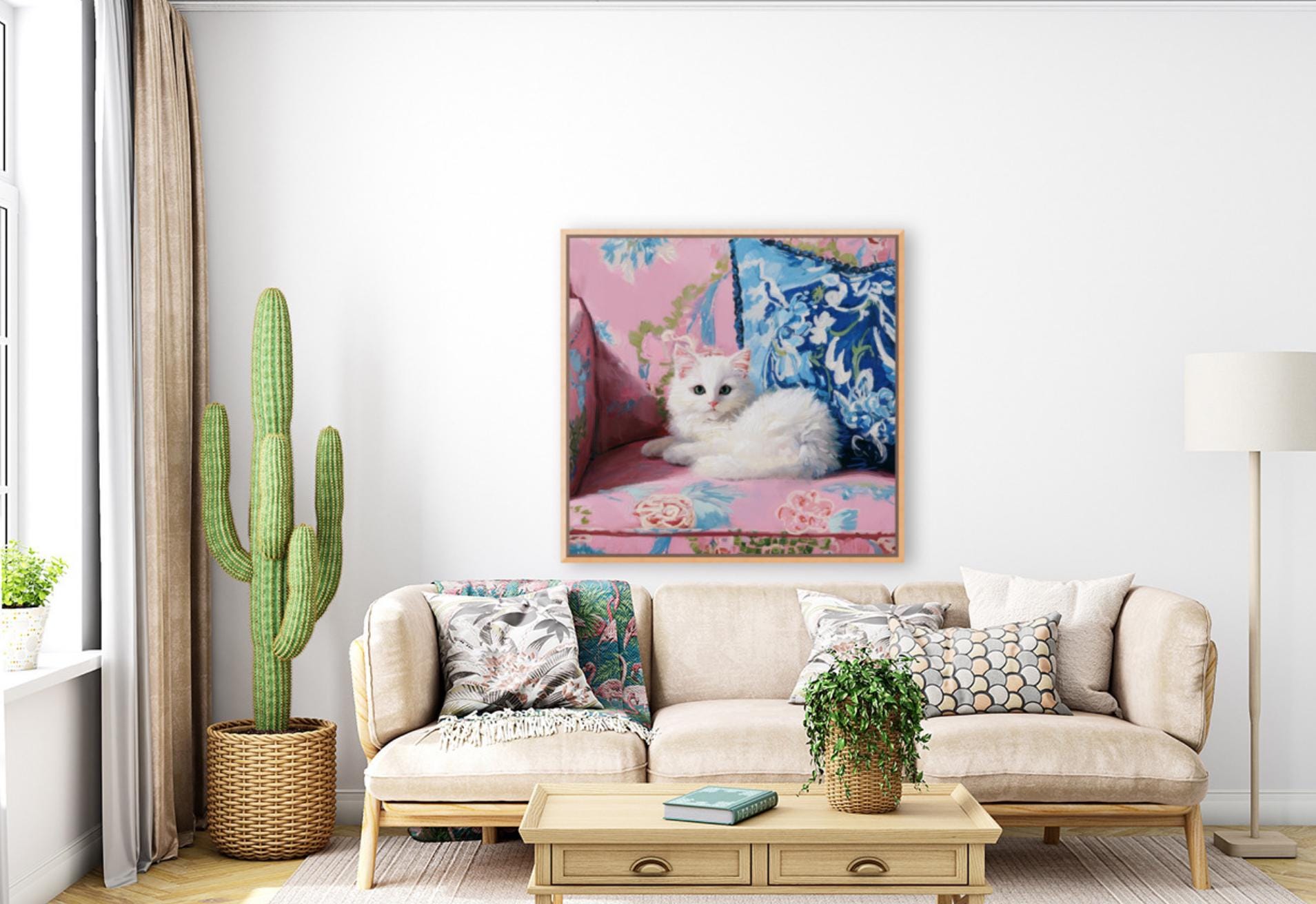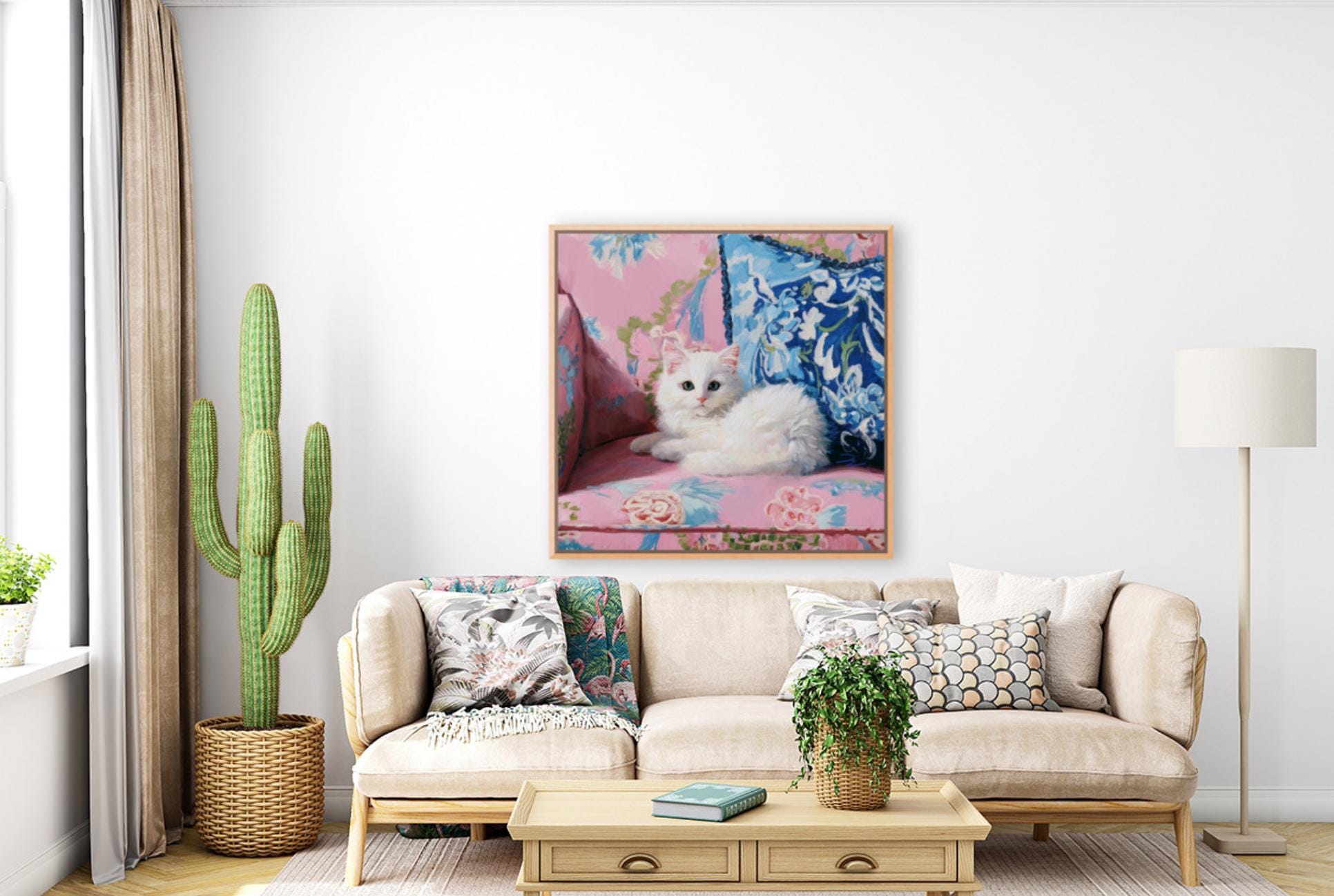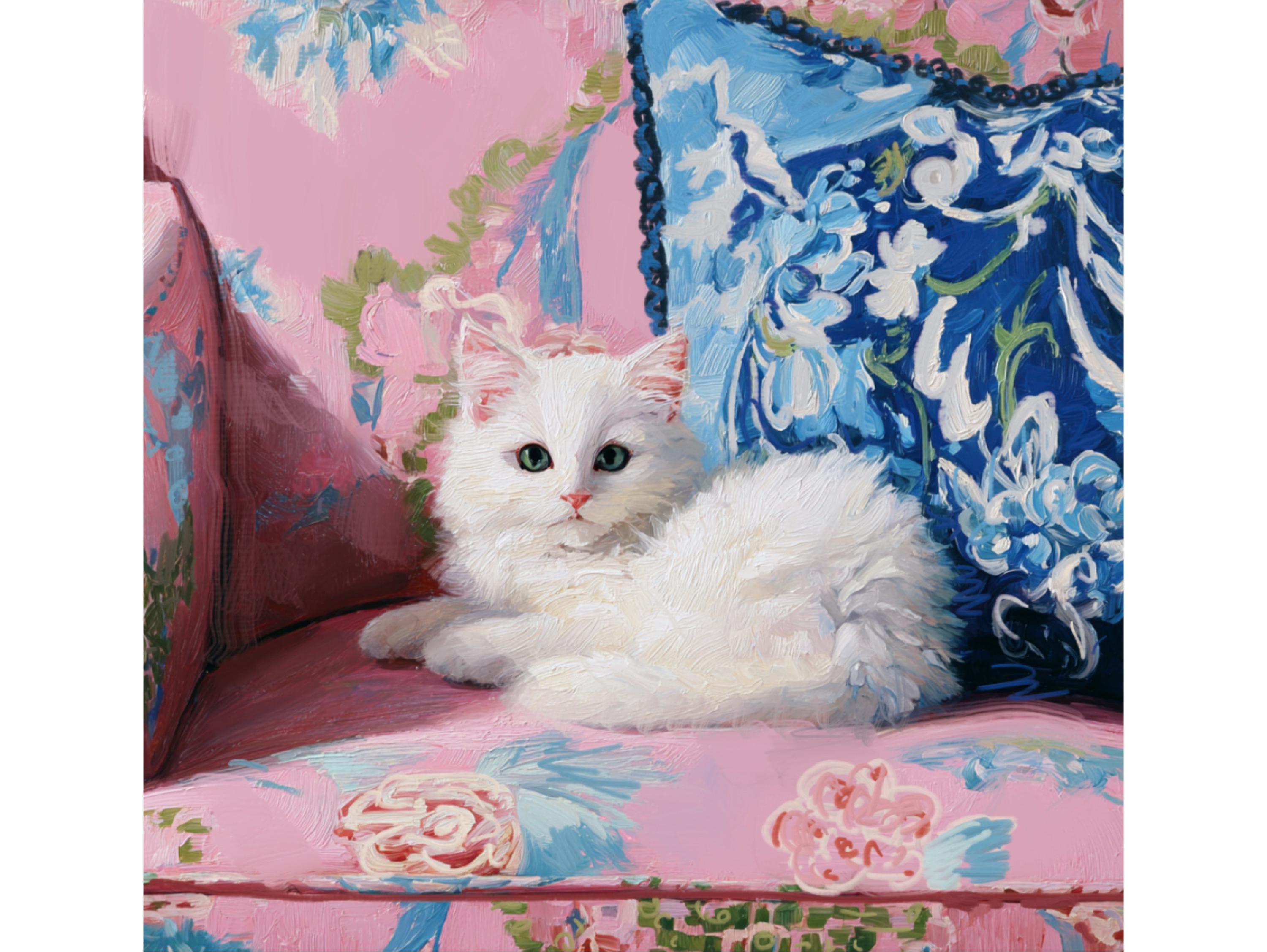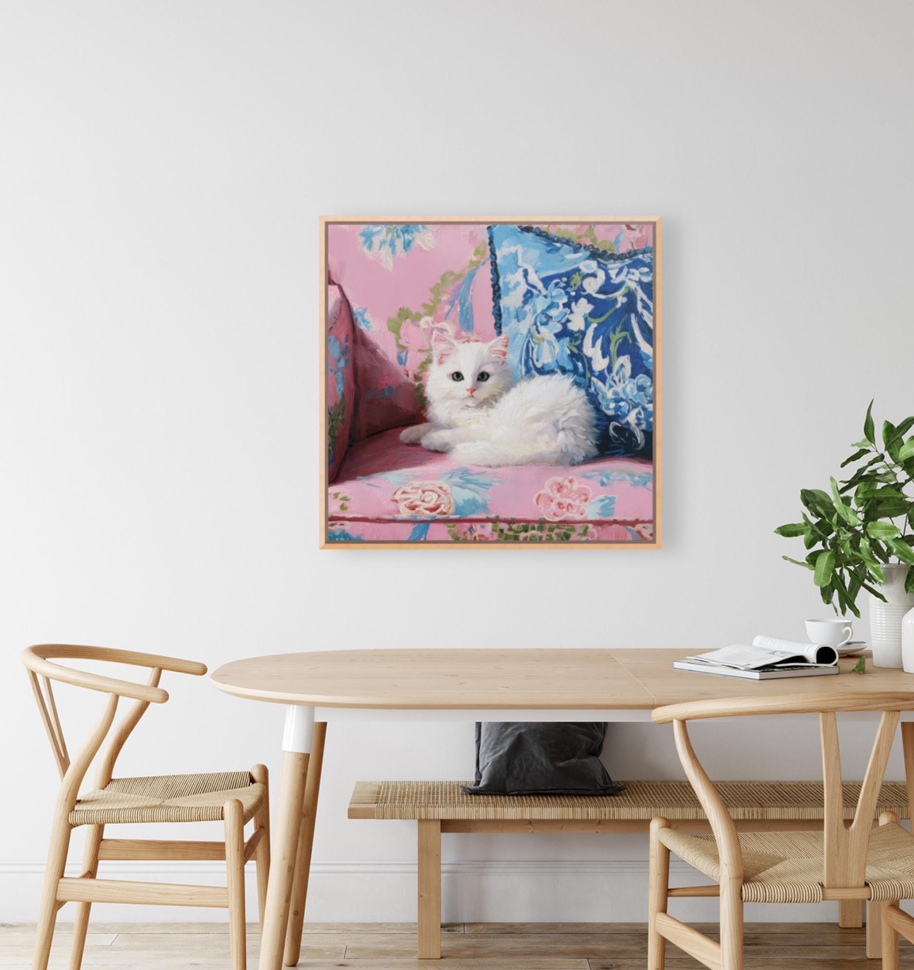 Grandmillennial art, Snowy in pink and blue interior, whimsical cat art