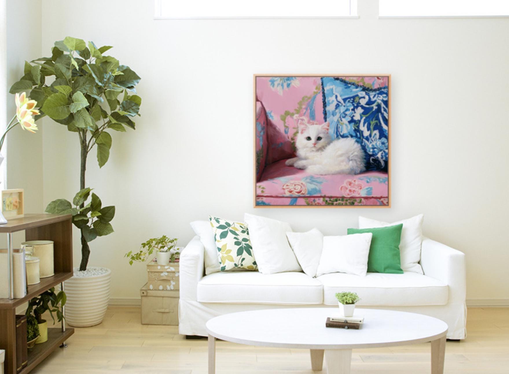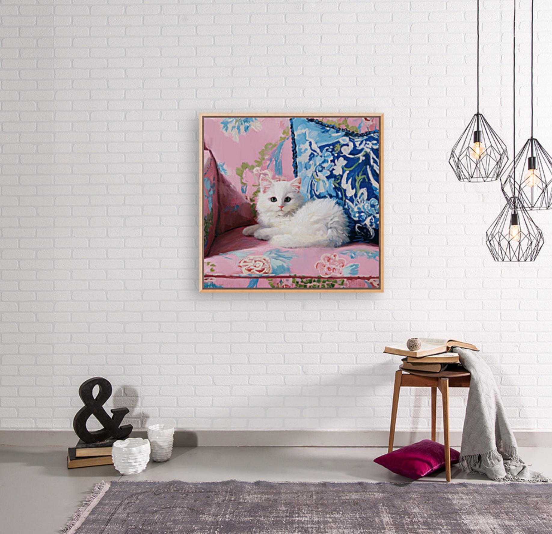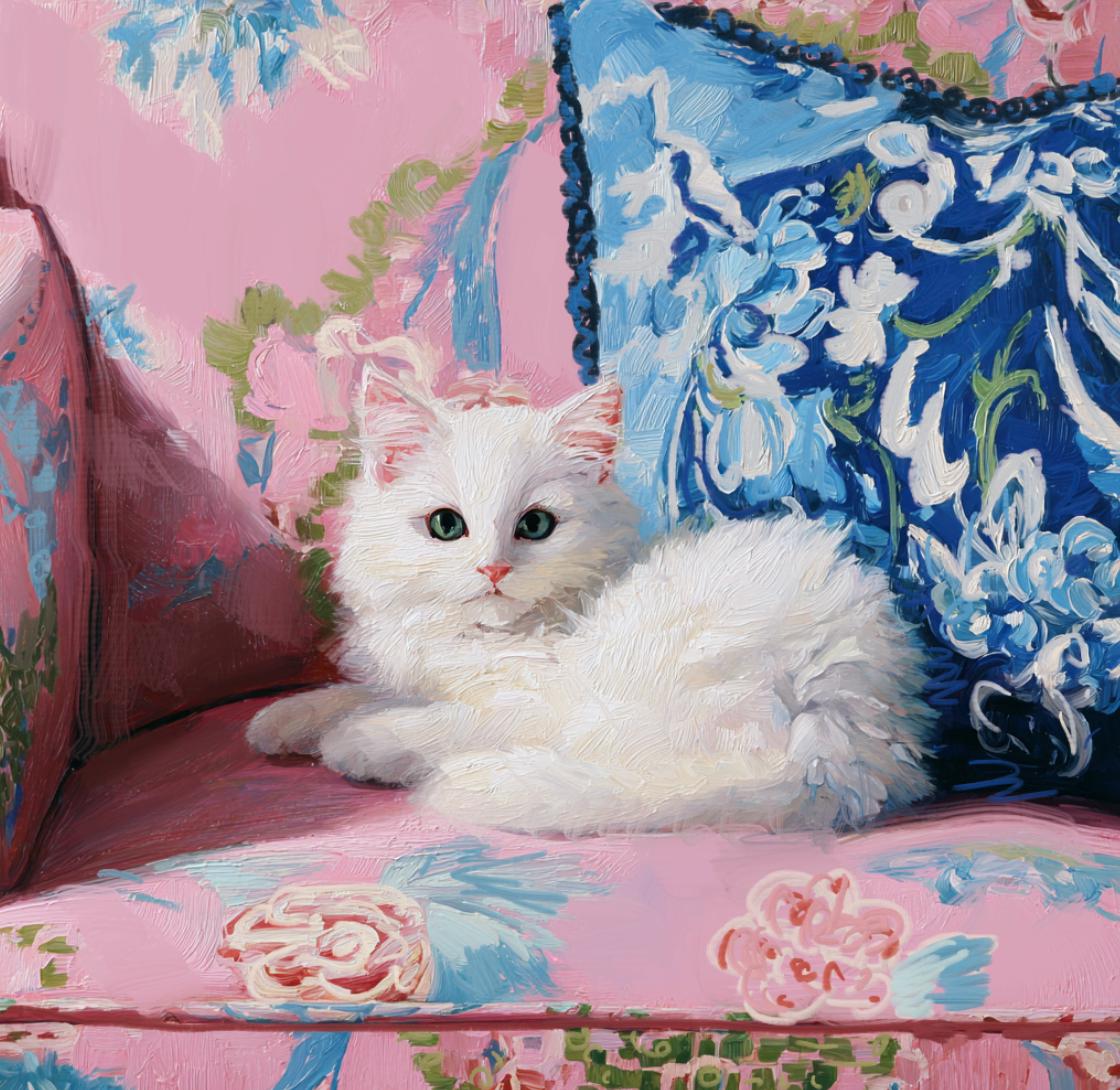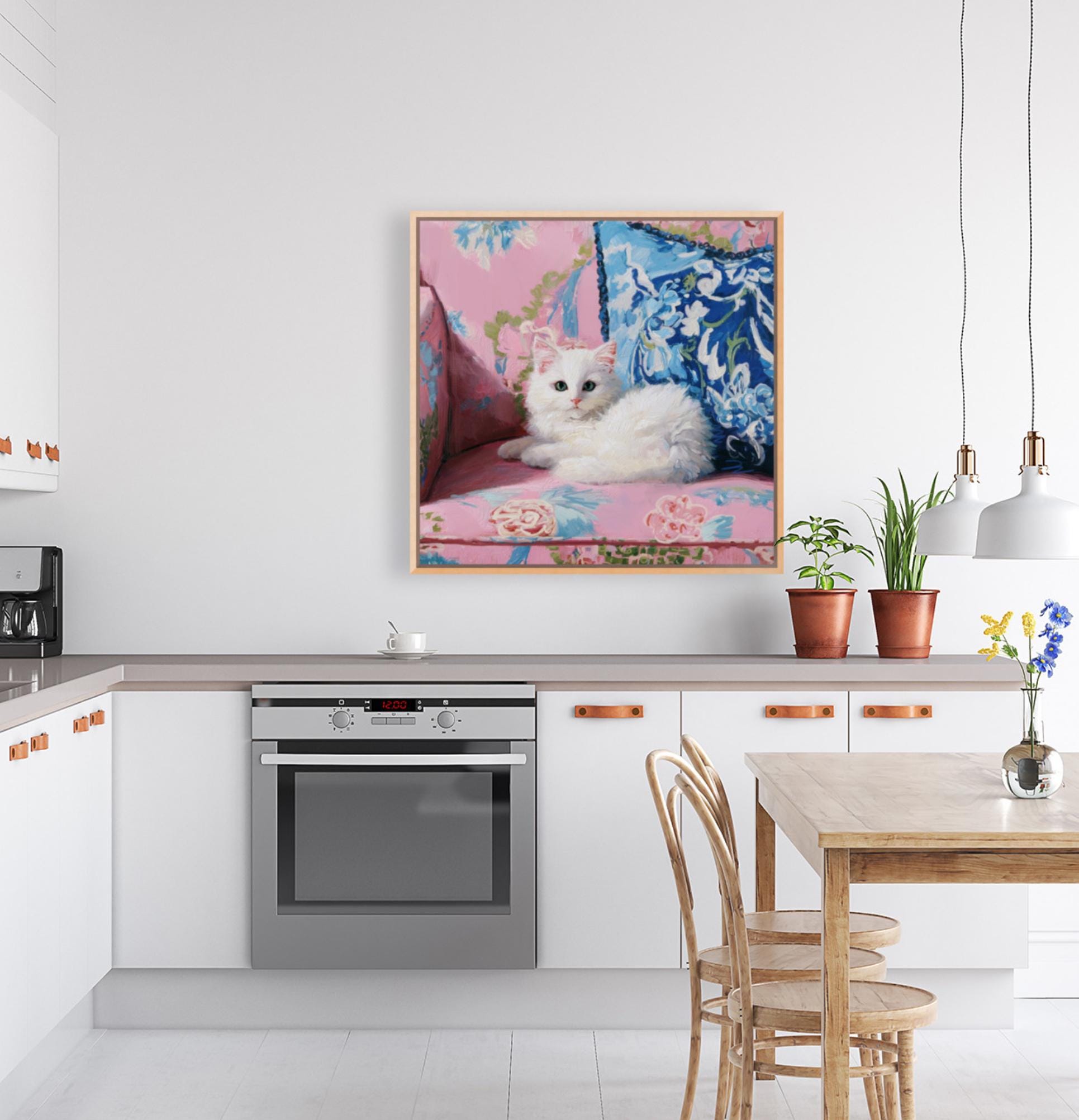 Grandmillennial art, Snowy in pink and blue interior, whimsical cat art