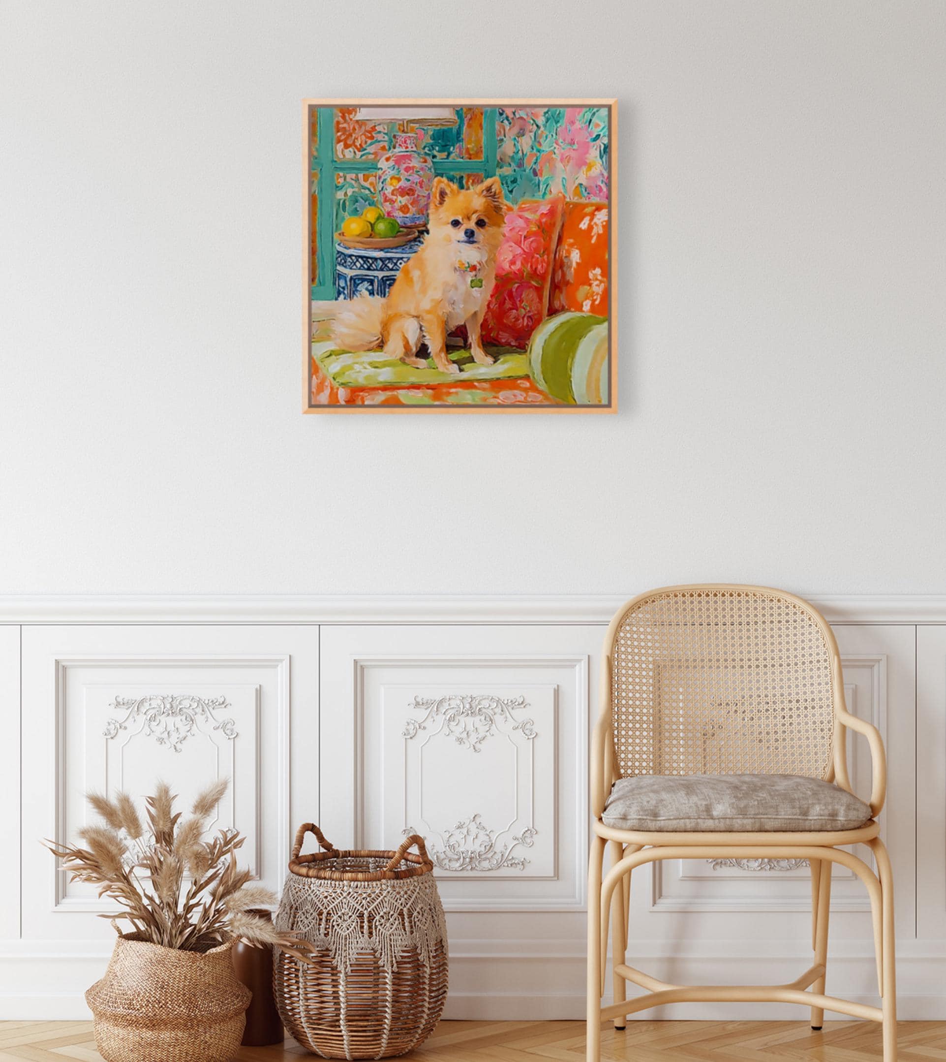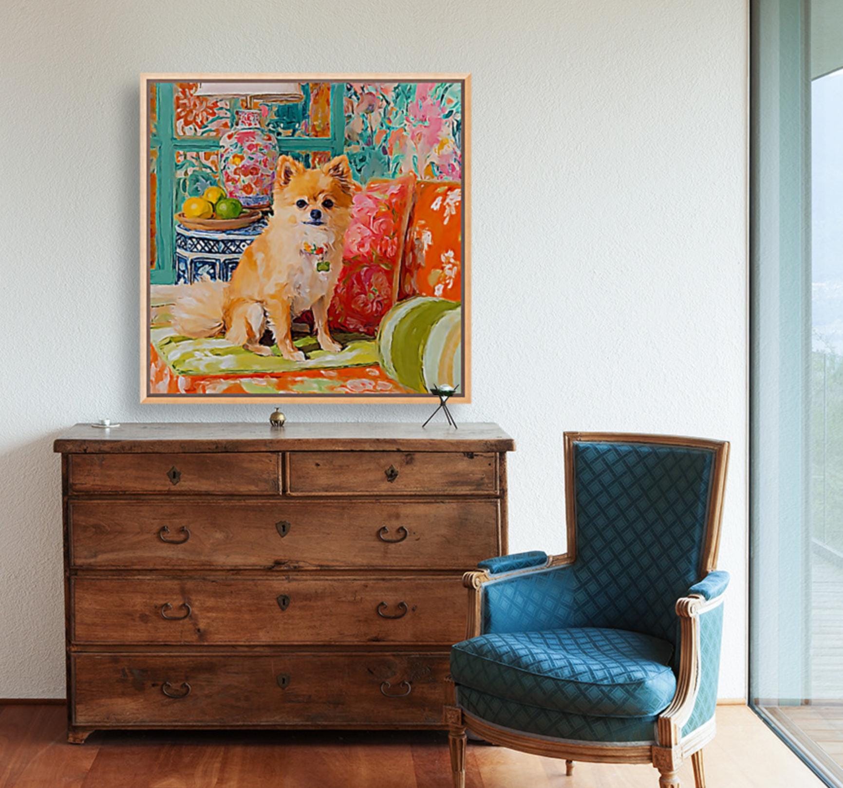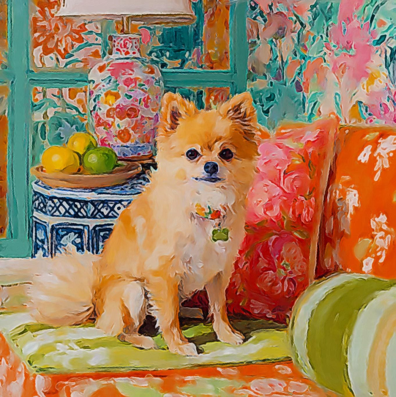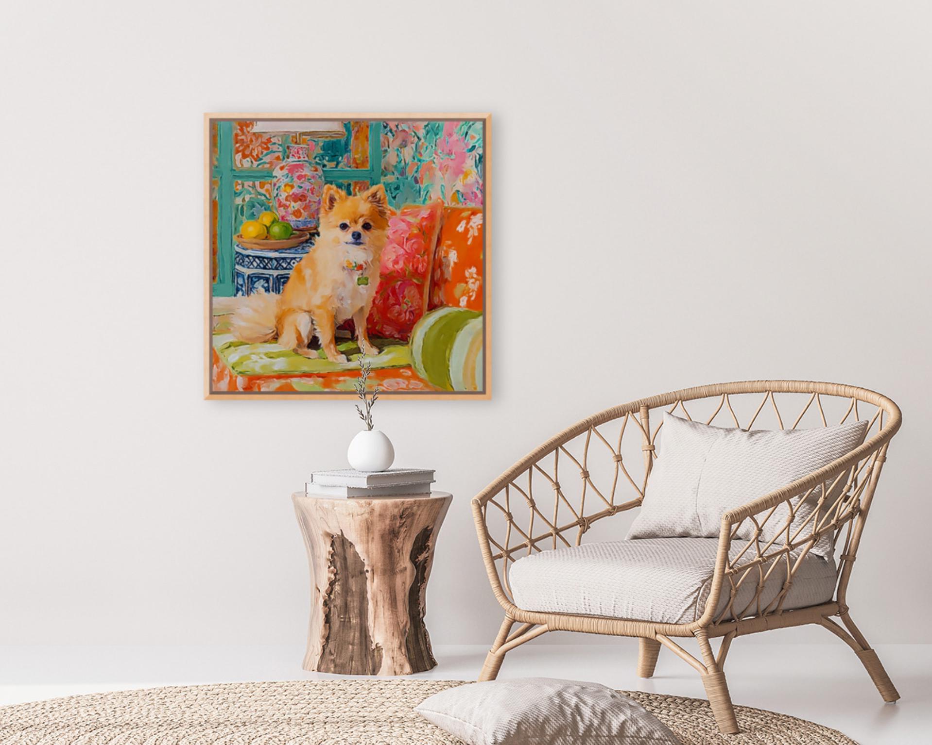 Grandmillennial art, Pomeranian dog in orange room, whimsical dogs art