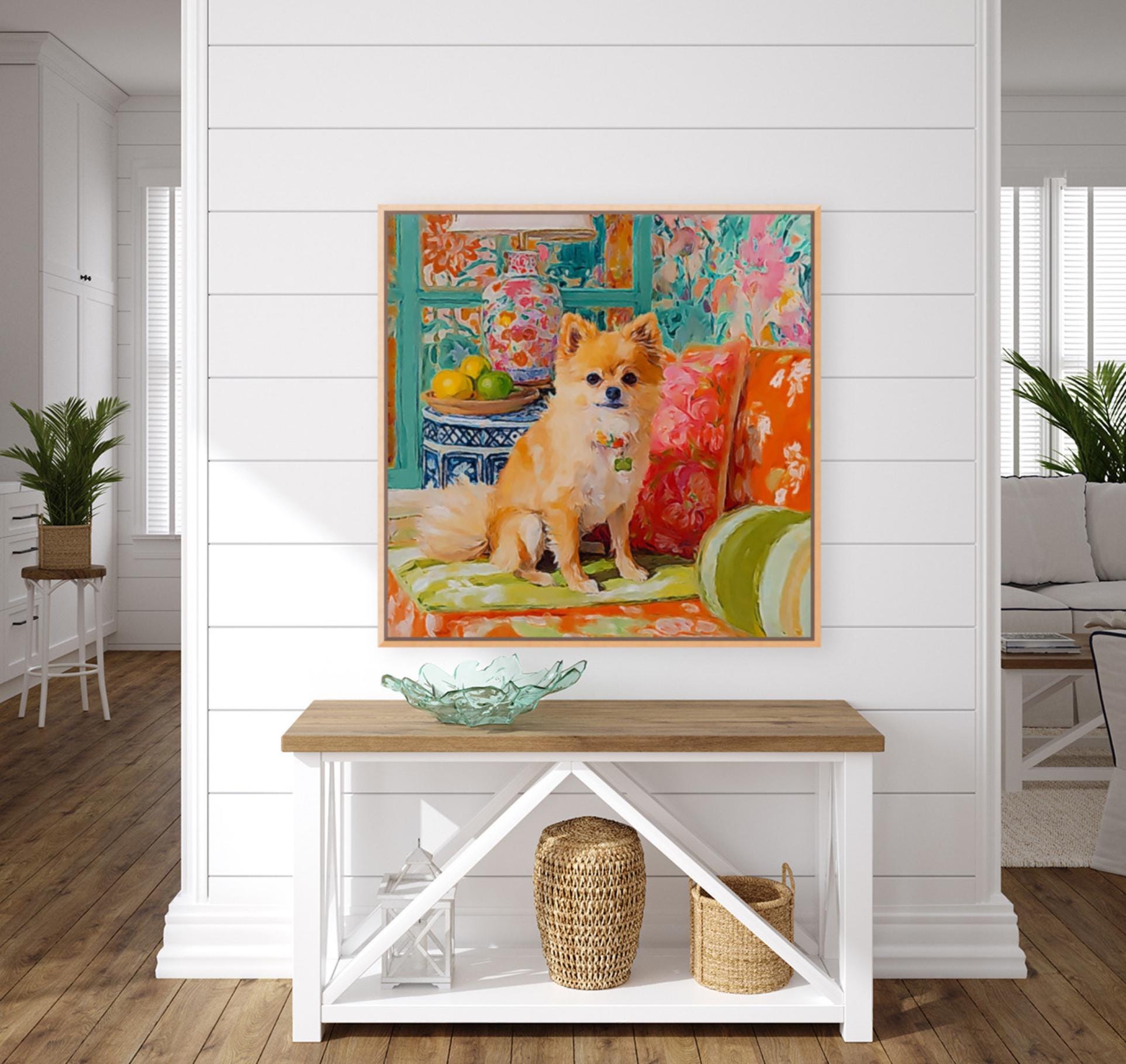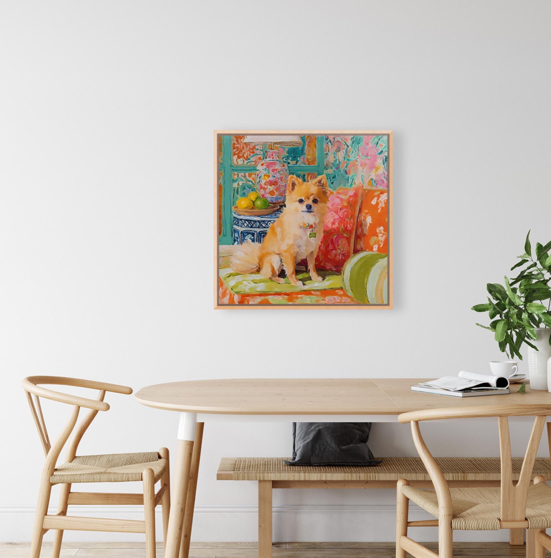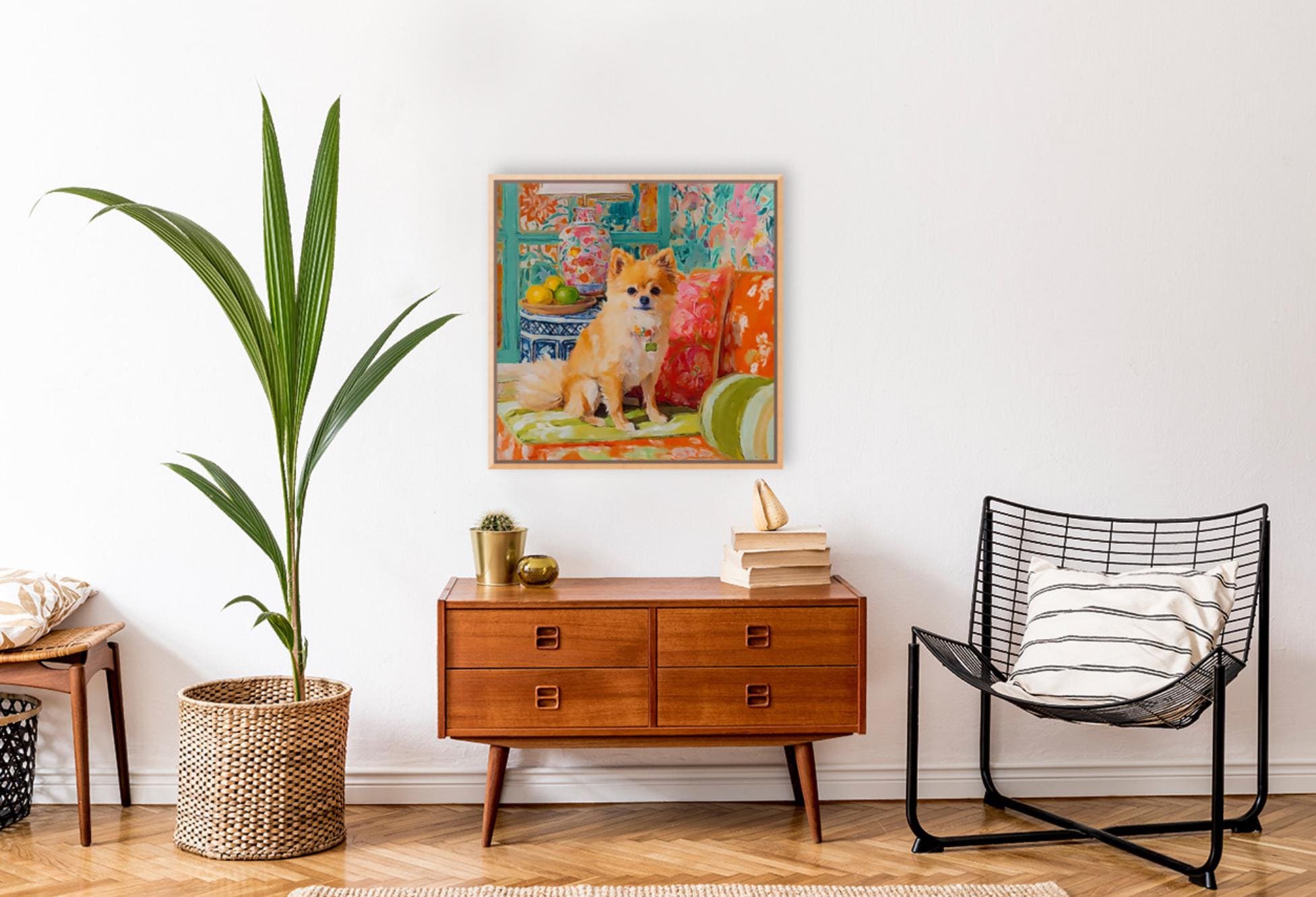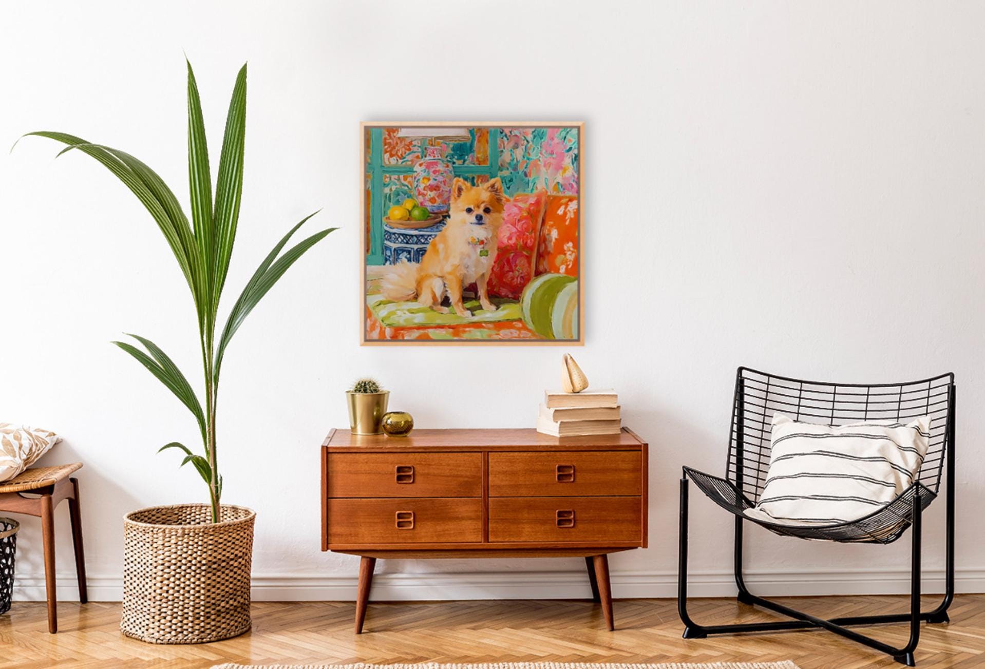 Grandmillennial art, Pomeranian dog in orange room, whimsical dogs art