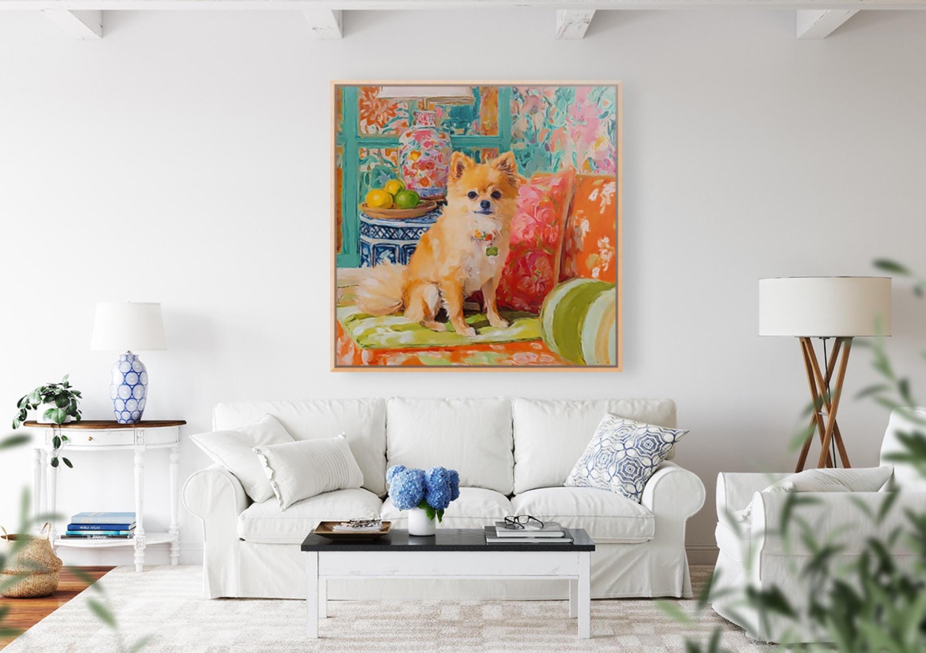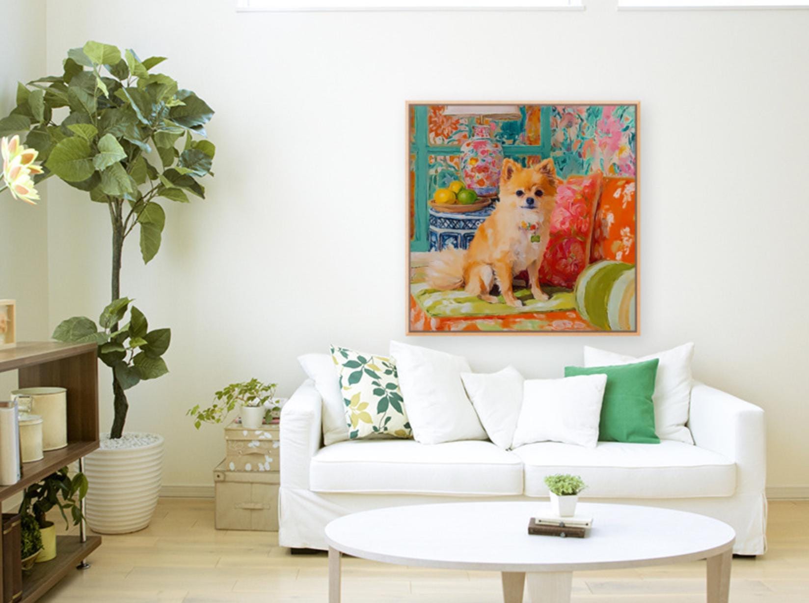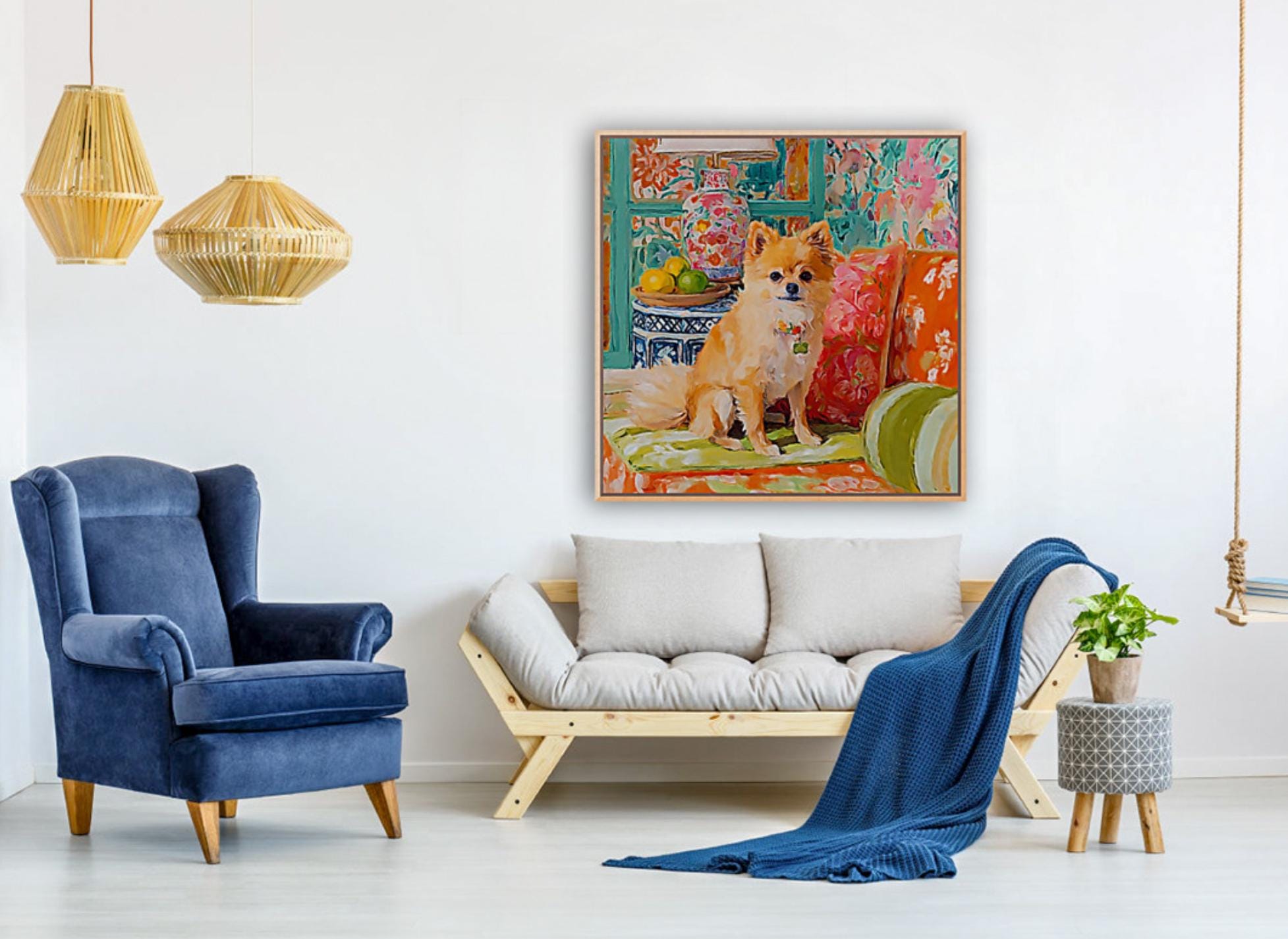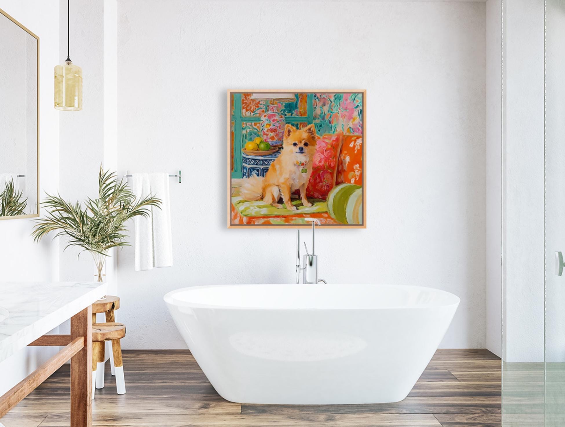 Grandmillennial art, Pomeranian dog in orange room, whimsical dogs art
