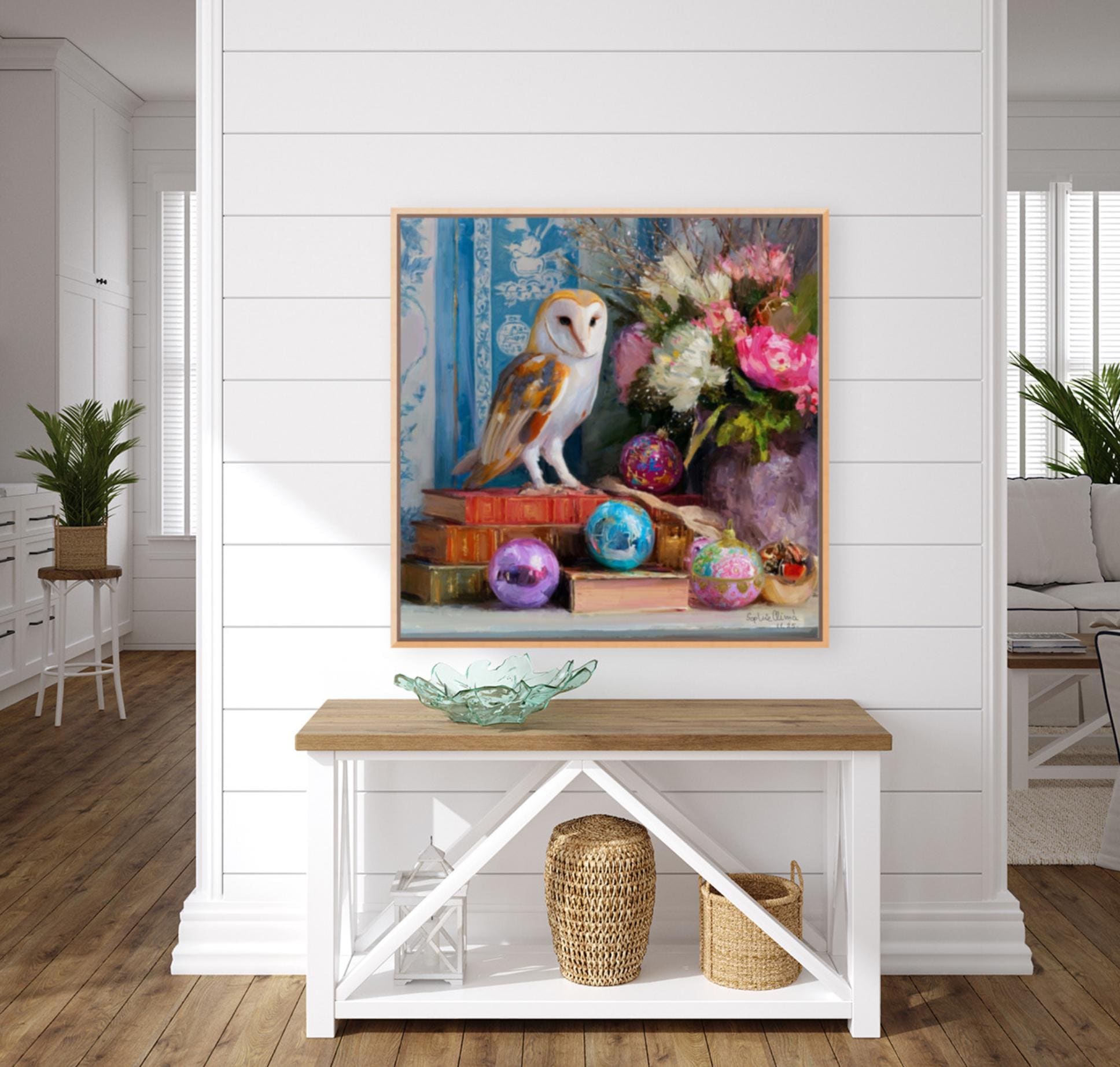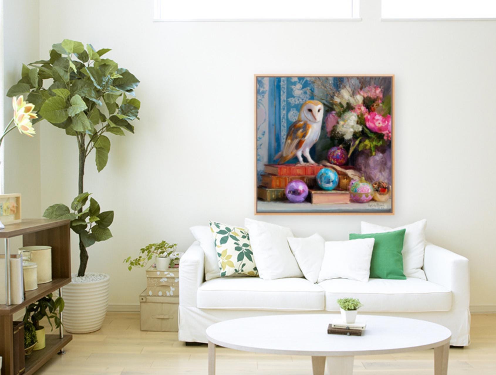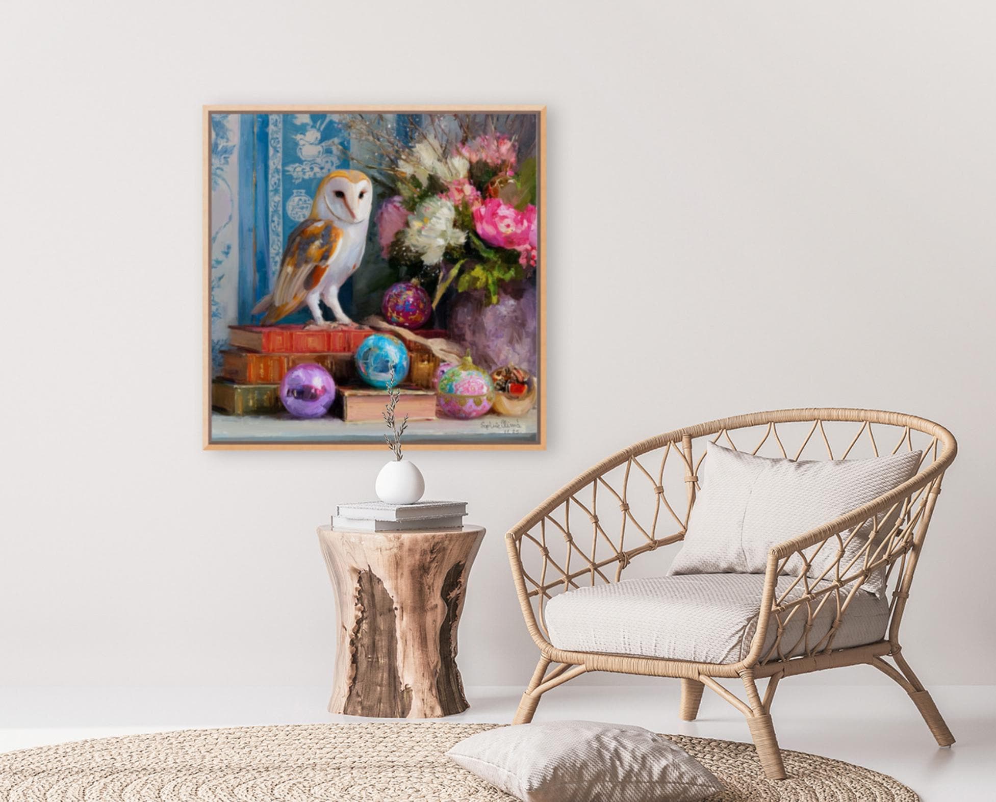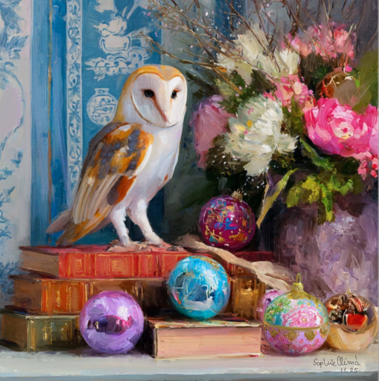 Grandmillennial art, Barn Owl and Christmas baubles, Cozy Christmas art