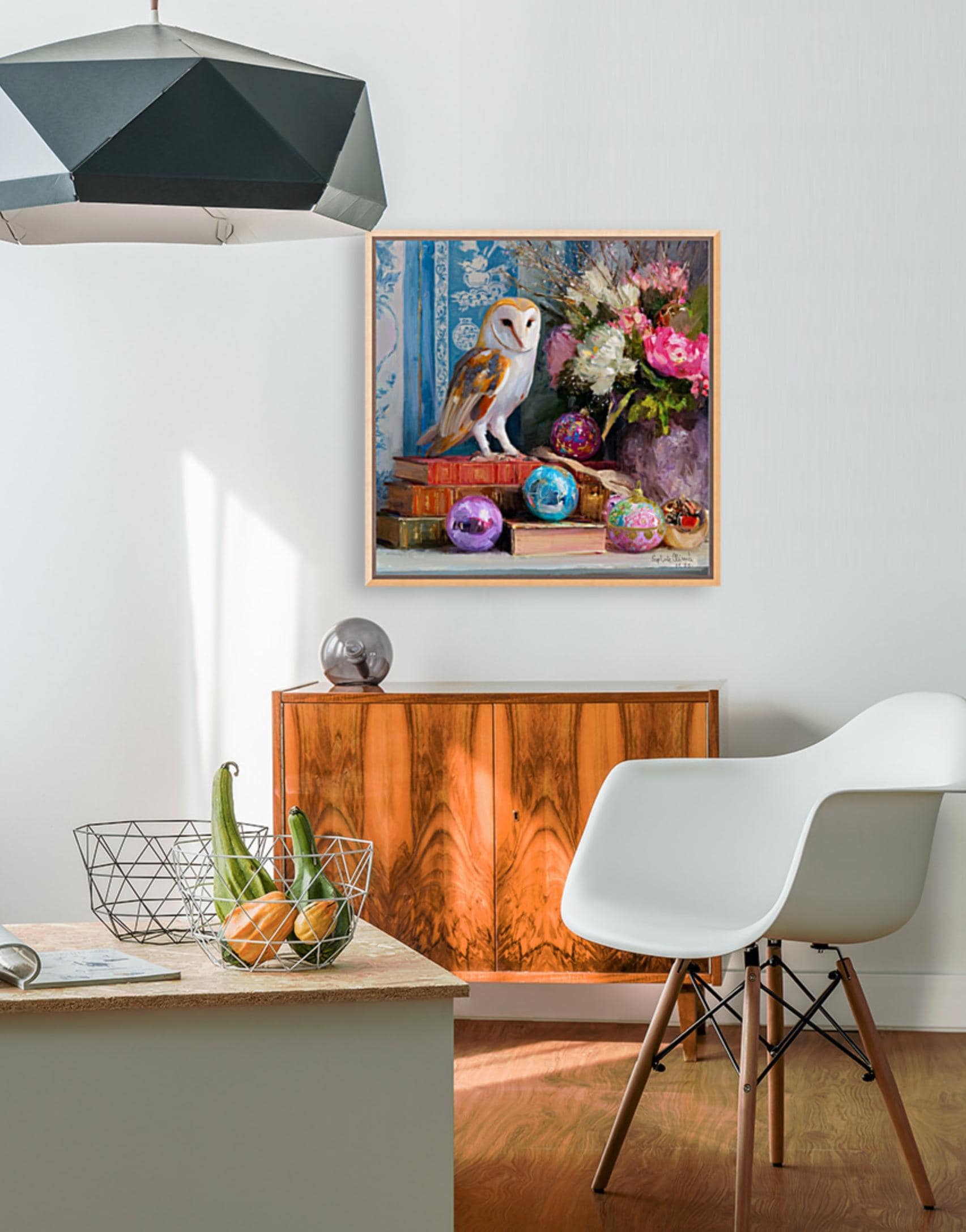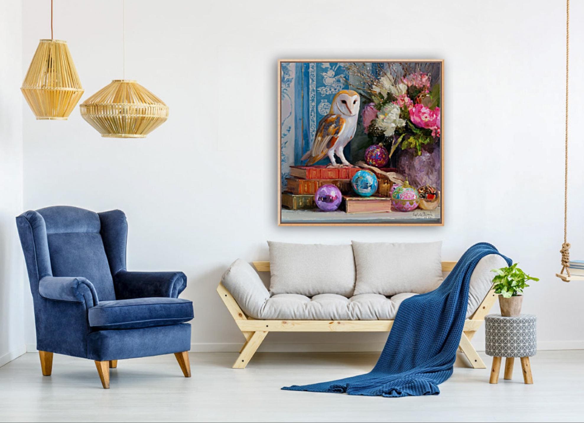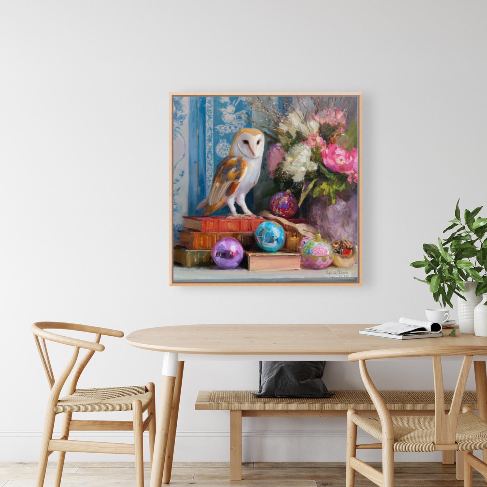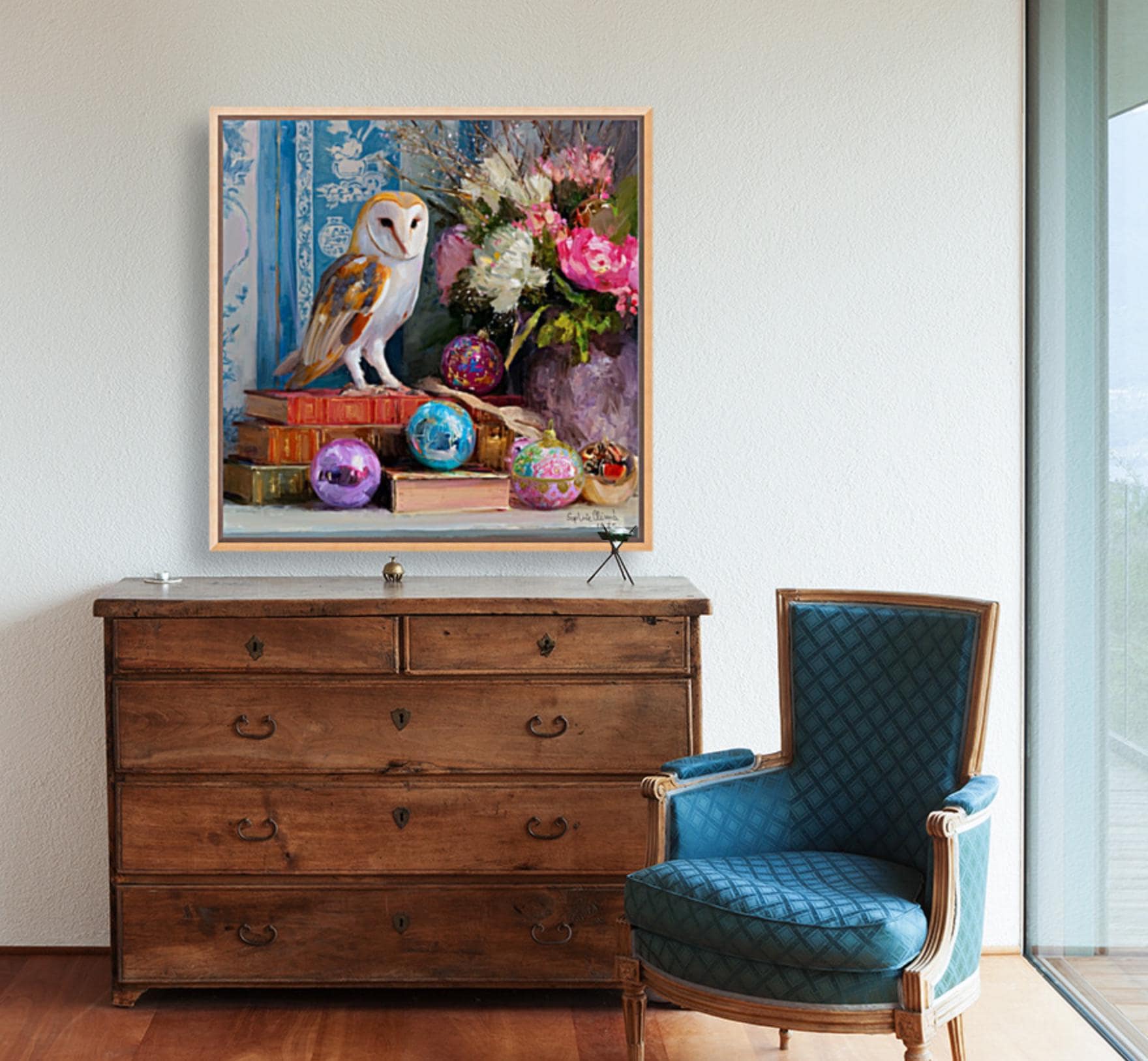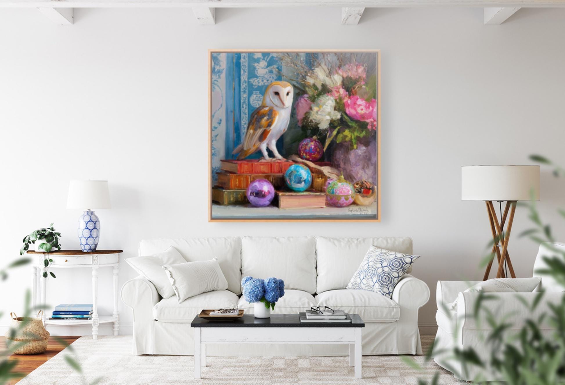 Grandmillennial art, Barn Owl and Christmas baubles, Cozy Christmas art
