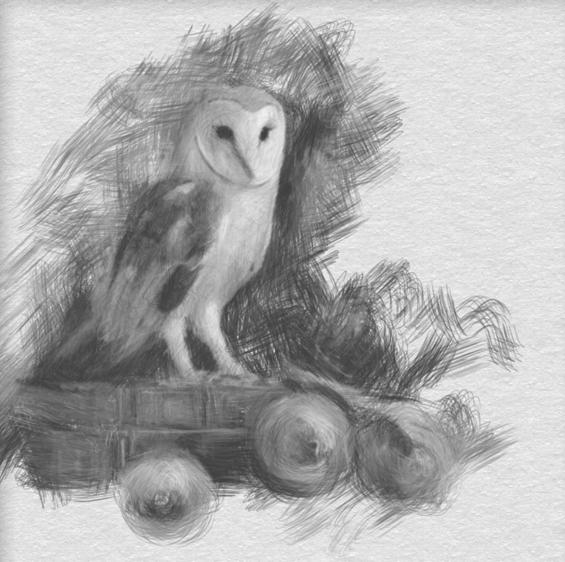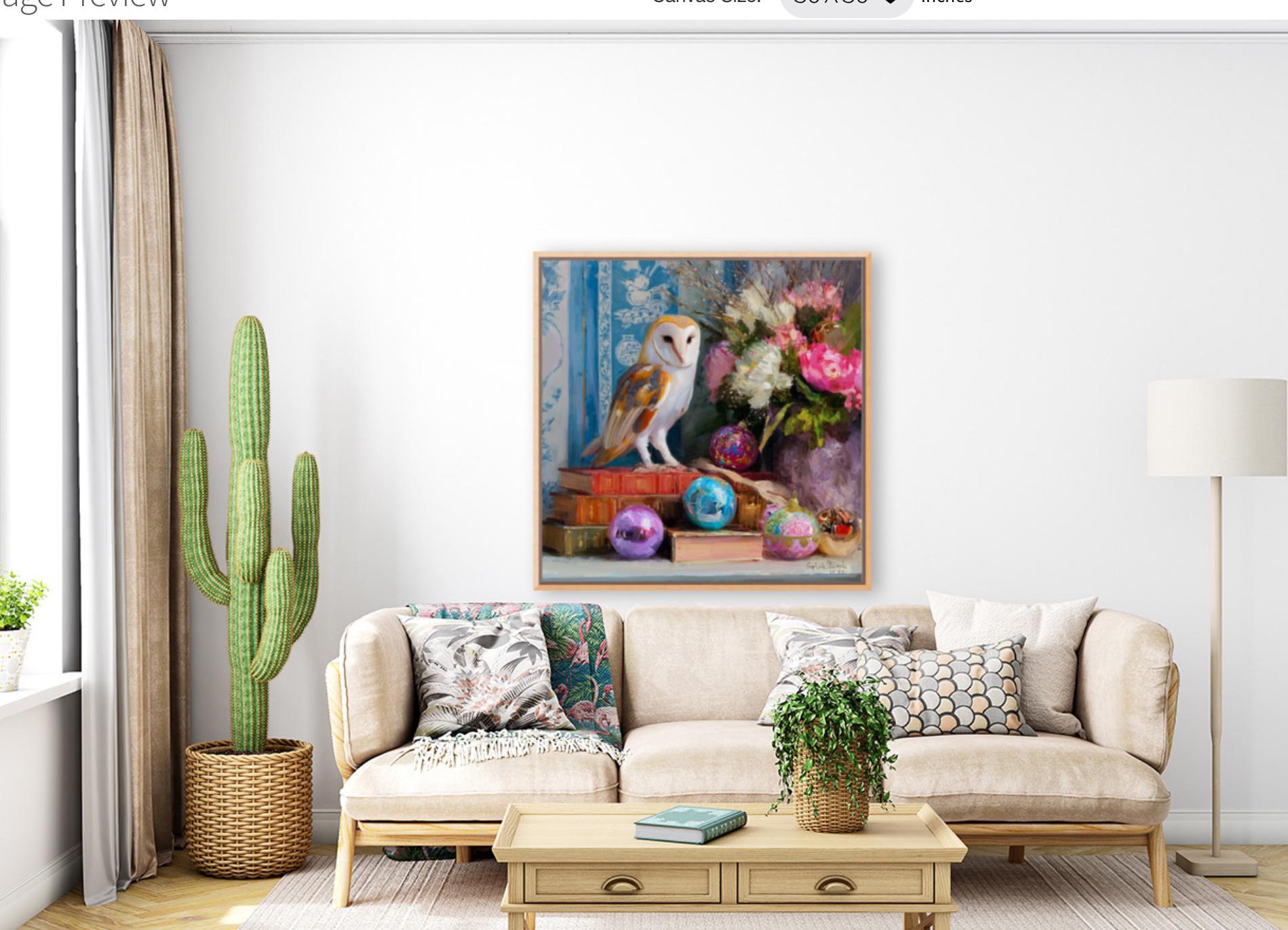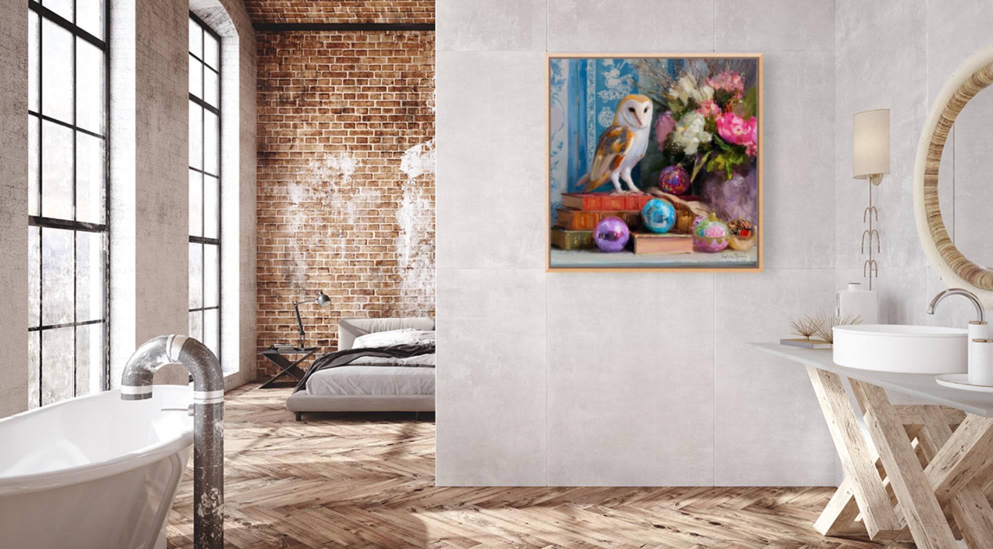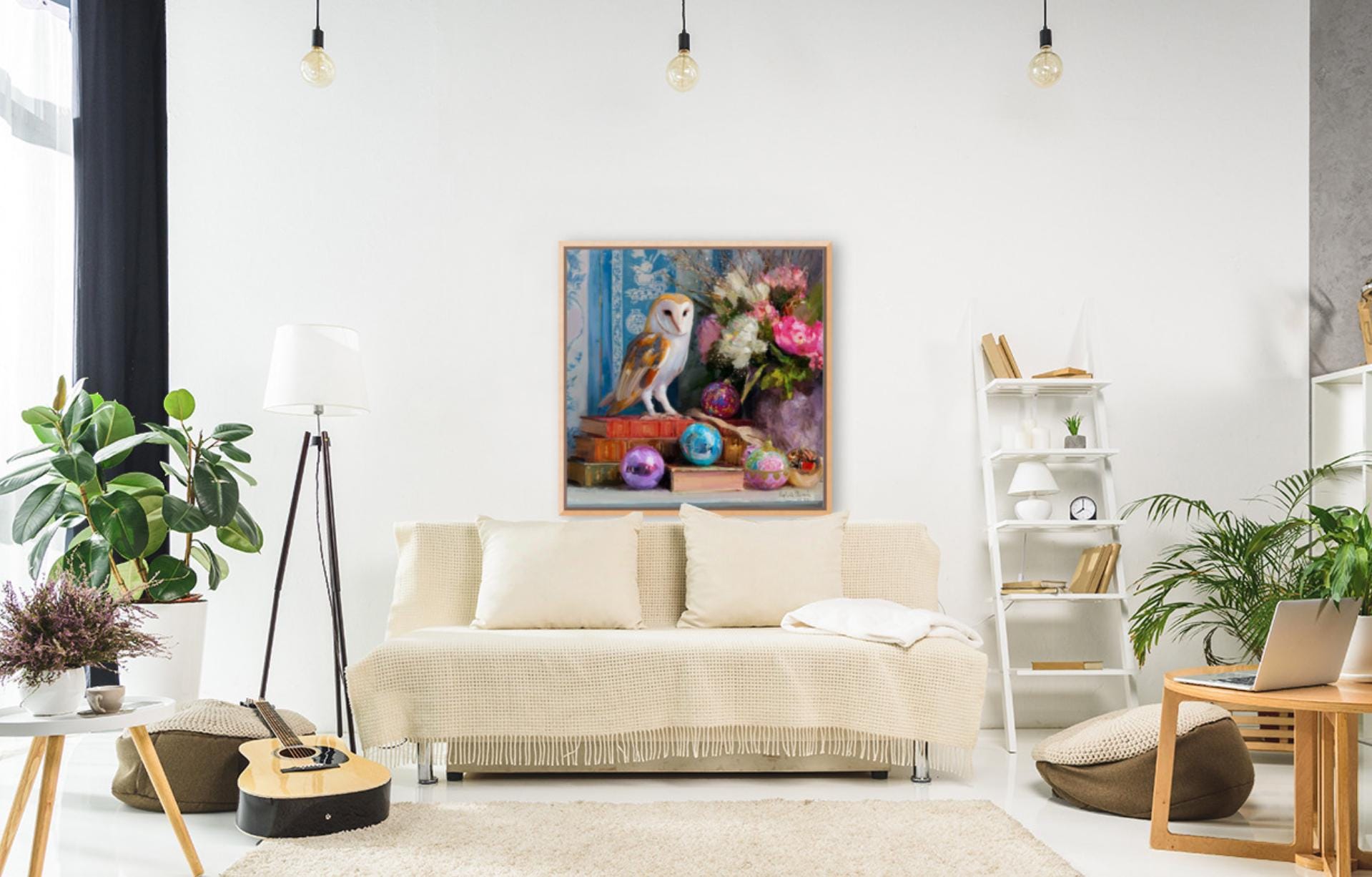 Grandmillennial art, Barn Owl and Christmas baubles, Cozy Christmas art