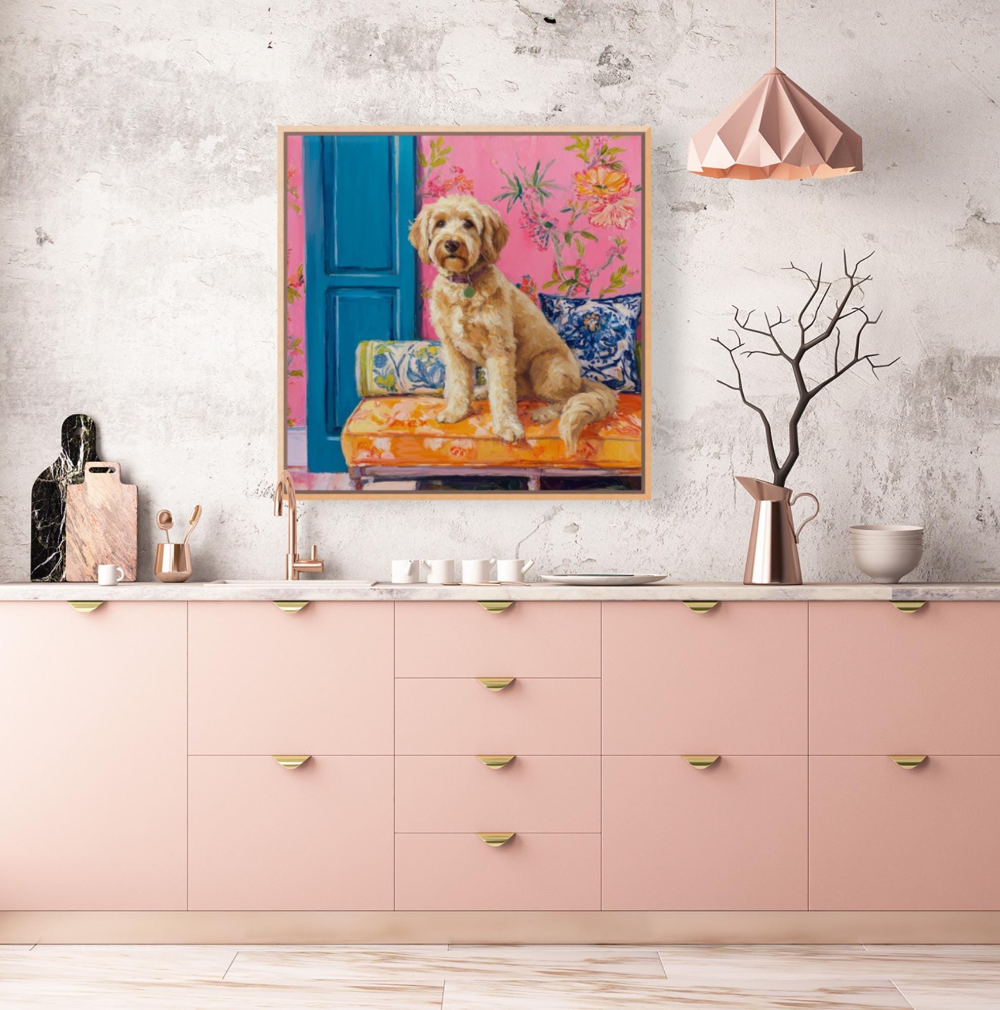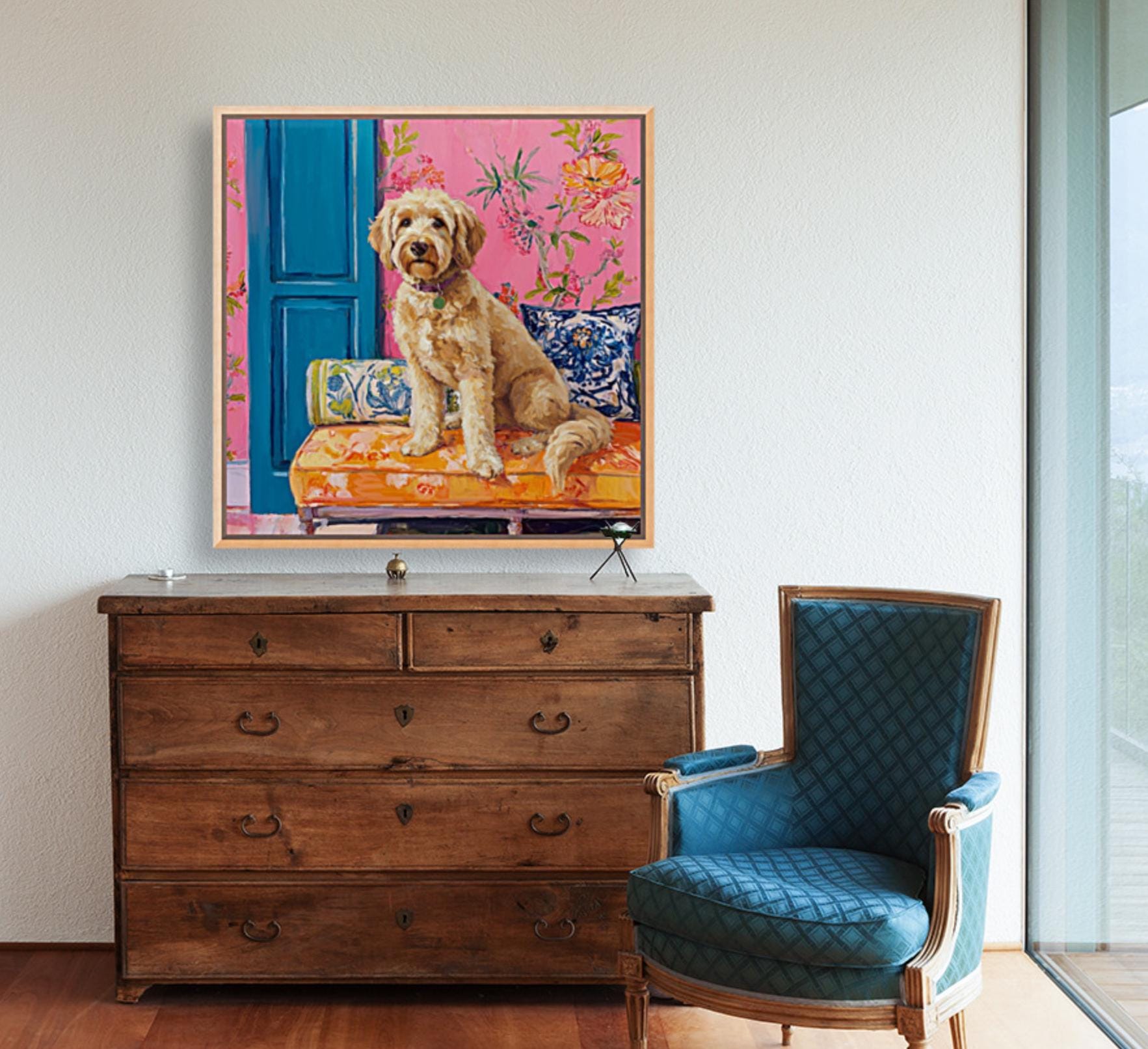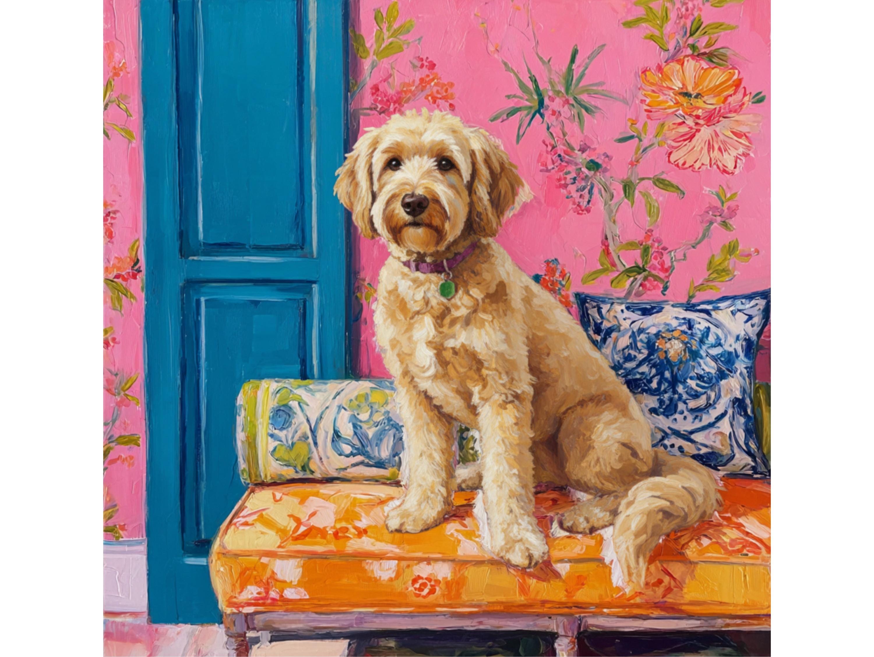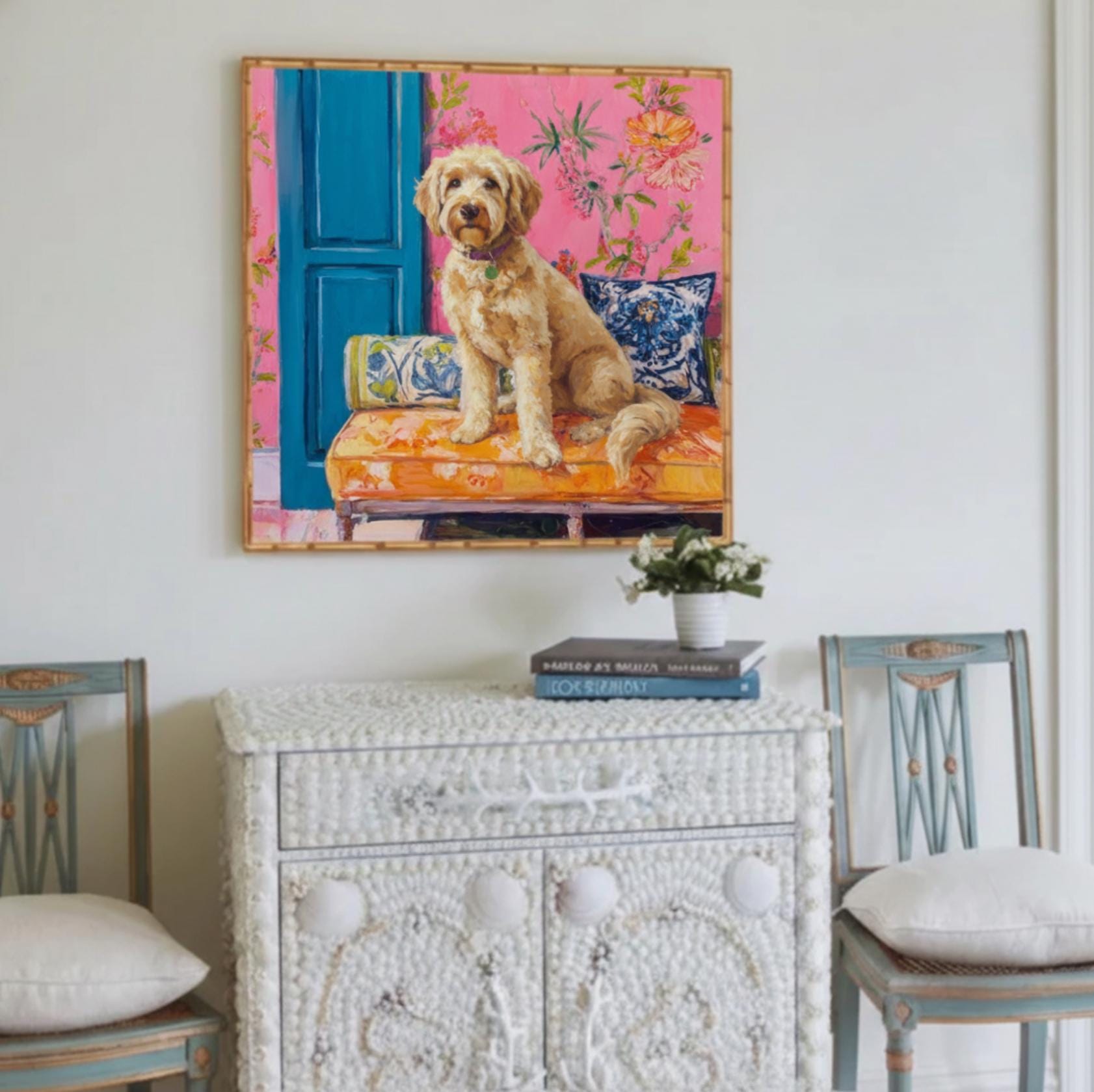 Grandmillennial art, Golden doodle in pink room, whimsical dog painting