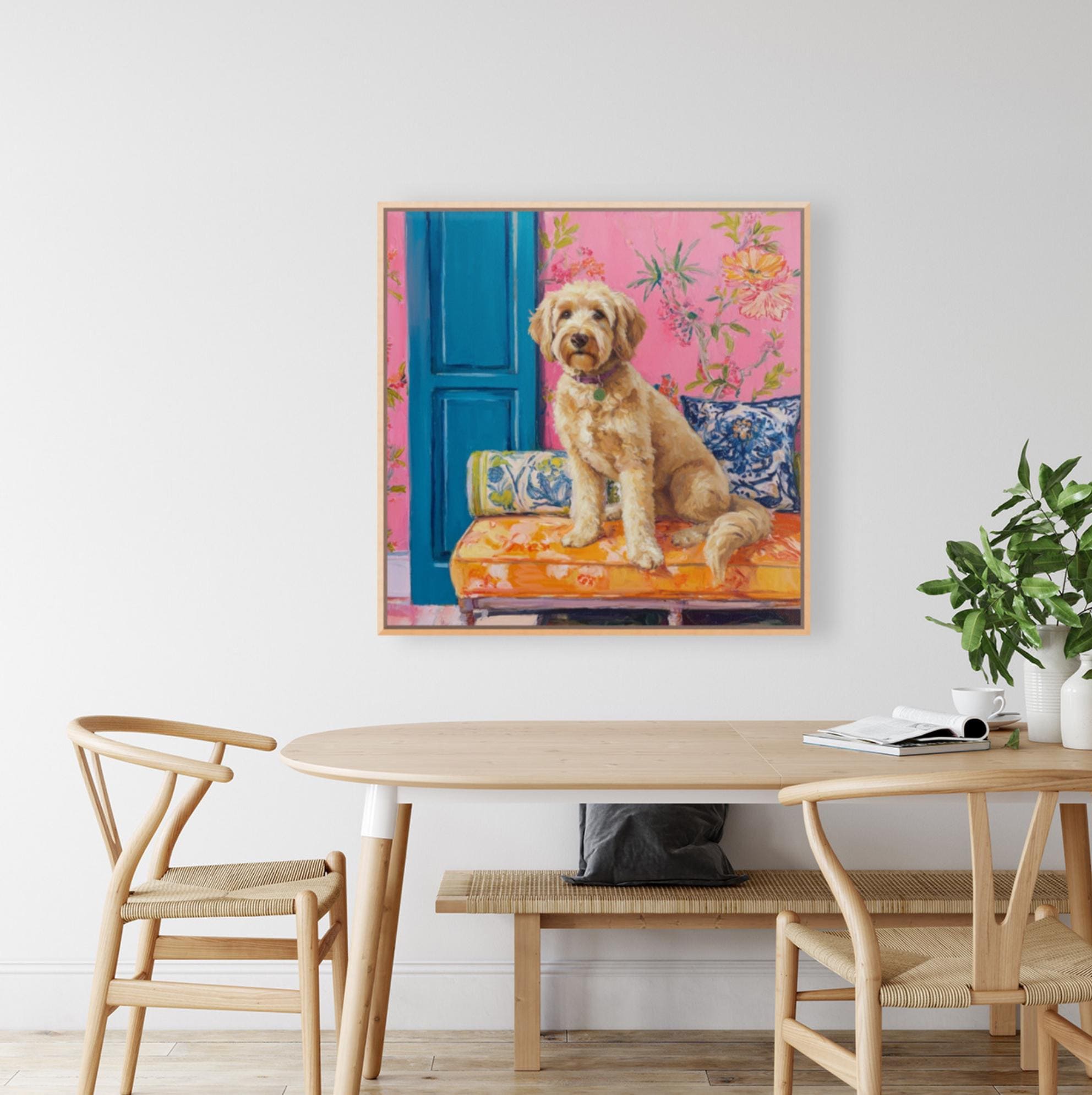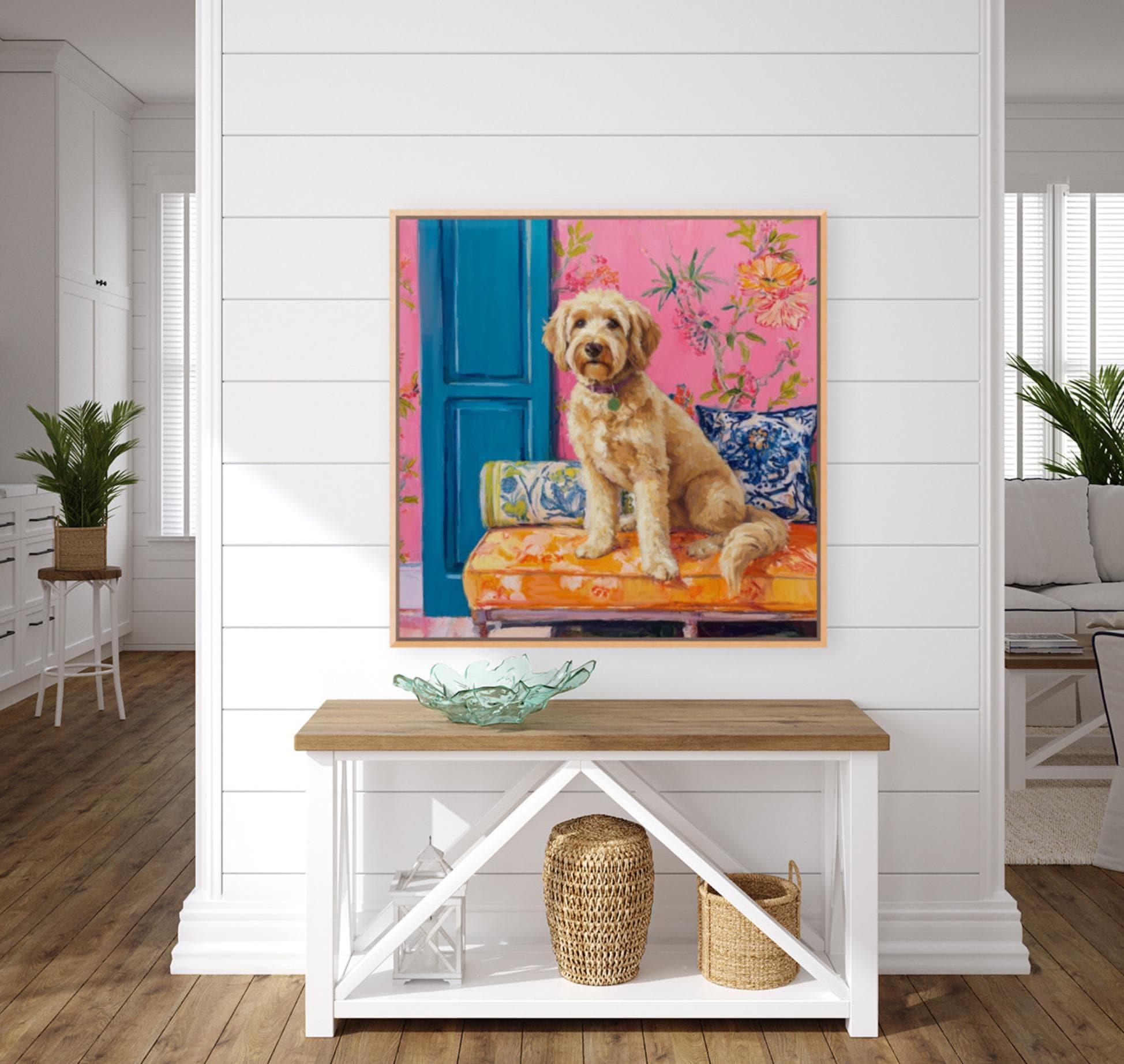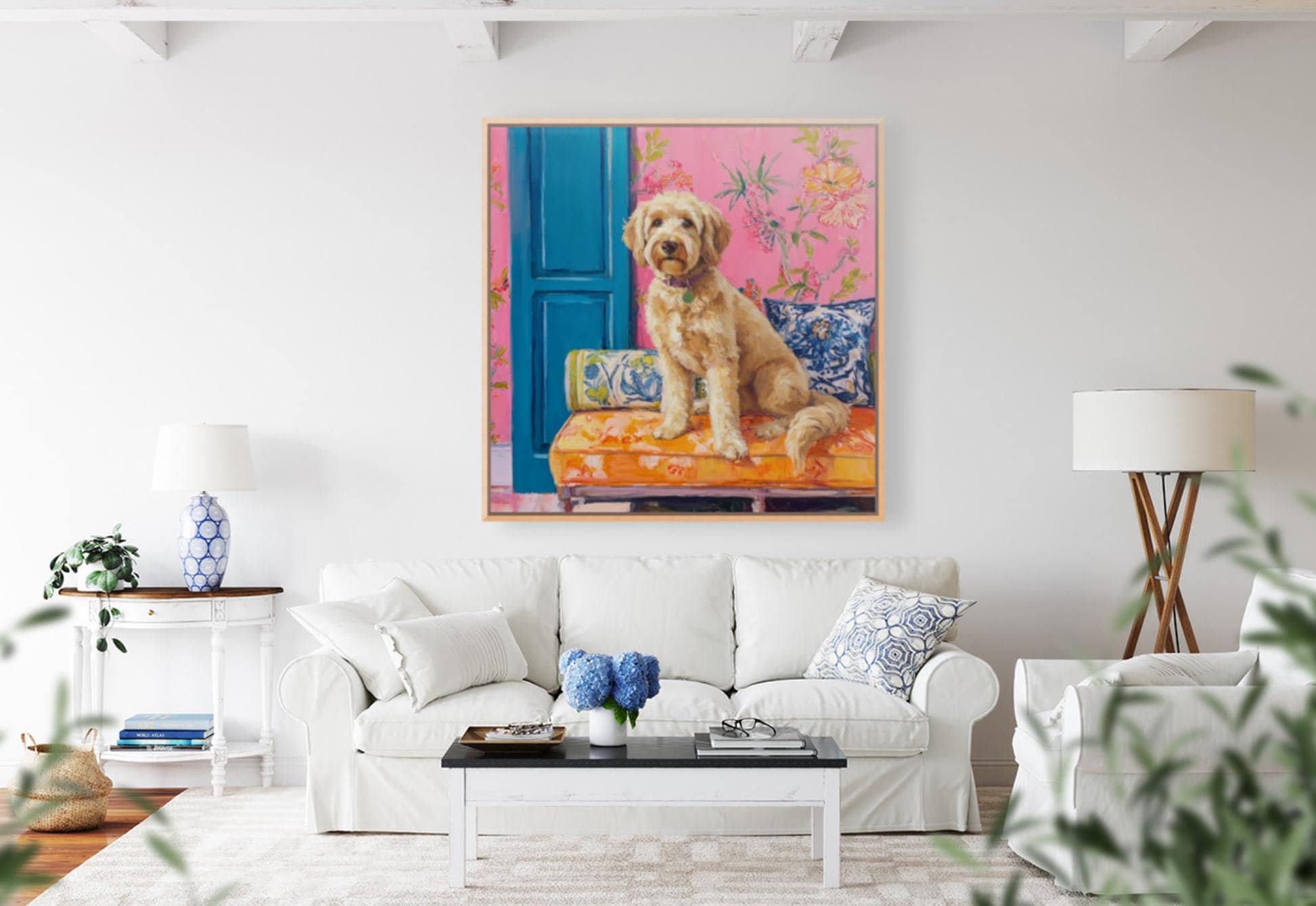 Grandmillennial art, Golden doodle in pink room, whimsical dog painting