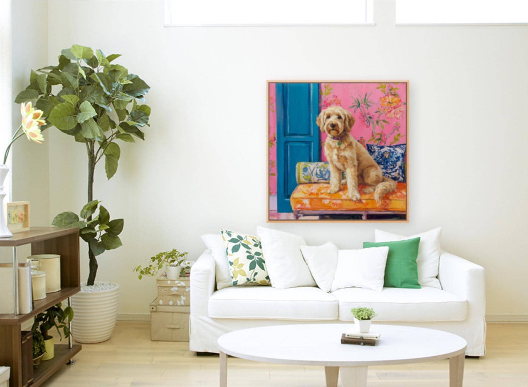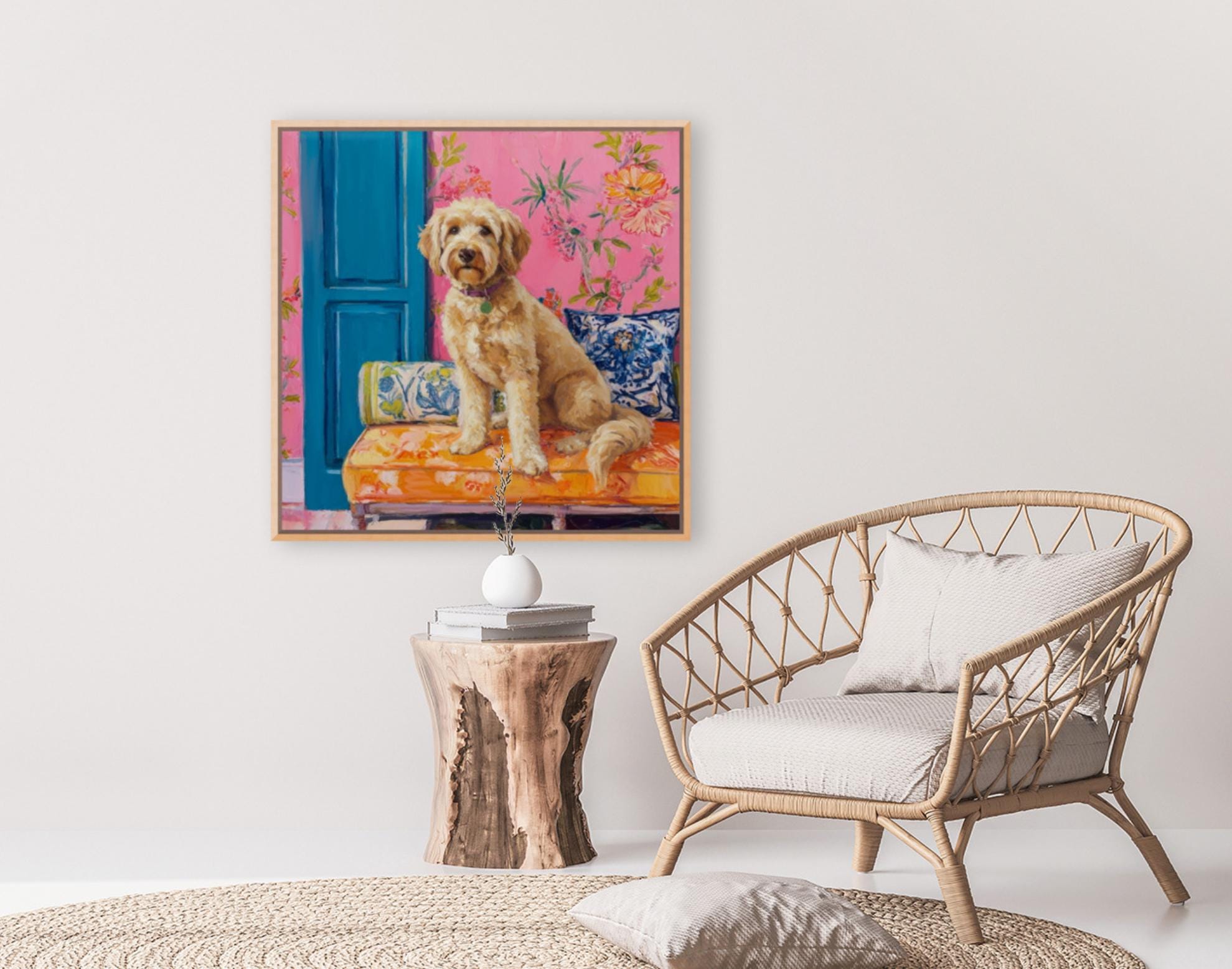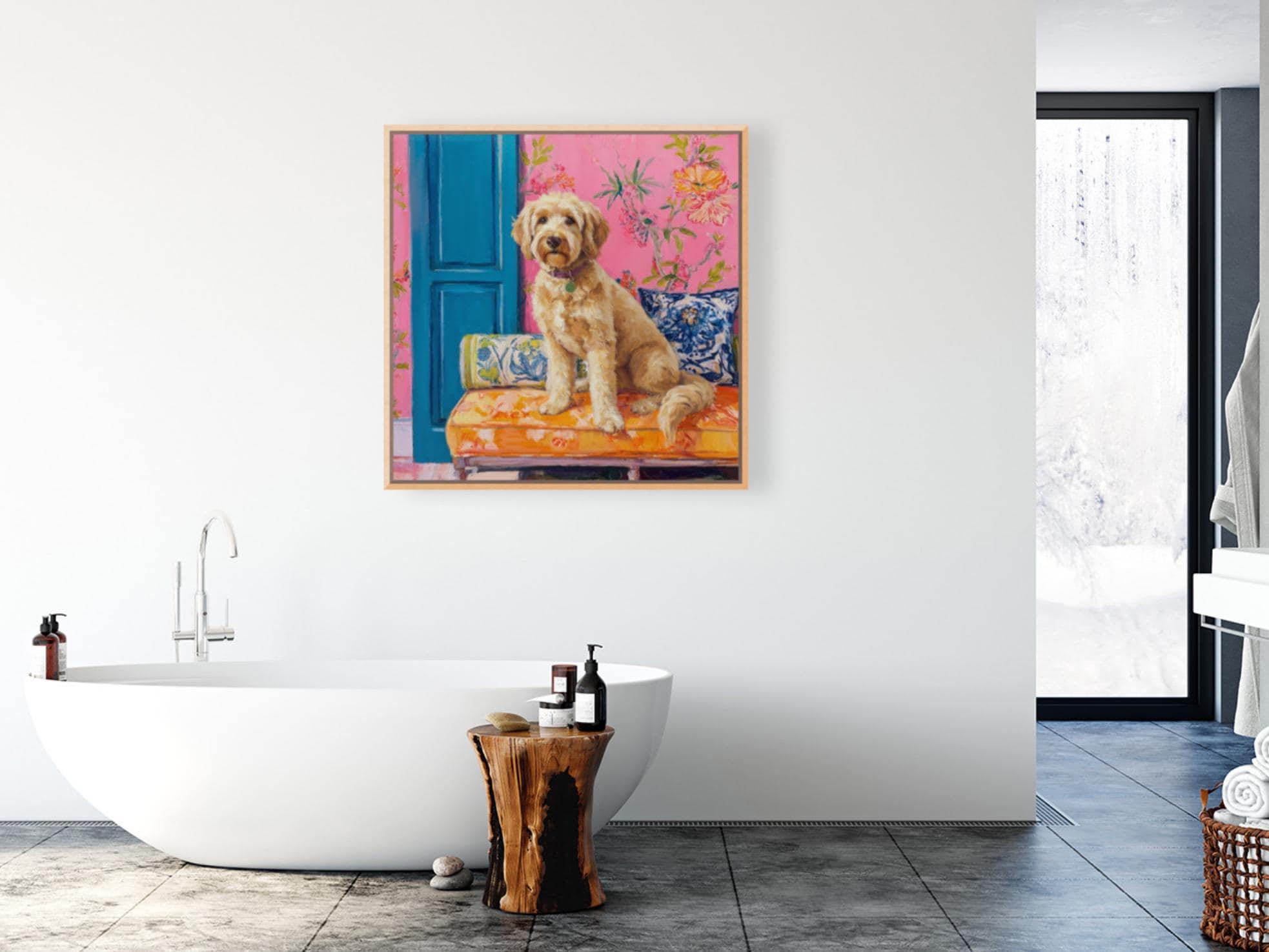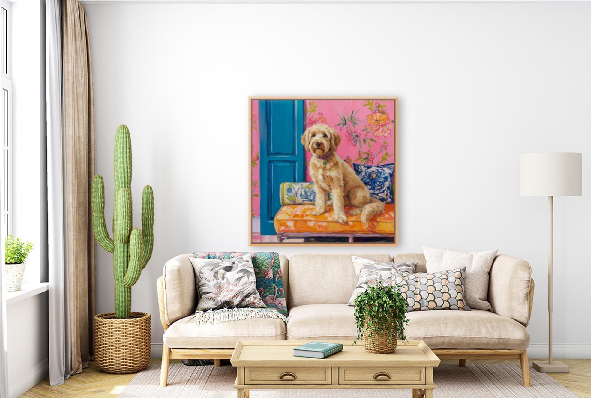 Grandmillennial art, Golden doodle in pink room, whimsical dog painting