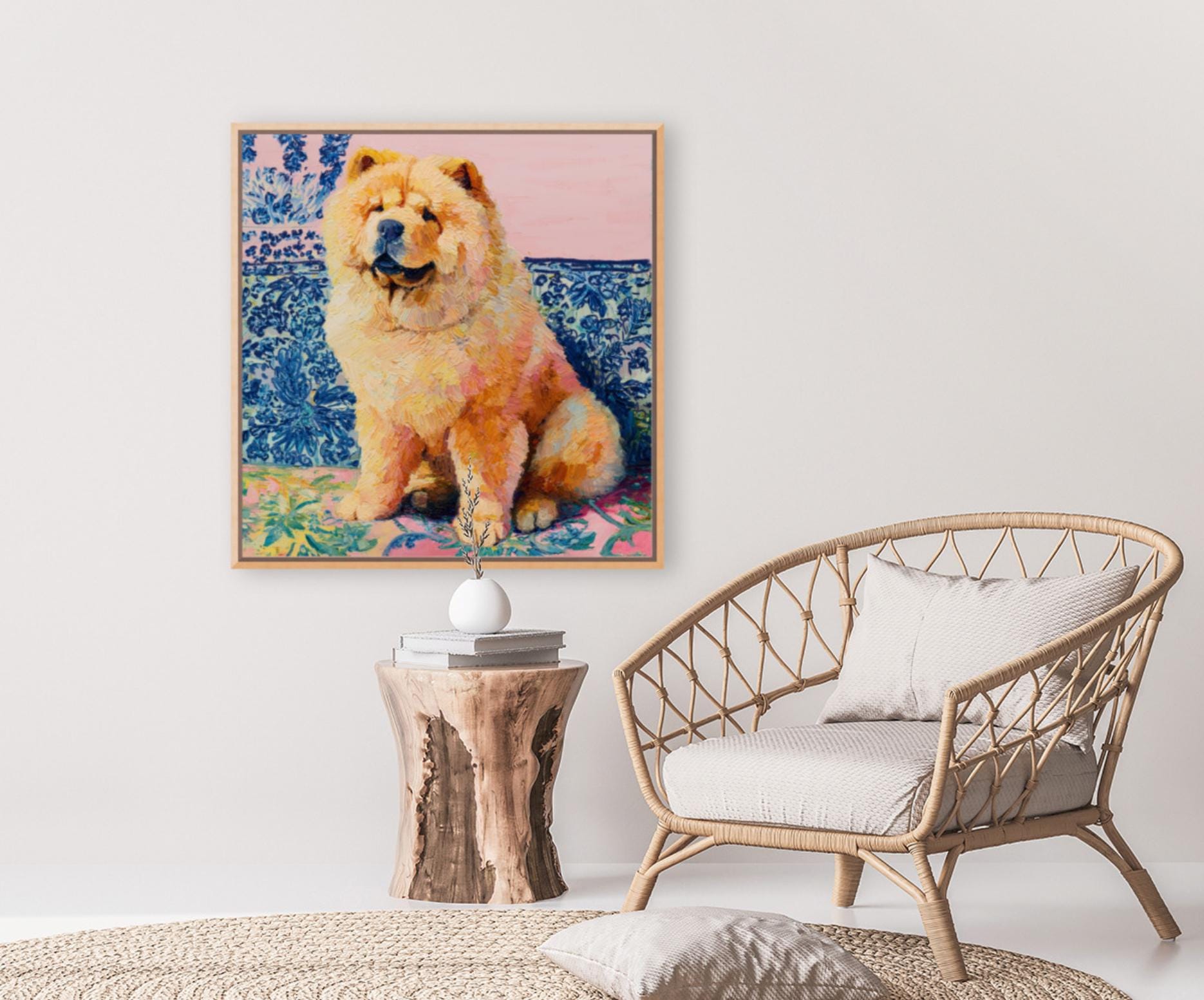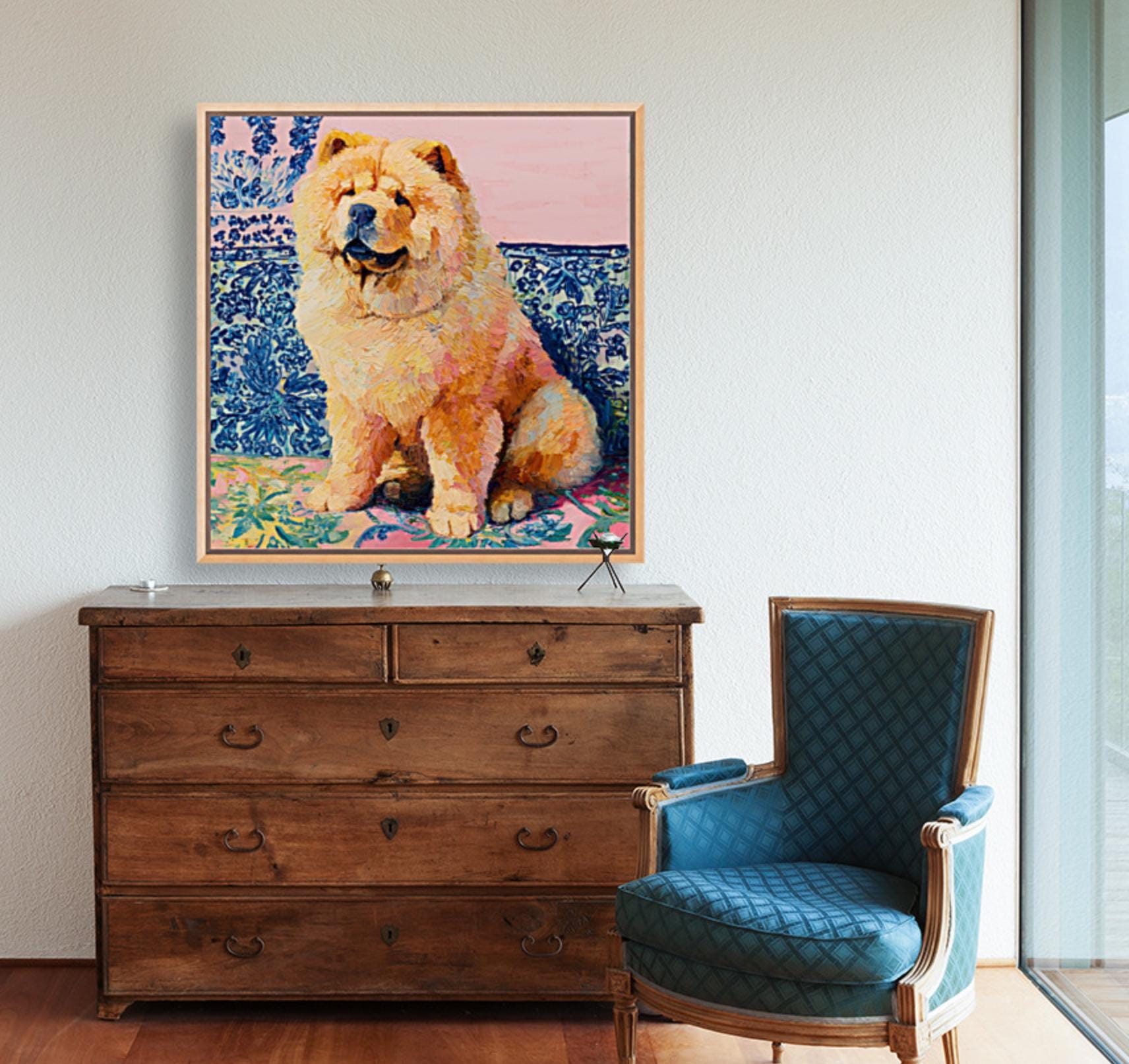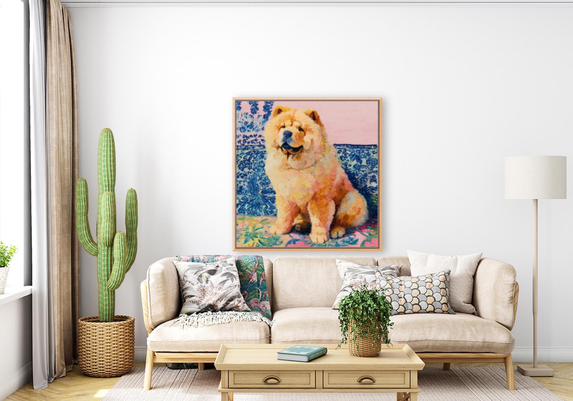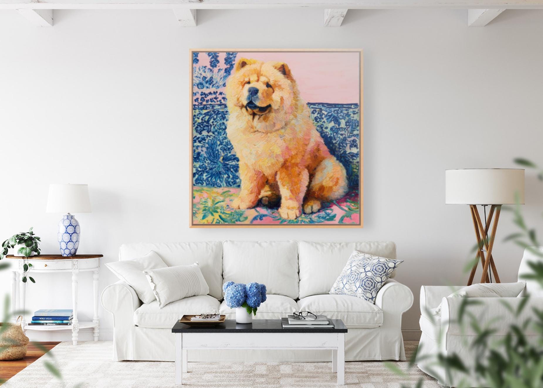 Grandmillennial art, Chow Chow on blue and white sofa, whimsical dog painting