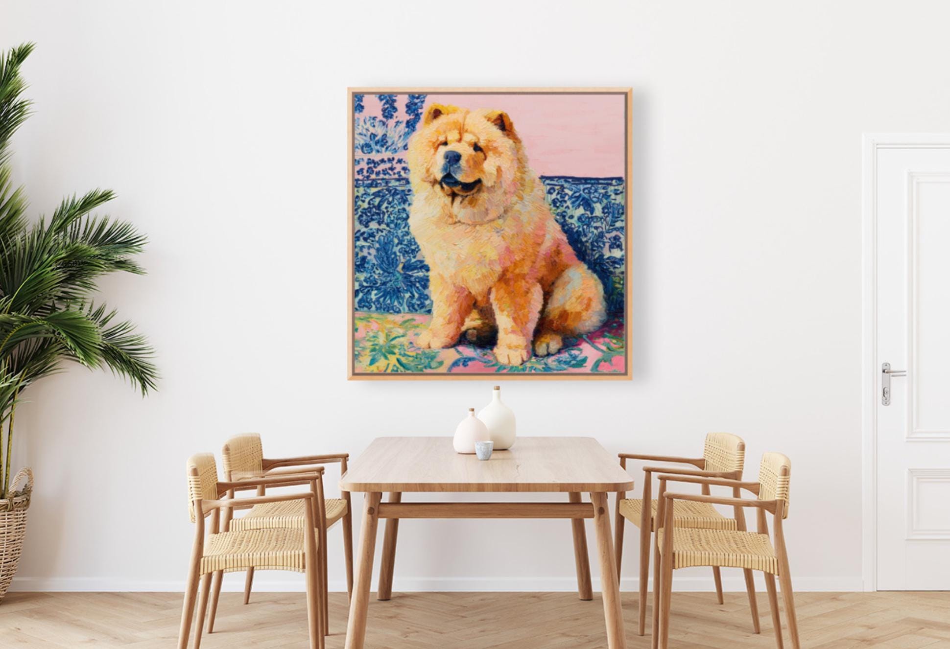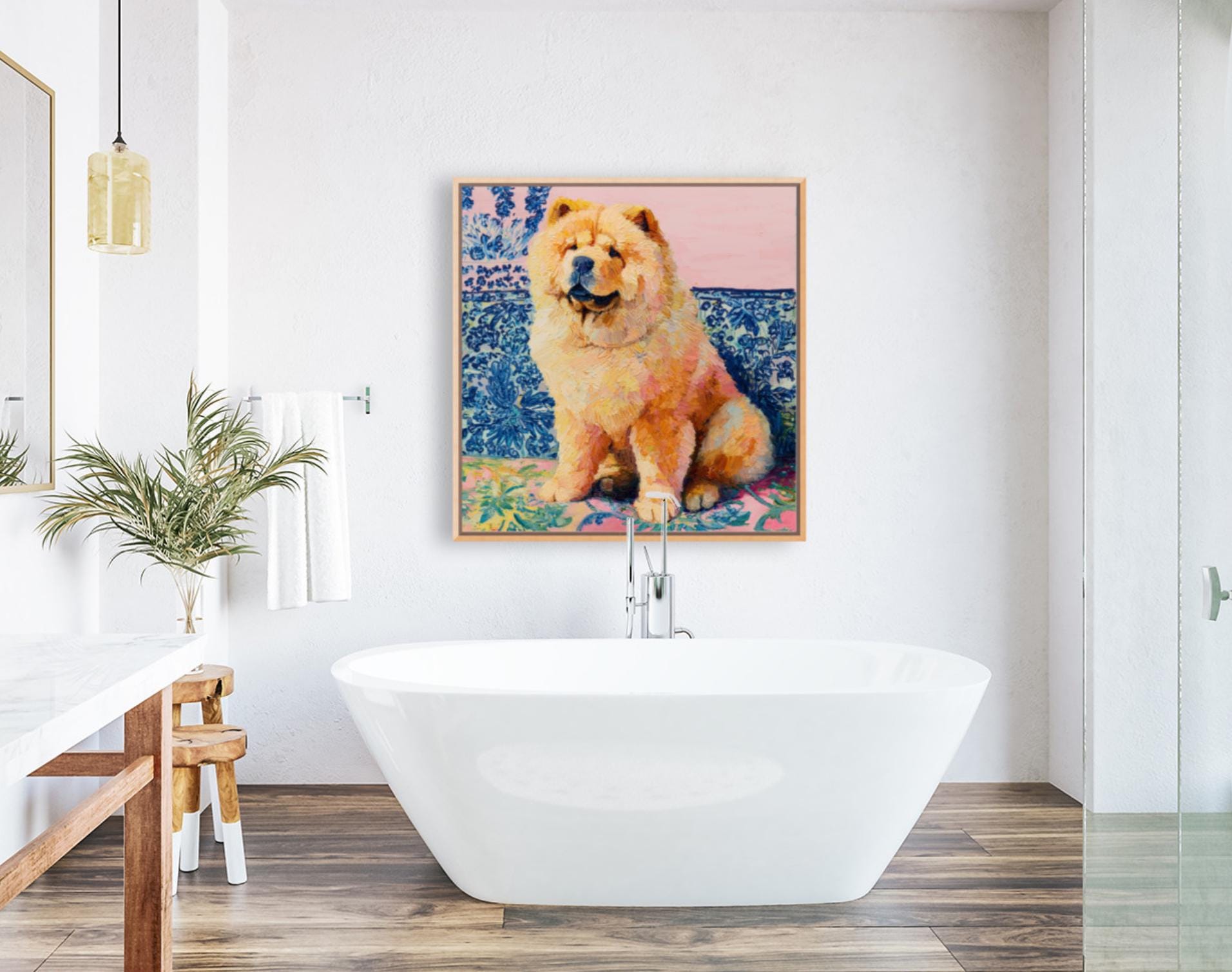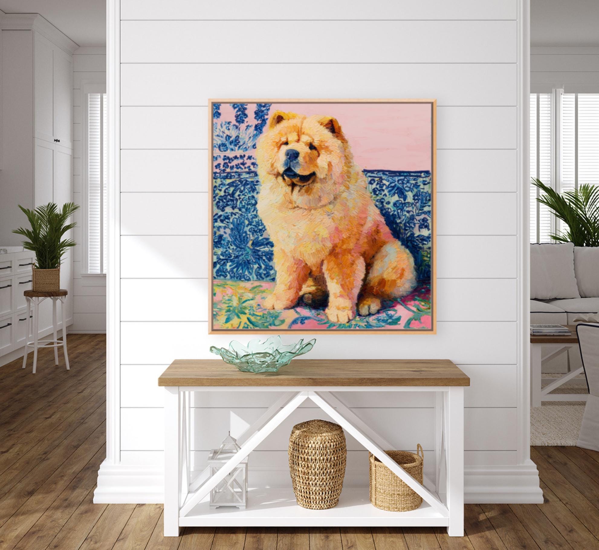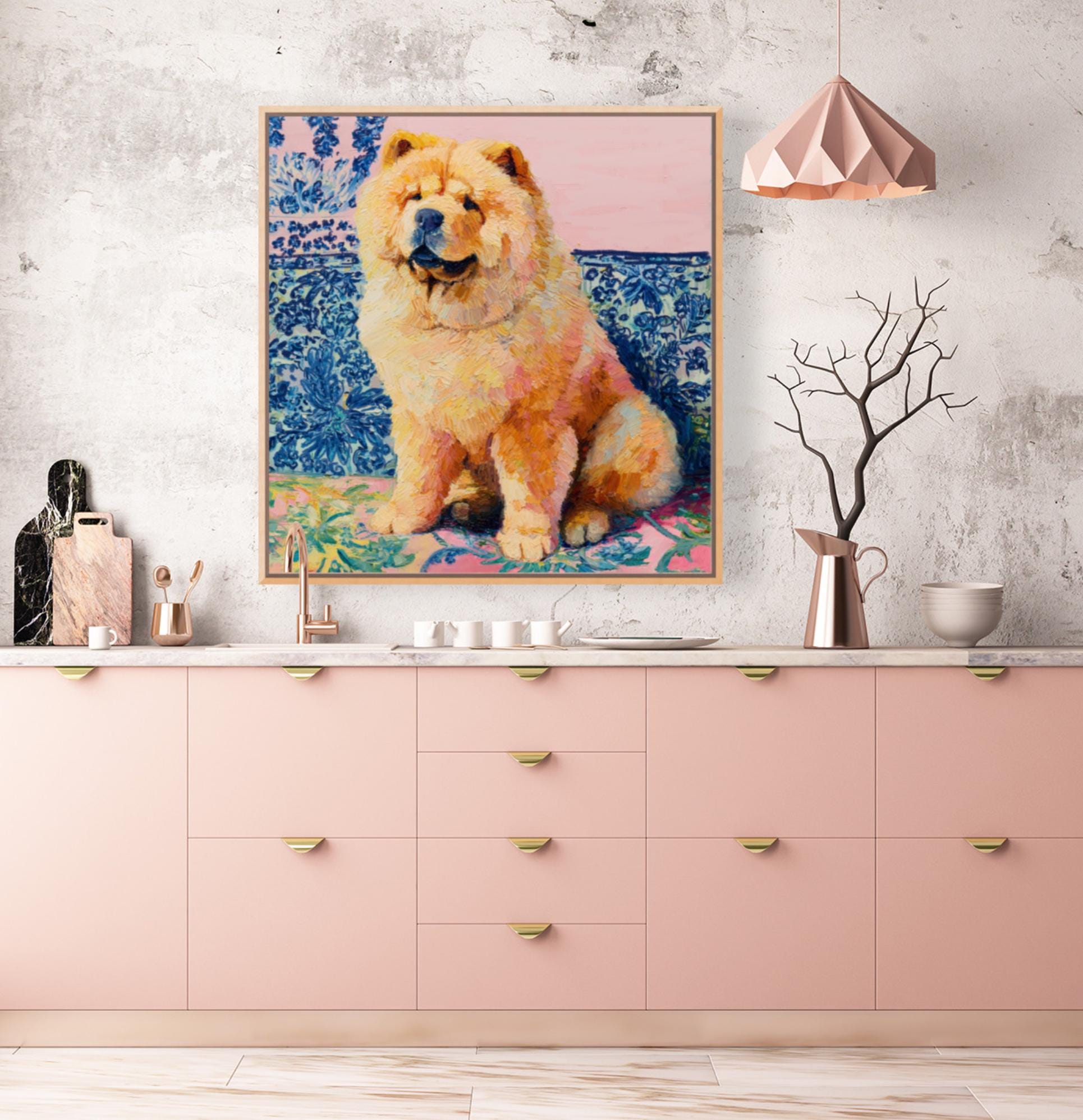 Grandmillennial art, Chow Chow on blue and white sofa, whimsical dog painting