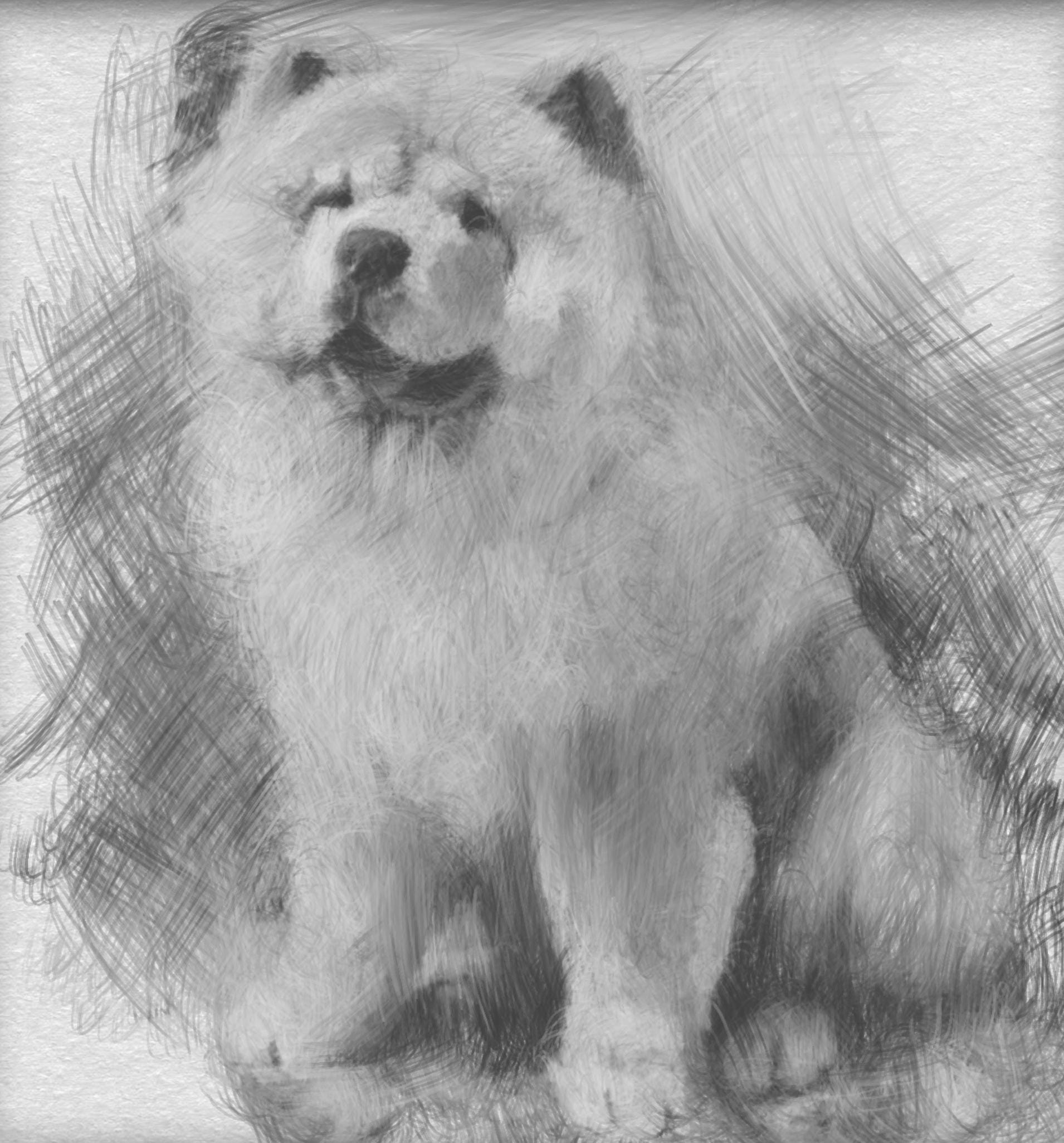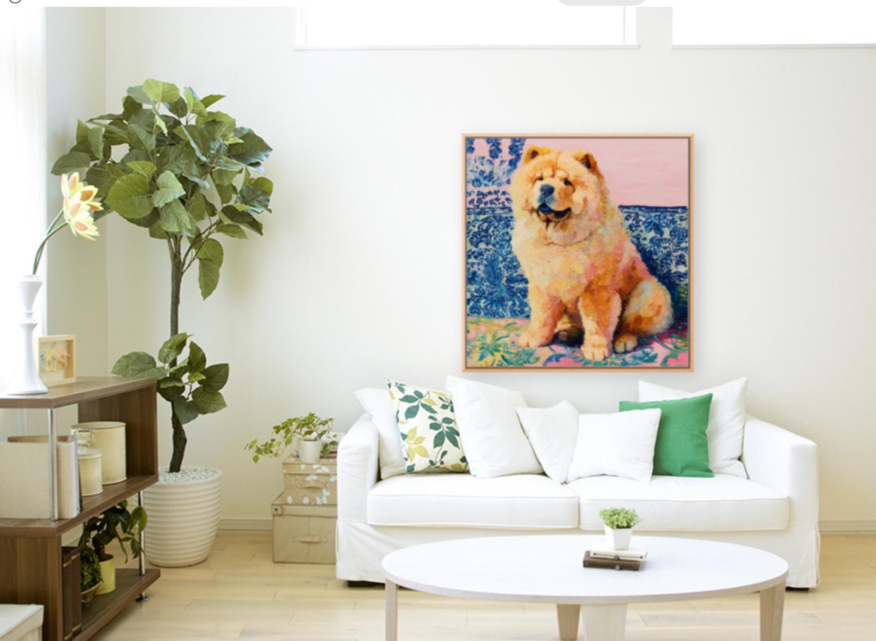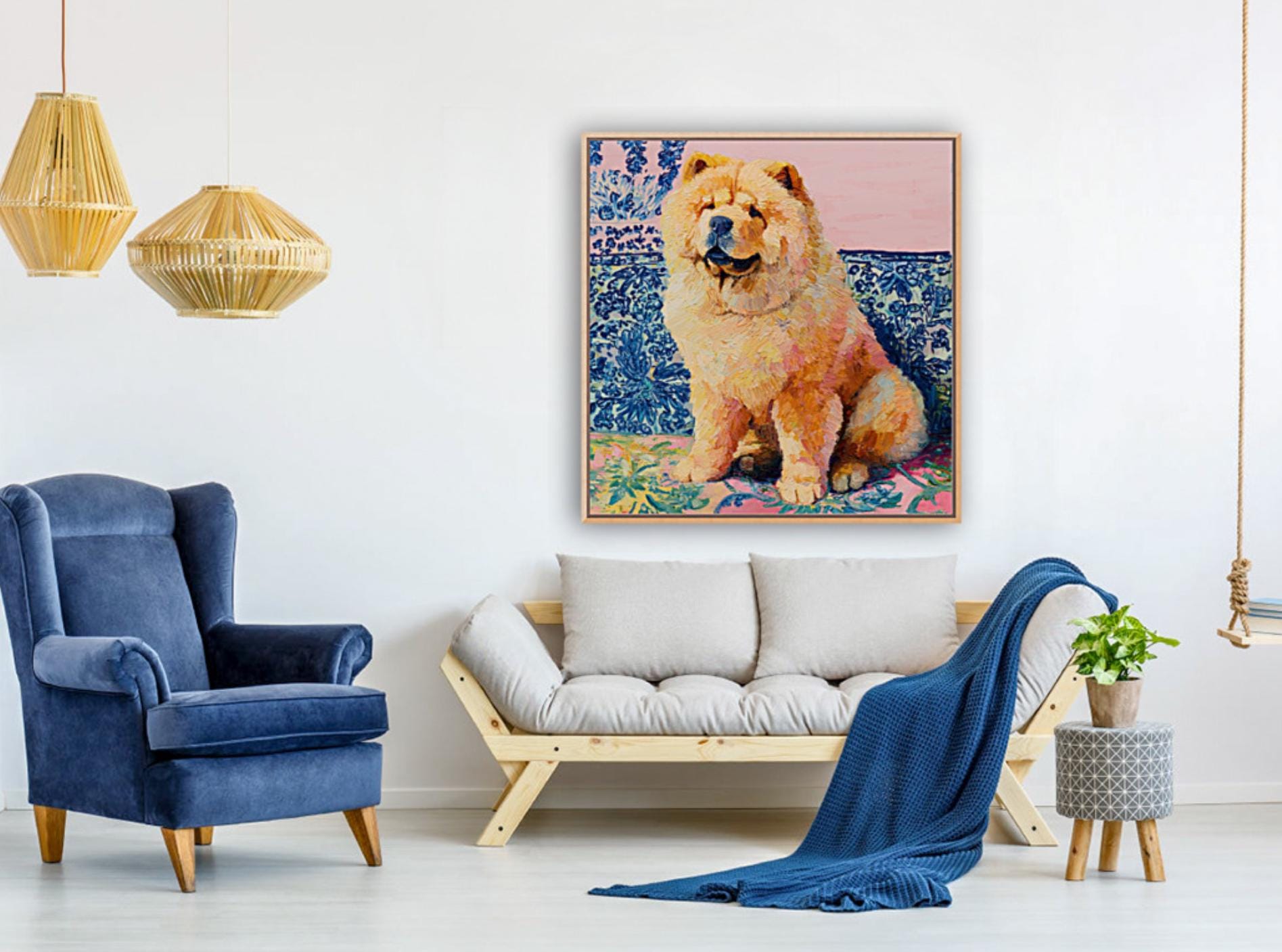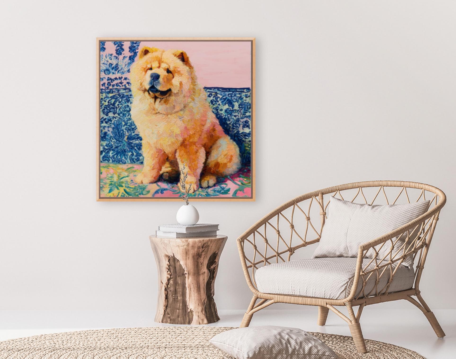 Grandmillennial art, Chow Chow on blue and white sofa, whimsical dog painting