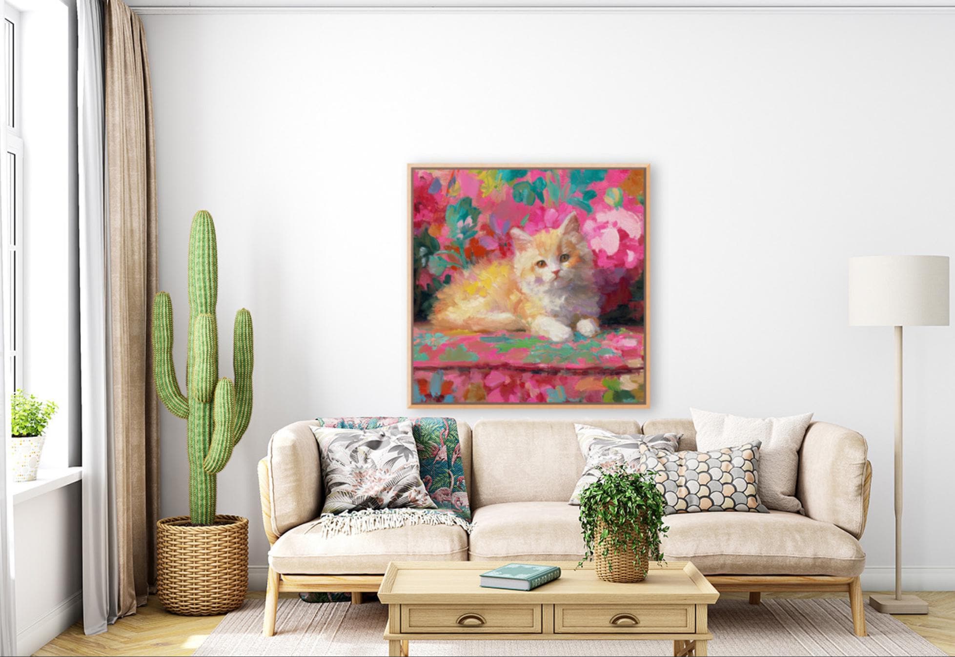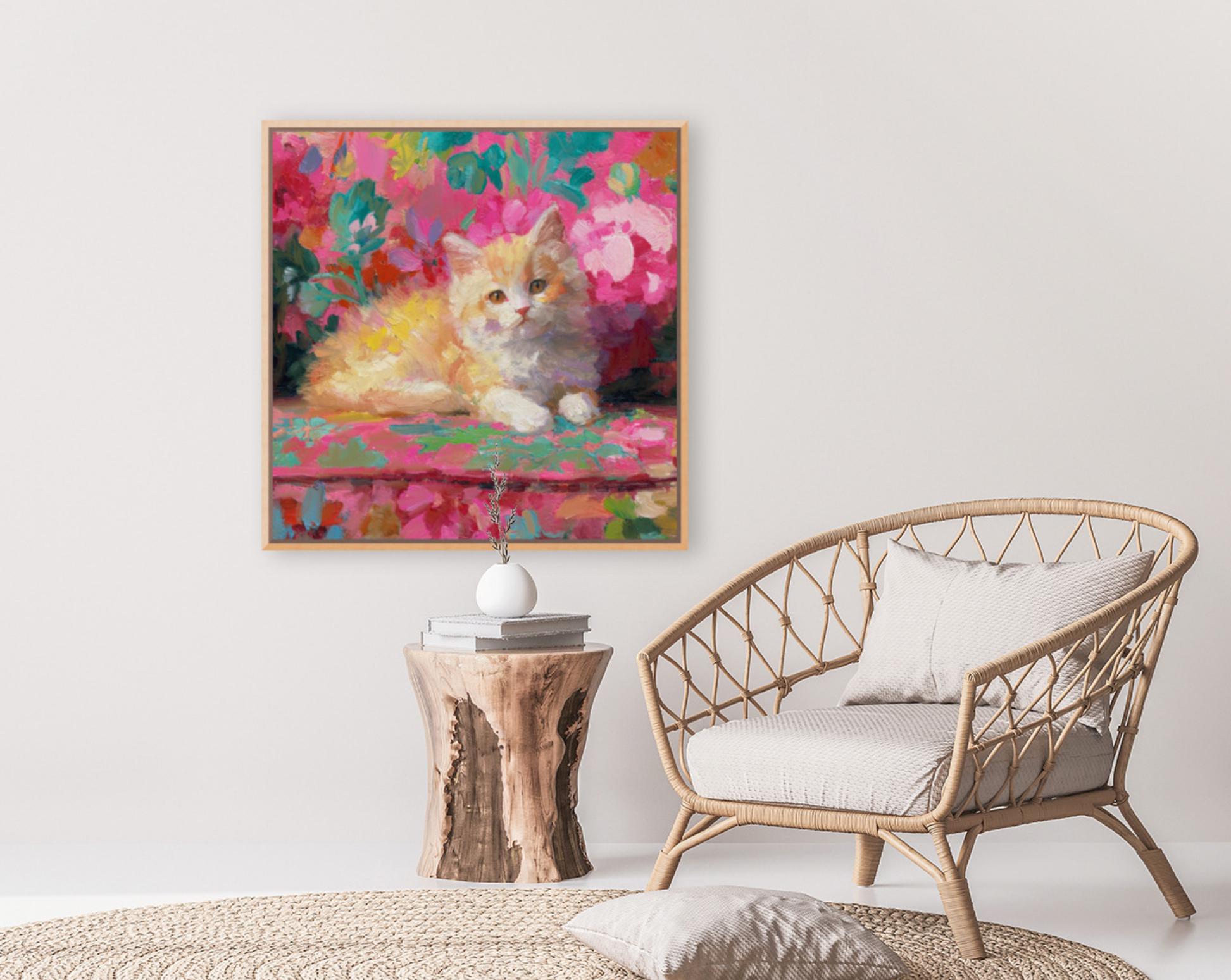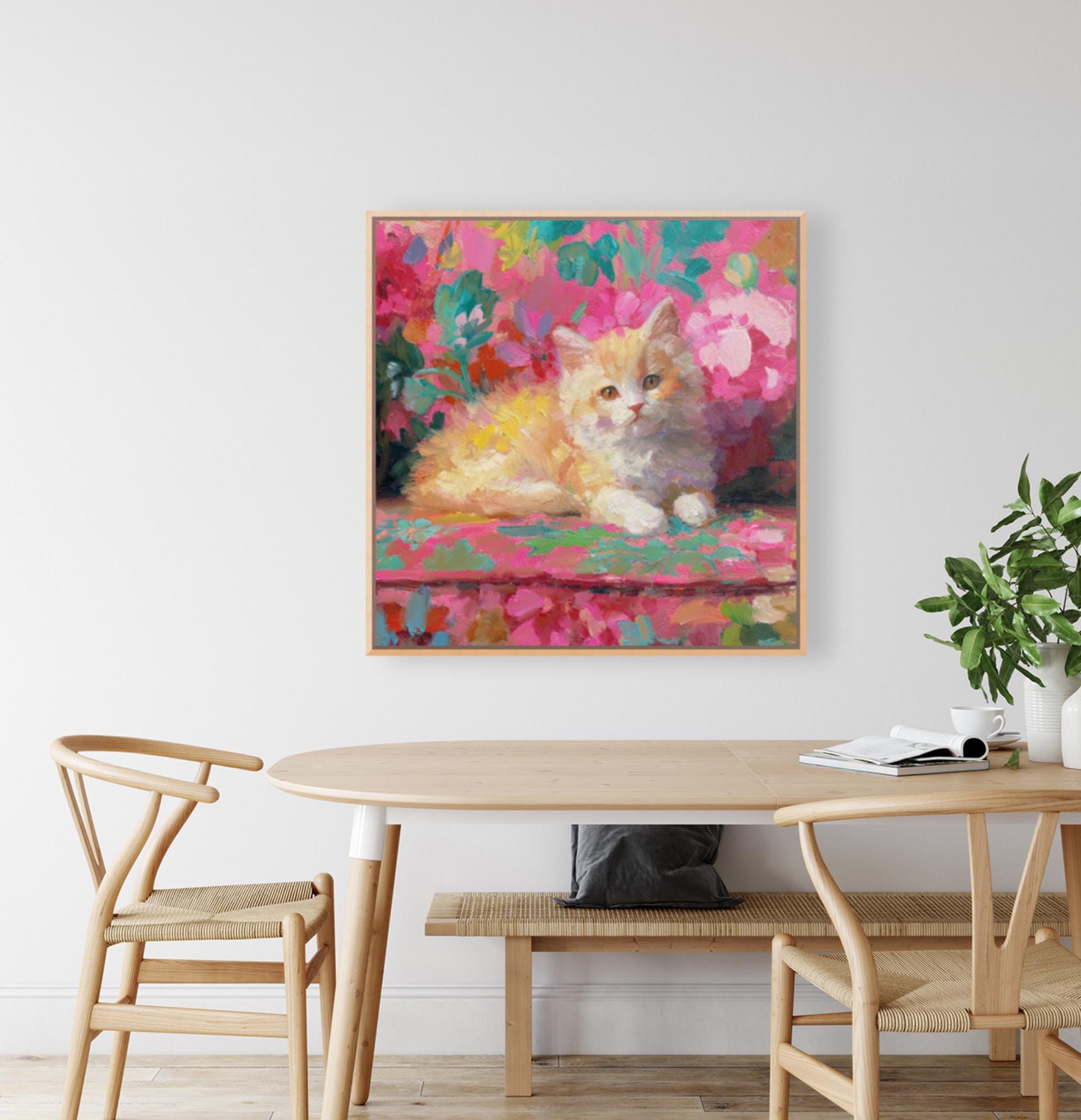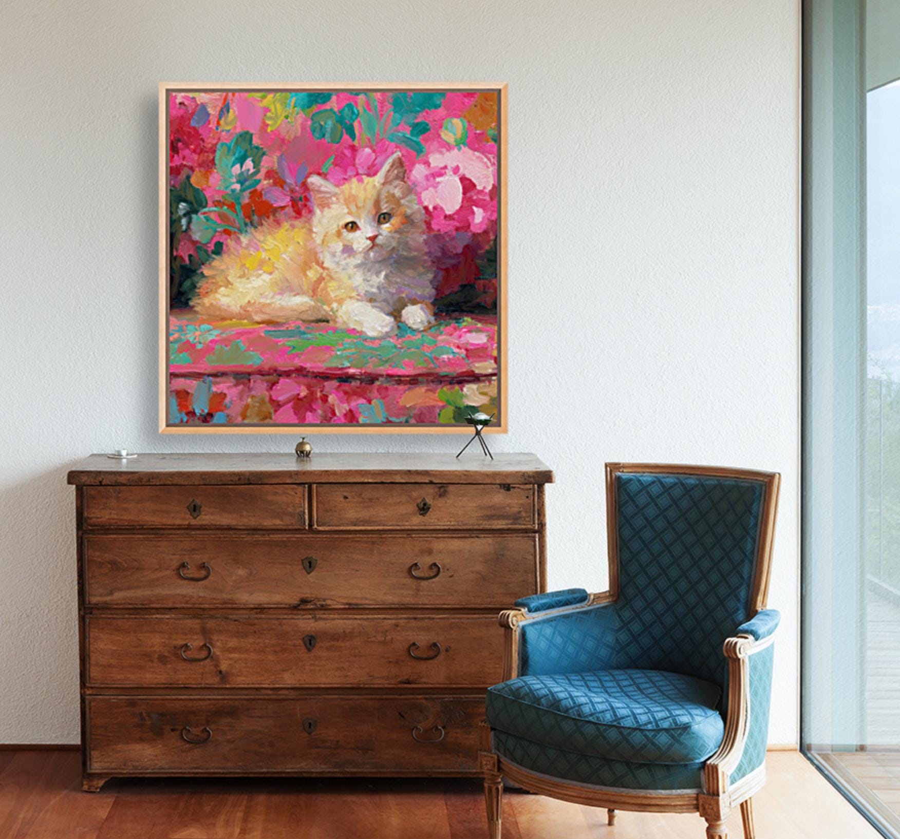 Grandmillennial art, Ginger on pink sofa, whimsical cat art