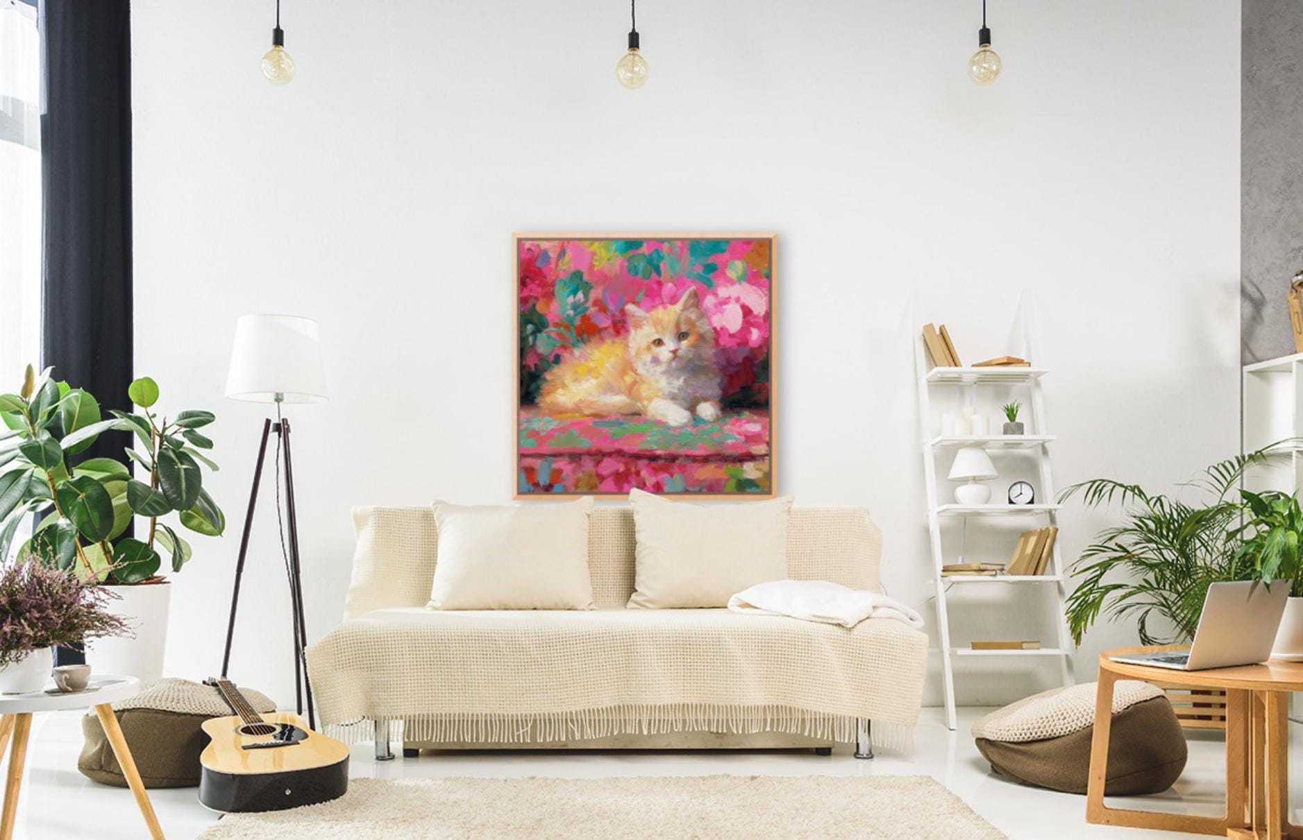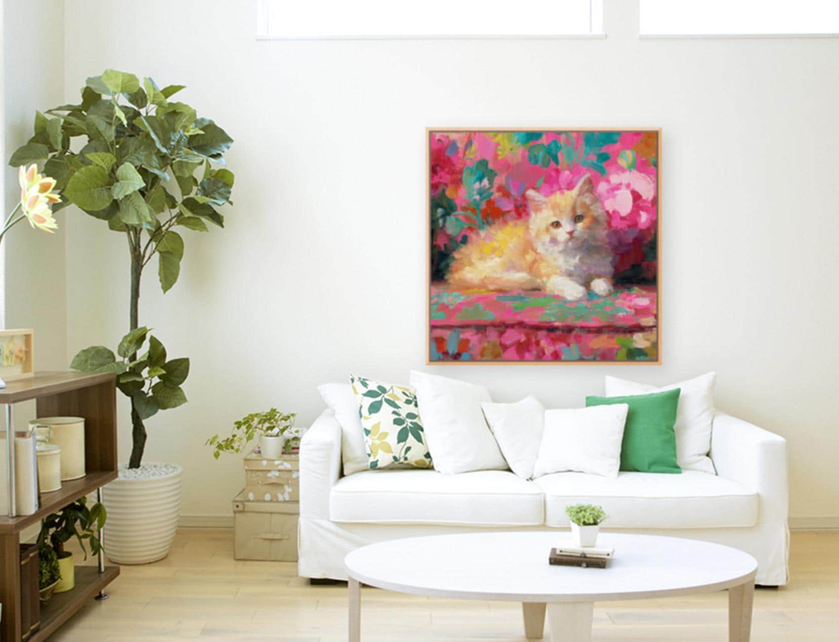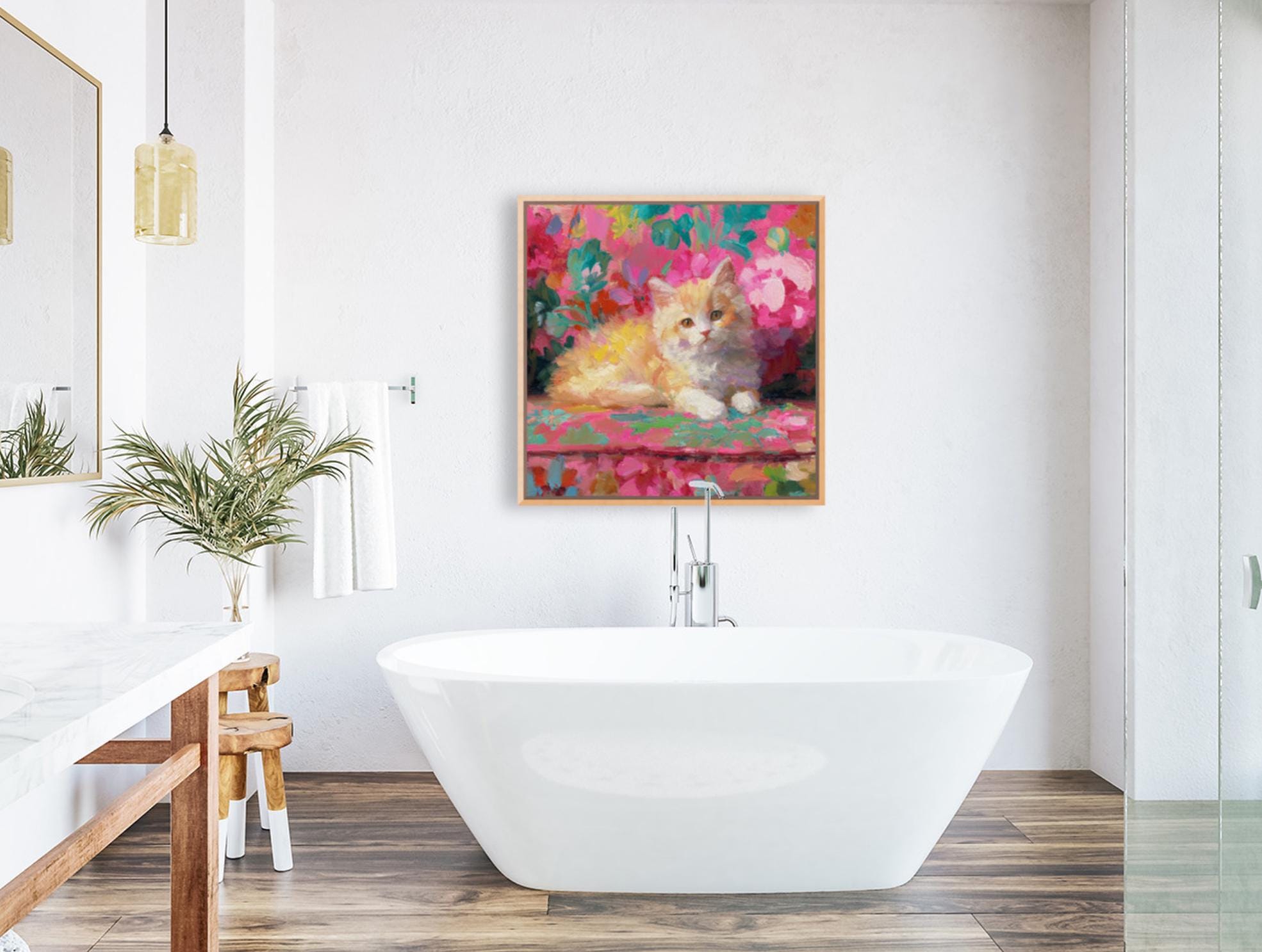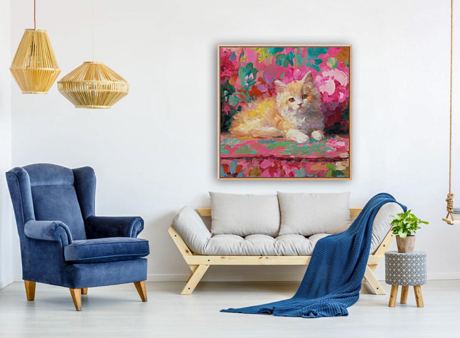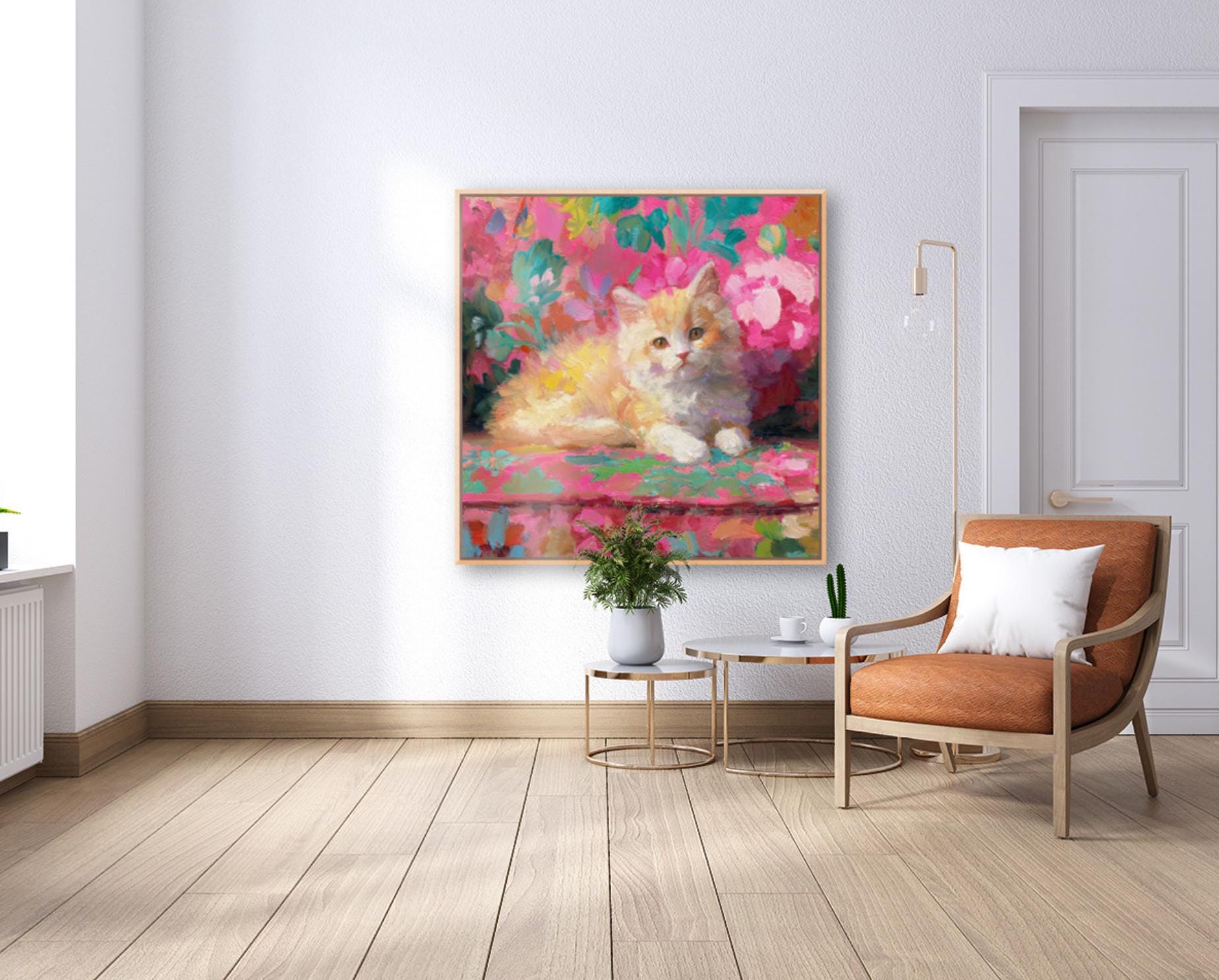 Grandmillennial art, Ginger on pink sofa, whimsical cat art