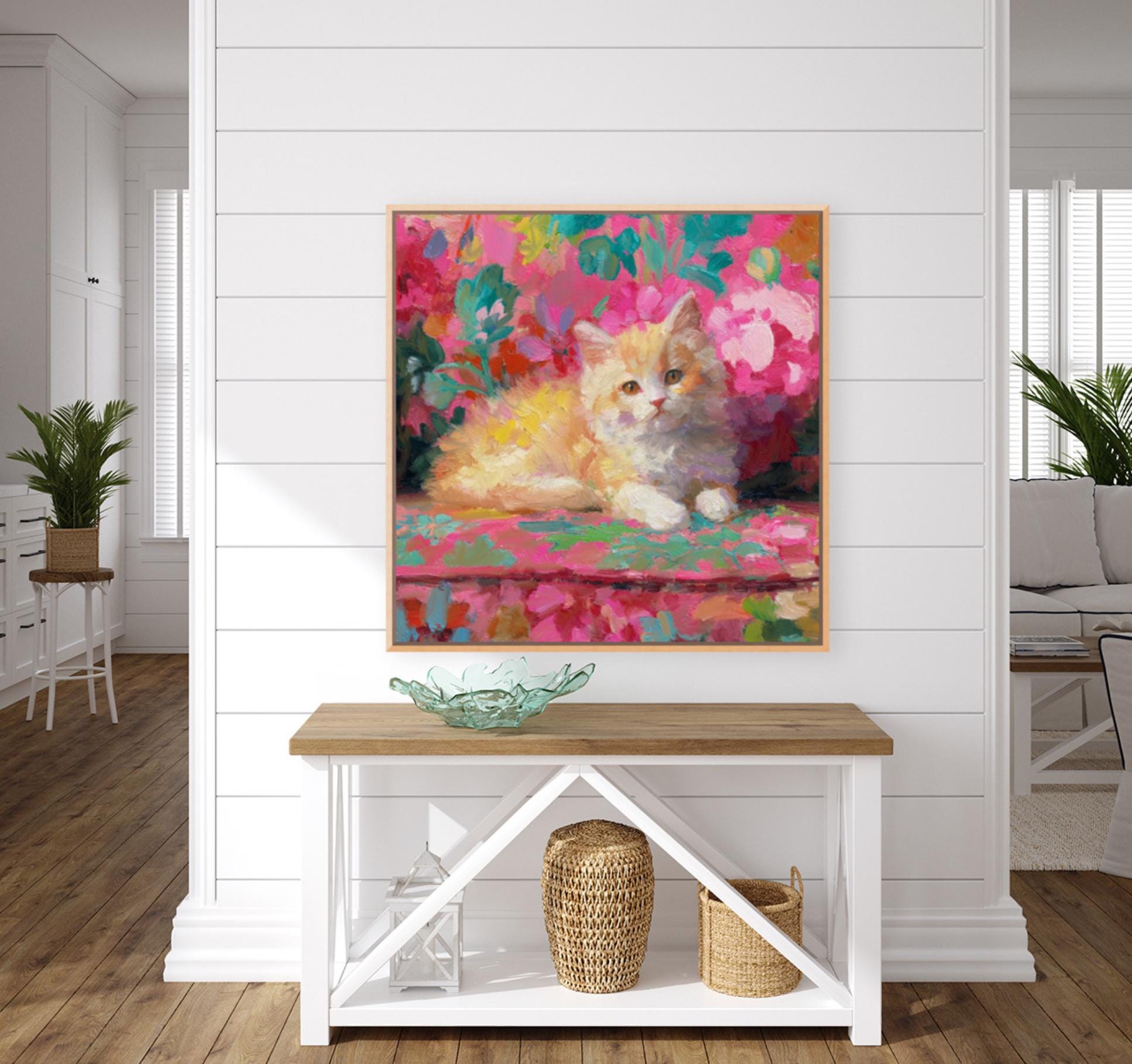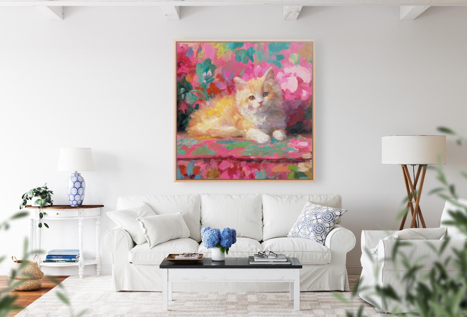 Bring timeless Palm Beach charm to your home with this preppy cat tea art print. A black-and-white kitten lounges beside a vintage floral teacup, surrounded by vibrant chinoiserie blooms. This piece blends grandmillennial elegance with whimsical warmth—perfect for cat lovers, tea lovers, or anyone who adores cheerful interiors.