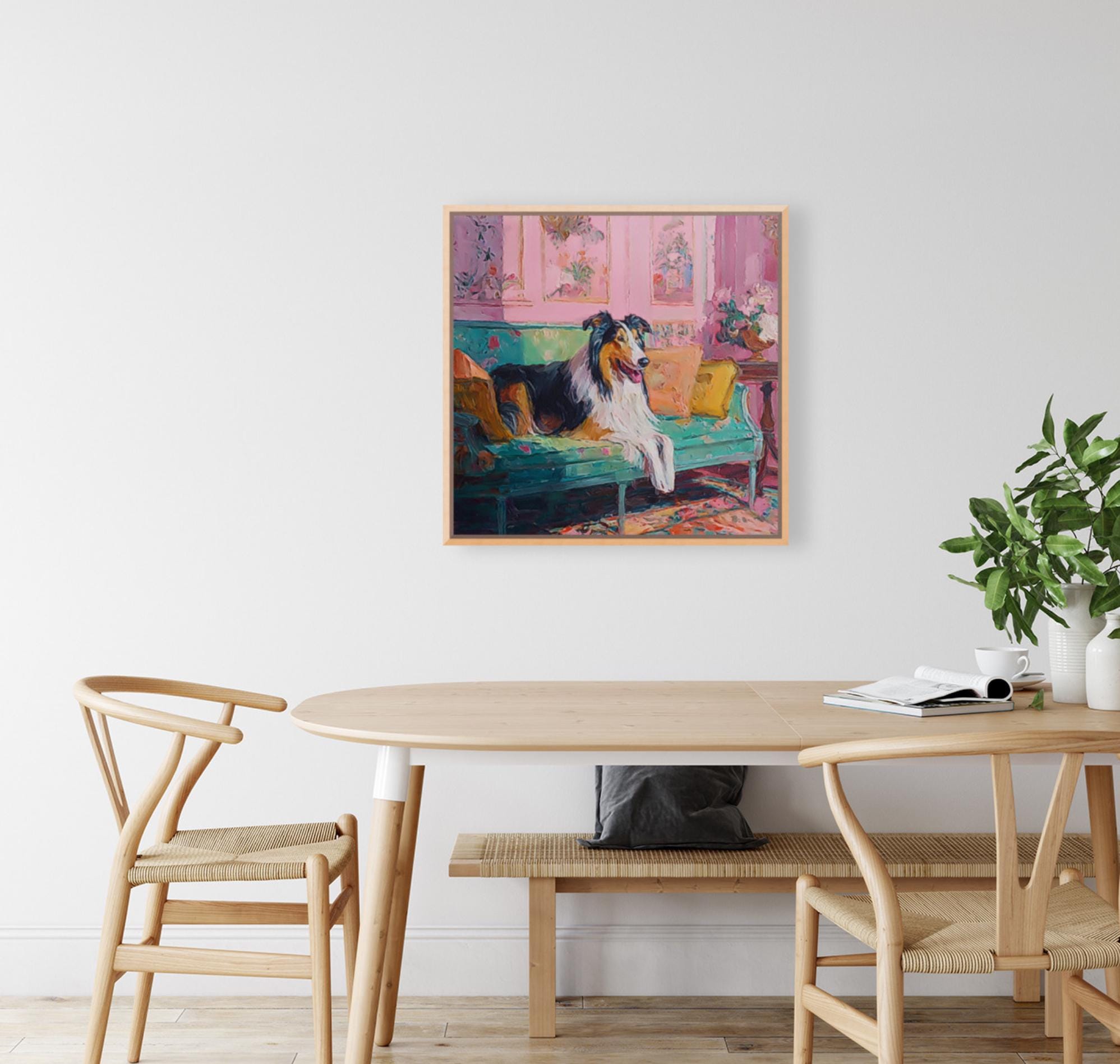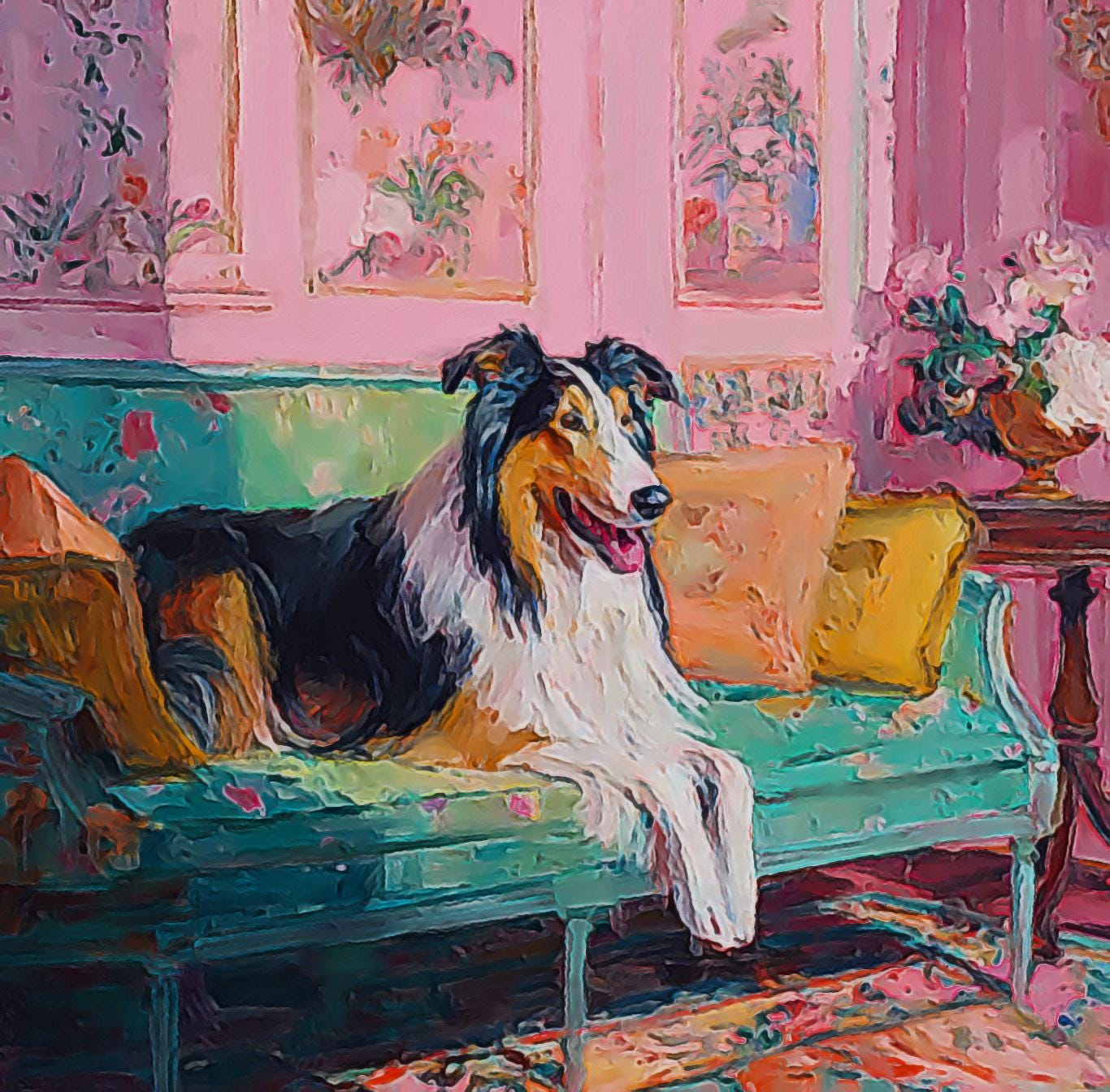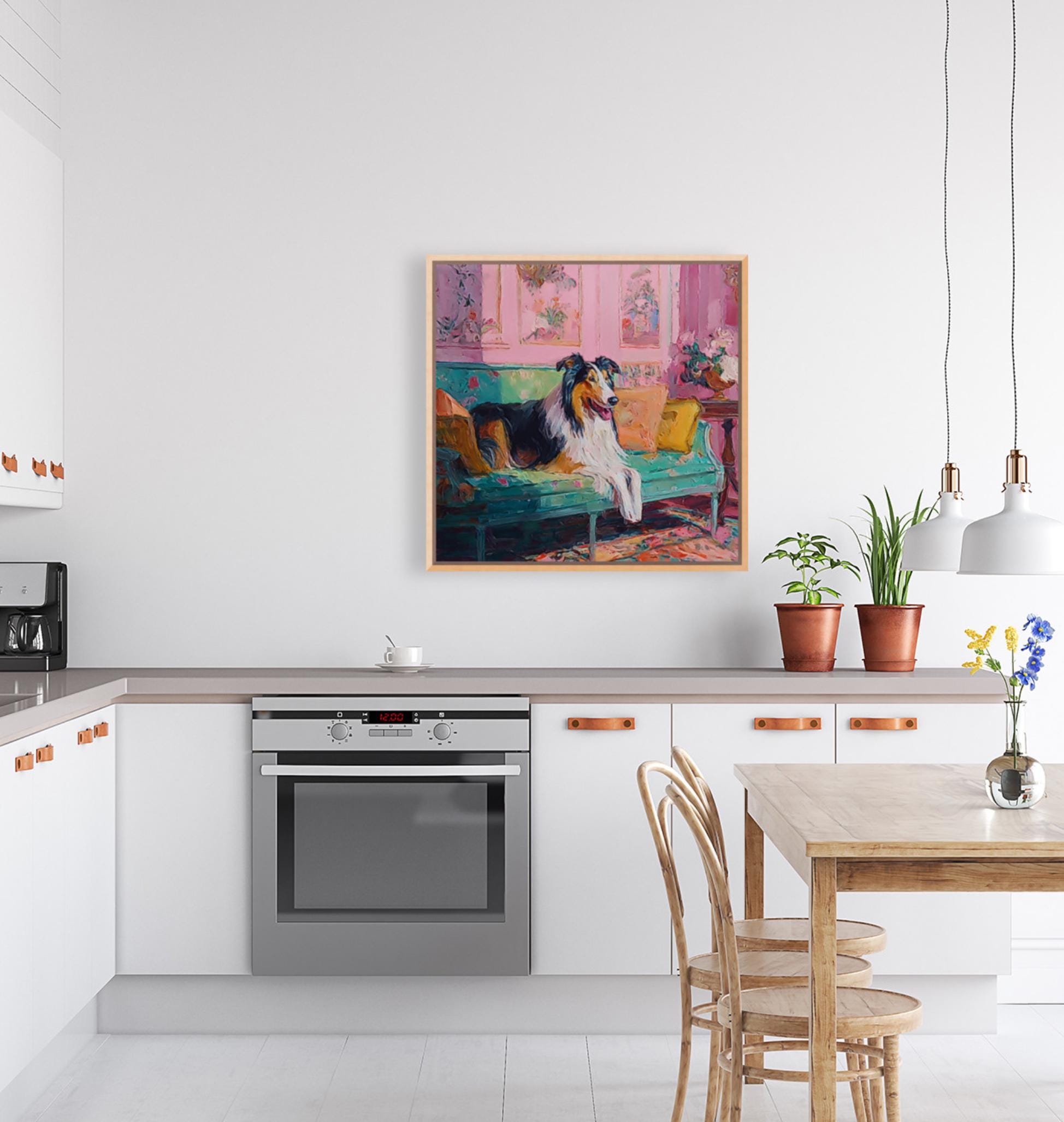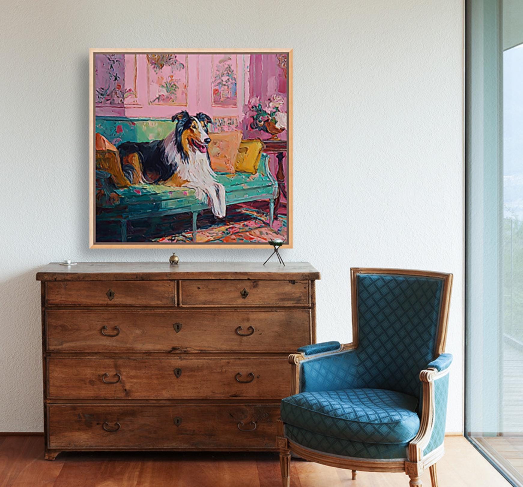 Grandmillennial art, Collie in pink and green room, whimsical Labrador art