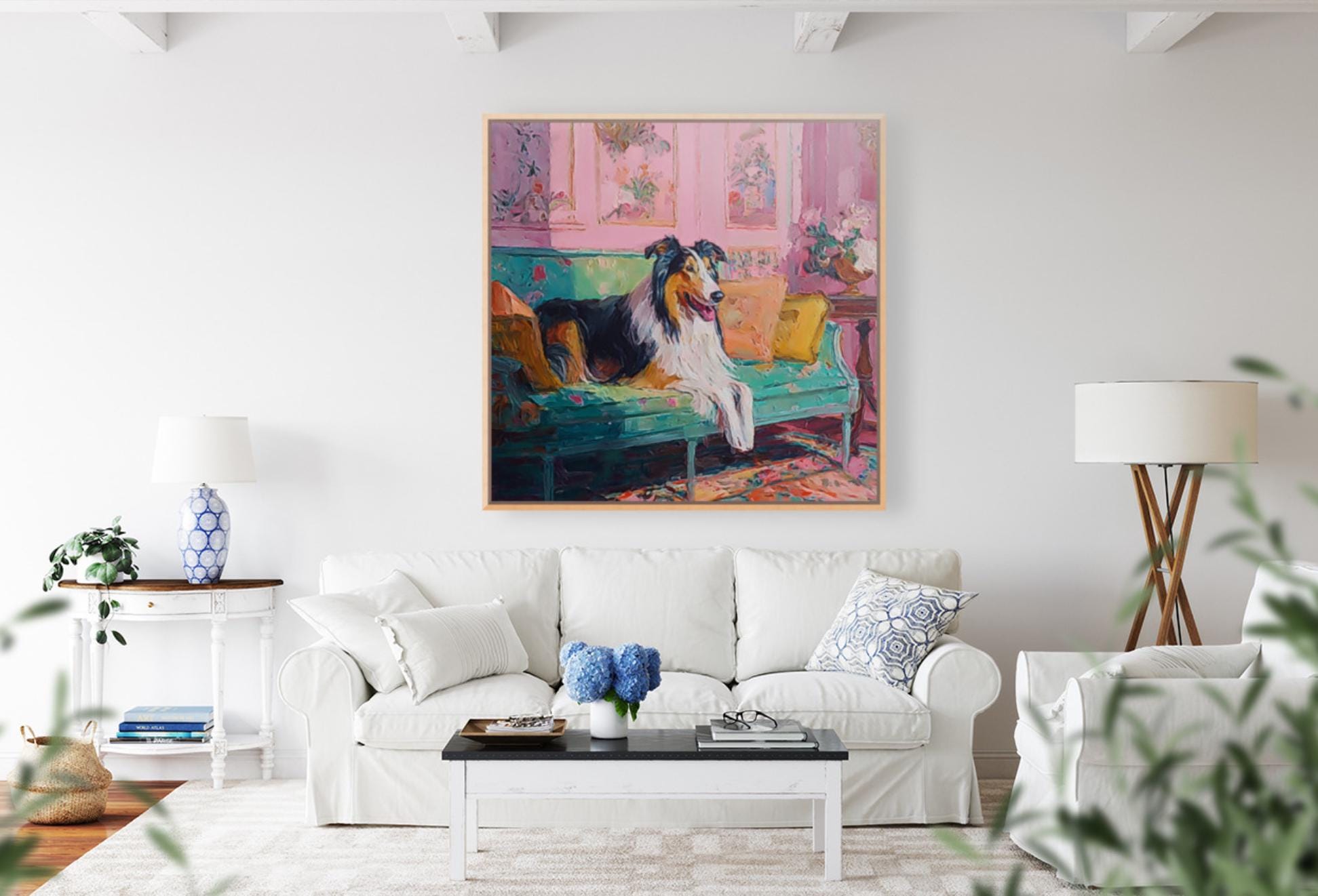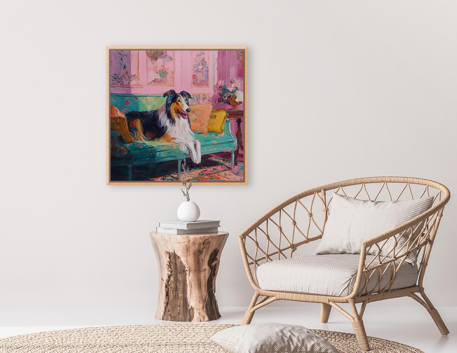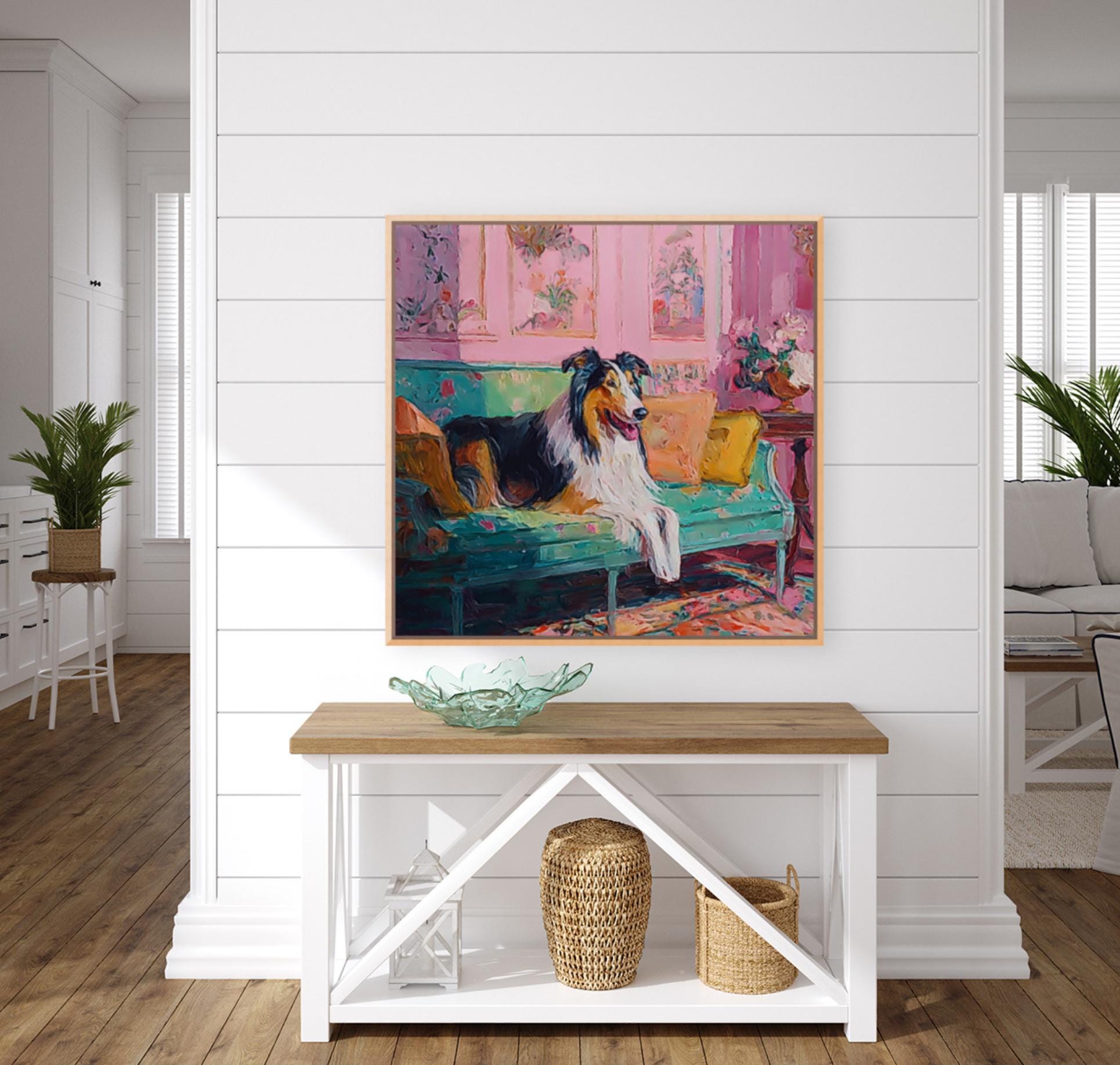 Grandmillennial art, Collie in pink and green room, whimsical Labrador art