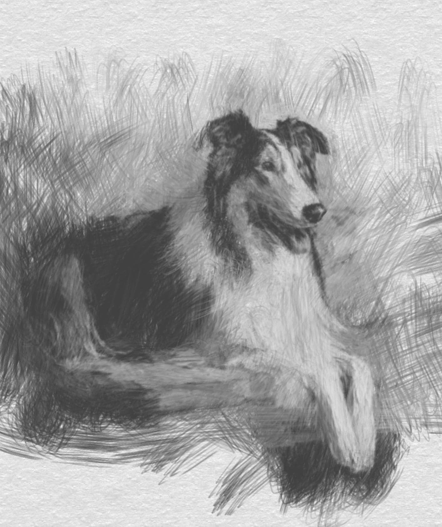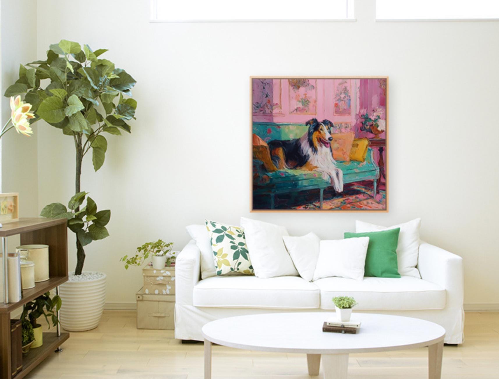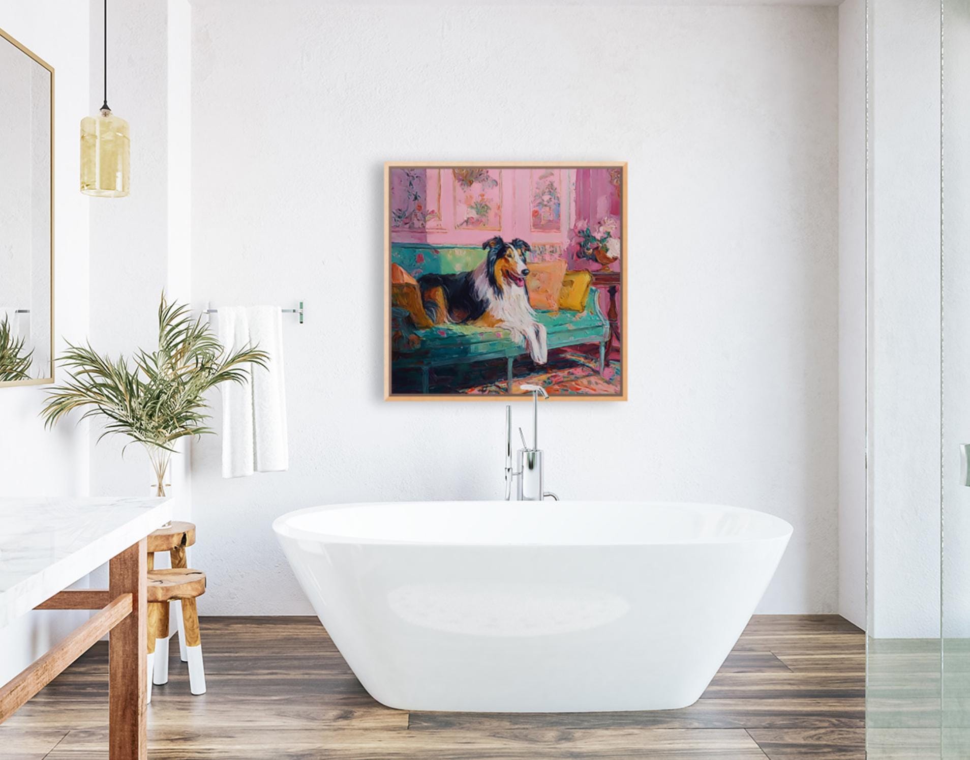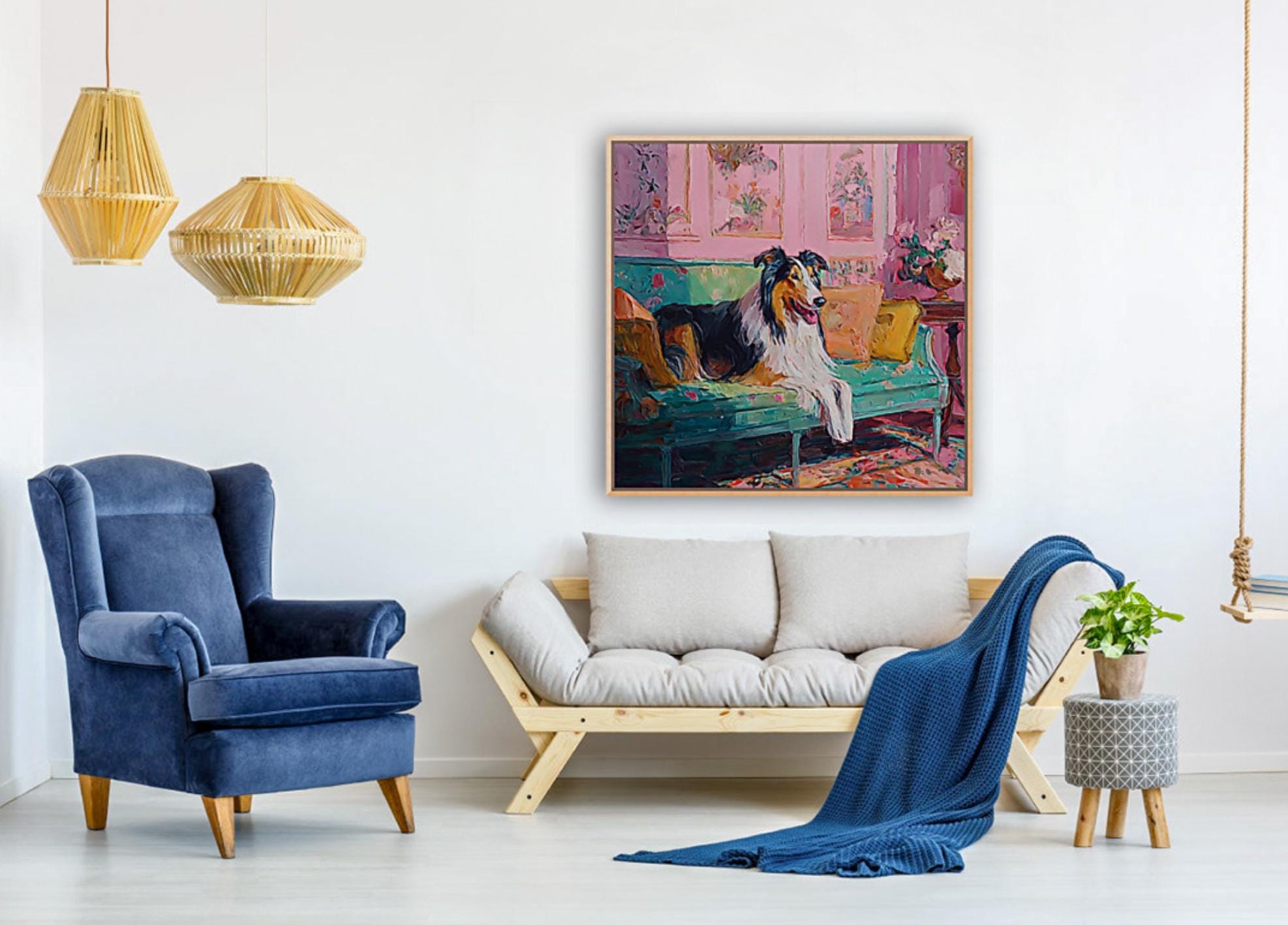 Grandmillennial art, Collie in pink and green room, whimsical Labrador art