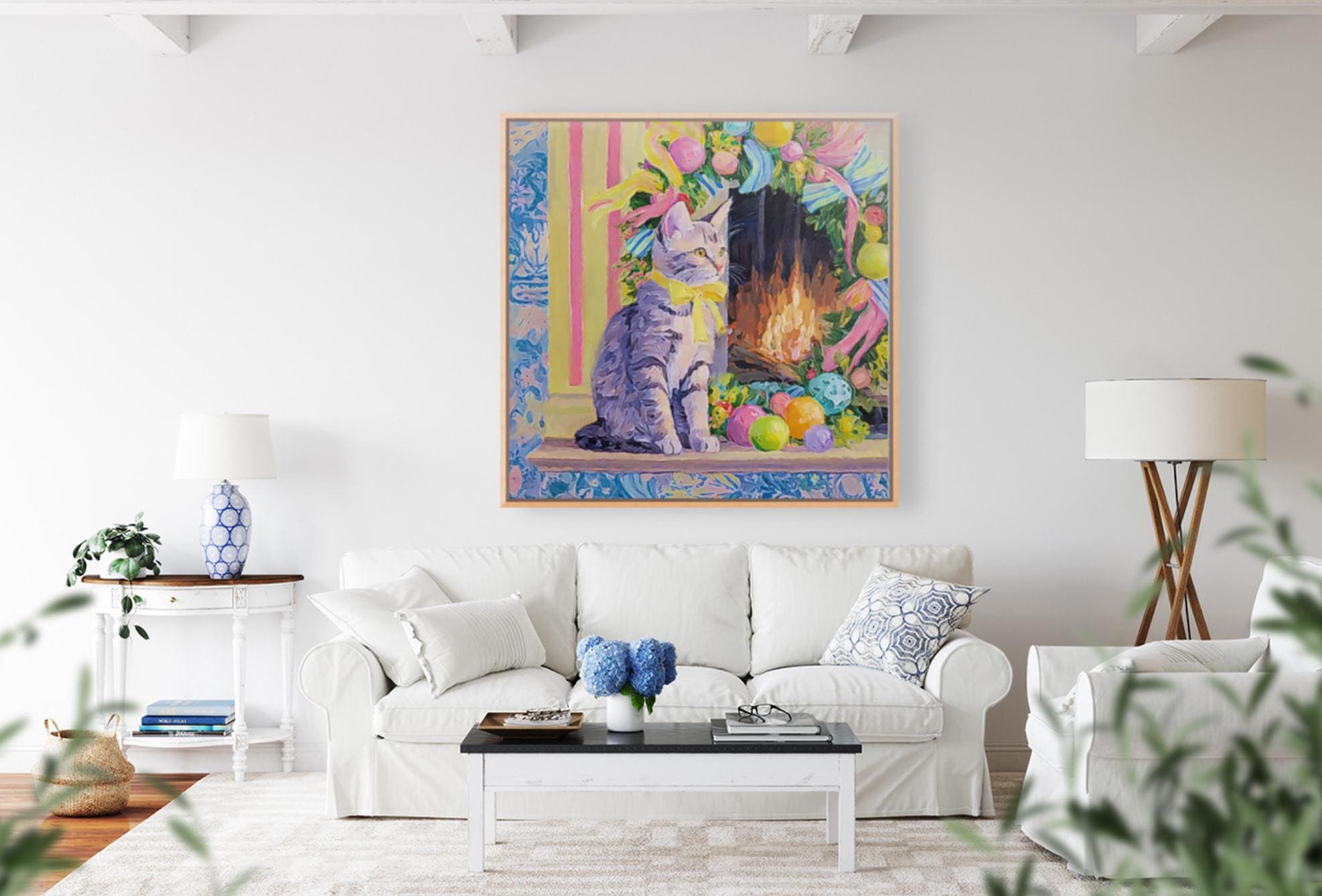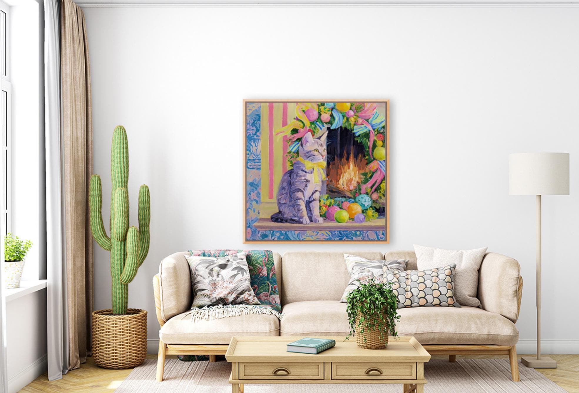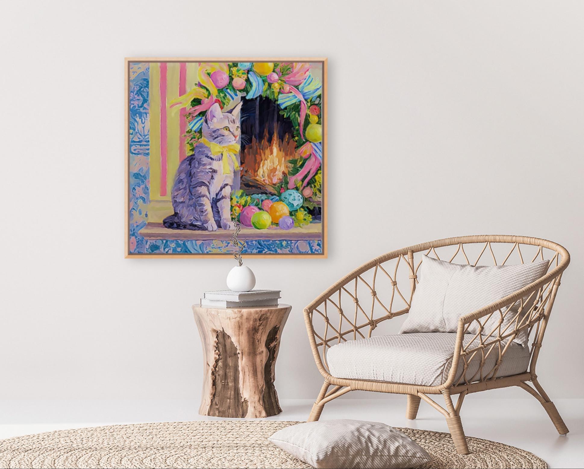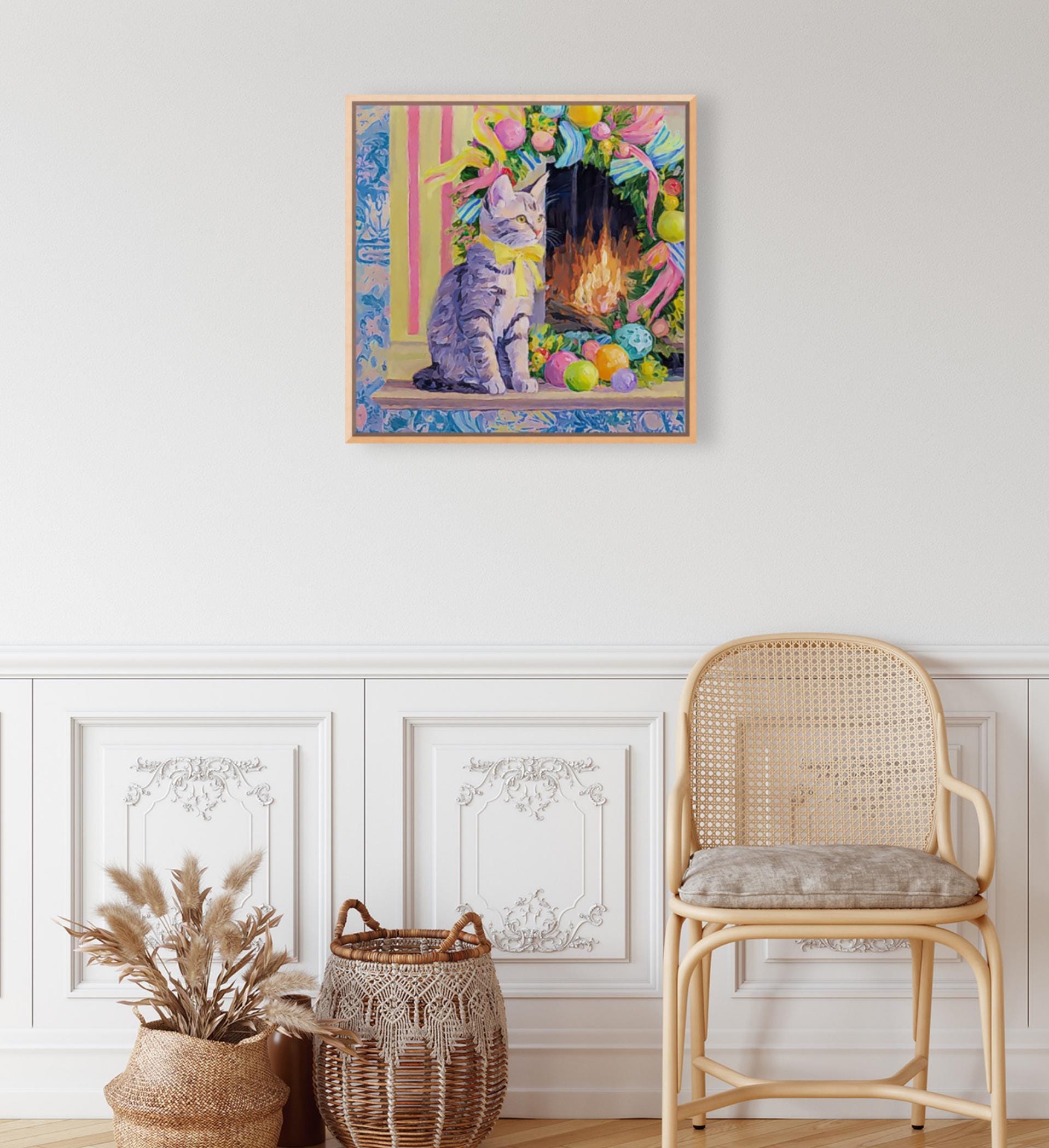 Grandmillennial art, Christmas portrait of a tabby cat, whimsical painting