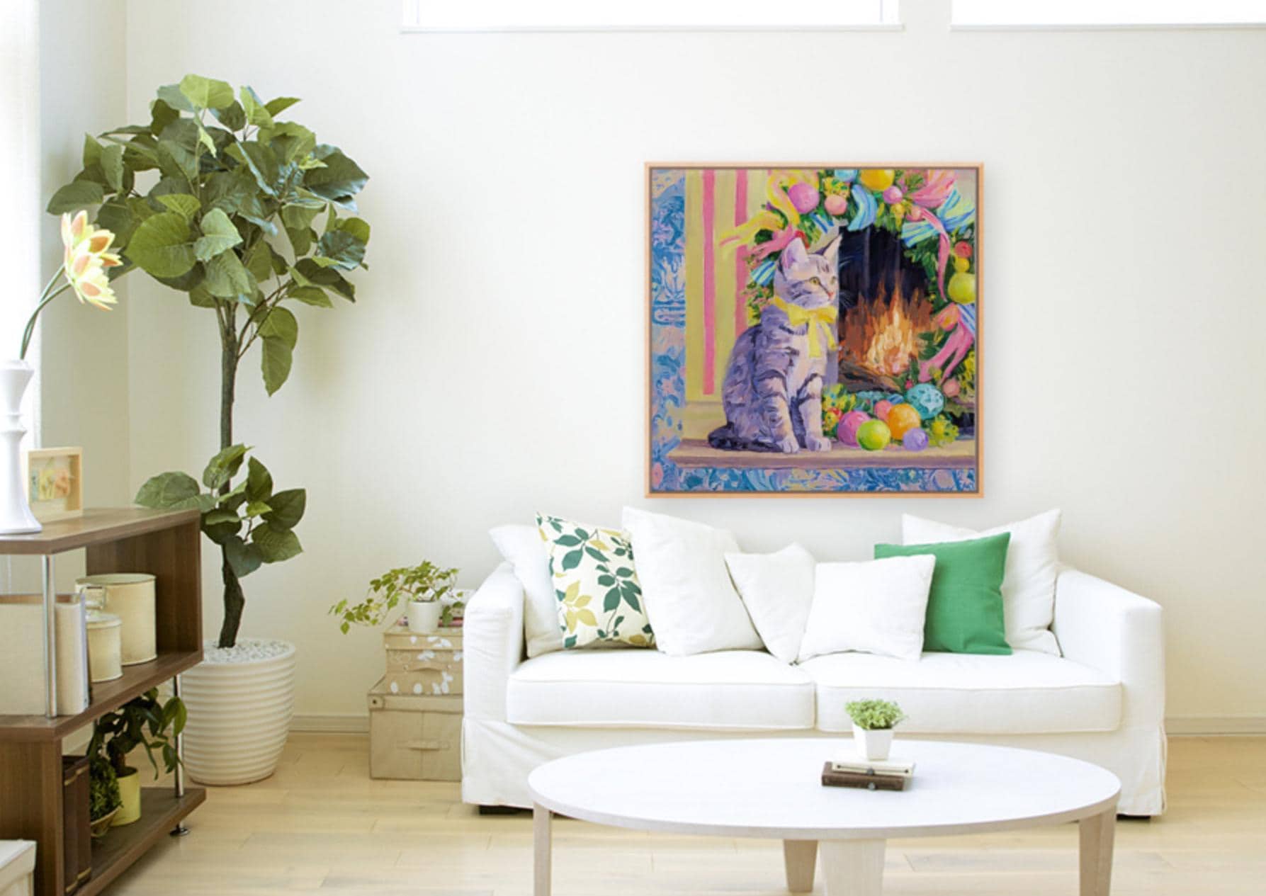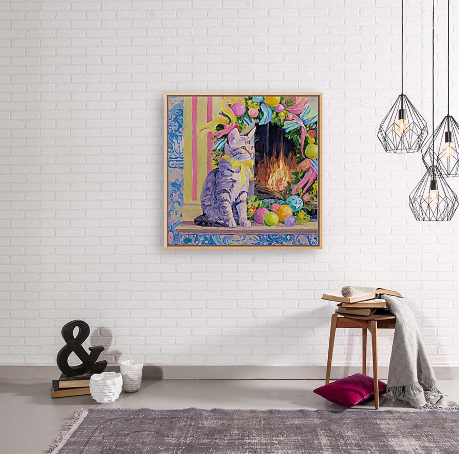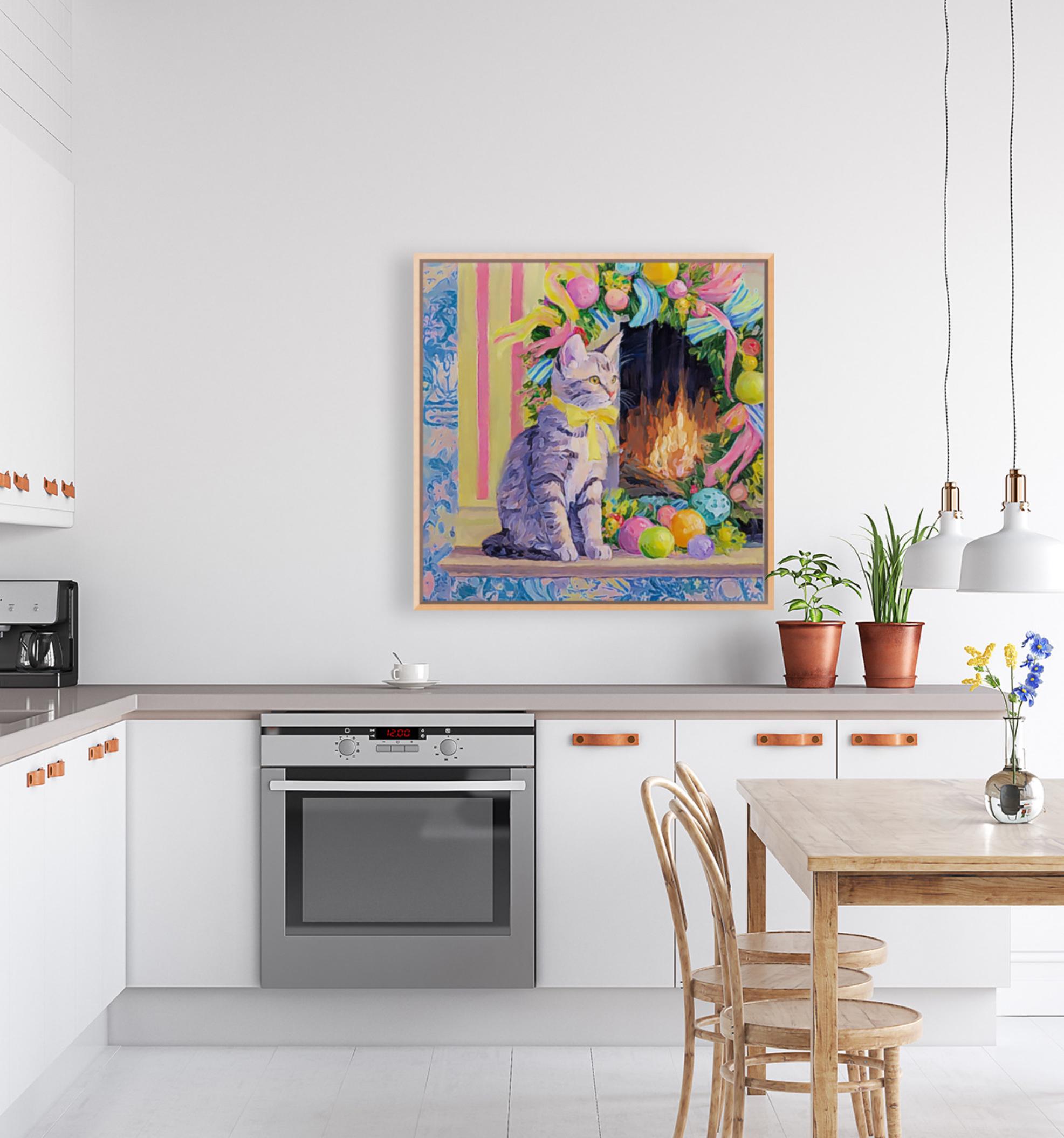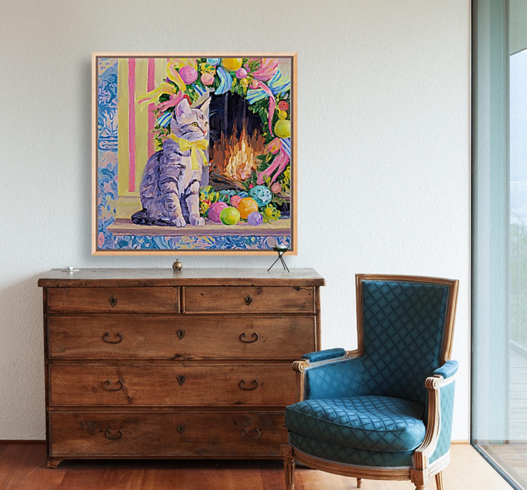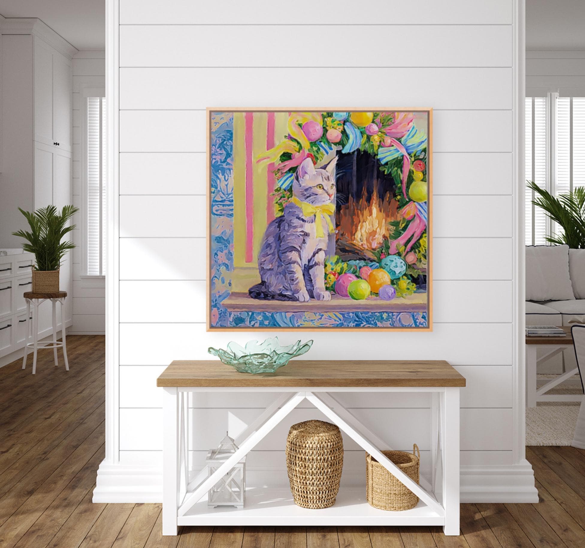 Grandmillennial art, Christmas portrait of a tabby cat, whimsical painting