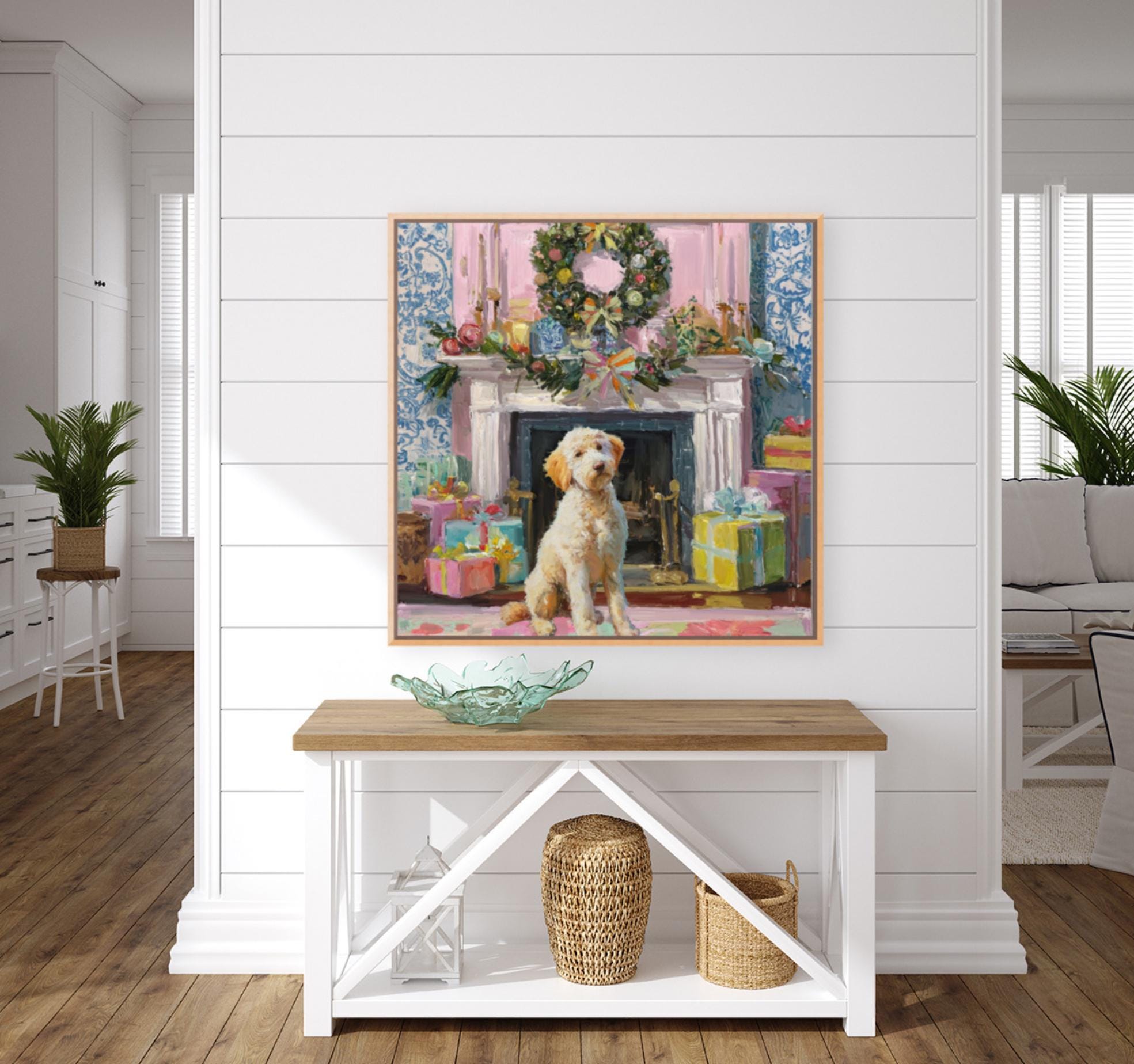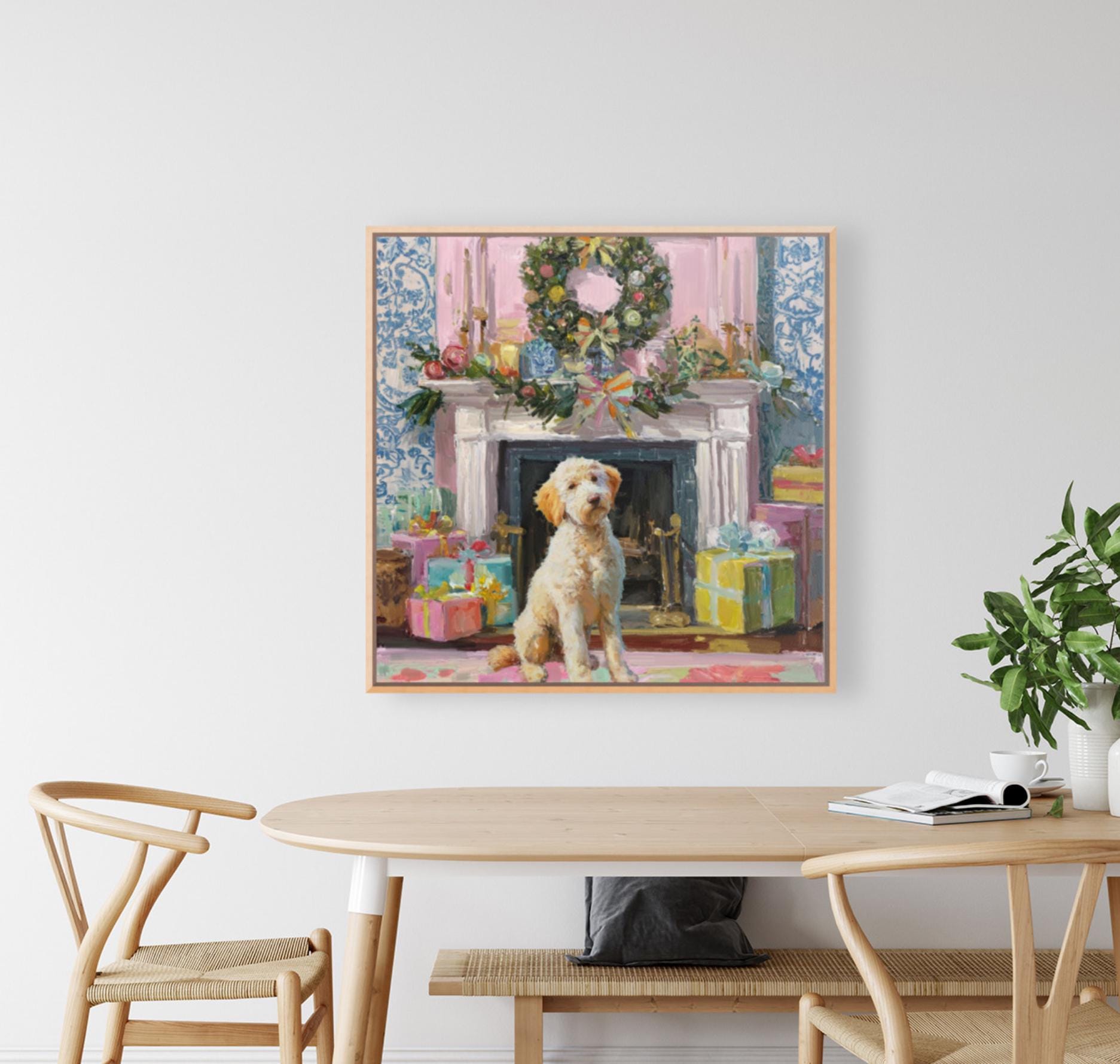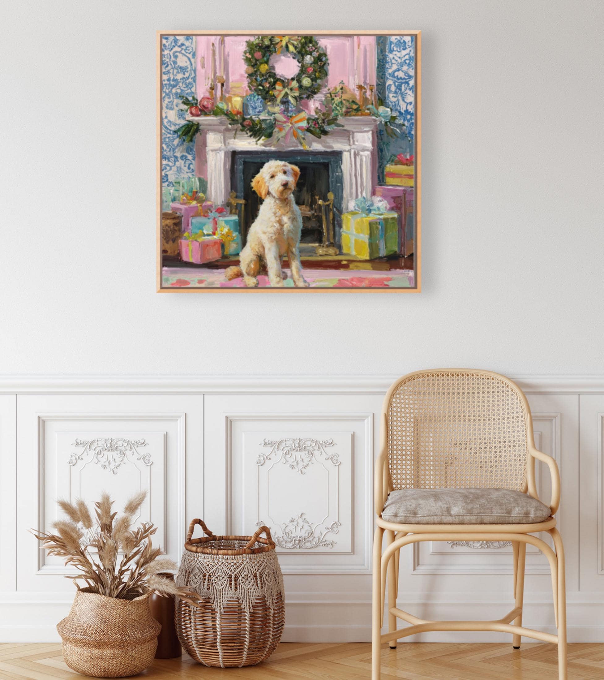 Christmas Labradoodle waiting to open a present, Christmas cheer giclee print