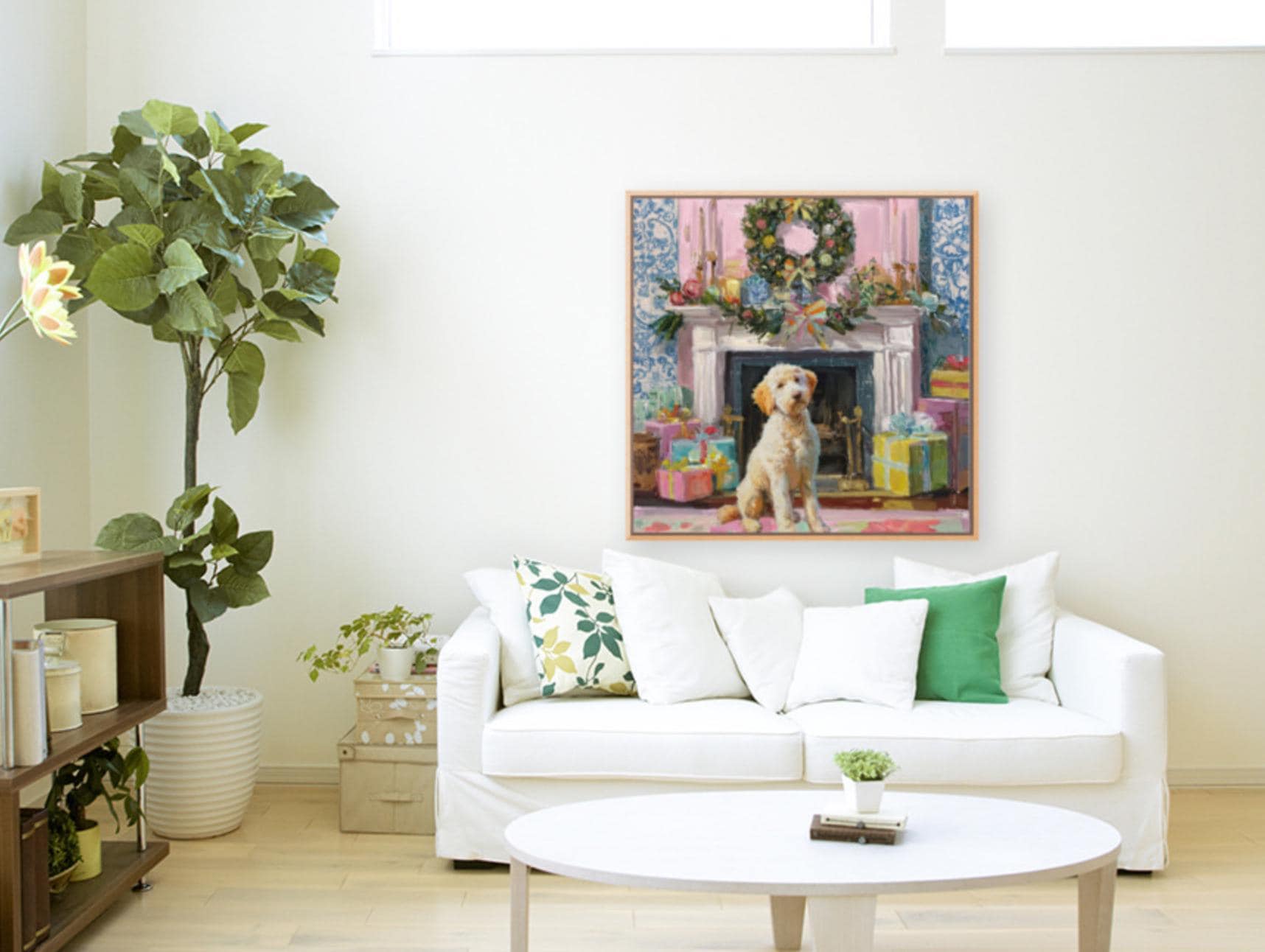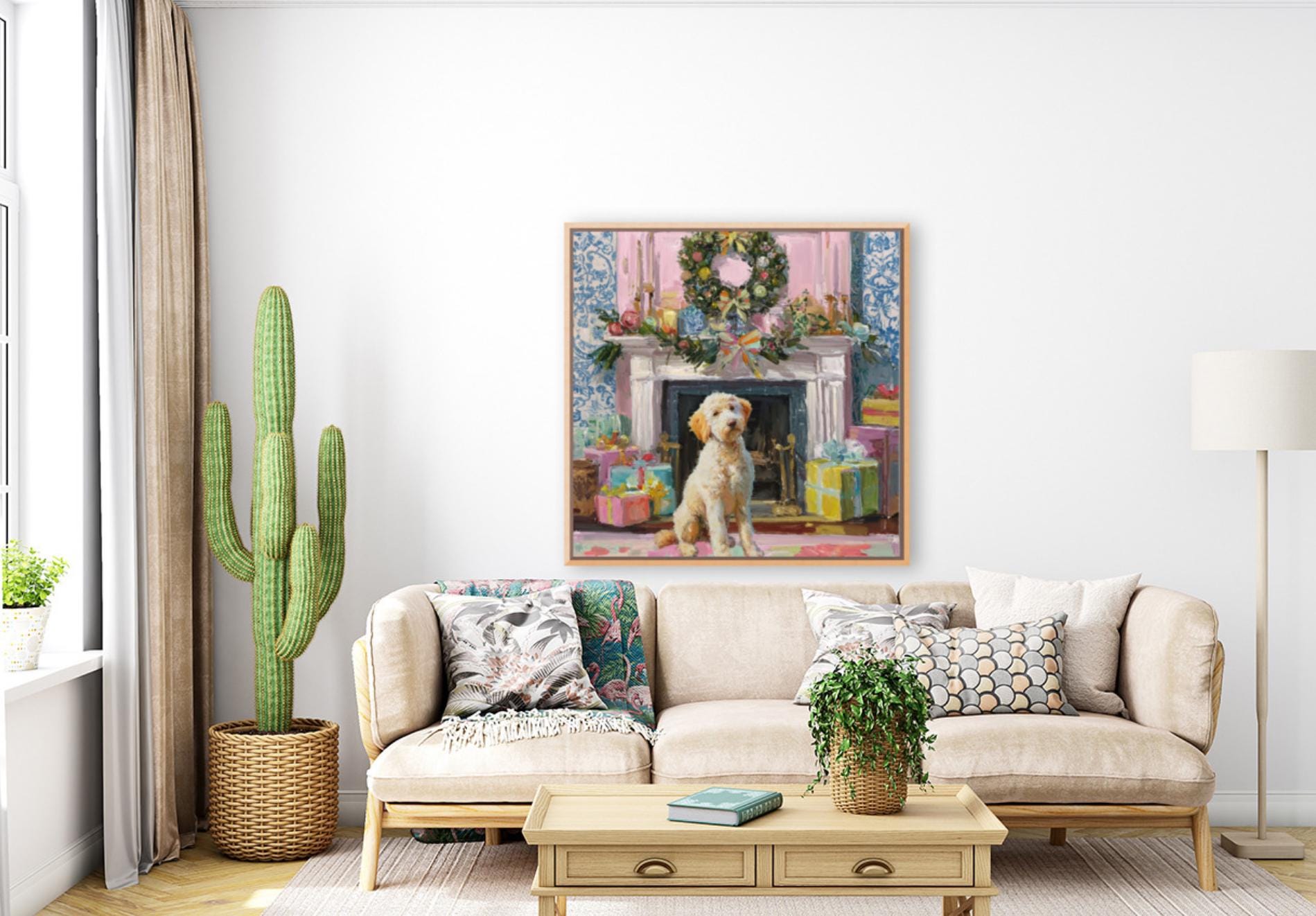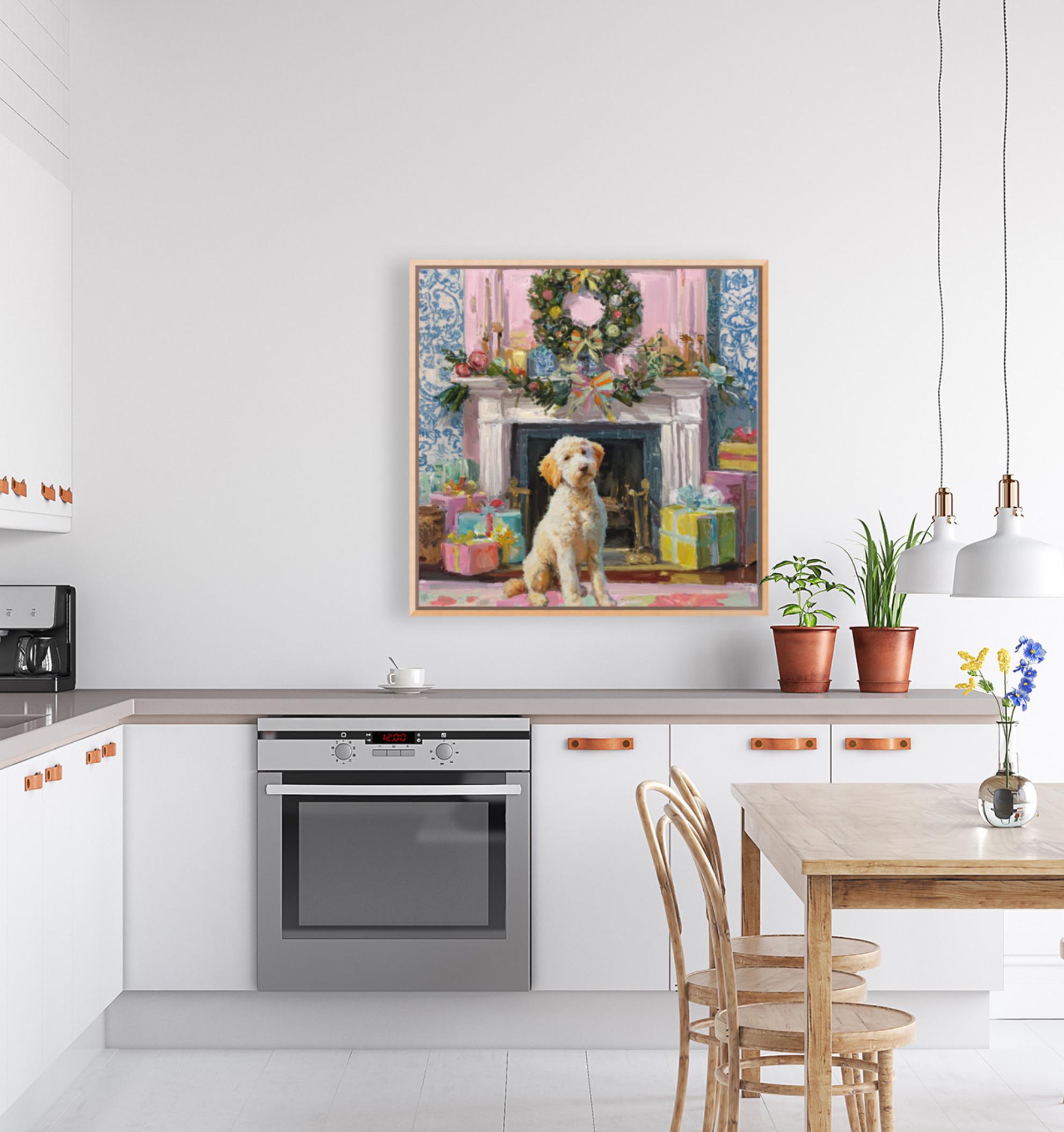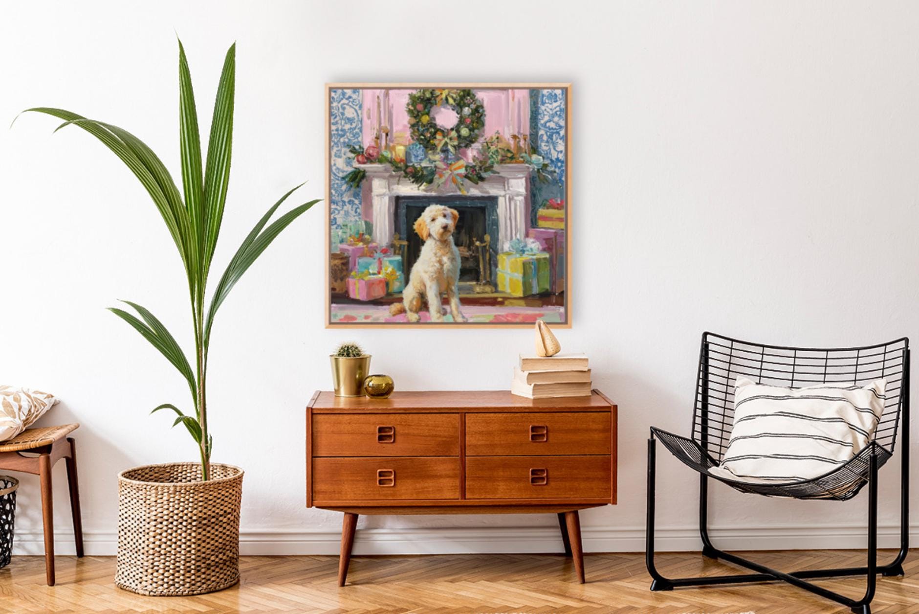 Christmas Labradoodle waiting to open a present, Christmas cheer giclee print