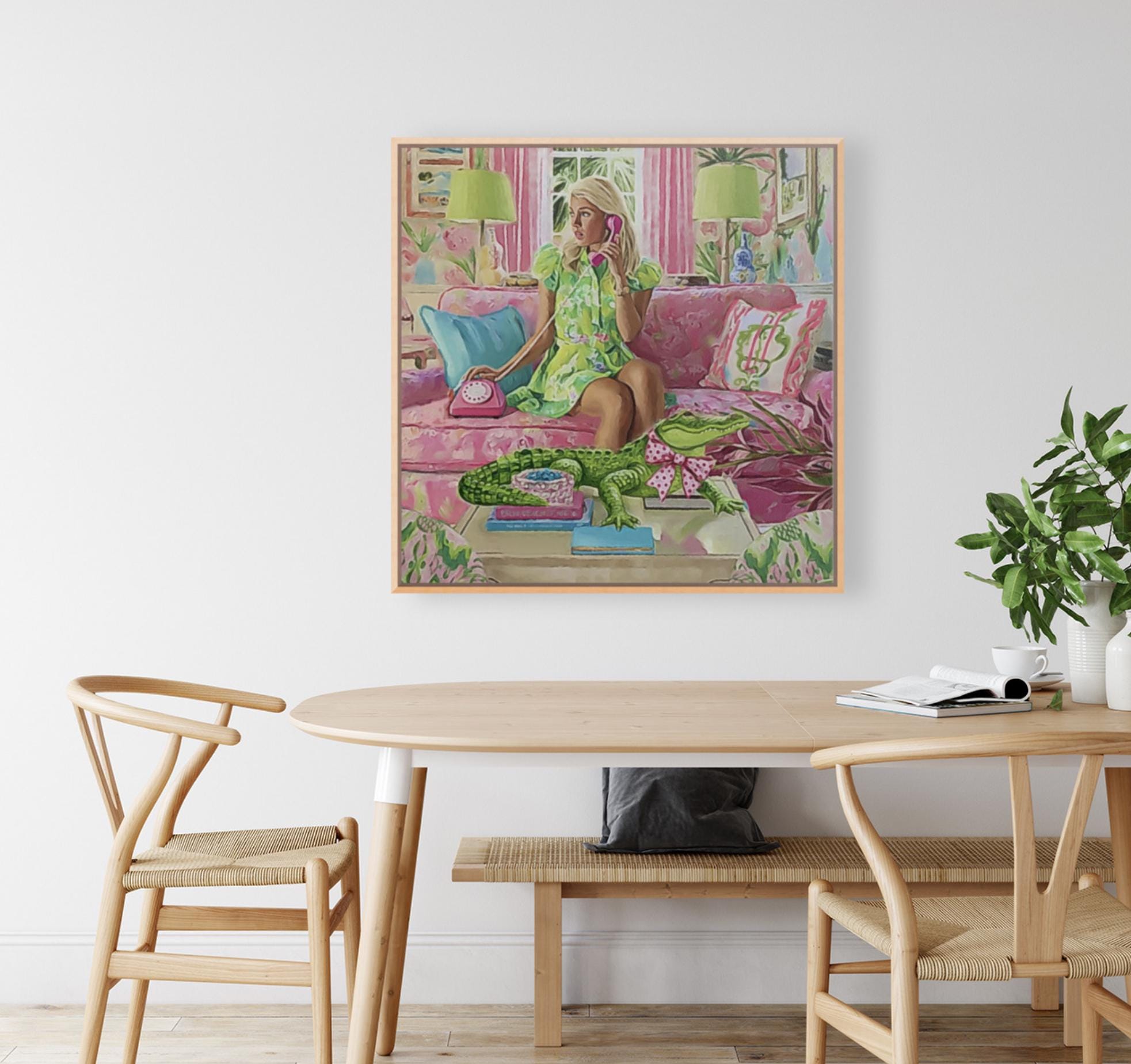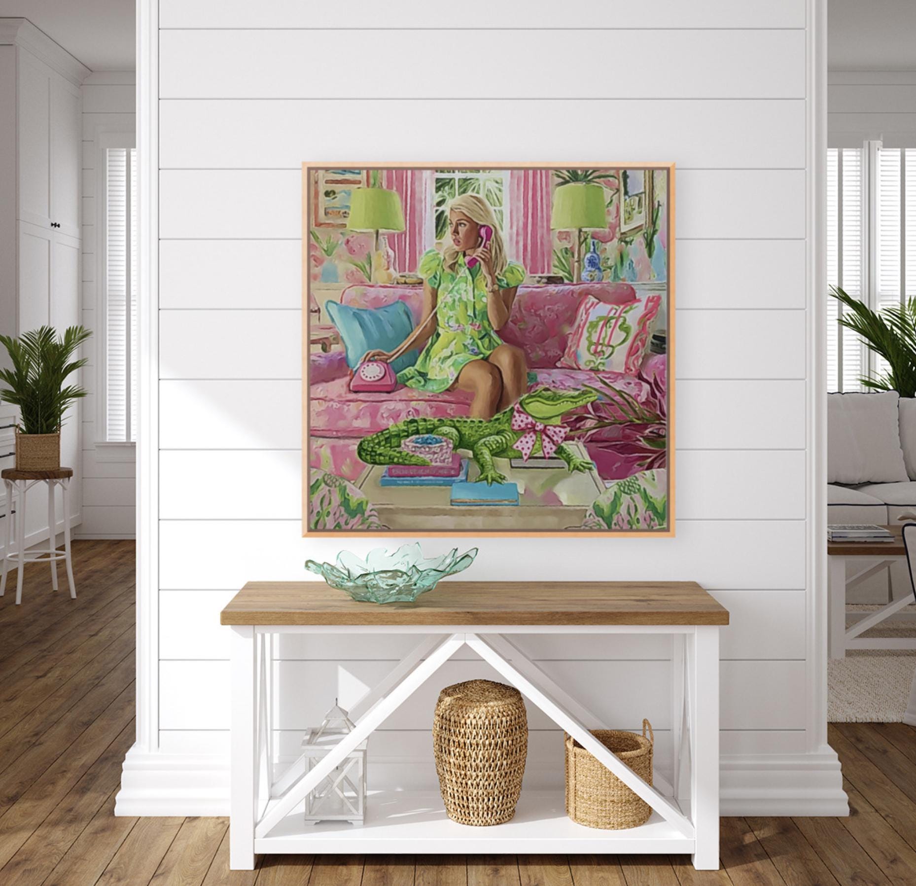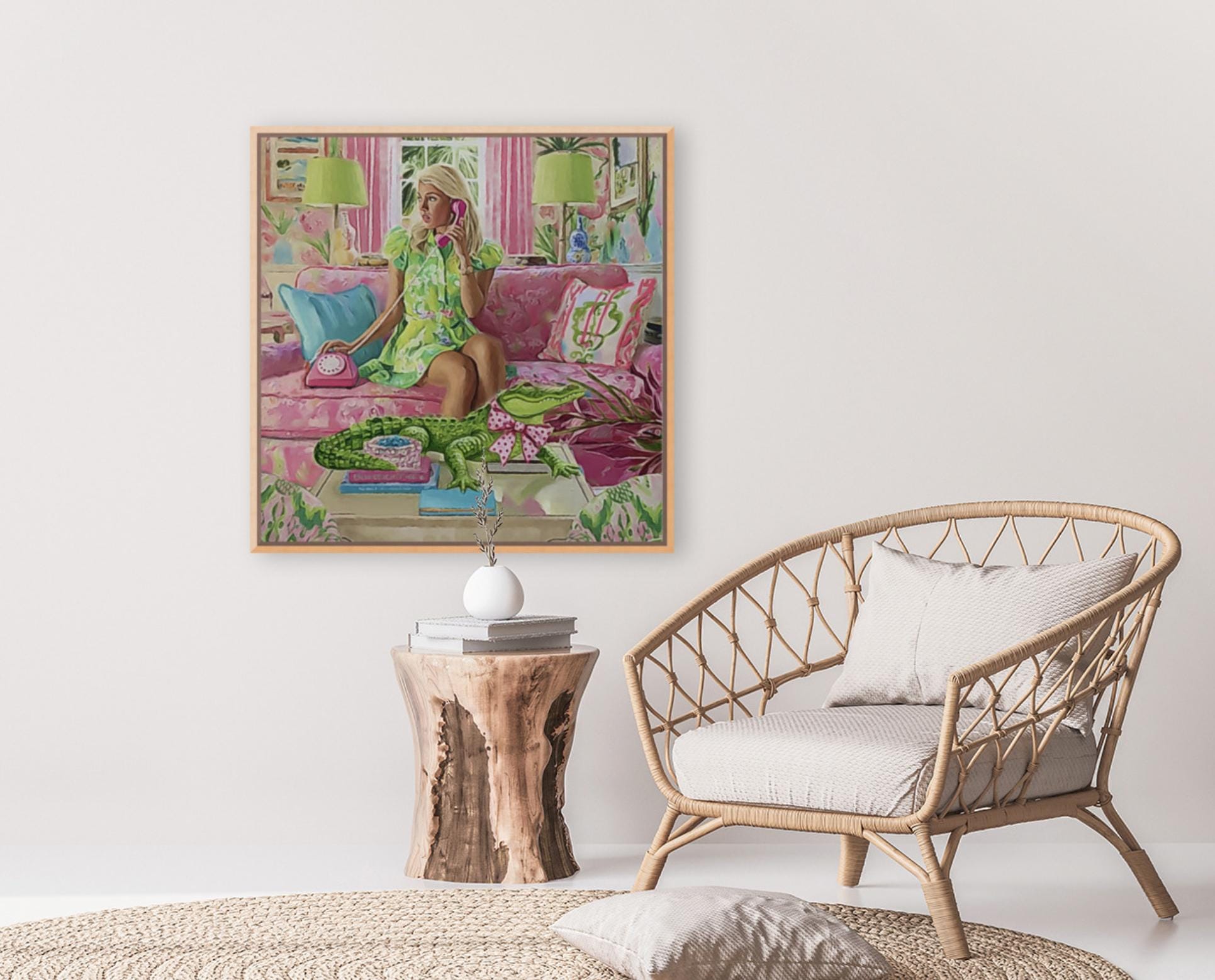 Grandmillennial art, Bow Tie gator eavesdropping in Park Royale room, whimsical fine art