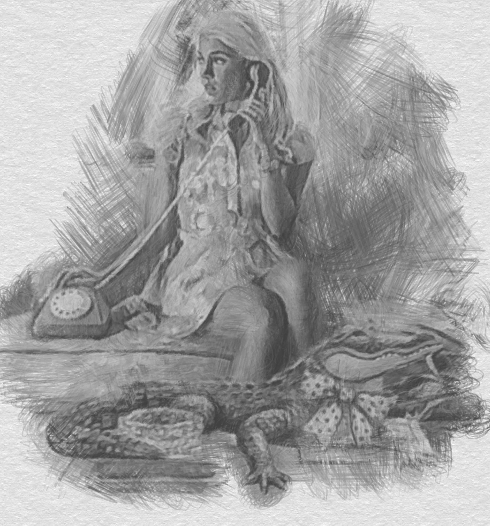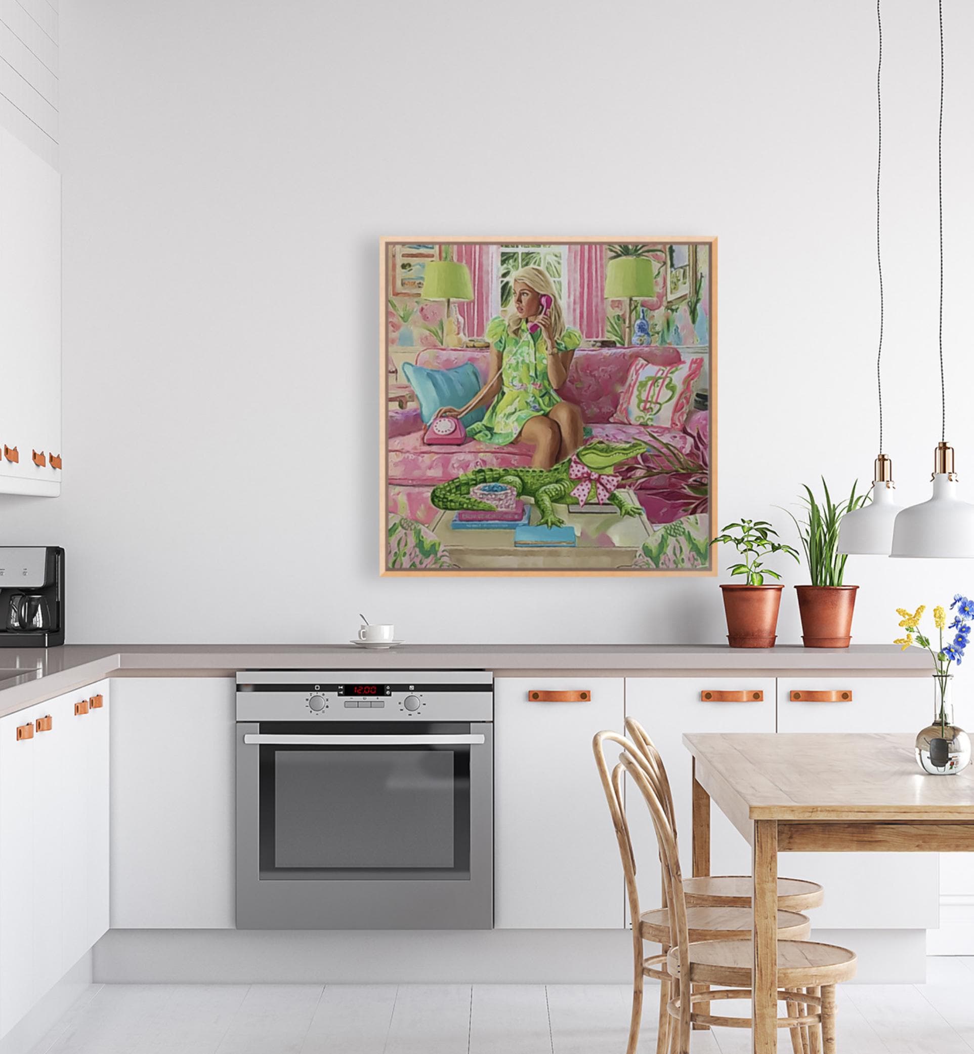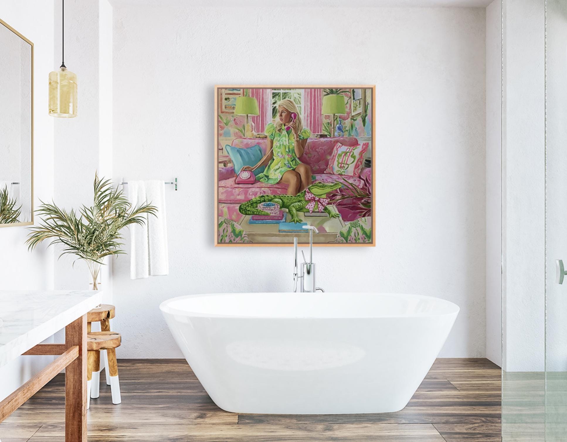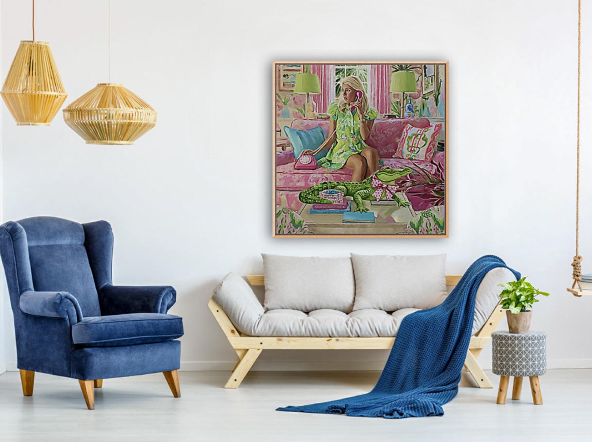 Grandmillennial art, Bow Tie gator eavesdropping in Park Royale room, whimsical fine art