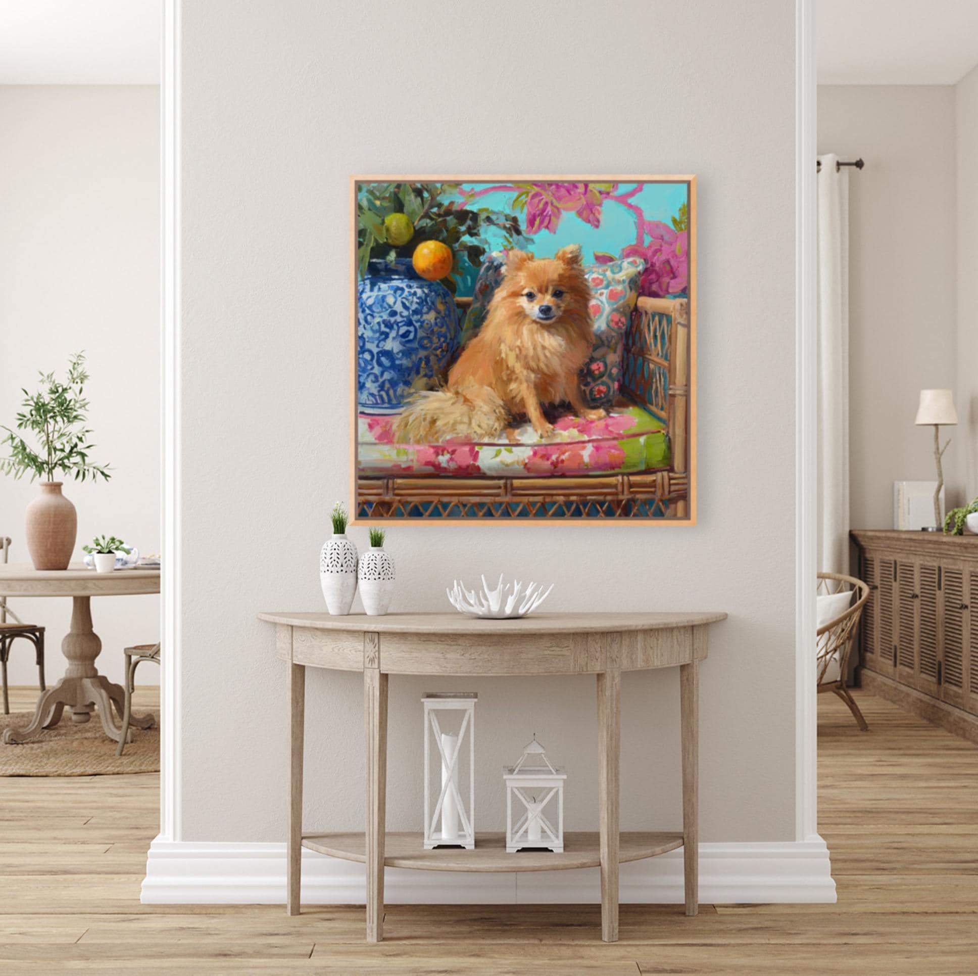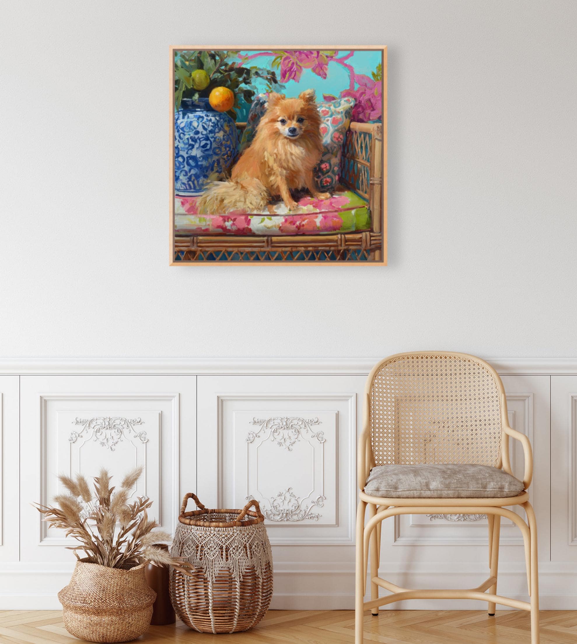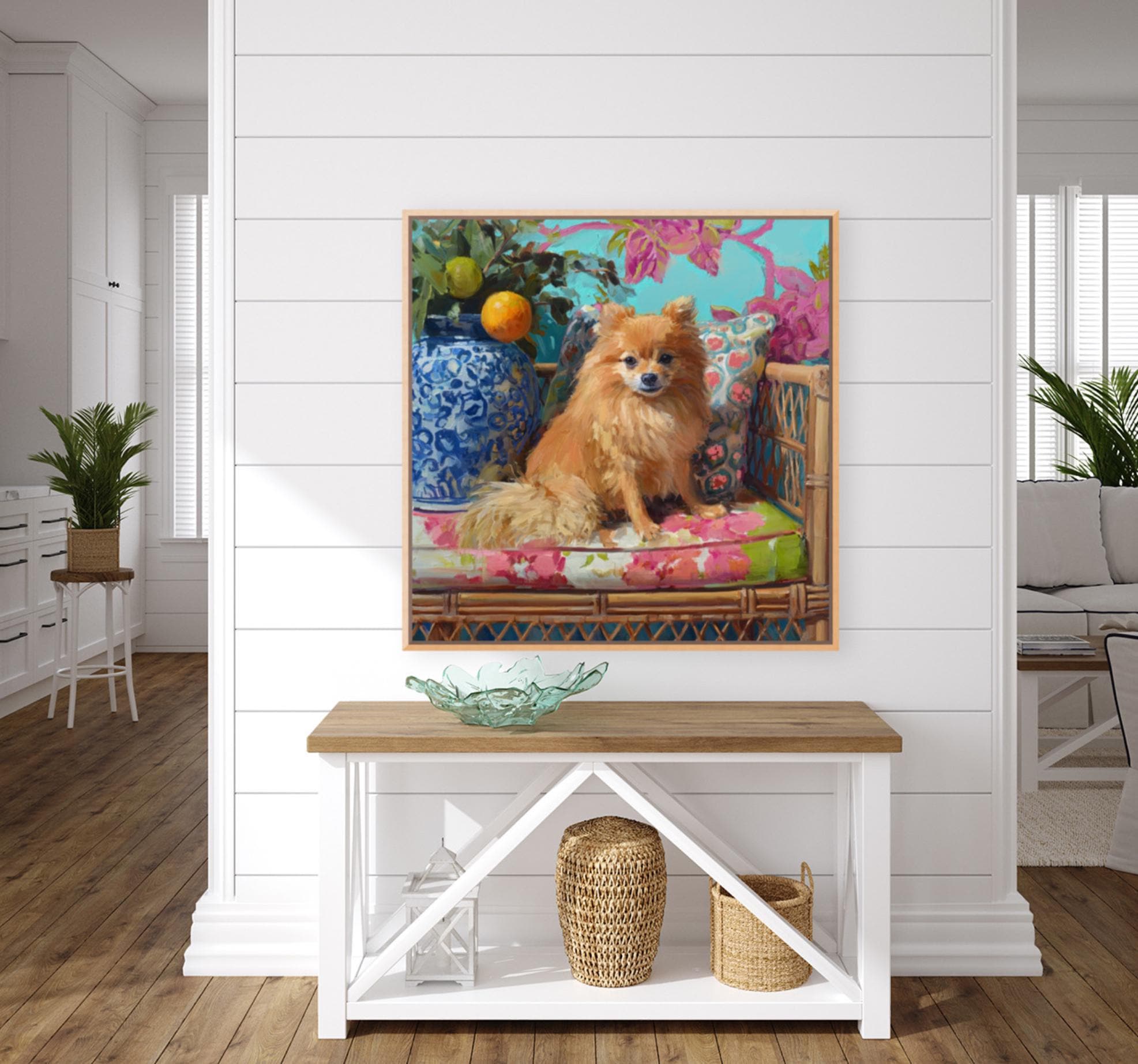 Grandmillennial art, Coastal chinoiserie dog portrait on rattan chair