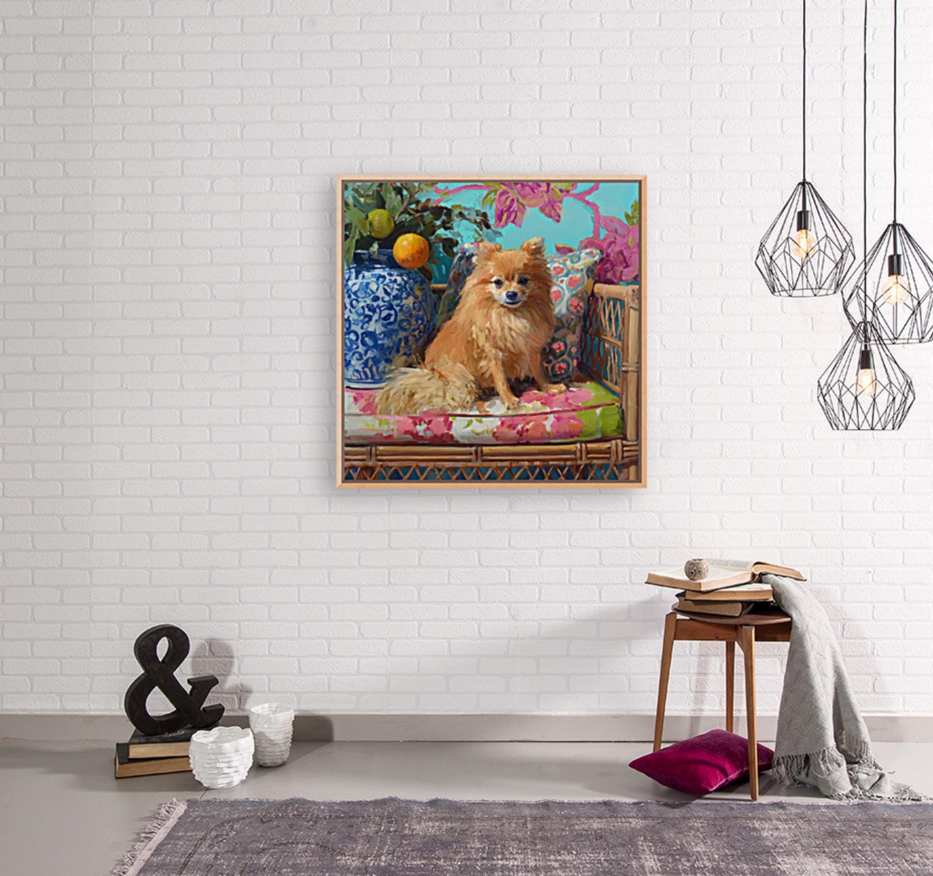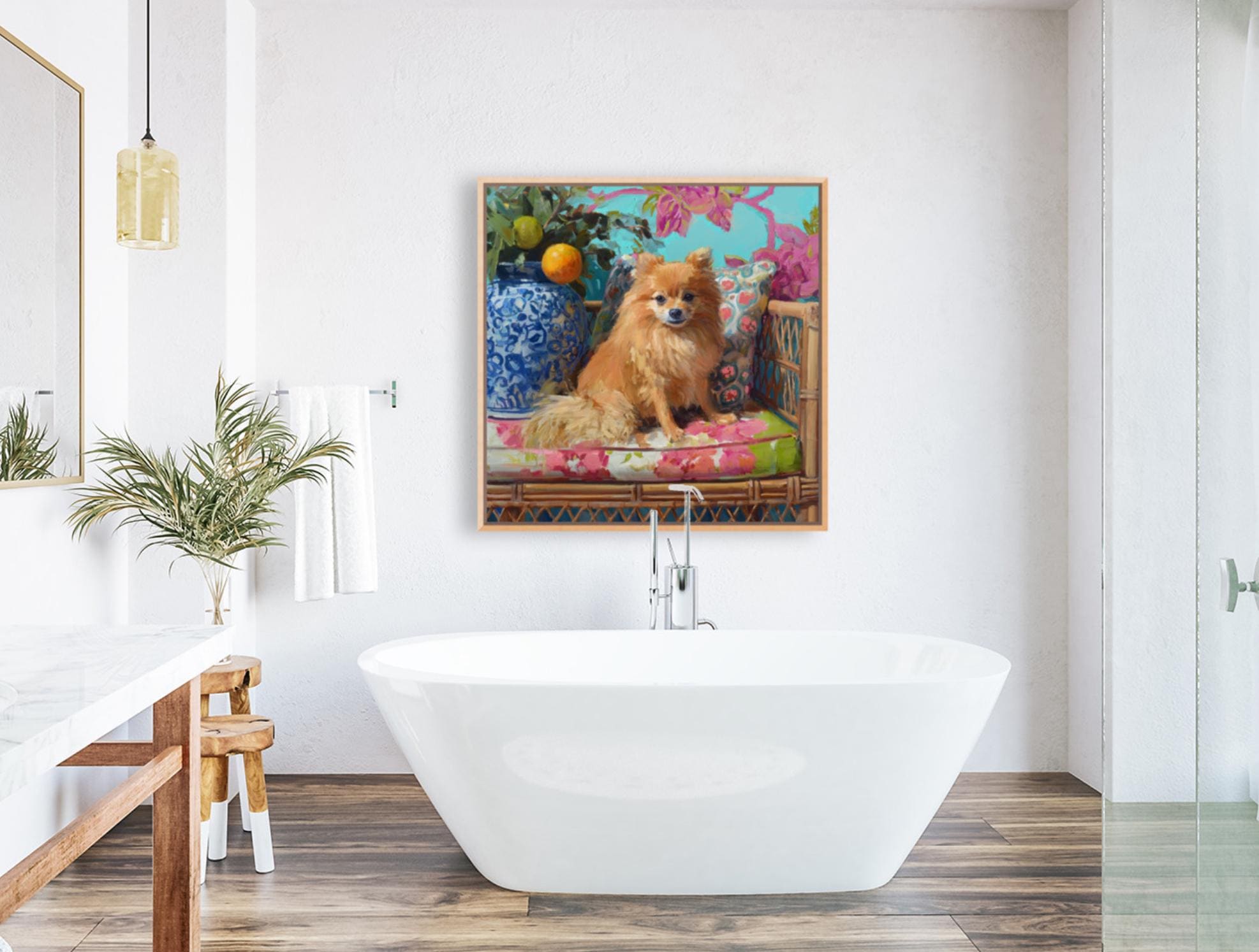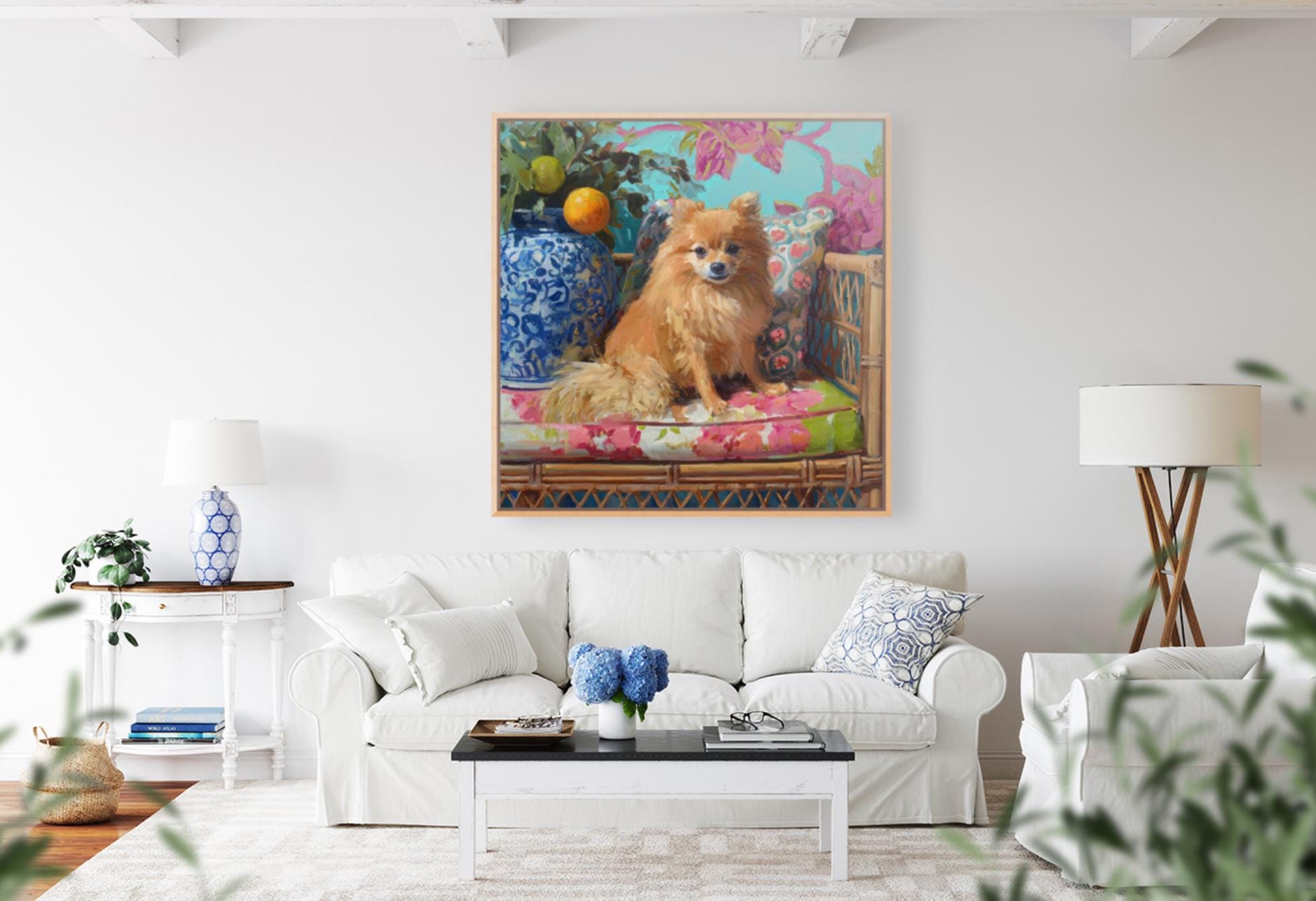 Grandmillennial art, Coastal chinoiserie dog portrait on rattan chair