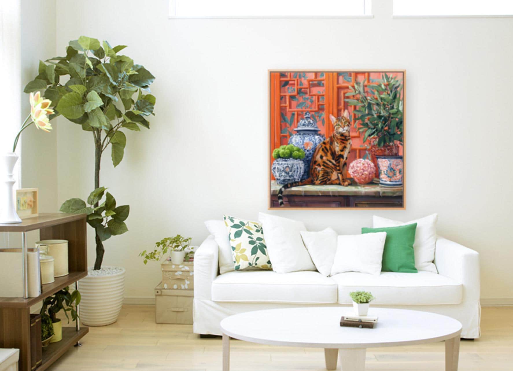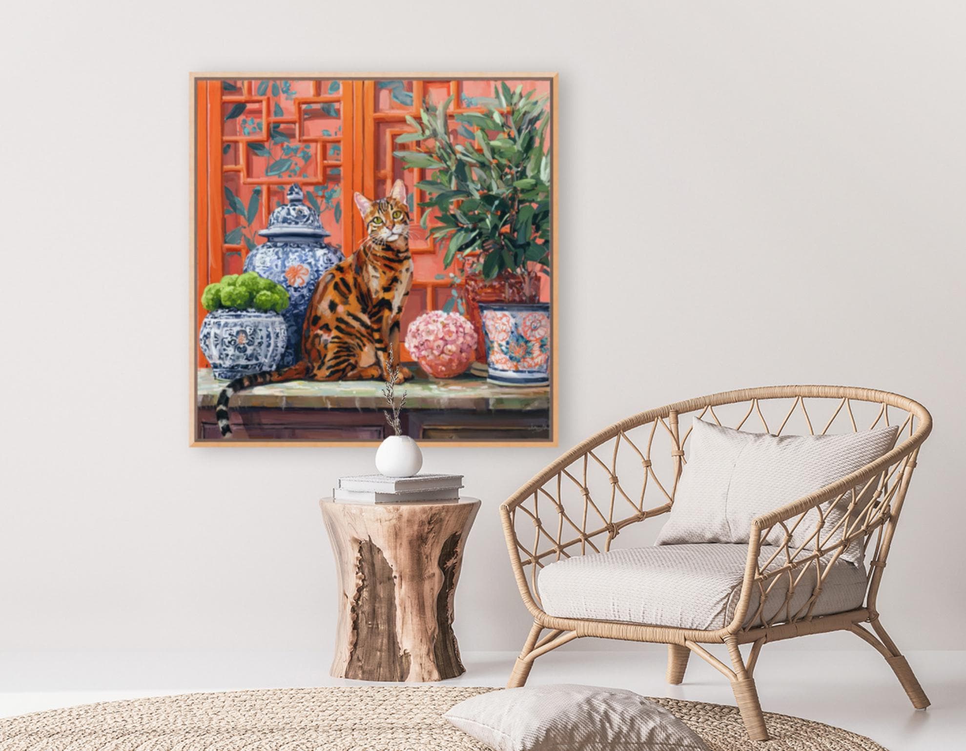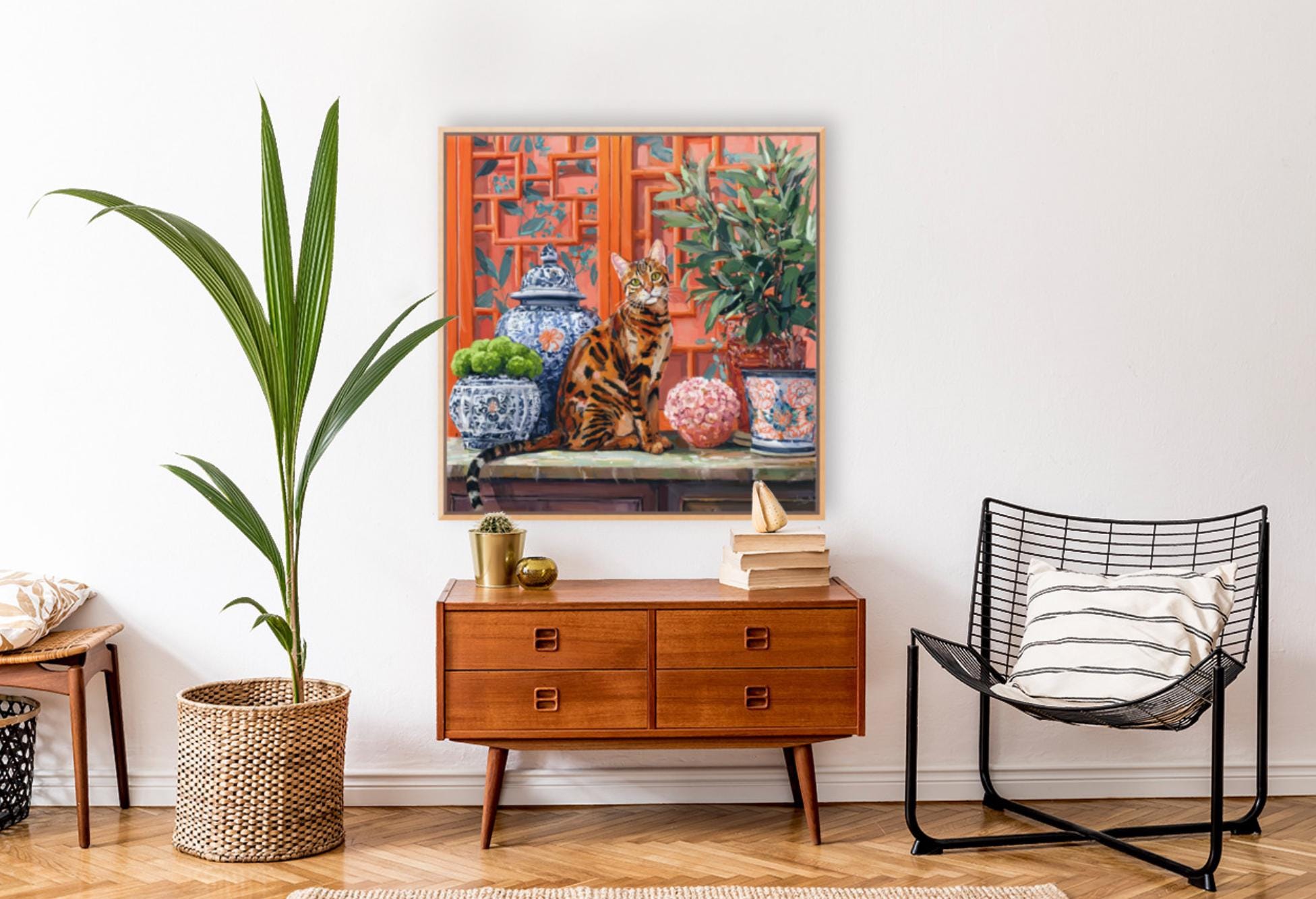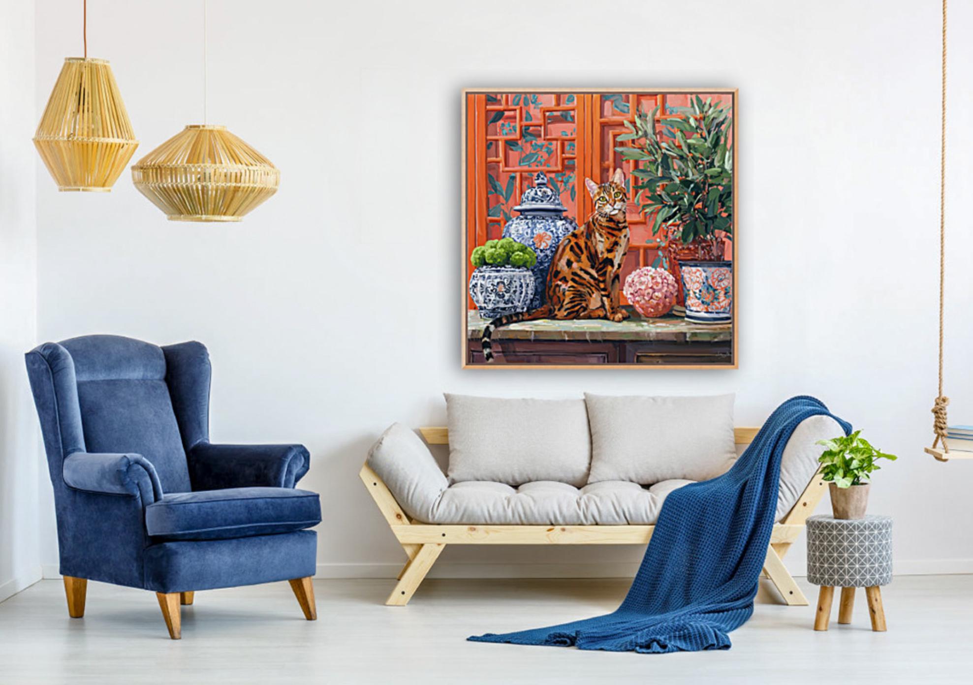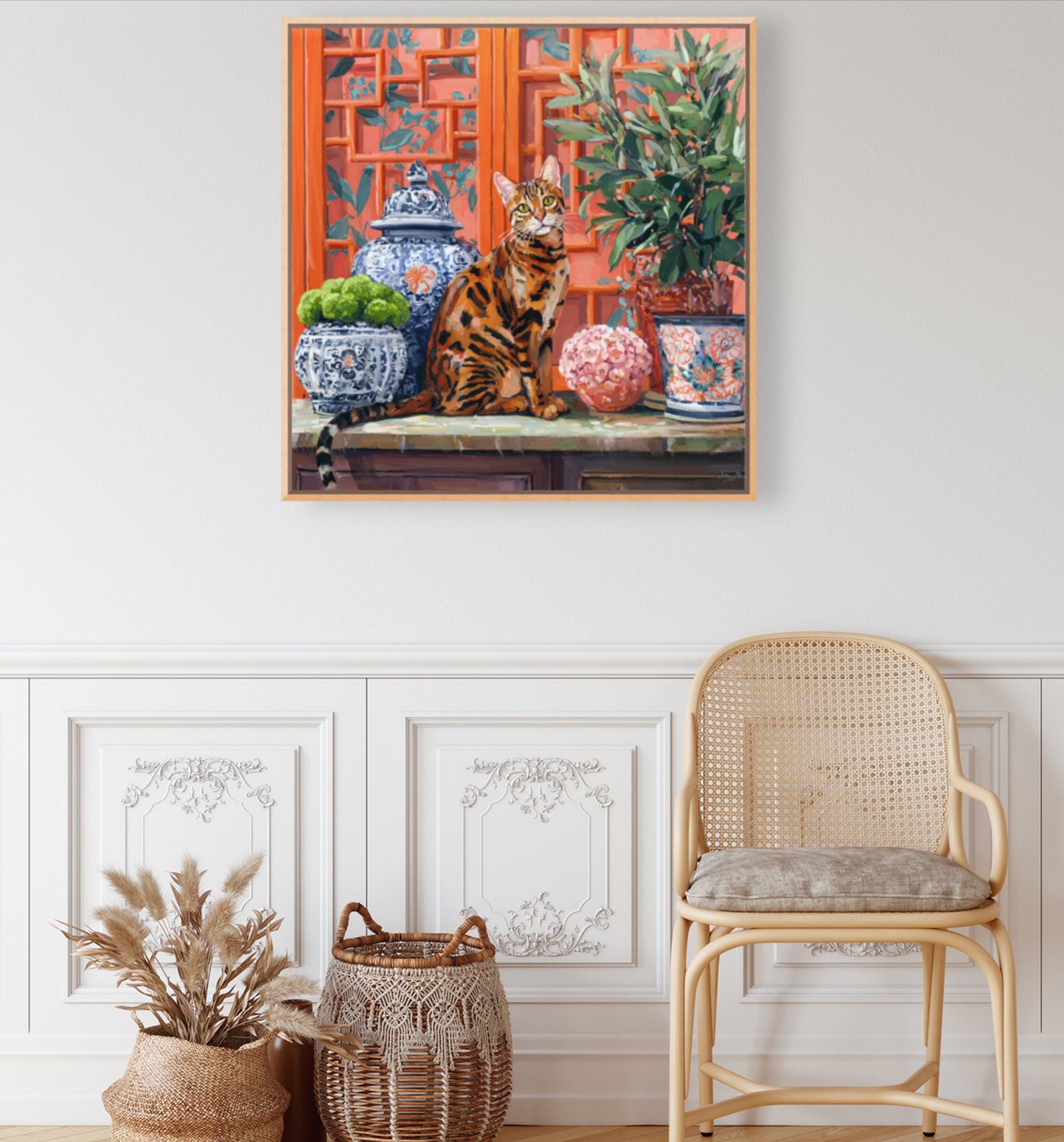 Grandmillennial art, Coastal chinoiserie Bengal cat portrait in earthy orange chinoiserie room