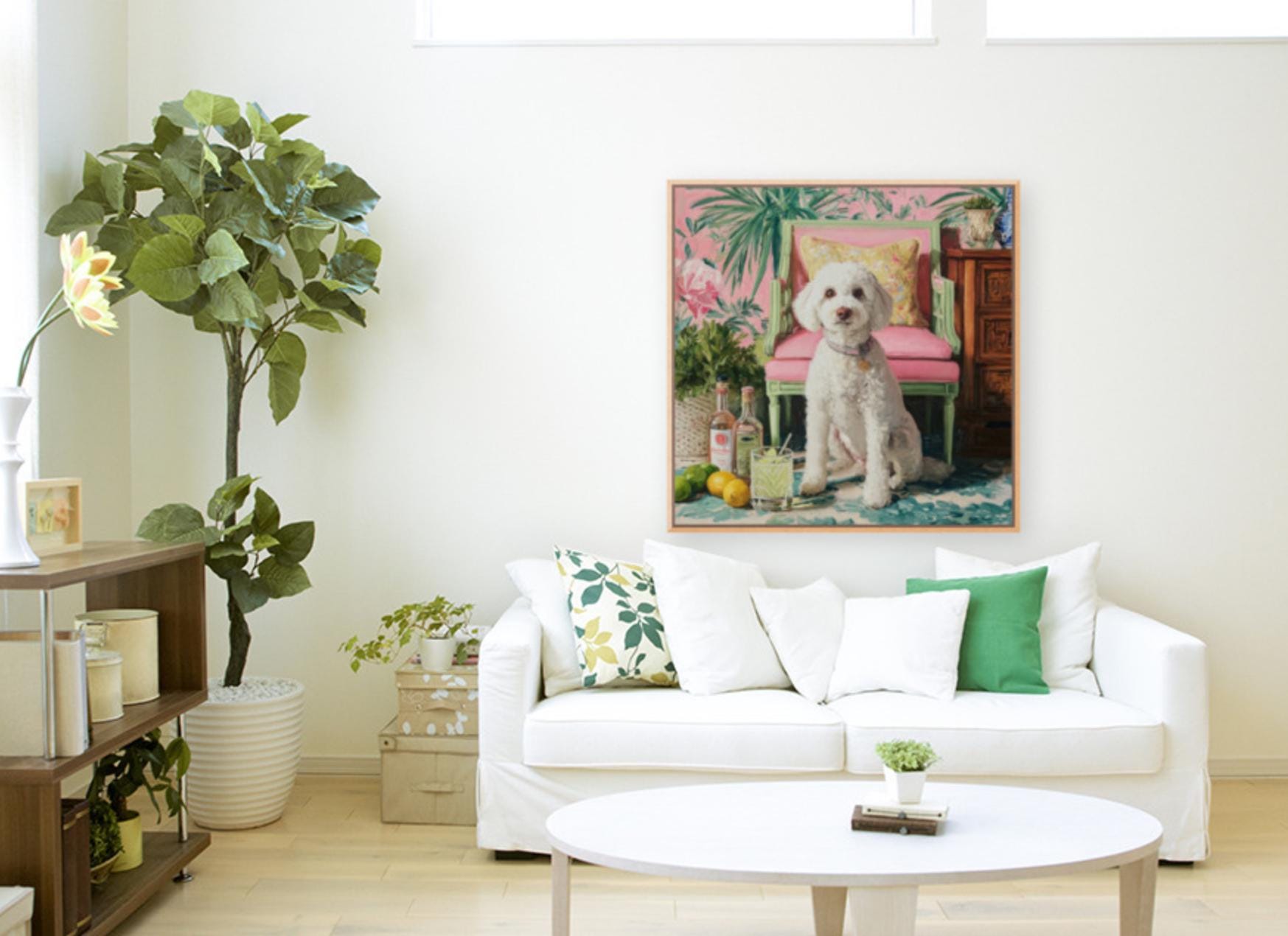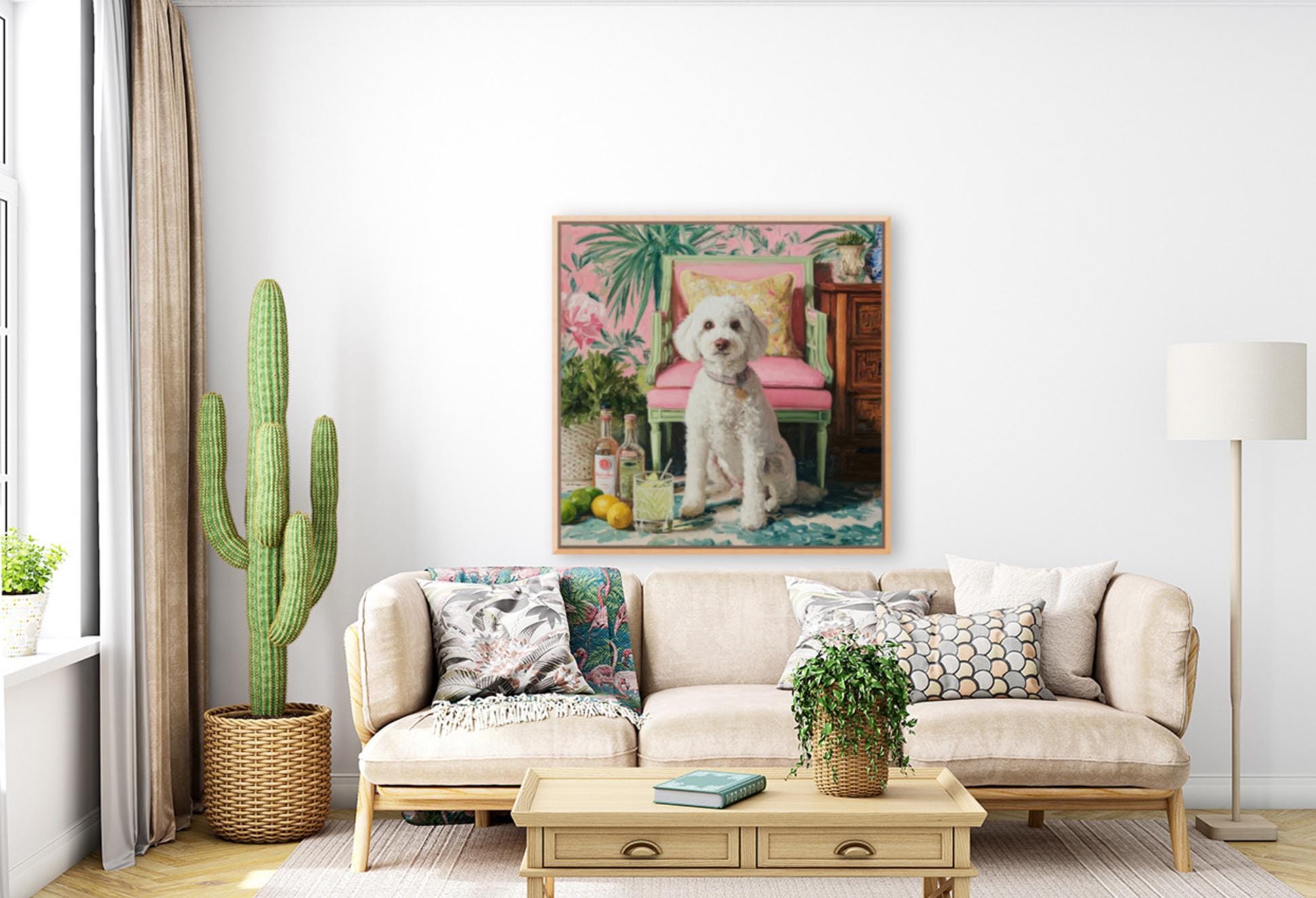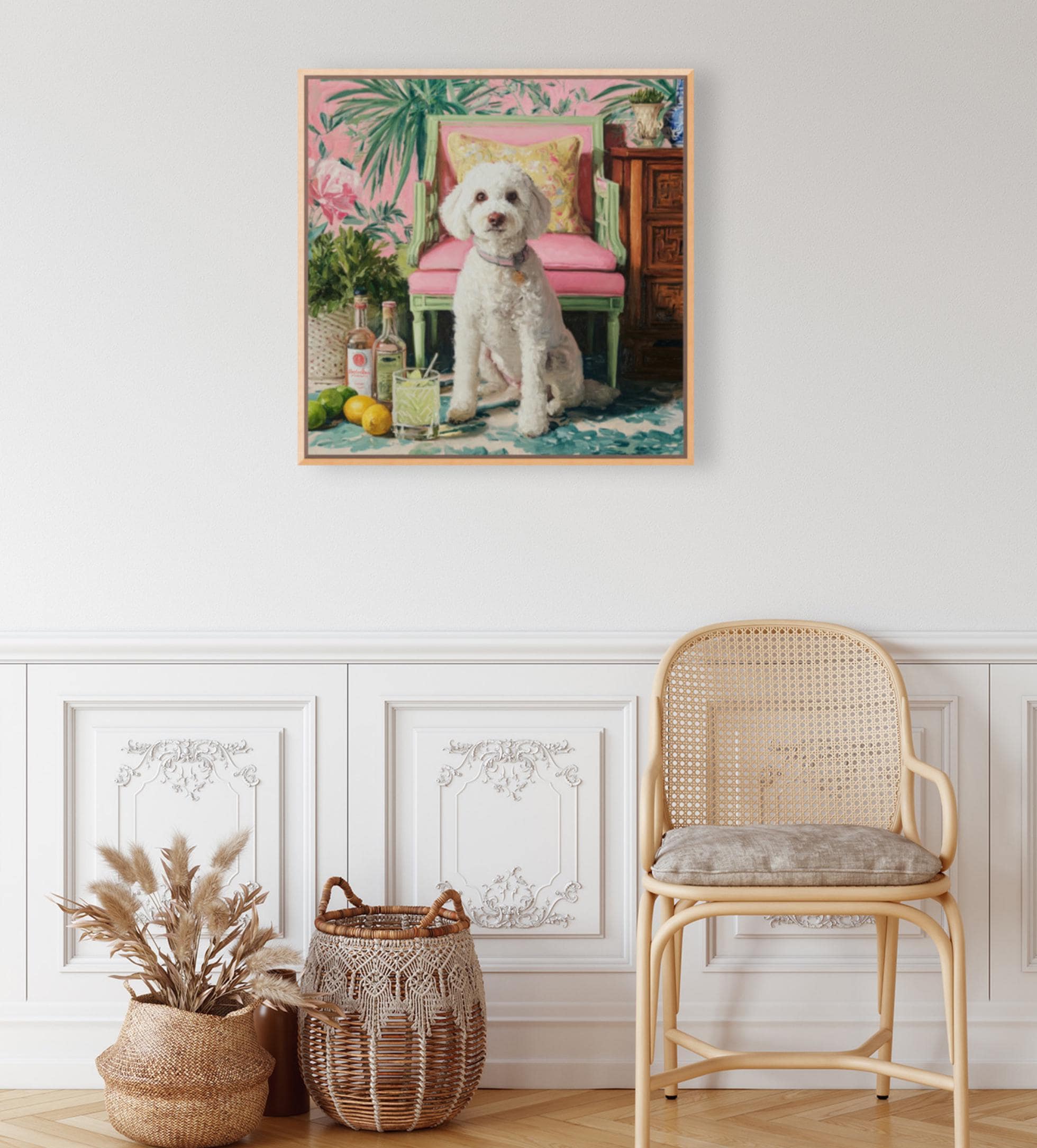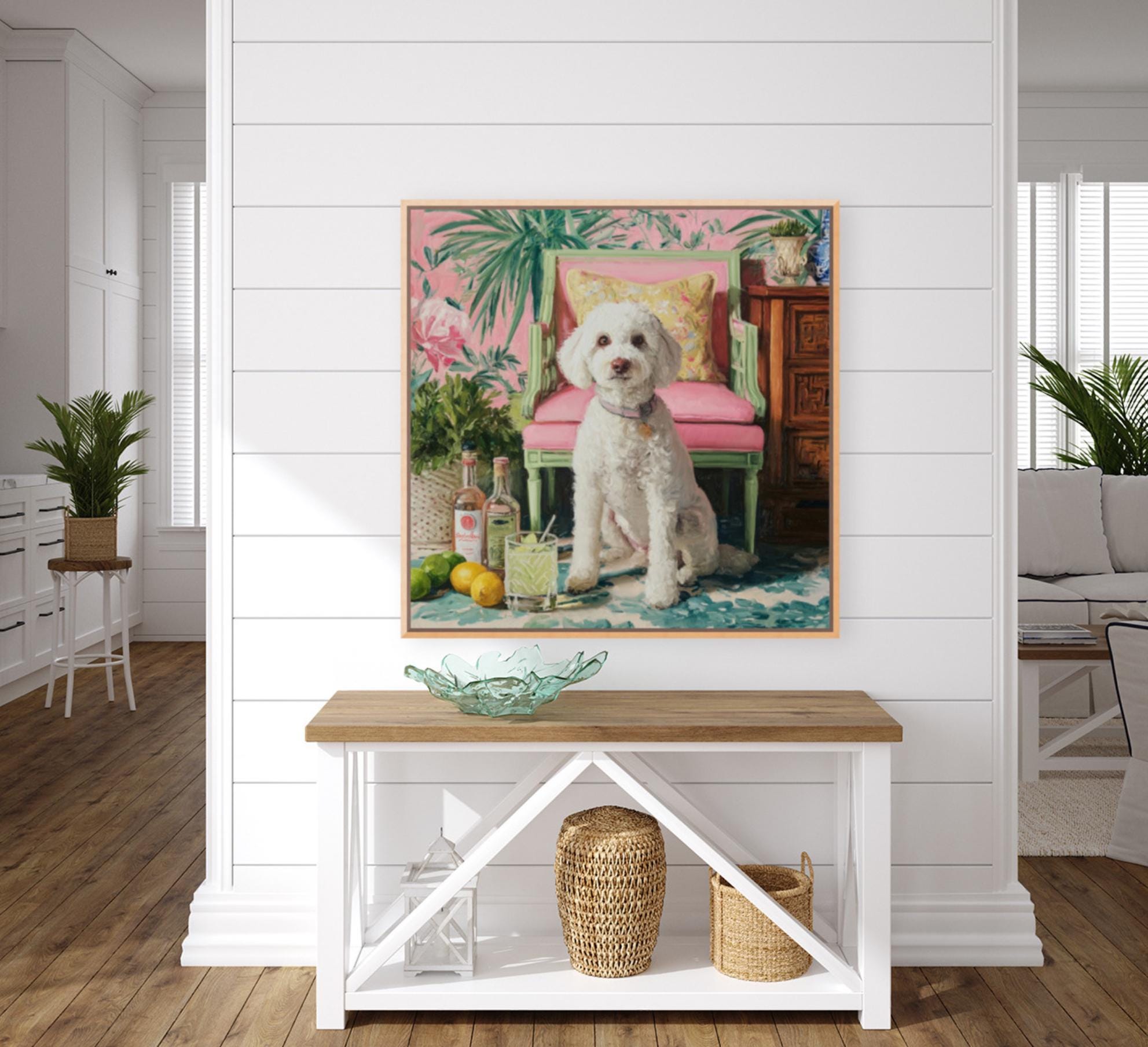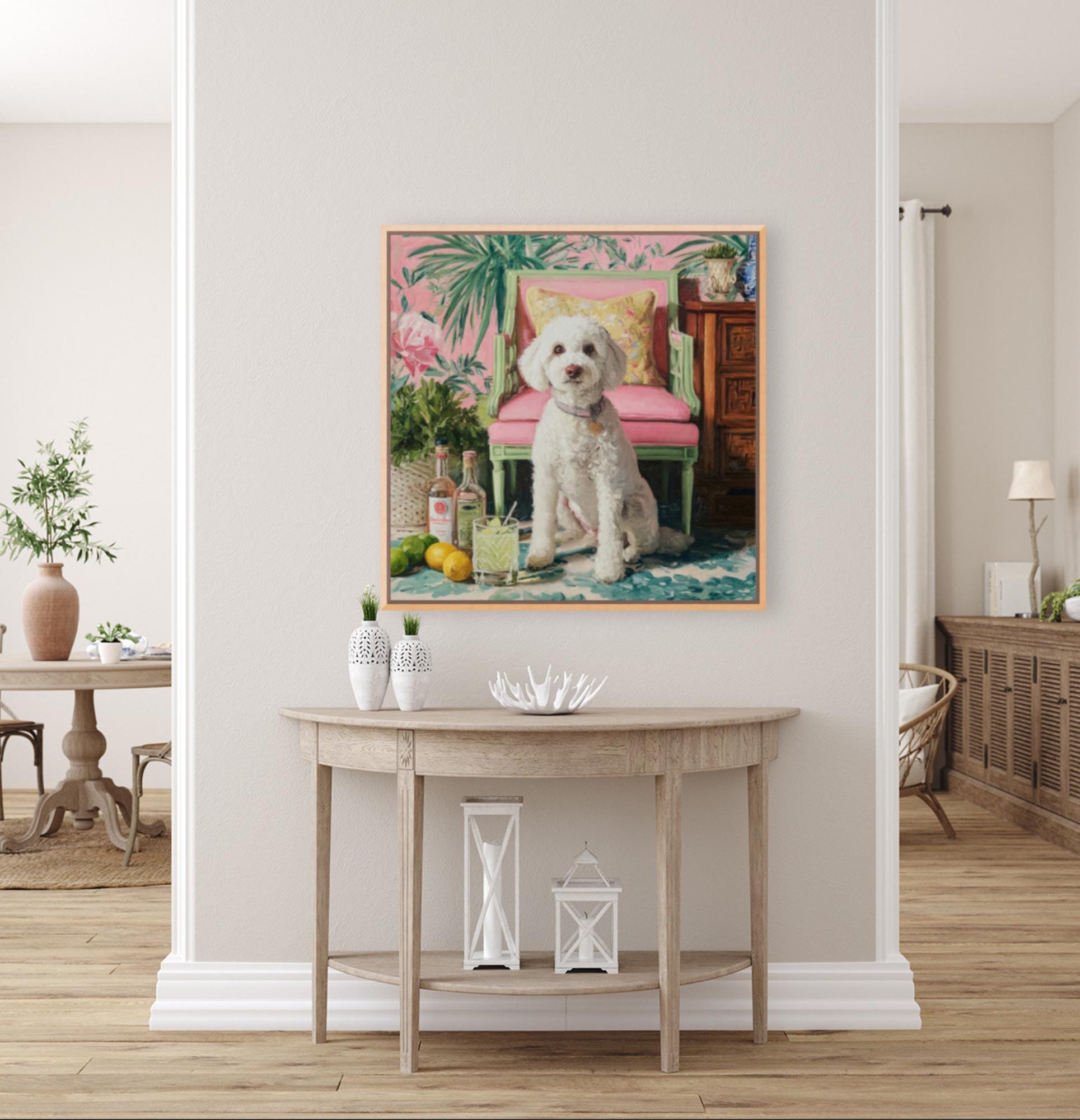 Grandmillennial art, Drinks, anyone? Coastal chinoiserie dog art in pastel pink and green