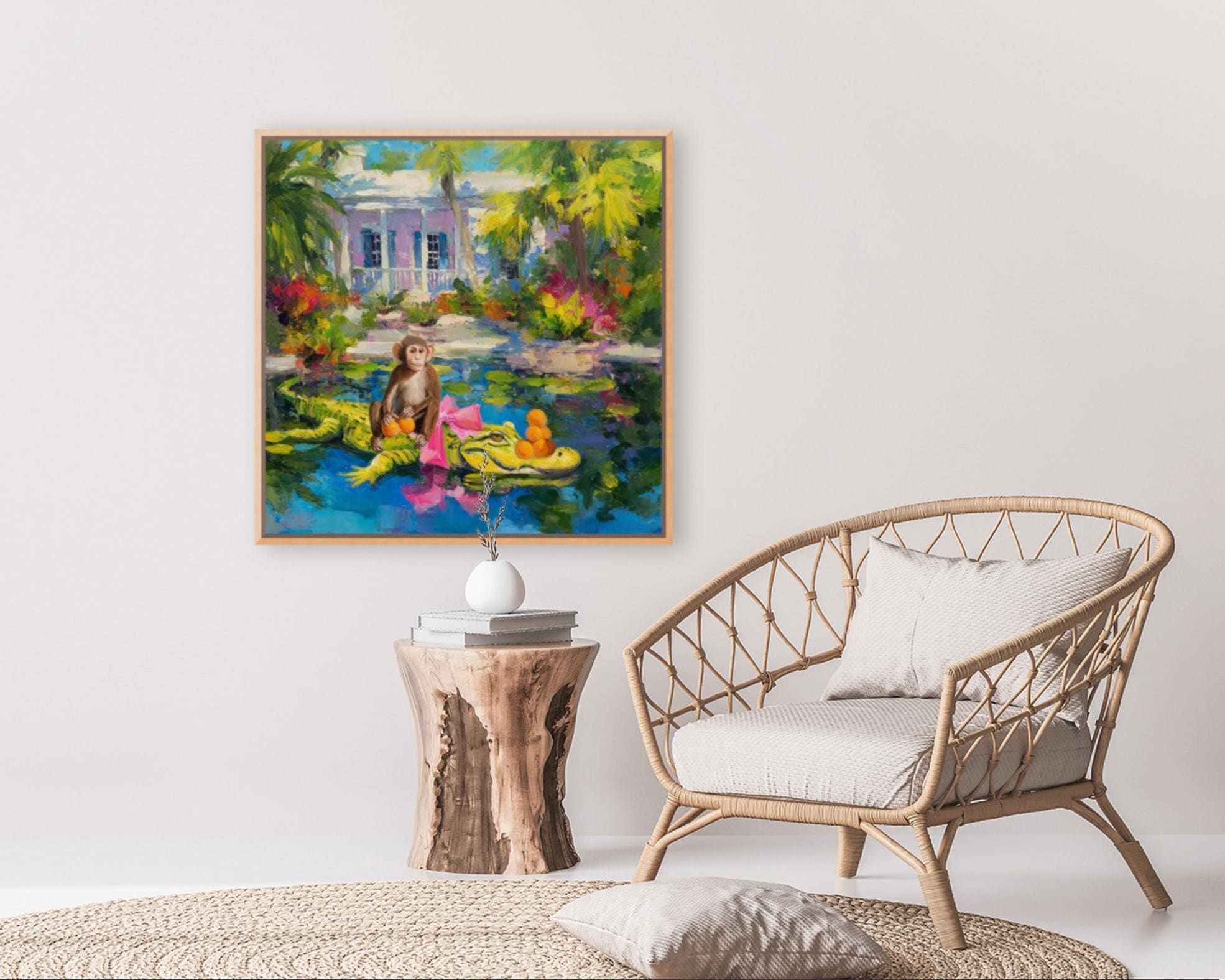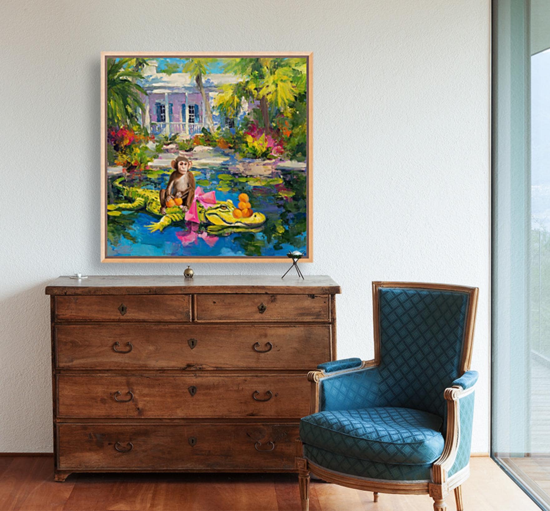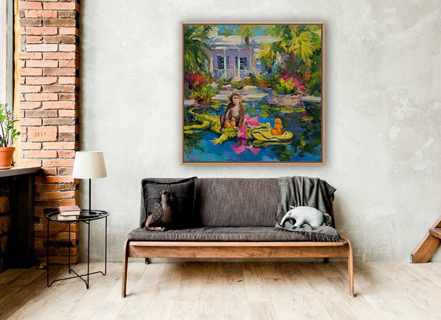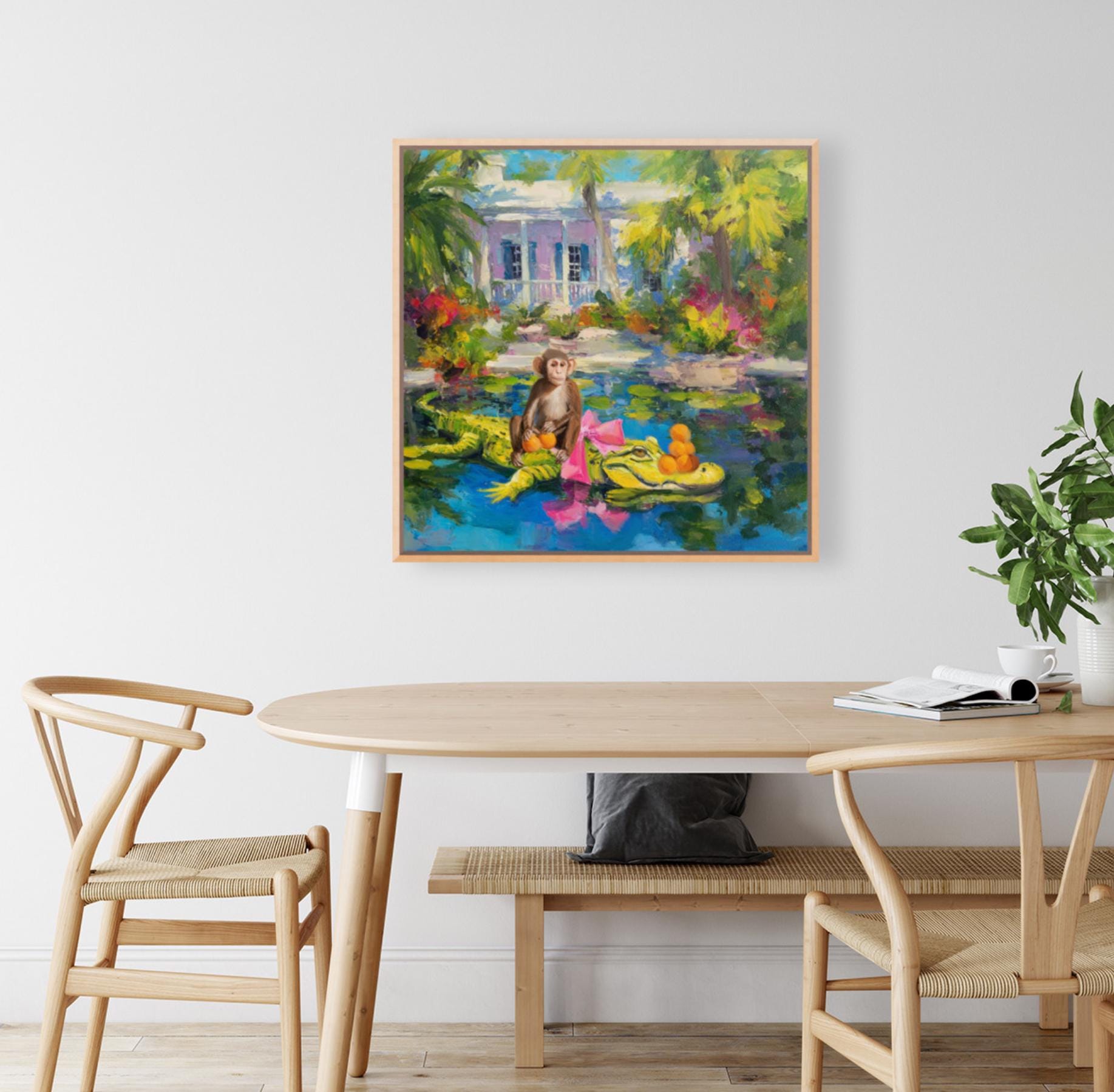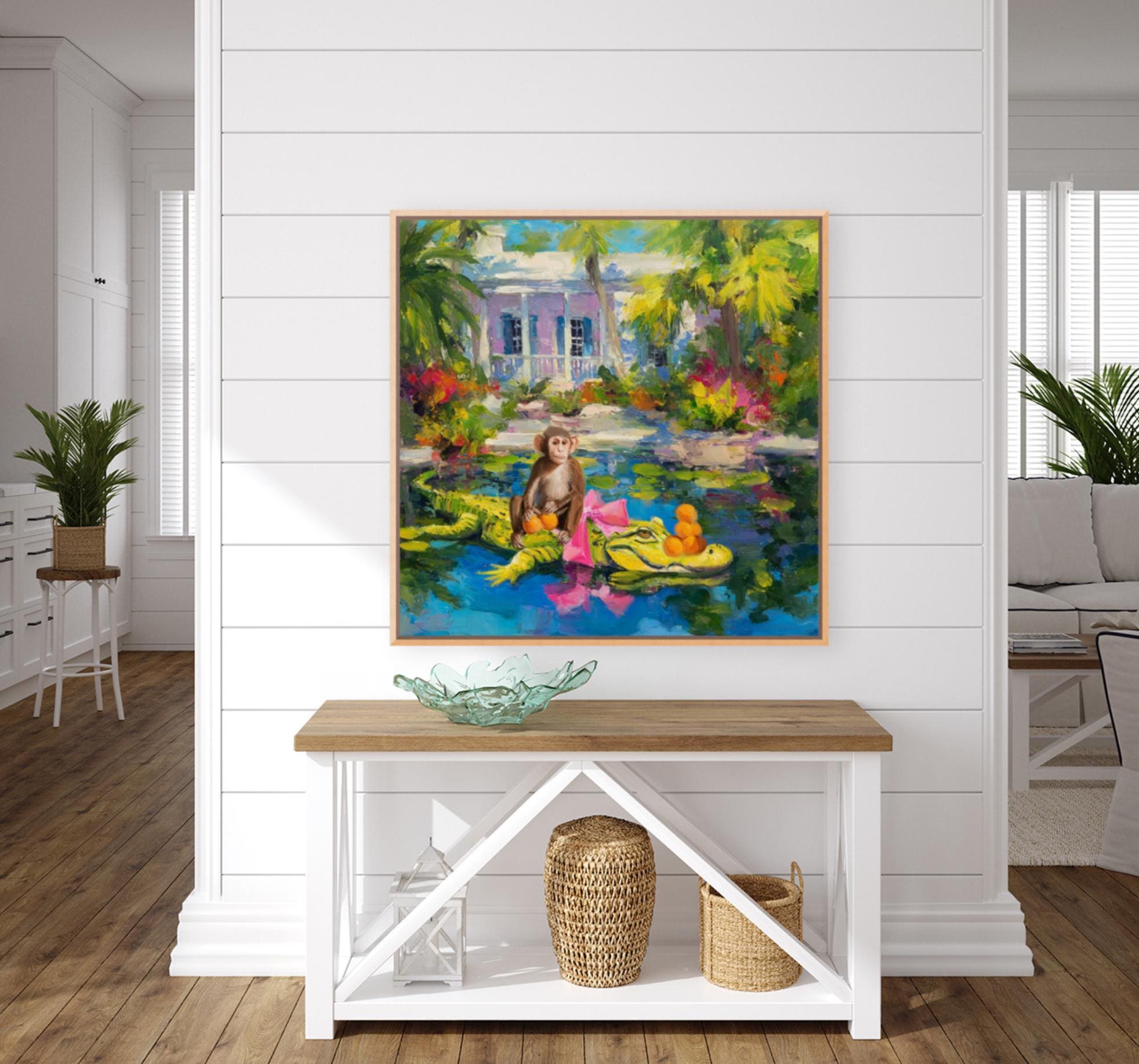 Grandmillennial art, The Orange Pickers, Whimsical Florida Art, gator and monkey art