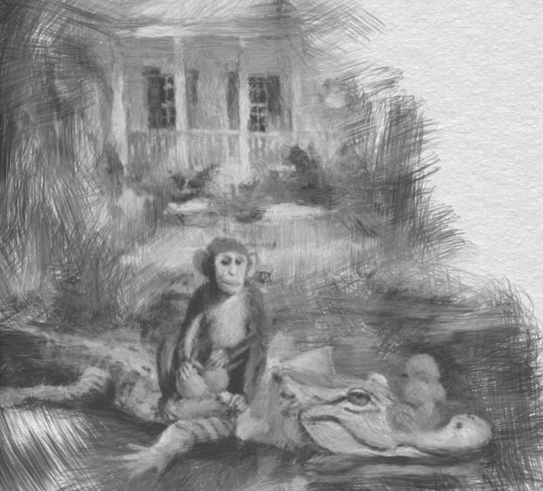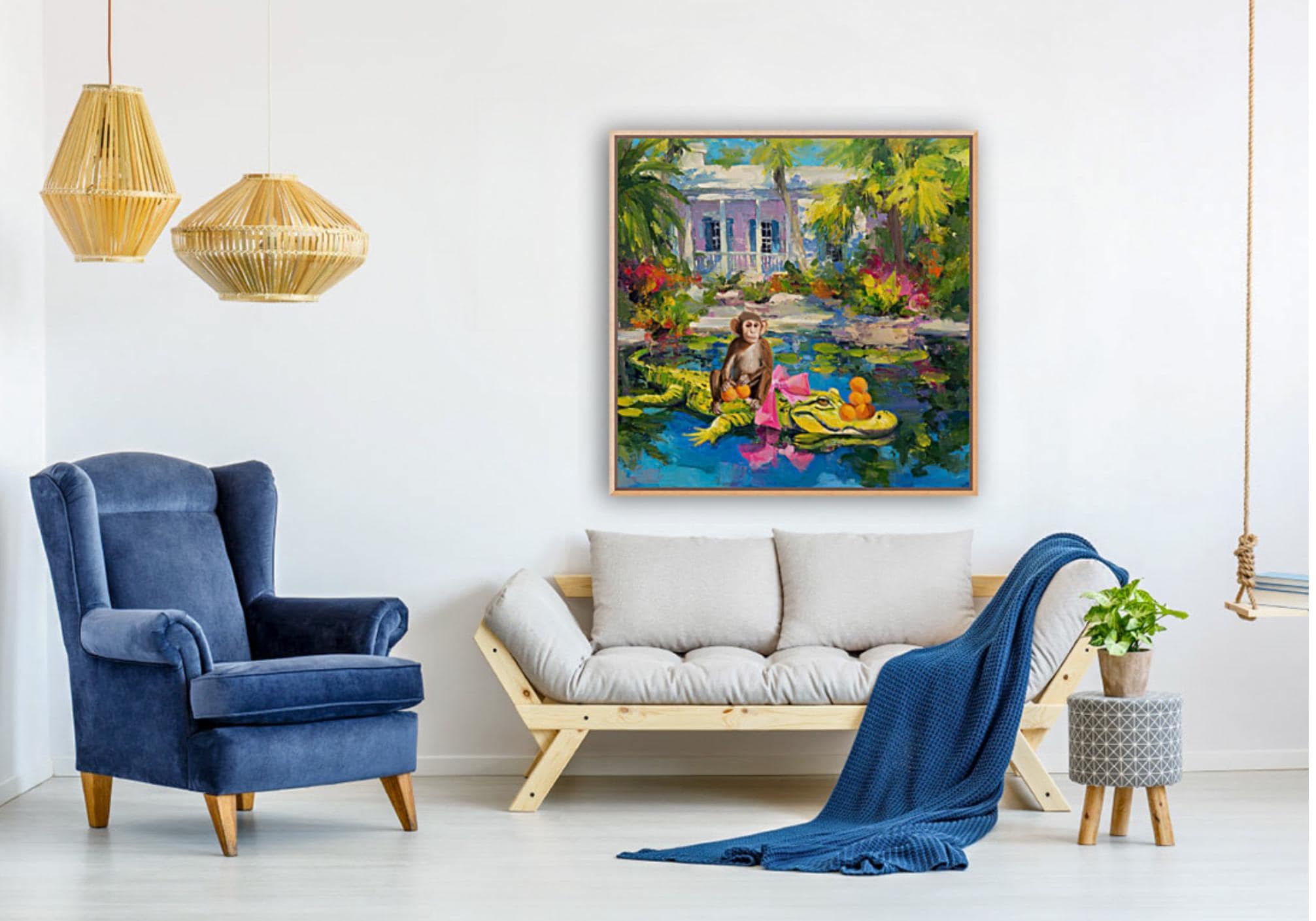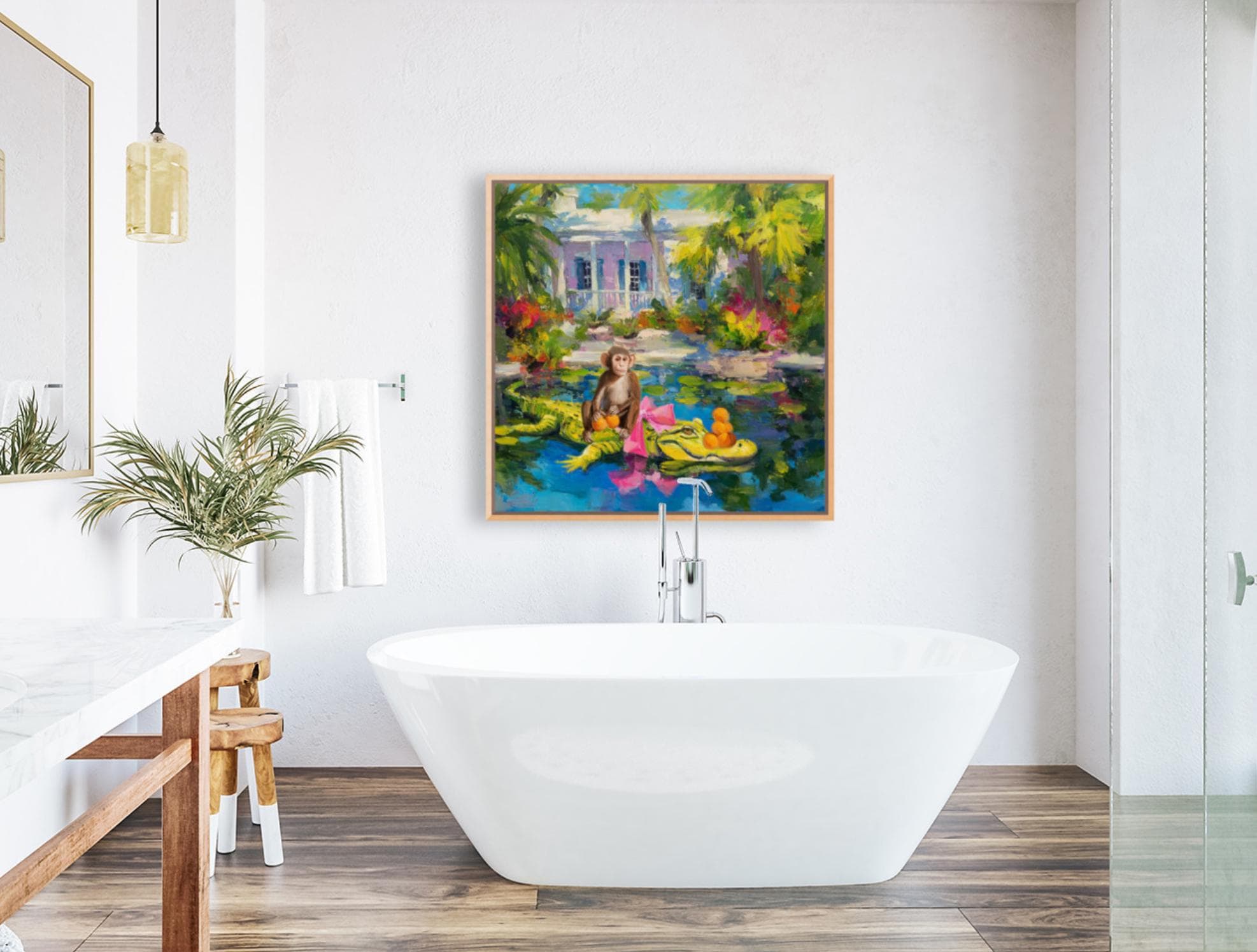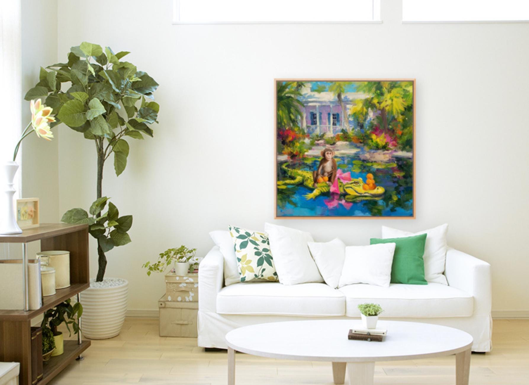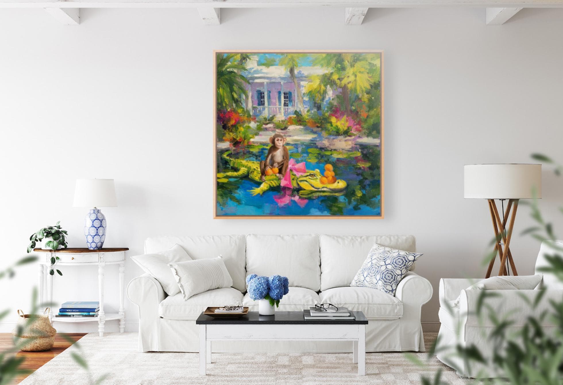 Grandmillennial art, The Orange Pickers, Whimsical Florida Art, gator and monkey art