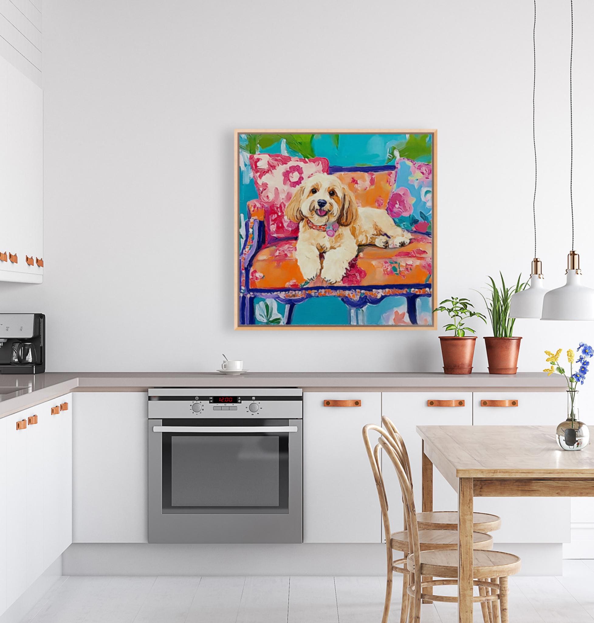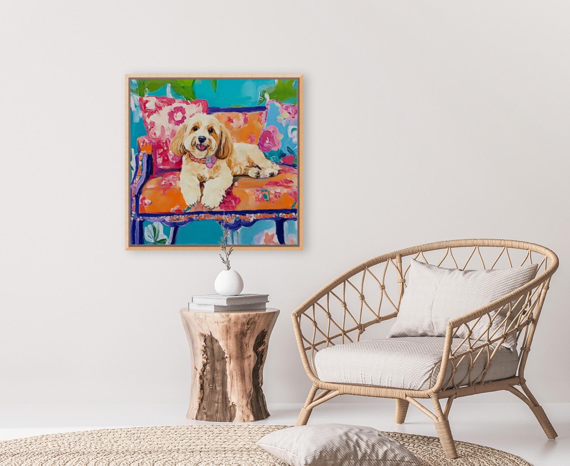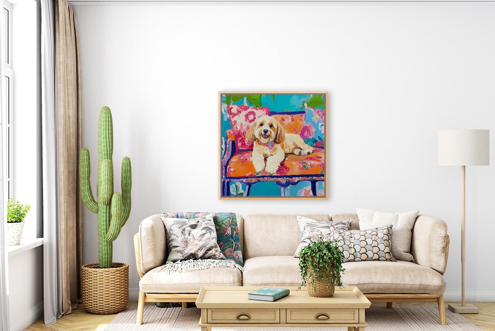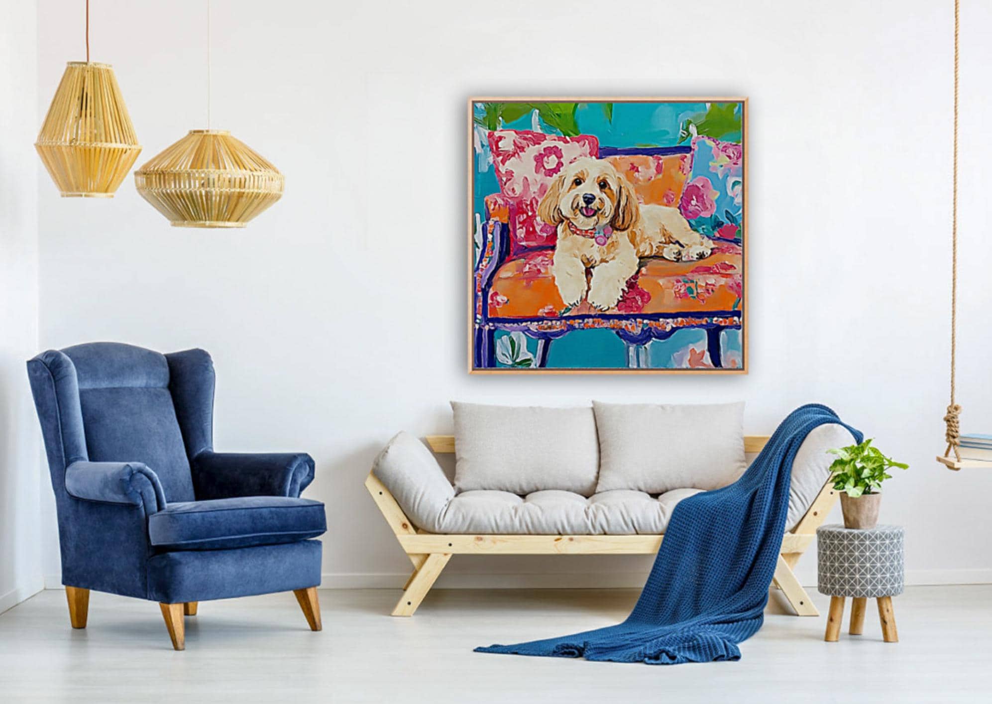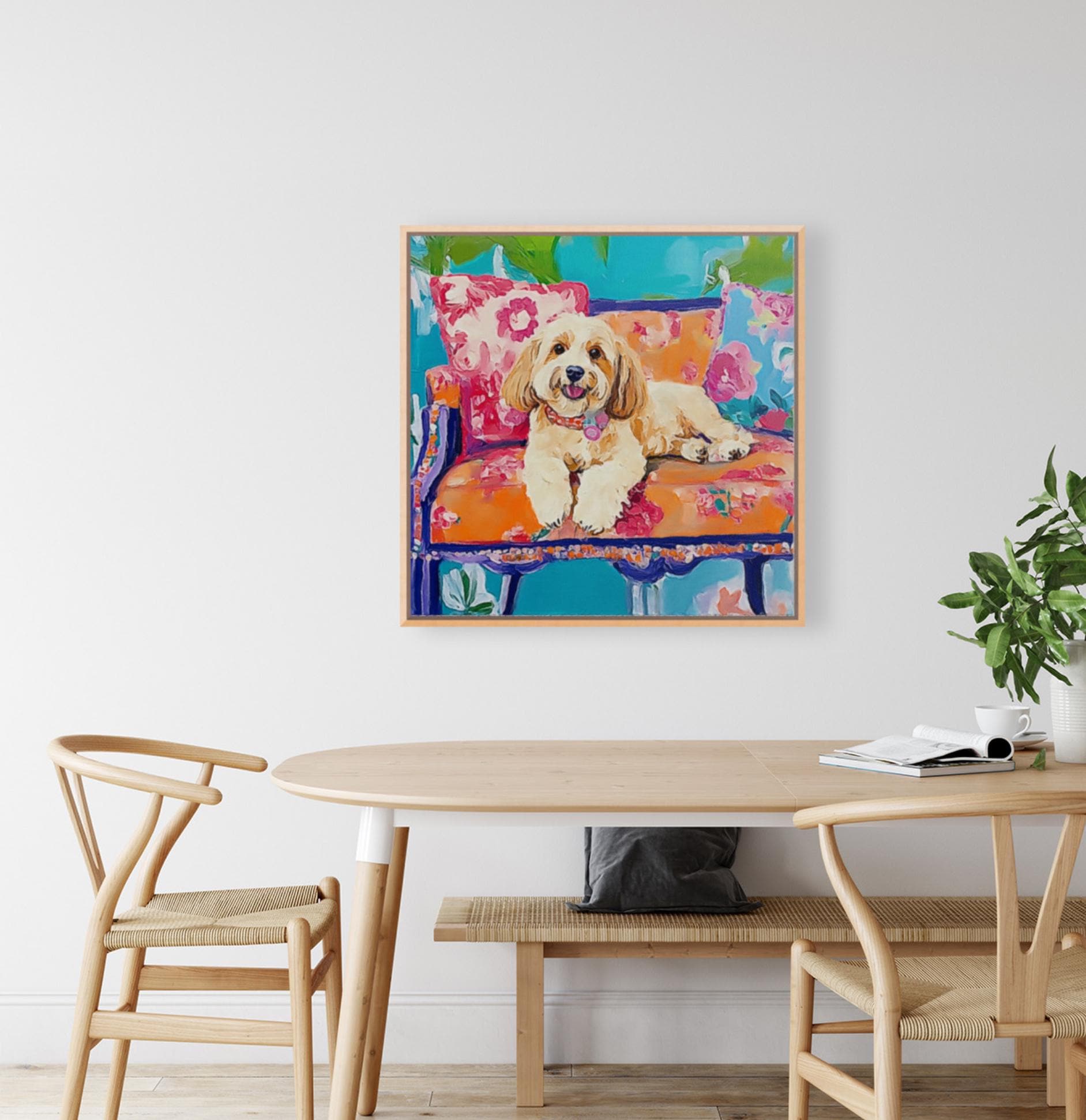 Multipoo dog on orange sofa, Giclee Print, Whimsical Dog Art