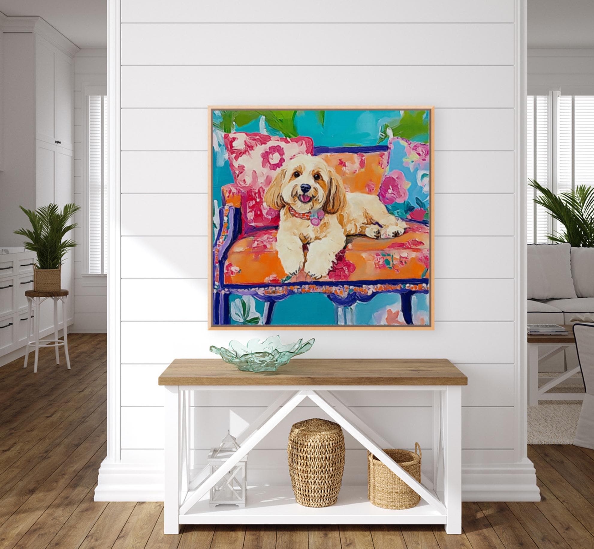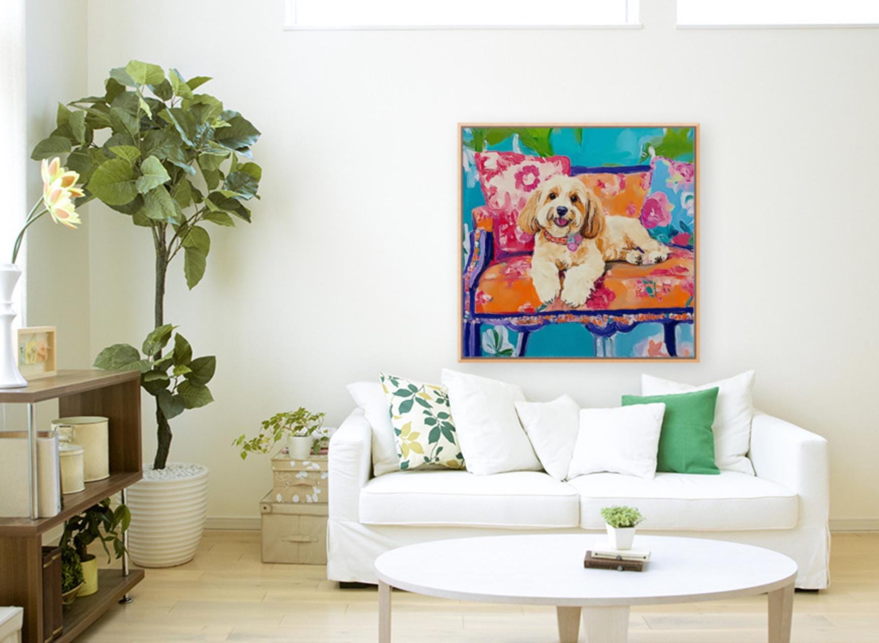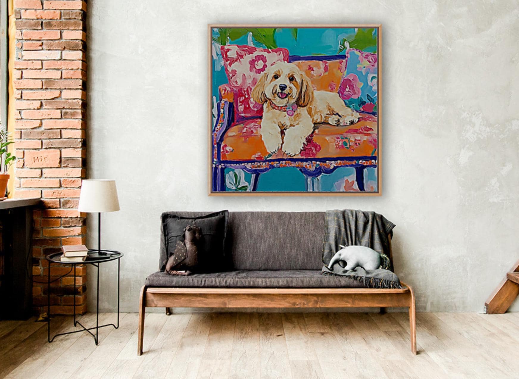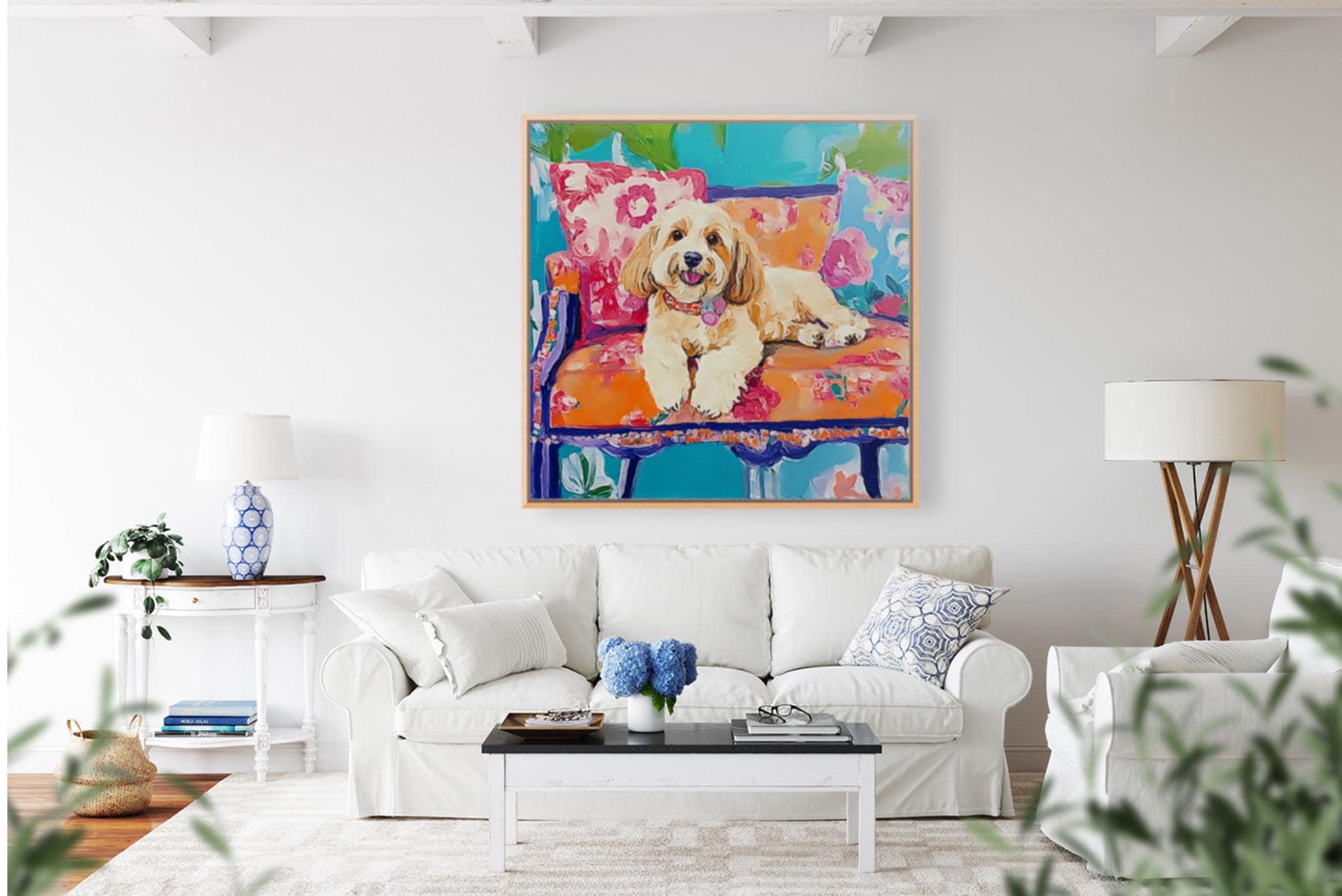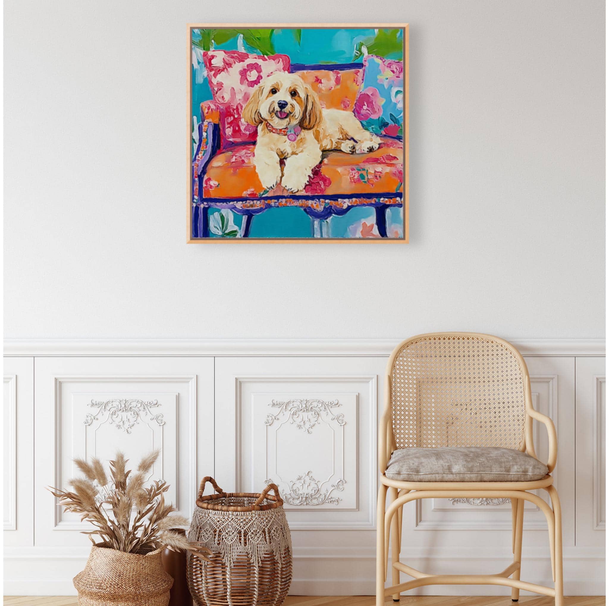 Multipoo dog on orange sofa, Giclee Print, Whimsical Dog Art